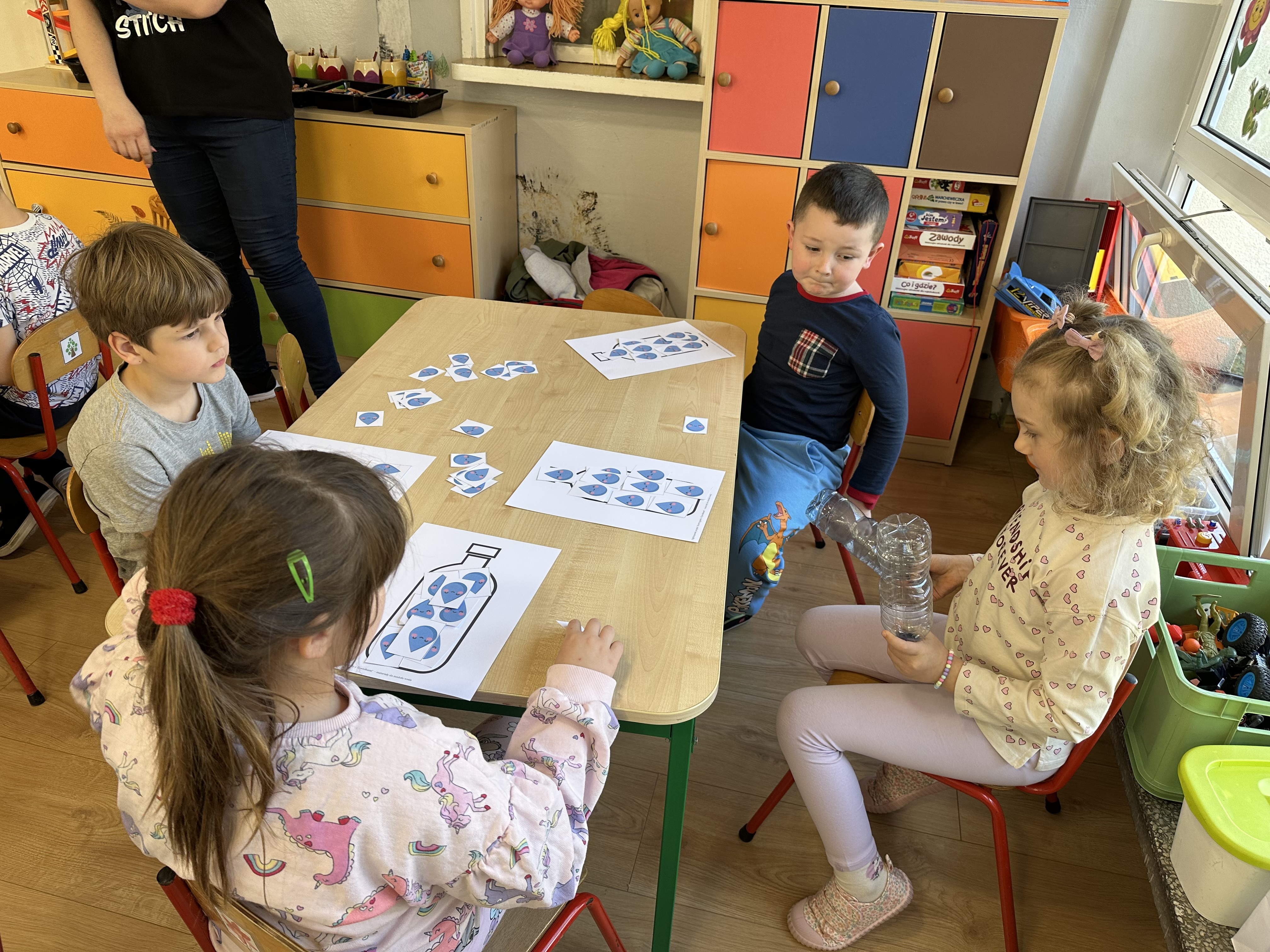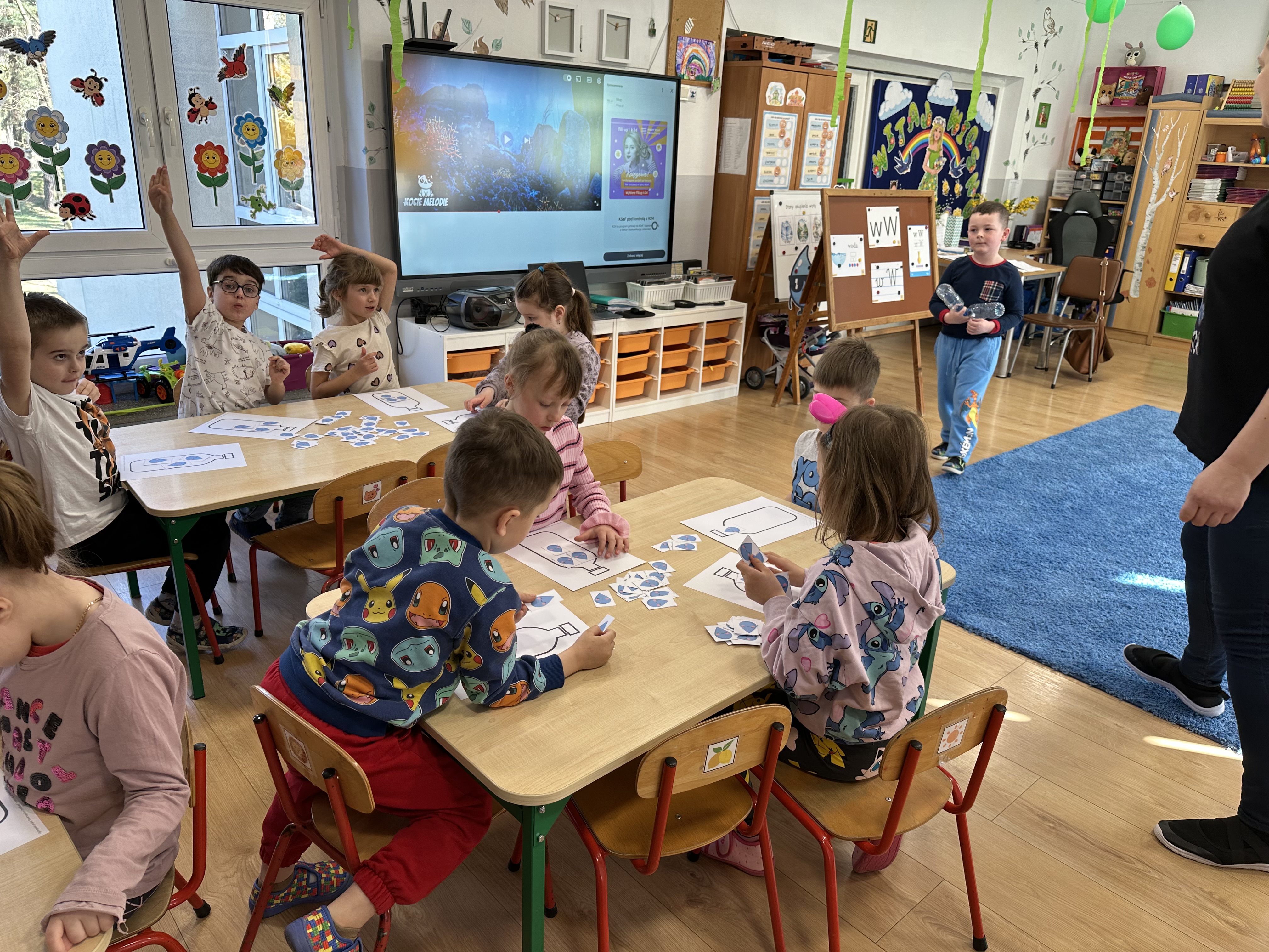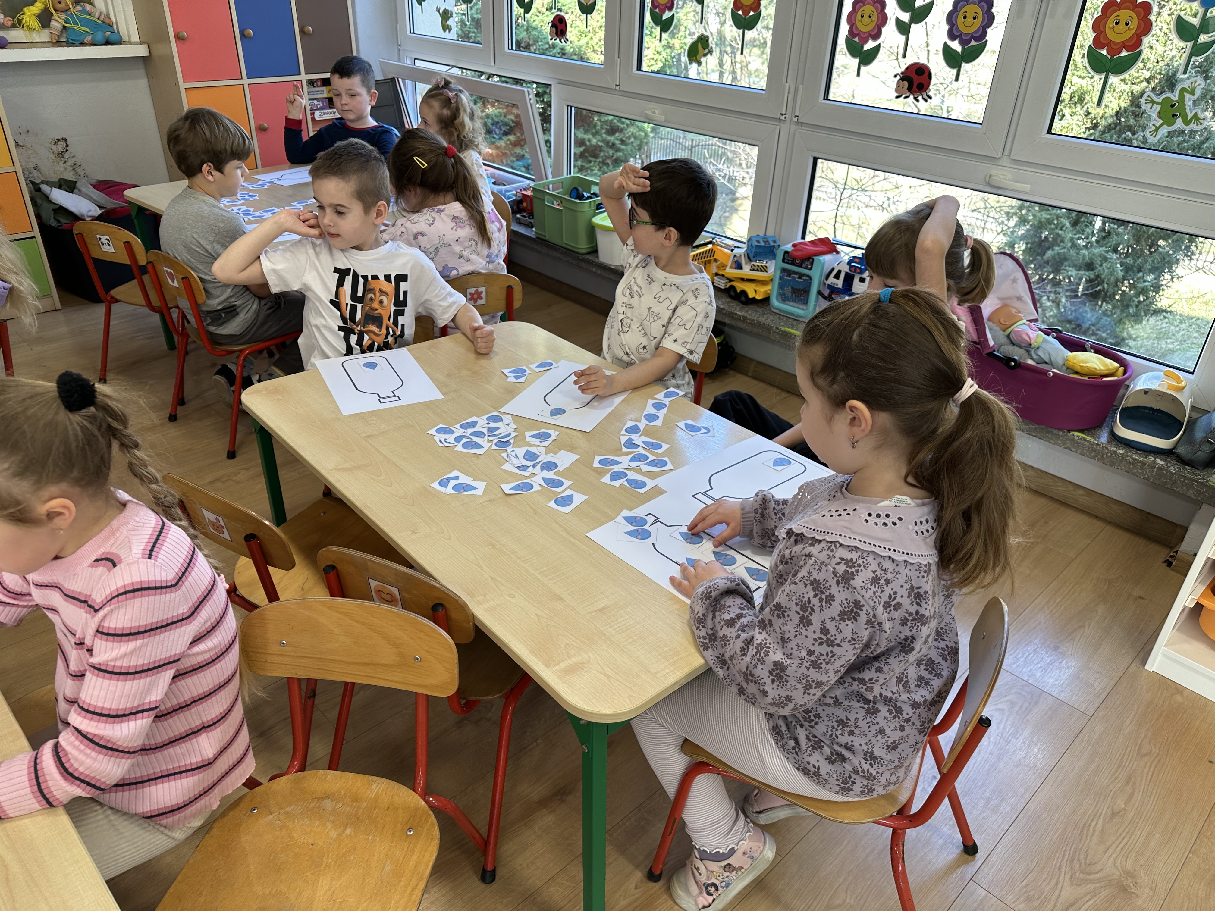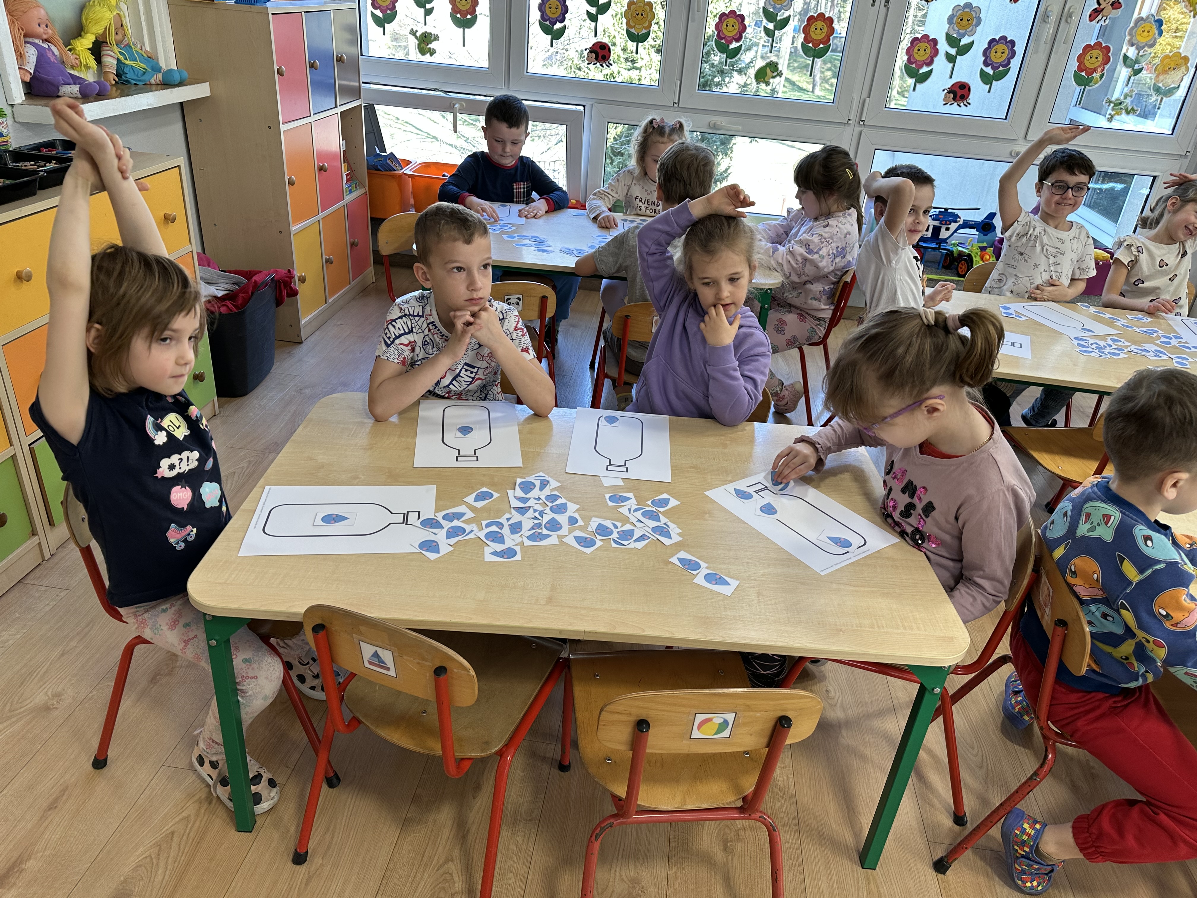 w ćwiczeniach porannych oraz planowanych zajęciach gimnastycznych. Rozwijały kompetencje językowe i matematyczne podczas zabaw przy stolikach. W czasie wolnym bawiły się zgodnie ze swoimi zainteresowaniami oraz dbały o porządek w sali.