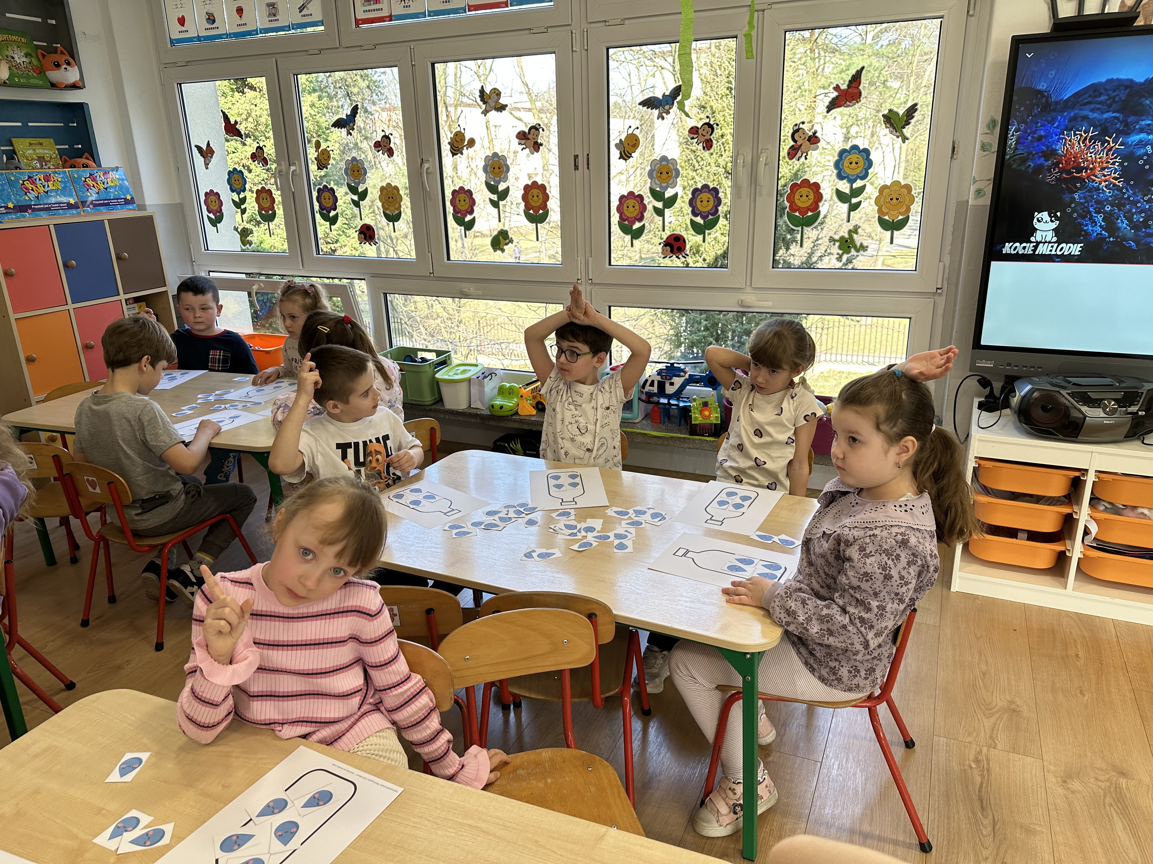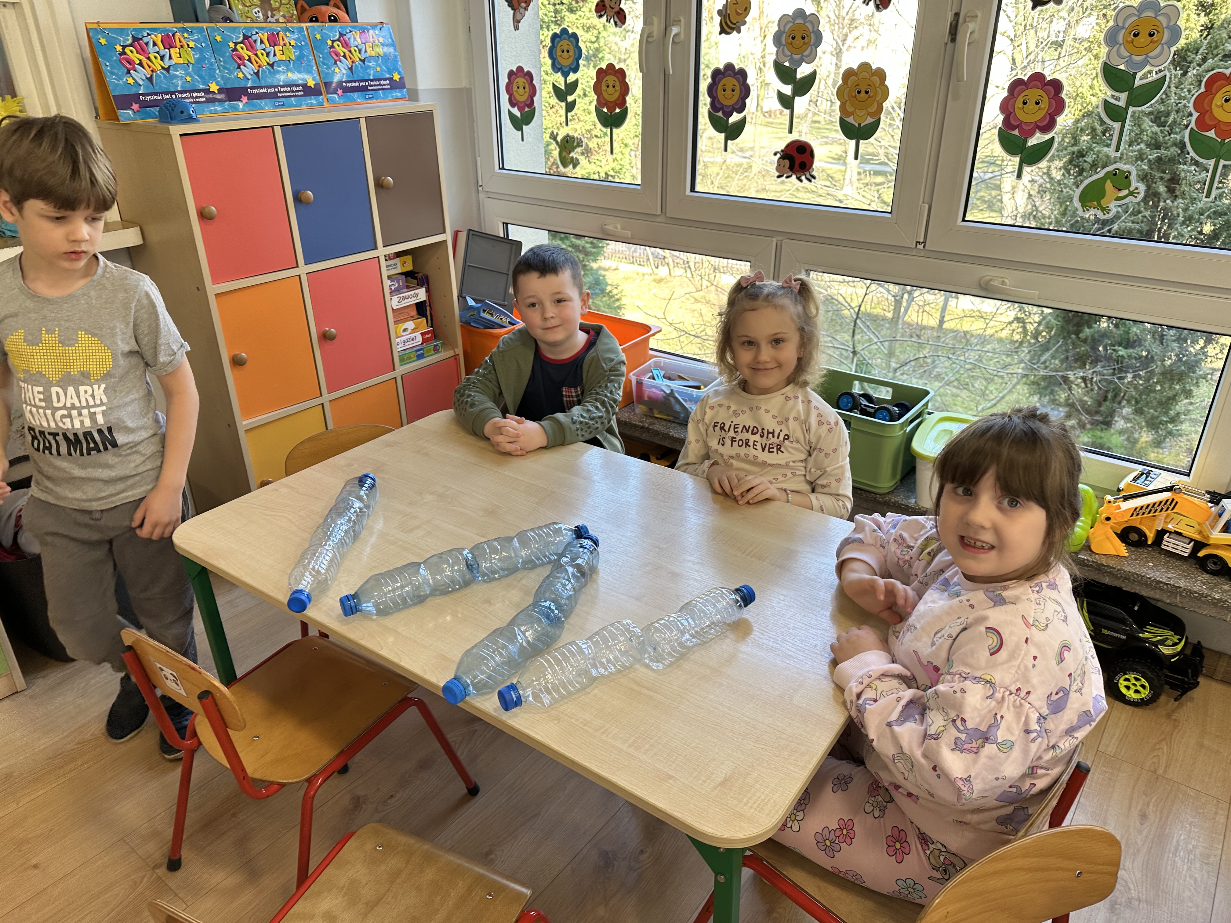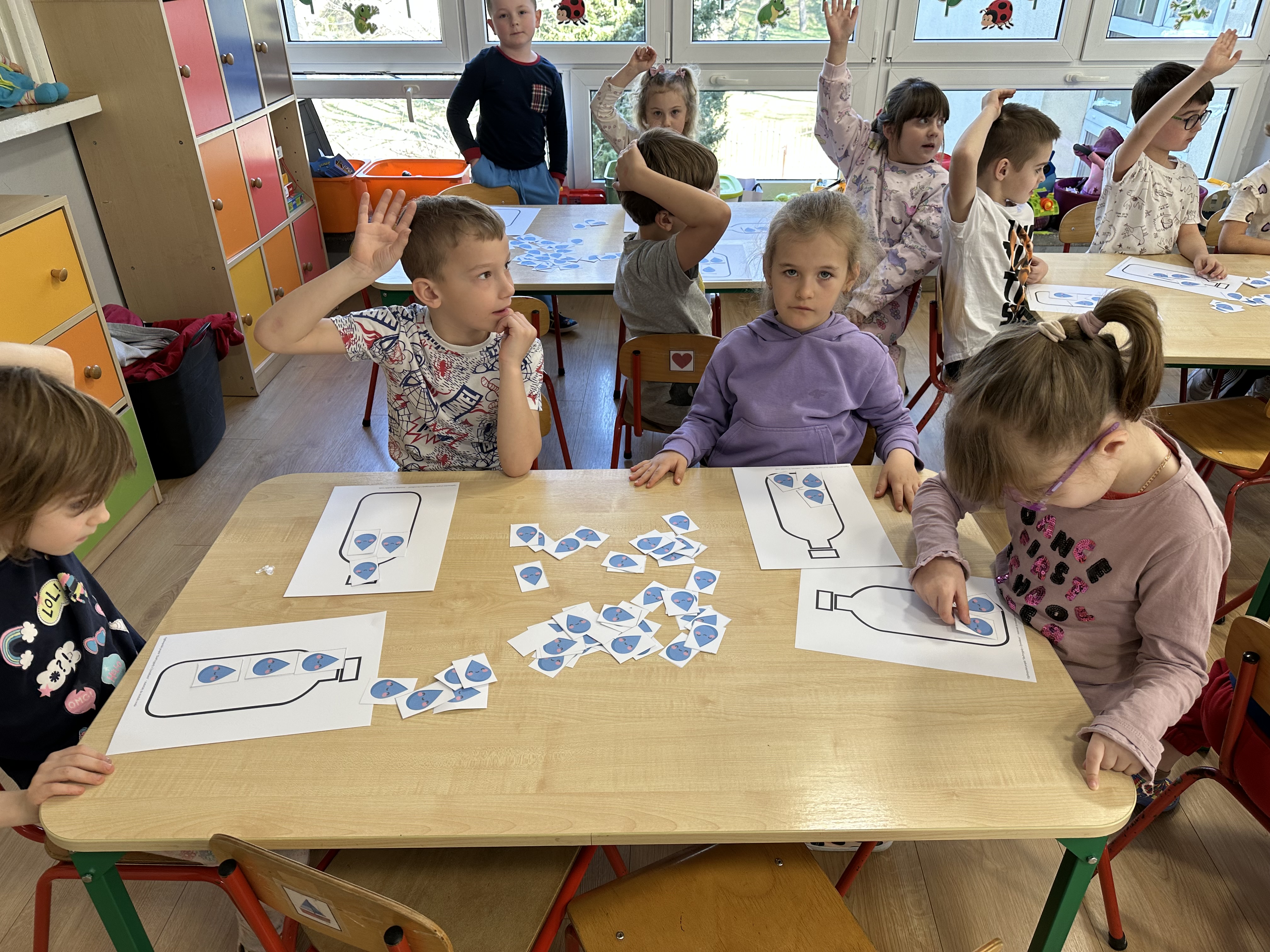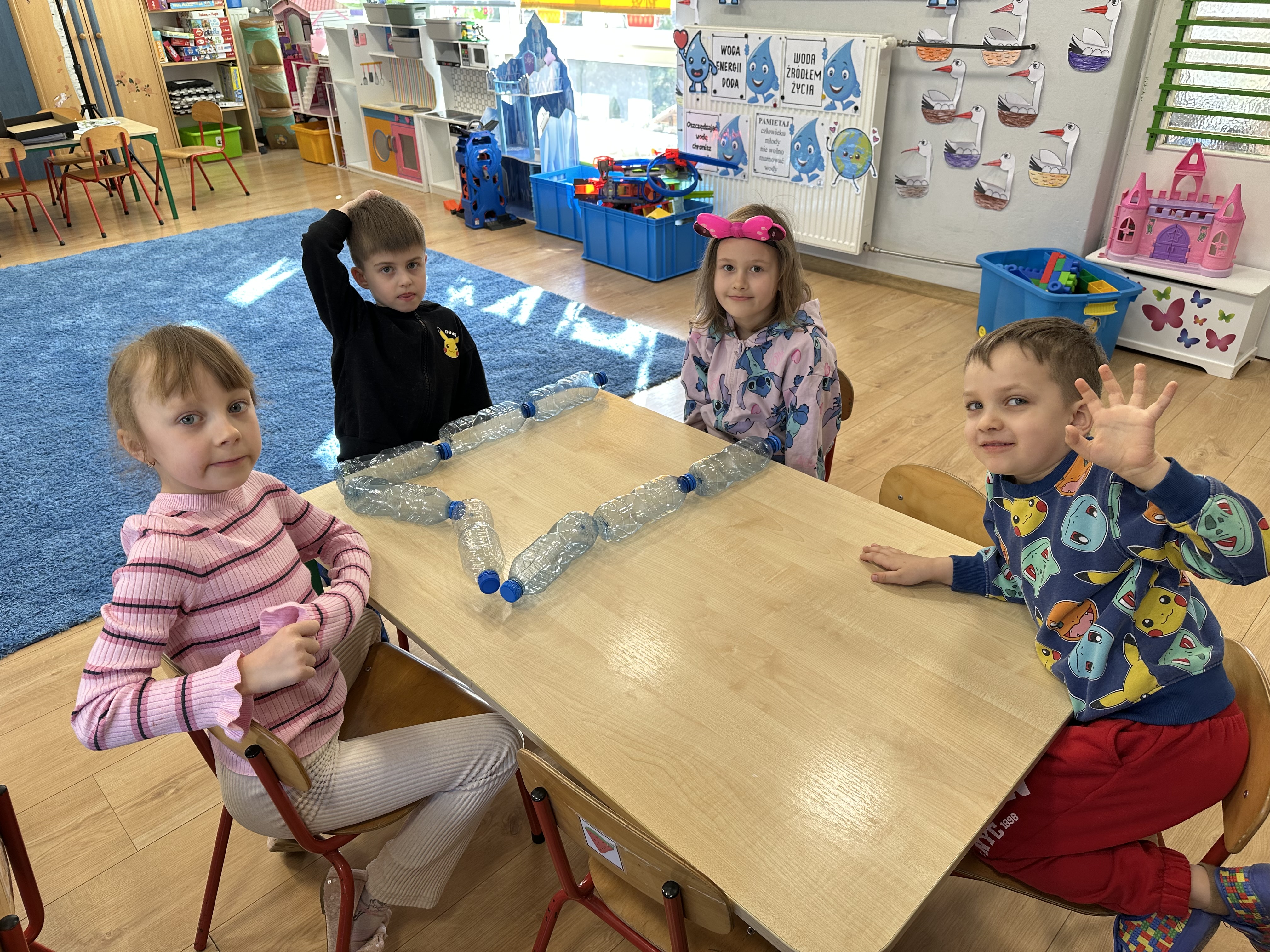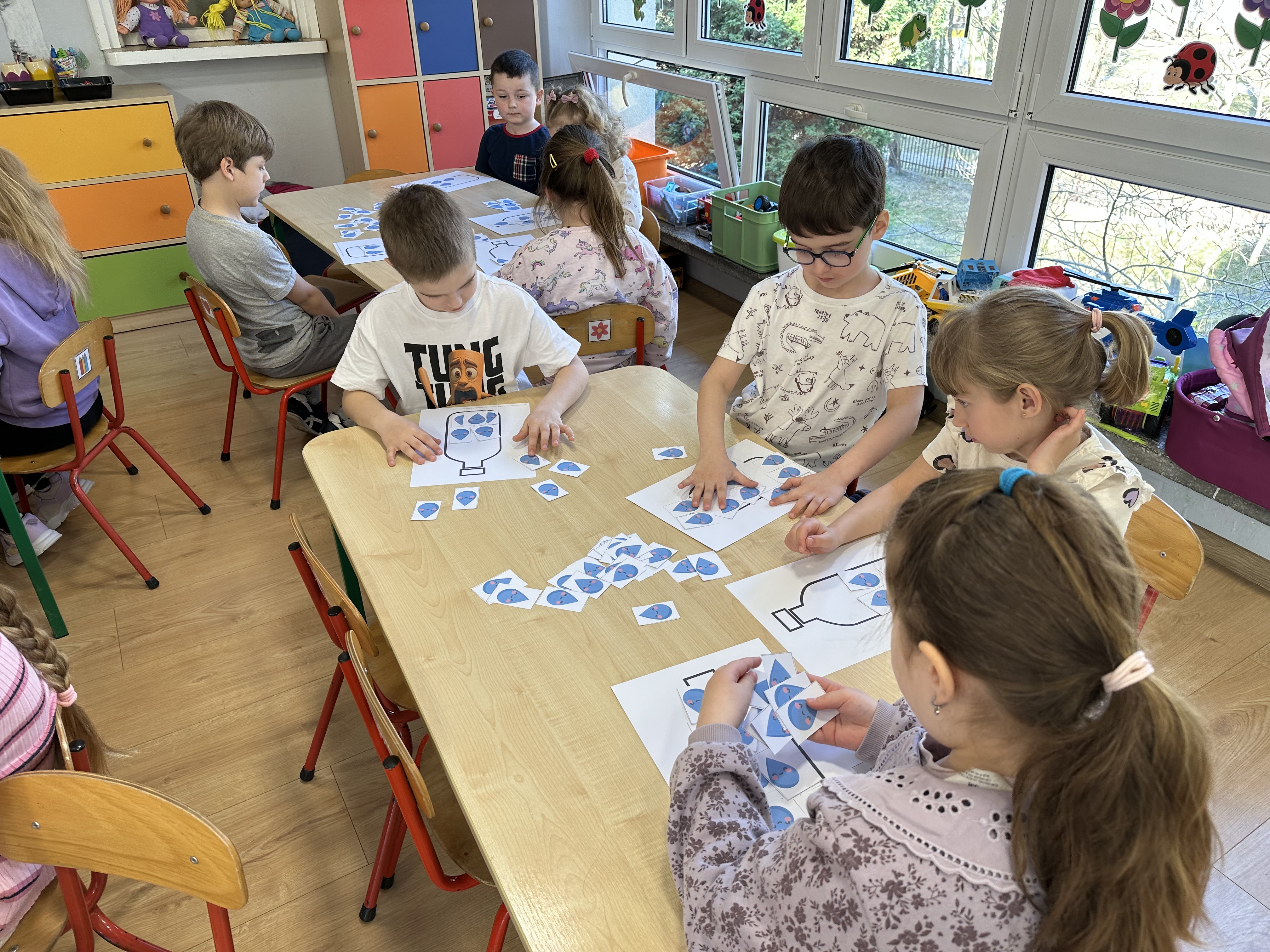 w ćwiczeniach porannych oraz planowanych zajęciach gimnastycznych. Rozwijały kompetencje językowe i matematyczne podczas zabaw przy stolikach. W czasie wolnym bawiły się zgodnie ze swoimi zainteresowaniami oraz dbały o porządek w sali.