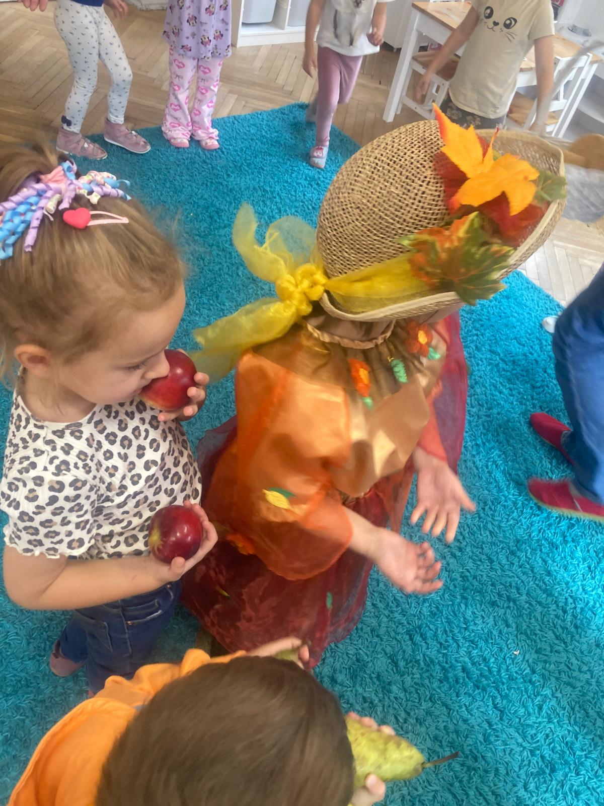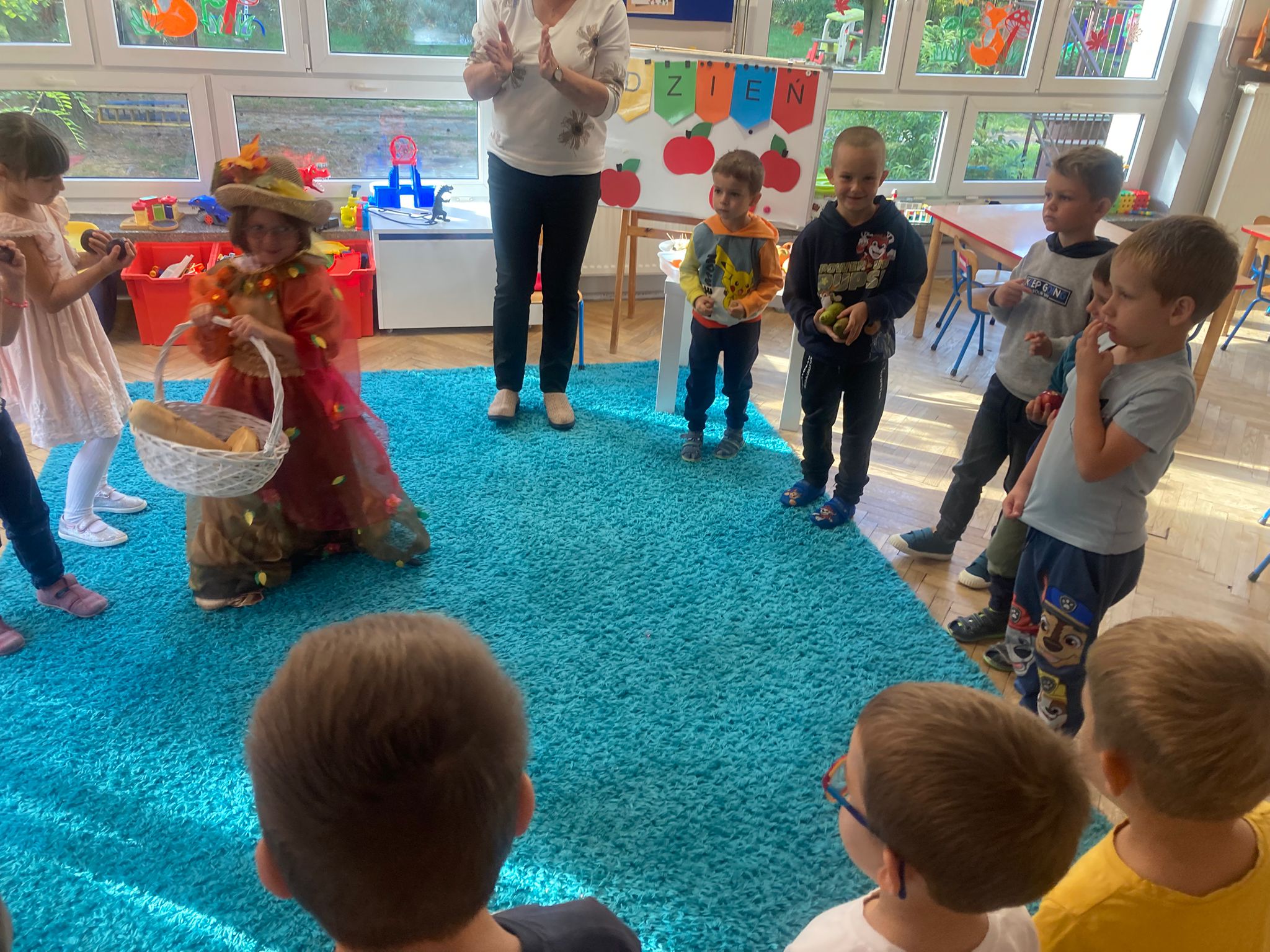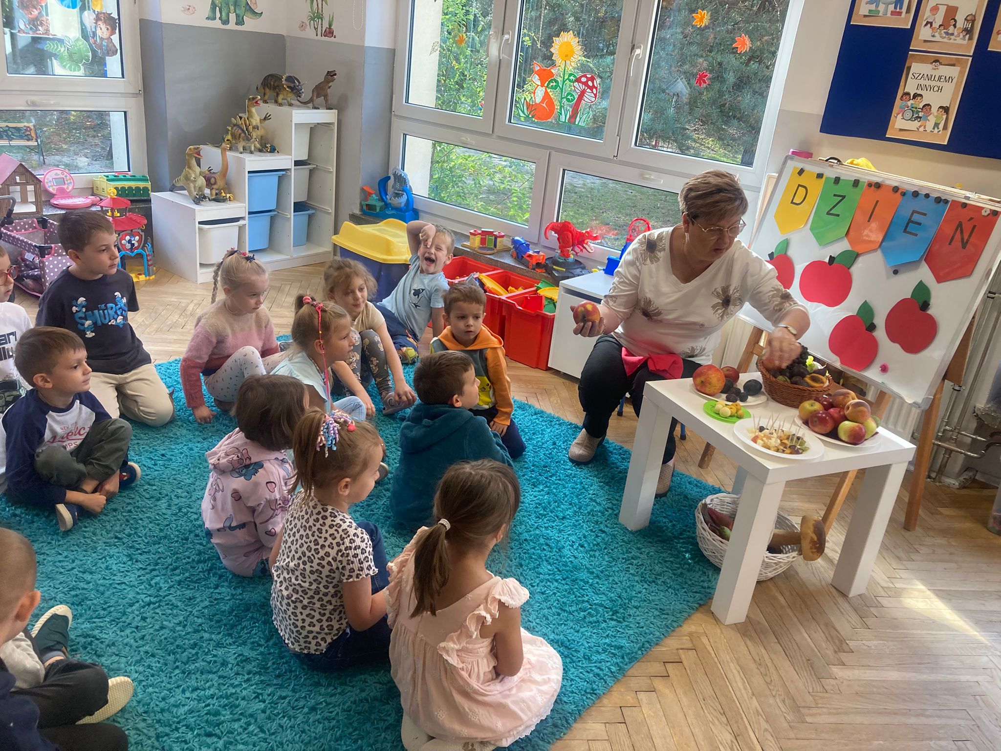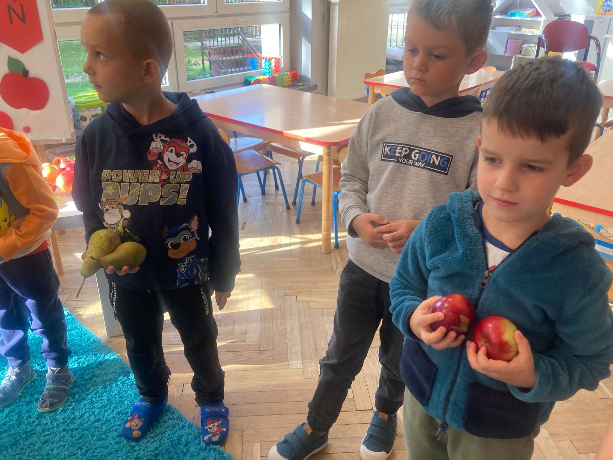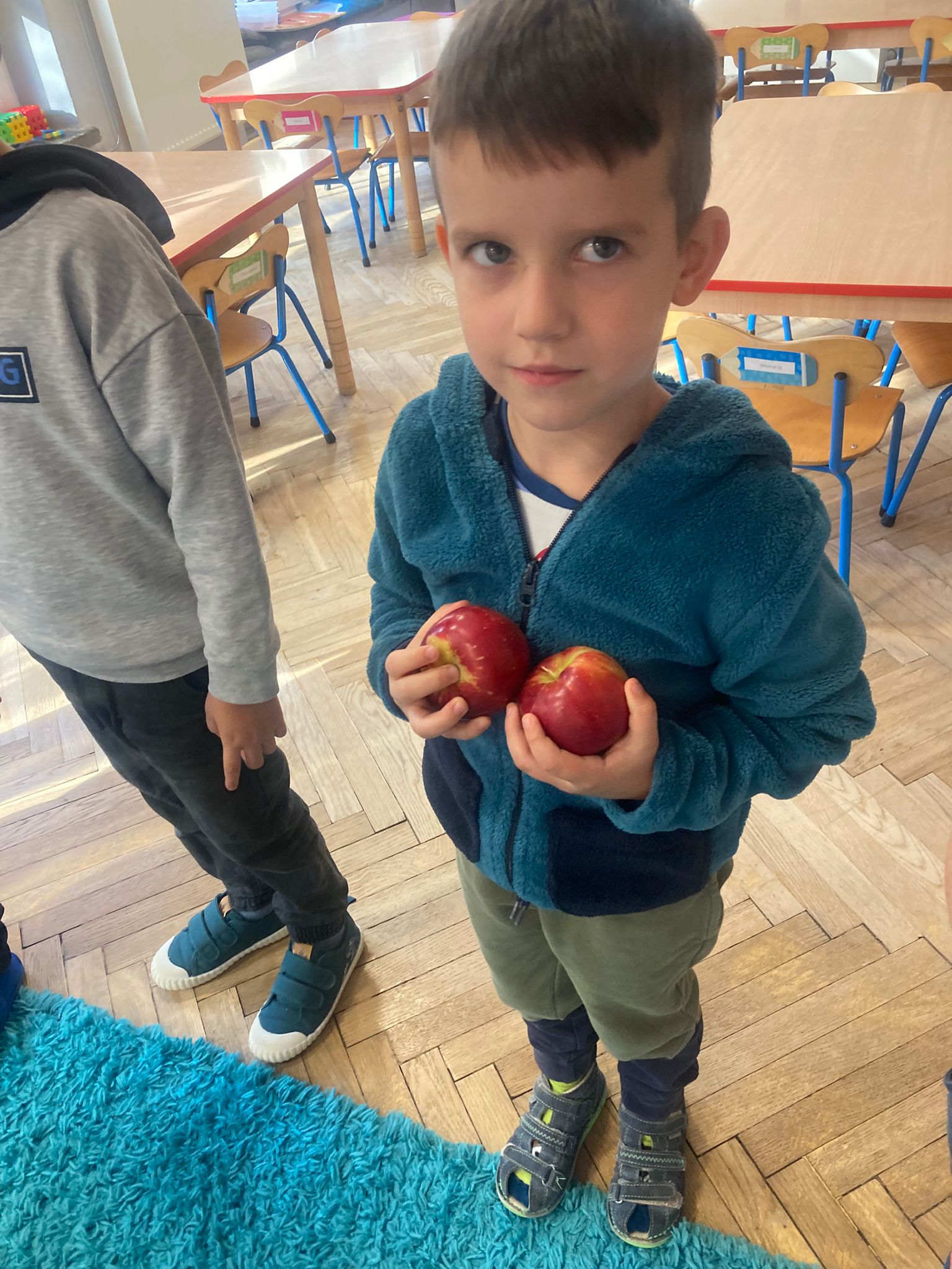 Nowa pora roku przyniosła nam wiele ciekawych pomysłów na jesiennne zabawy i zajęca edukacyjne. Dzisiaj poznawaliśmy dary , które przynosi nam nowa pora roku. Rozmawialiśmy o wocach jesieni i nie tylko o tych z sadu ale także z lasu. Żołędzie , kasztany, grzyby,orzechy, jarzębina obok owoców które zbieramy w sadzie . Degustowaliśmy owoców, poznając nowe smaki, odgadywaliśmy - co jemy? Rozwijaliśmy również koordynację naszych ruchów przenosząc jabłuszko po wyznaczonym torze. Z okazji Dnia Jabłka szczególną uwagę poświeciliśmy jabłuszkom, oglądaliśmy ich środek , omawialiśmy kolo, smak. Z" Panią Jesienią" bawiliśmy sie przy piosence pt"Dary Jesieni". Zdobyte wiadomości utrwalaliśmy na kartach pracy.