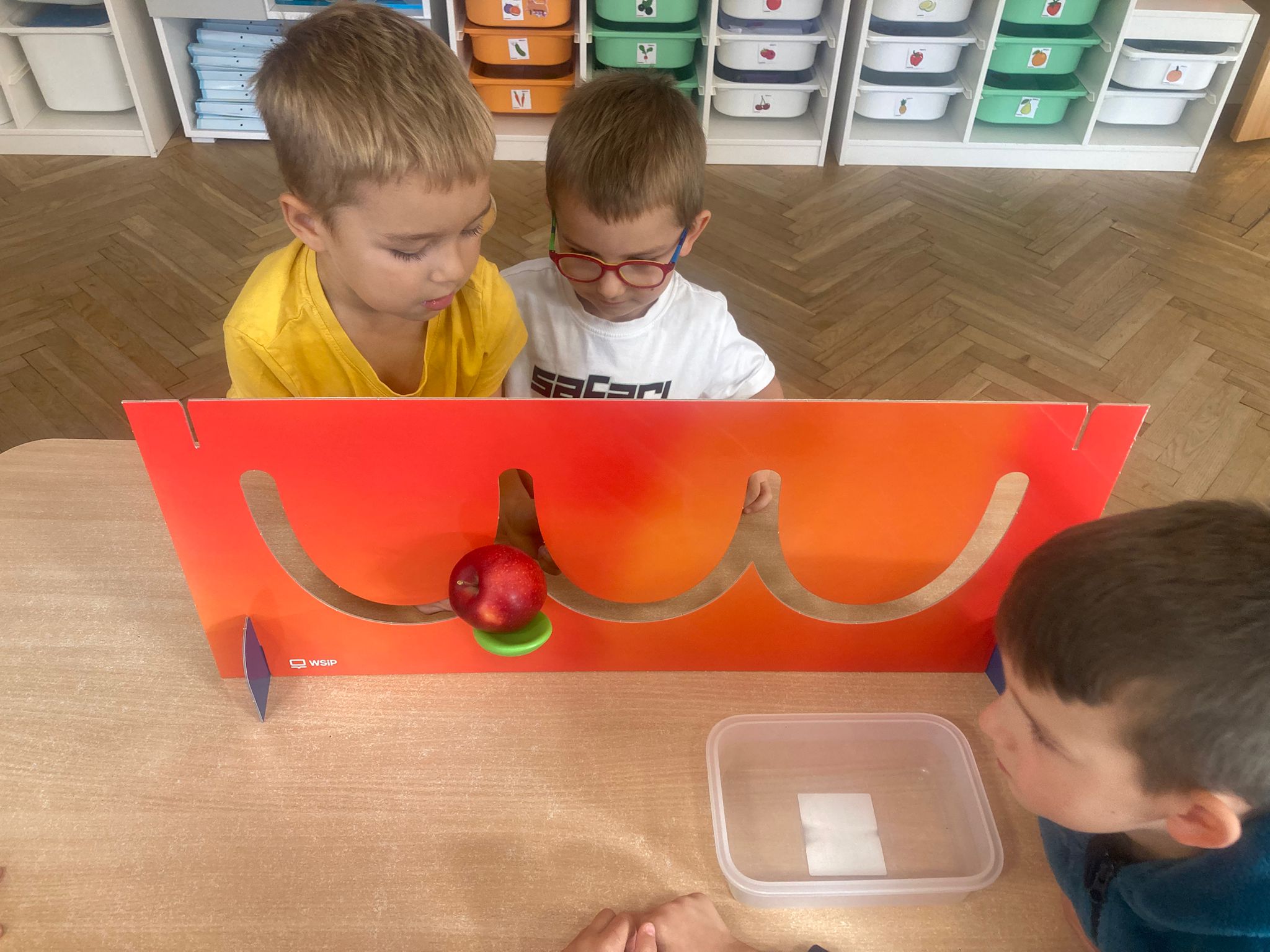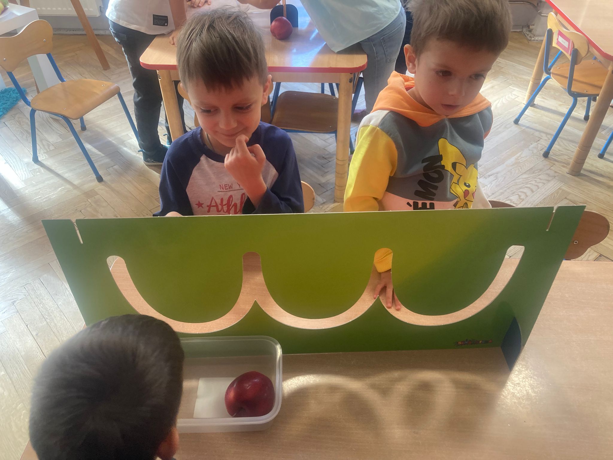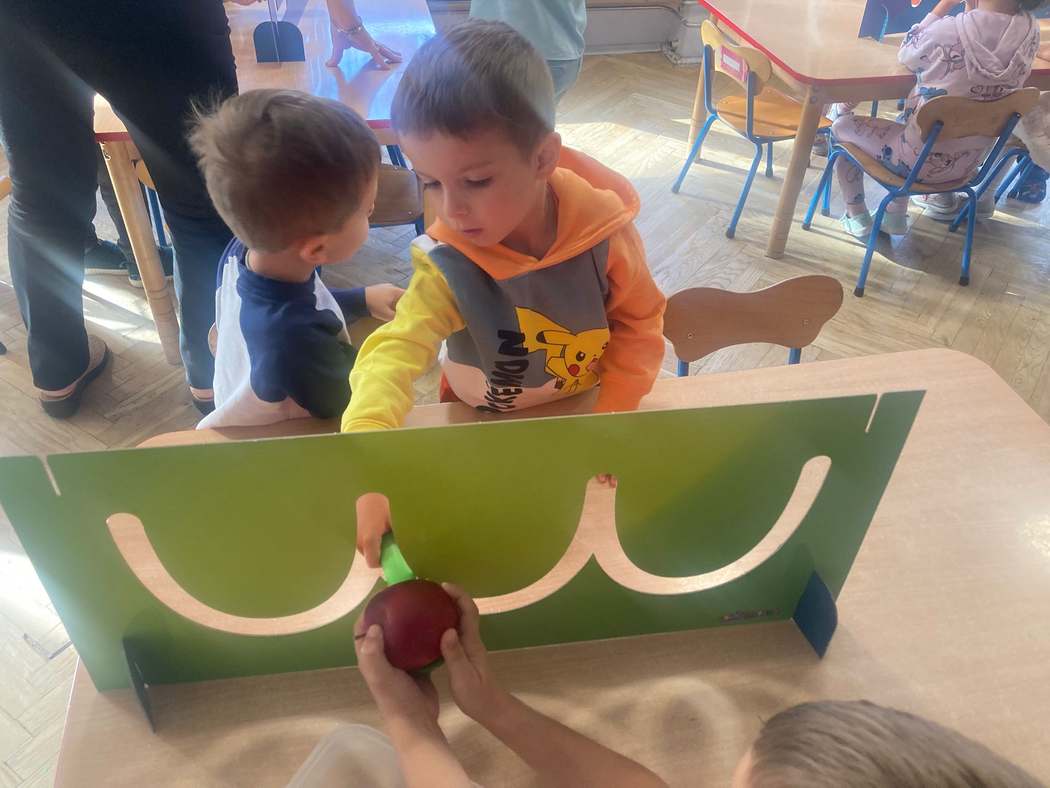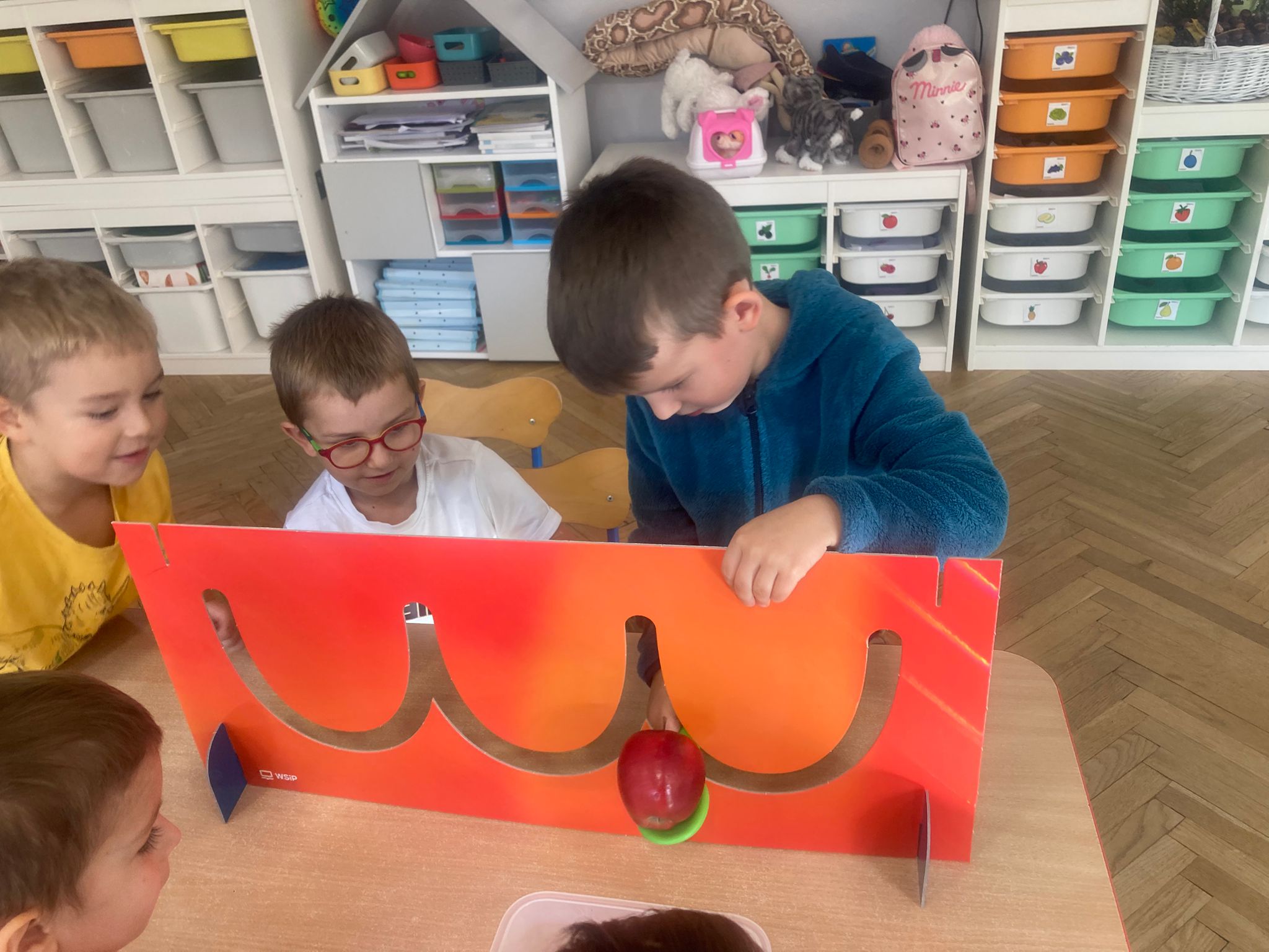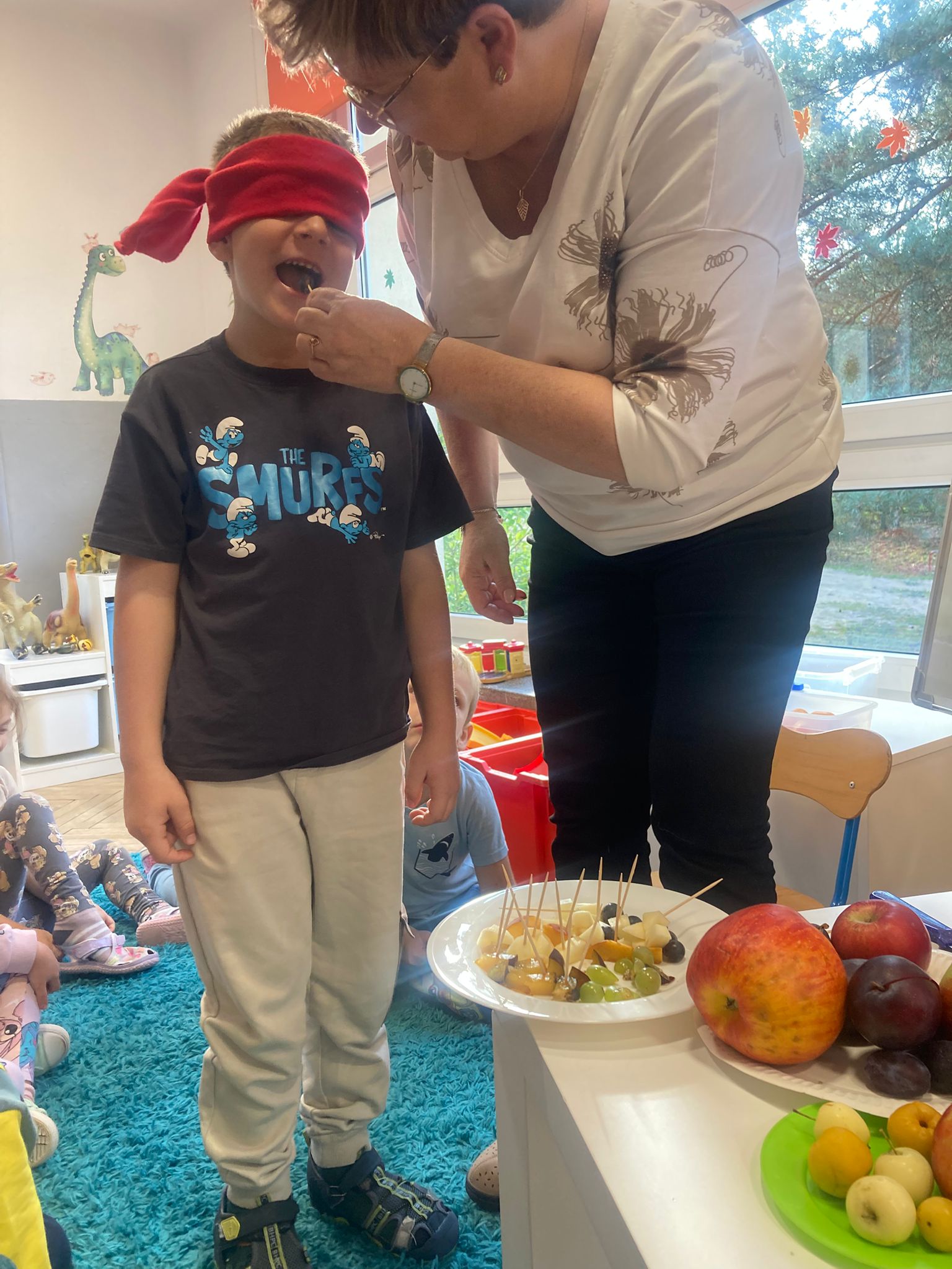 Nowa pora roku przyniosła nam wiele ciekawych pomysłów na jesiennne zabawy i zajęca edukacyjne. Dzisiaj poznawaliśmy dary , które przynosi nam nowa pora roku. Rozmawialiśmy o wocach jesieni i nie tylko o tych z sadu ale także z lasu. Żołędzie , kasztany, grzyby,orzechy, jarzębina obok owoców które zbieramy w sadzie . Degustowaliśmy owoców, poznając nowe smaki, odgadywaliśmy - co jemy? Rozwijaliśmy również koordynację naszych ruchów przenosząc jabłuszko po wyznaczonym torze. Z okazji Dnia Jabłka szczególną uwagę poświeciliśmy jabłuszkom, oglądaliśmy ich środek , omawialiśmy kolo, smak. Z" Panią Jesienią" bawiliśmy sie przy piosence pt"Dary Jesieni". Zdobyte wiadomości utrwalaliśmy na kartach pracy.