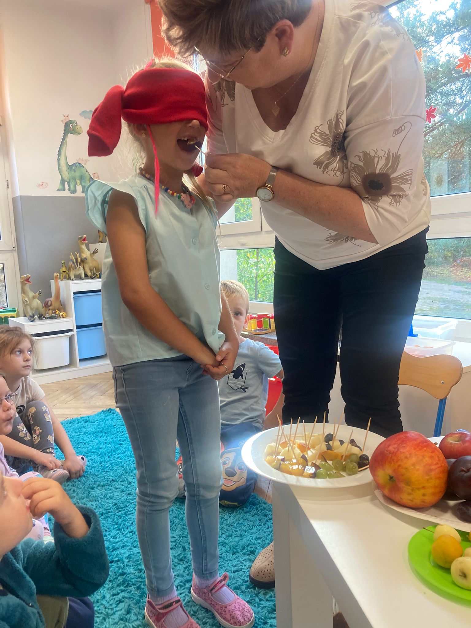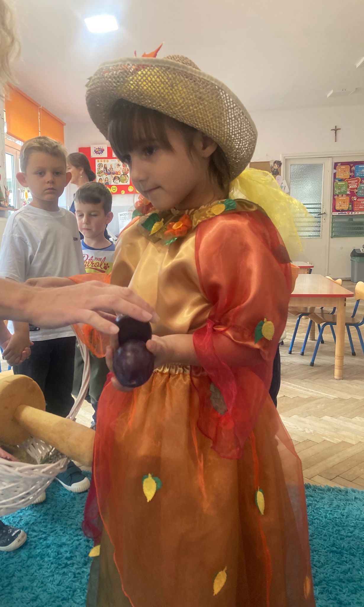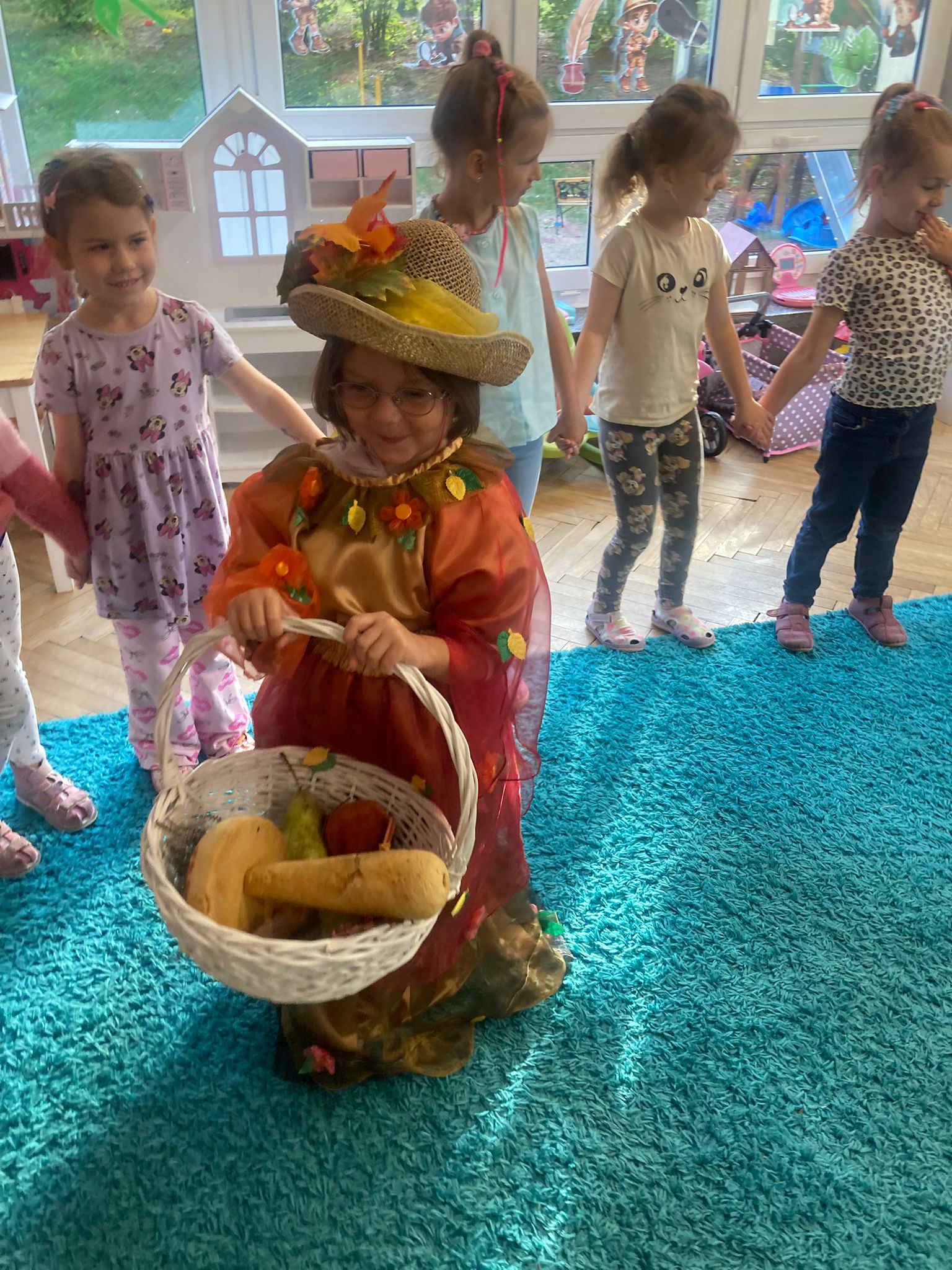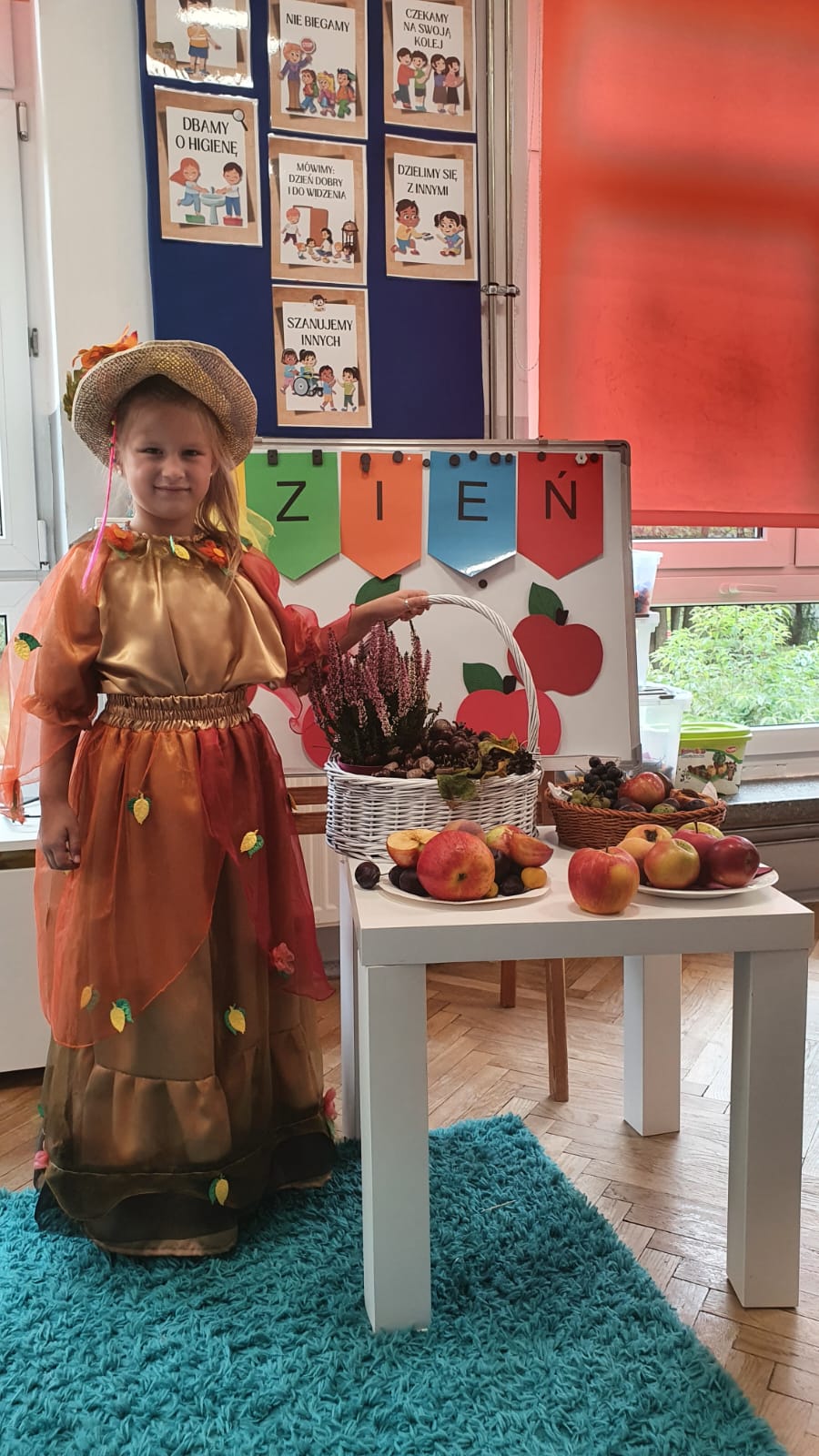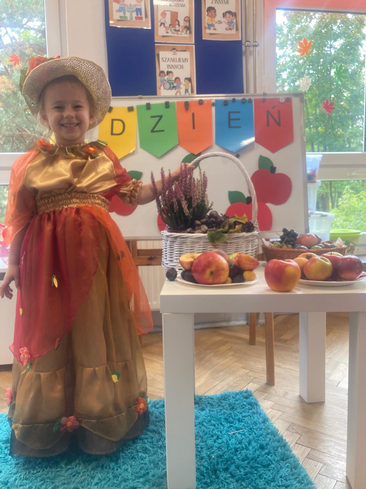Nowa pora roku przyniosła nam wiele ciekawych pomysłów na jesiennne zabawy i zajęca edukacyjne. Dzisiaj poznawaliśmy dary , które przynosi nam nowa pora roku. Rozmawialiśmy o wocach jesieni i nie tylko o tych z sadu ale także z lasu. Żołędzie , kasztany, grzyby,orzechy, jarzębina obok owoców które zbieramy w sadzie . Degustowaliśmy owoców, poznając nowe smaki, odgadywaliśmy - co jemy? Rozwijaliśmy również koordynację naszych ruchów przenosząc jabłuszko po wyznaczonym torze. Z okazji Dnia Jabłka szczególną uwagę poświeciliśmy jabłuszkom, oglądaliśmy ich środek , omawialiśmy kolo, smak. Z" Panią Jesienią" bawiliśmy sie przy piosence pt"Dary Jesieni". Zdobyte wiadomości utrwalaliśmy na kartach pracy.