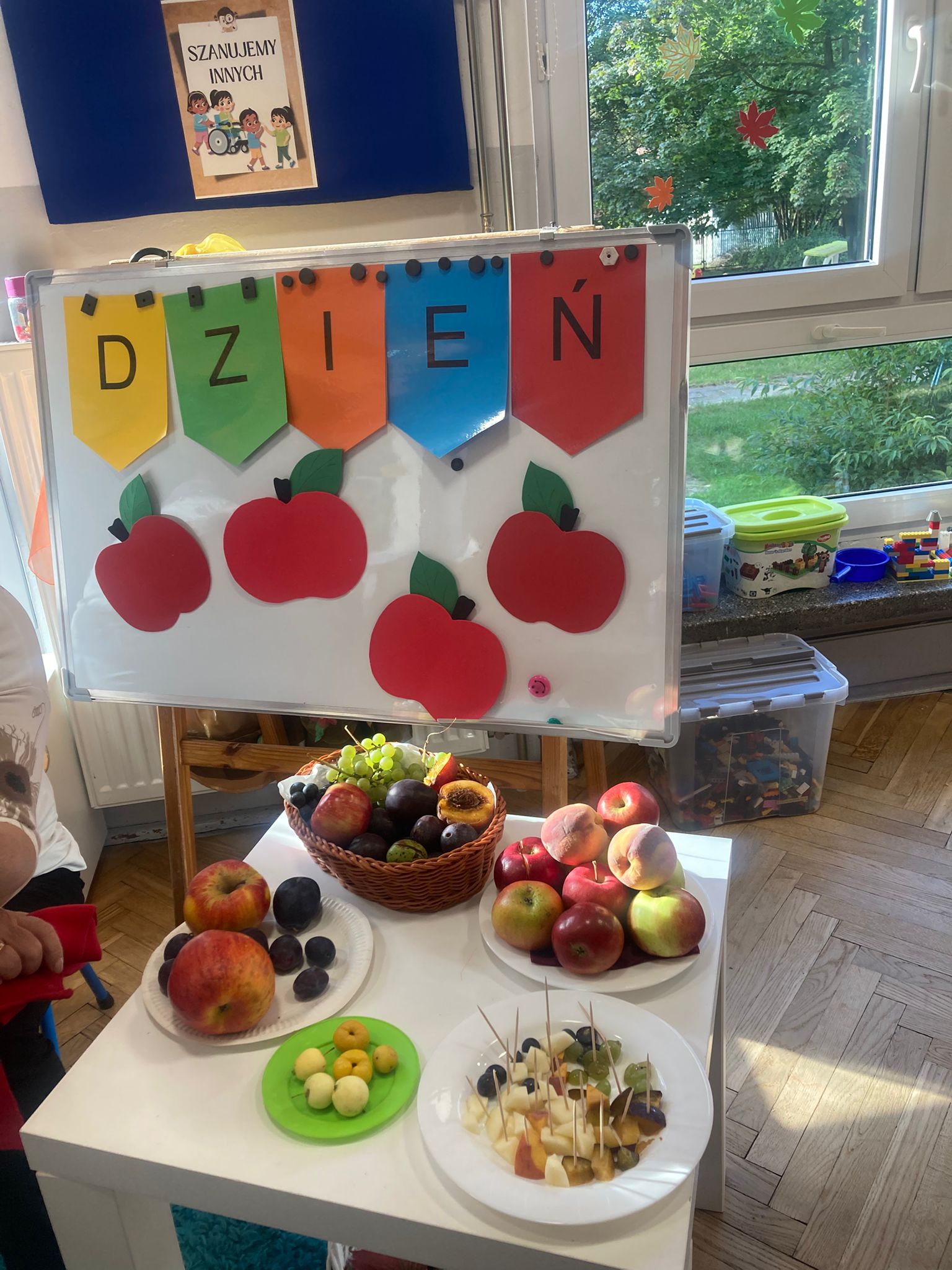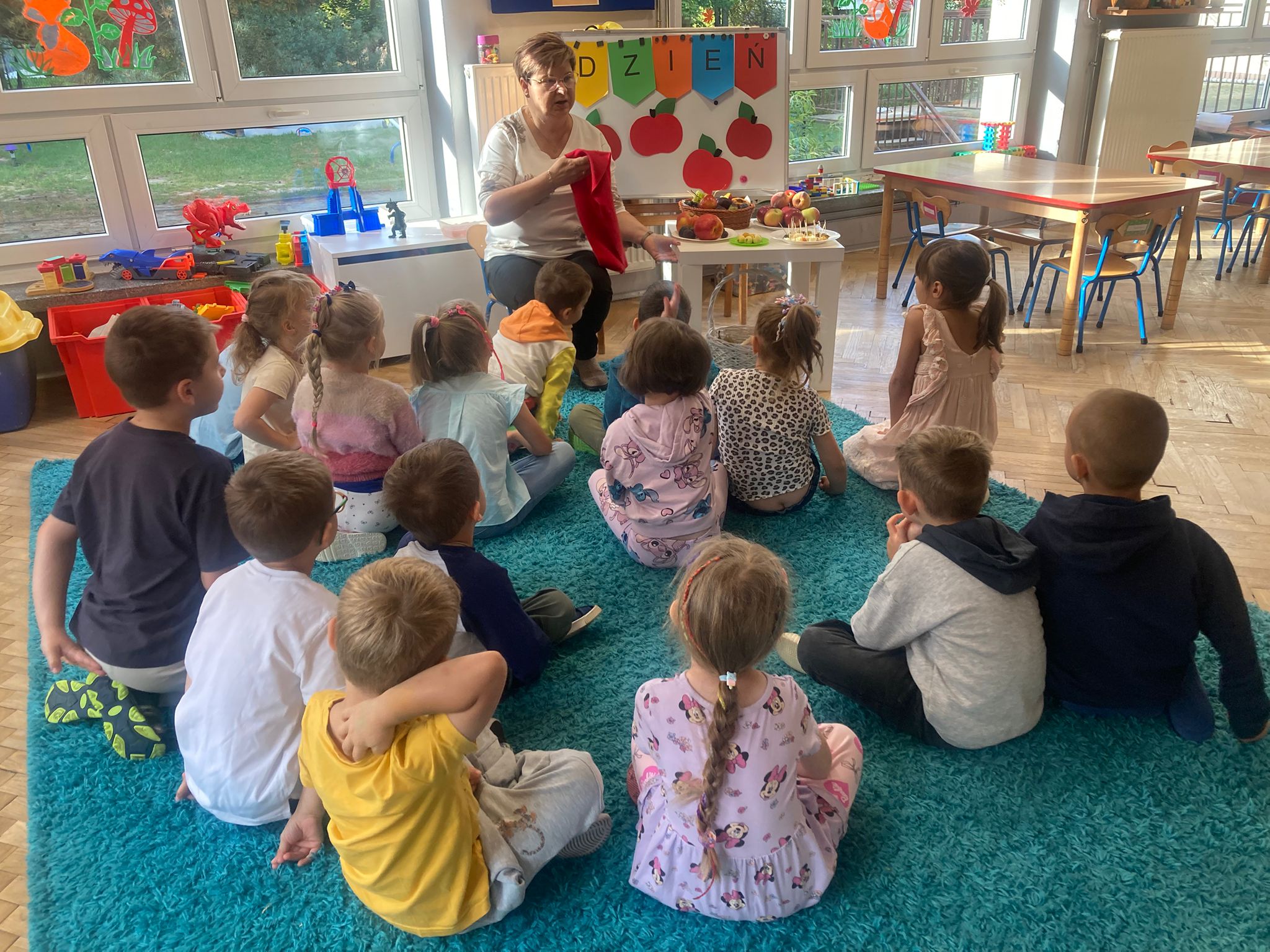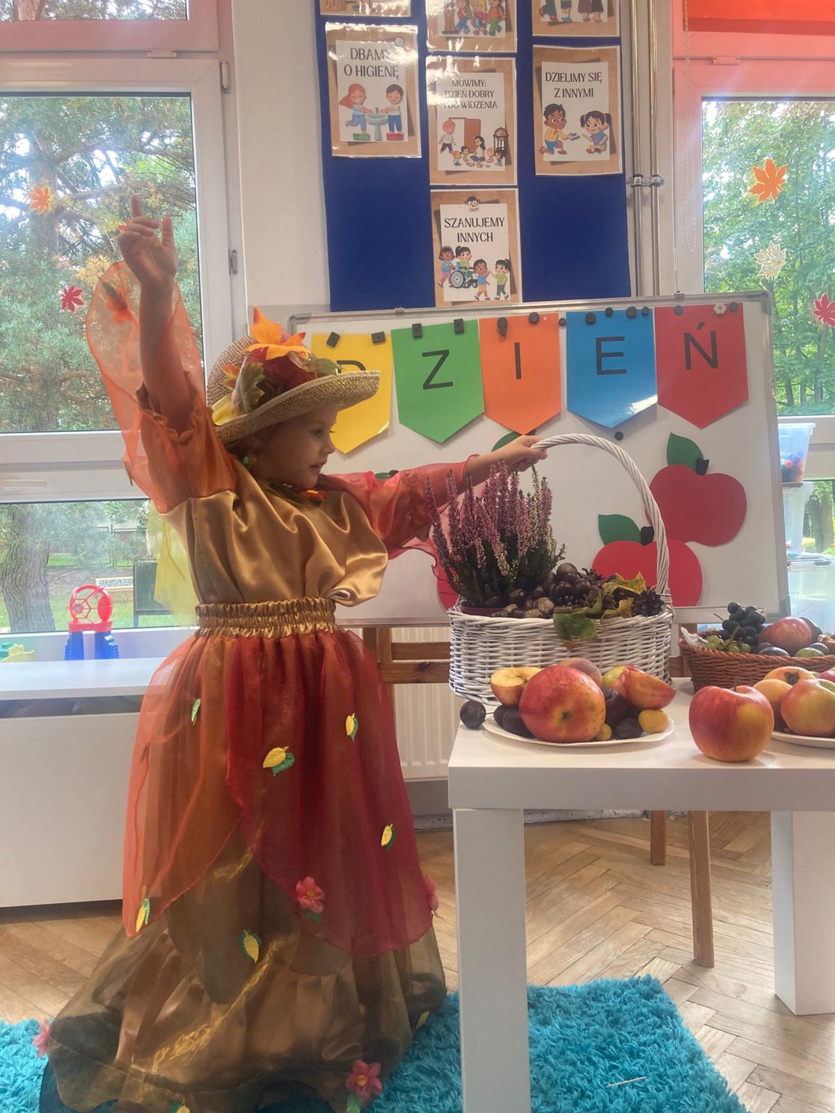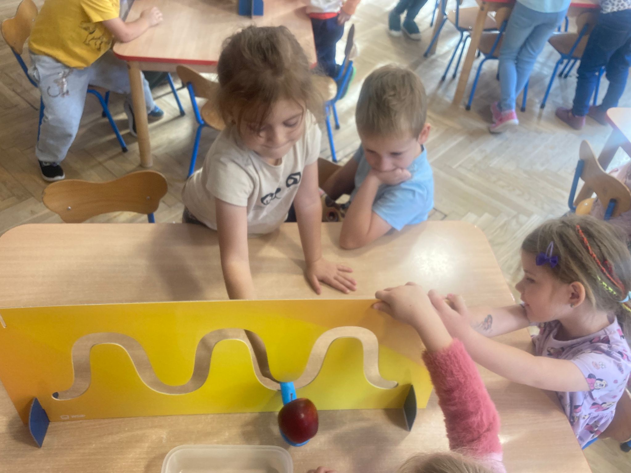 Nowa pora roku przyniosła nam wiele ciekawych pomysłów na jesiennne zabawy i zajęca edukacyjne. Dzisiaj poznawaliśmy dary , które przynosi nam nowa pora roku. Rozmawialiśmy o wocach jesieni i nie tylko o tych z sadu ale także z lasu. Żołędzie , kasztany, grzyby,orzechy, jarzębina obok owoców które zbieramy w sadzie . Degustowaliśmy owoców, poznając nowe smaki, odgadywaliśmy - co jemy? Rozwijaliśmy również koordynację naszych ruchów przenosząc jabłuszko po wyznaczonym torze. Z okazji Dnia Jabłka szczególną uwagę poświeciliśmy jabłuszkom, oglądaliśmy ich środek , omawialiśmy kolo, smak. Z" Panią Jesienią" bawiliśmy sie przy piosence pt"Dary Jesieni". Zdobyte wiadomości utrwalaliśmy na kartach pracy.