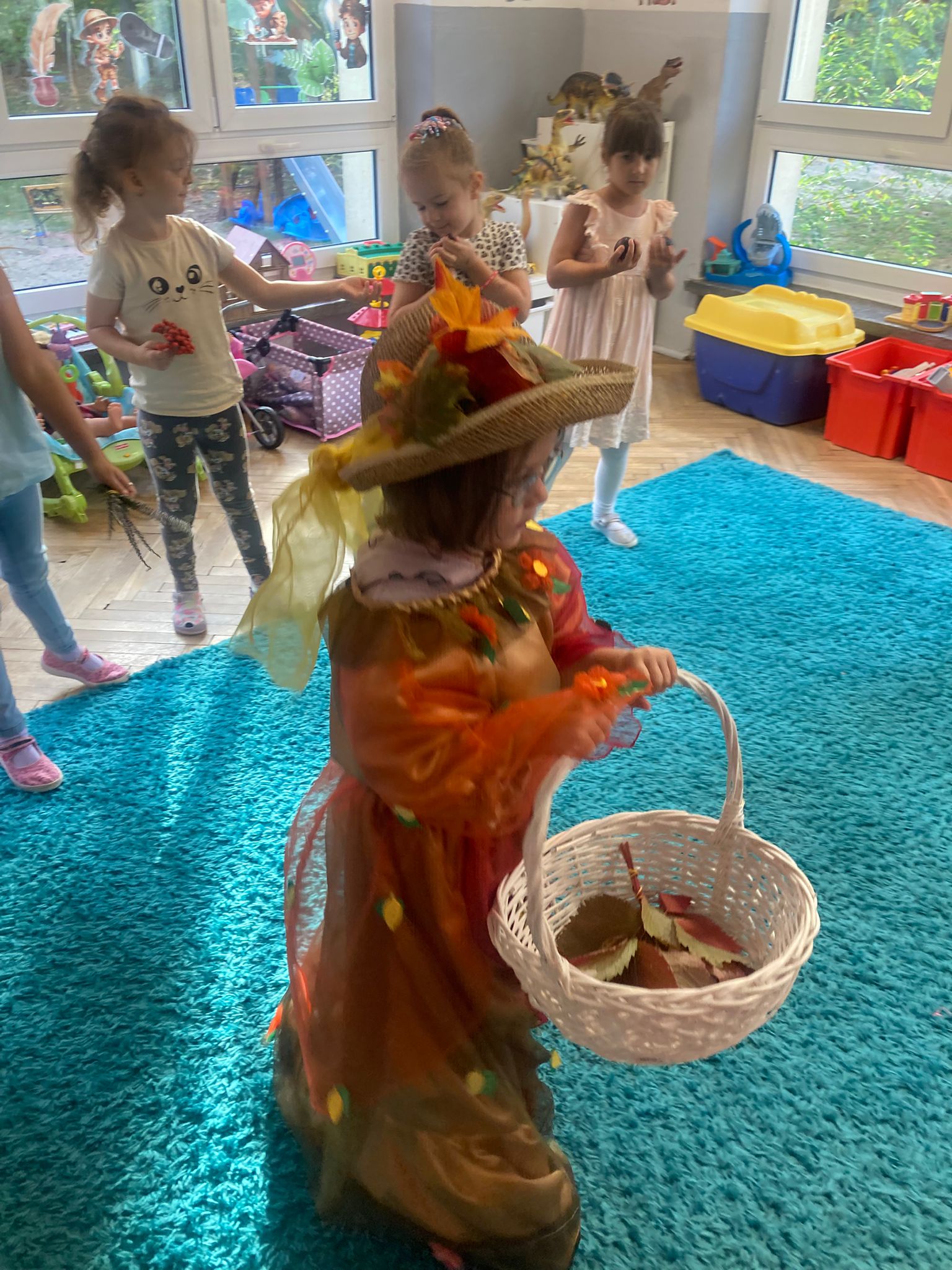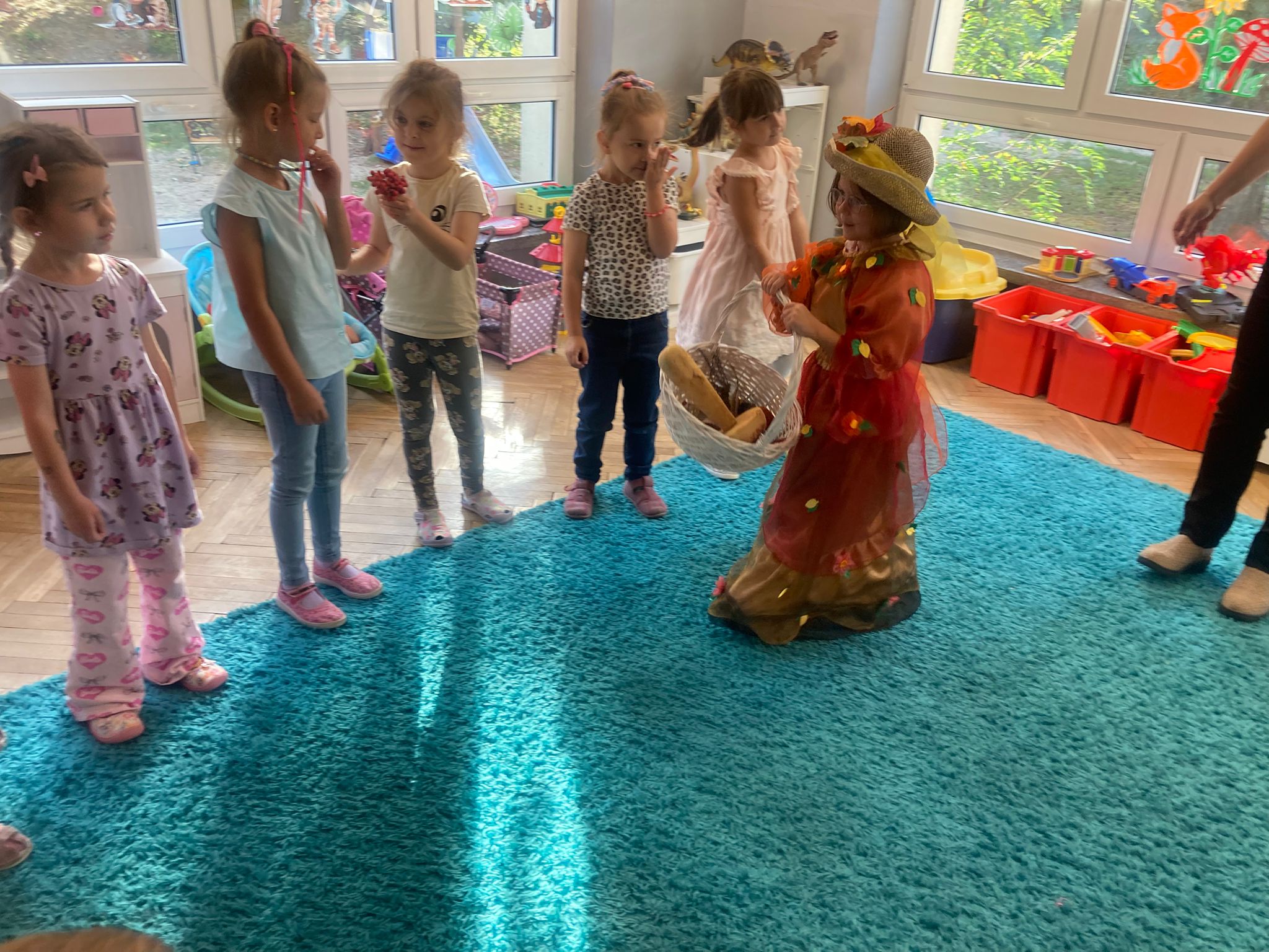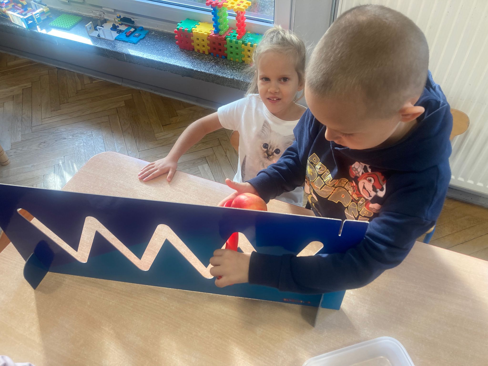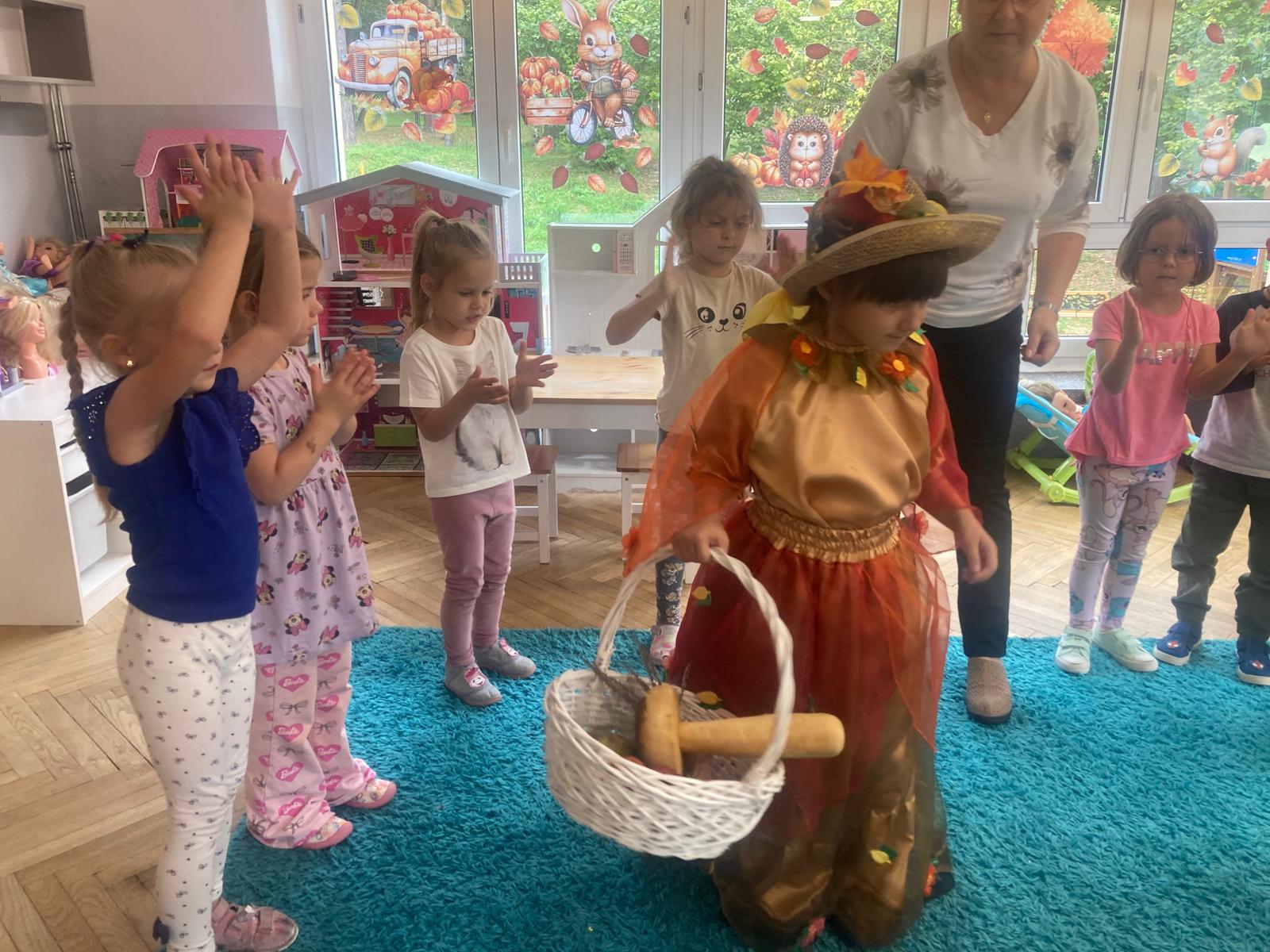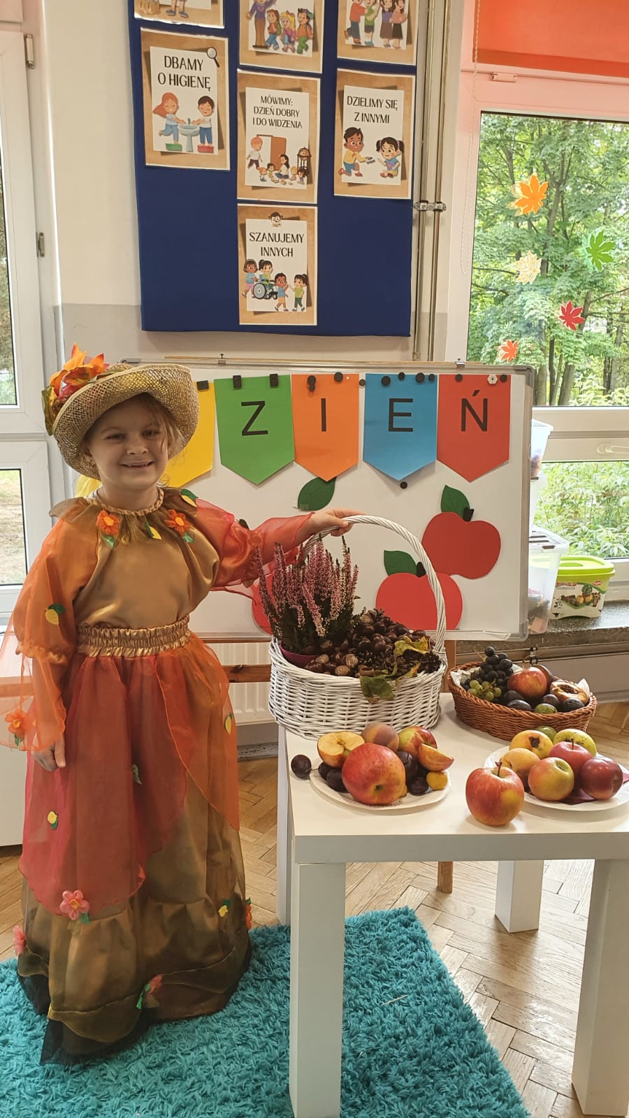 Nowa pora roku przyniosła nam wiele ciekawych pomysłów na jesiennne zabawy i zajęca edukacyjne. Dzisiaj poznawaliśmy dary , które przynosi nam nowa pora roku. Rozmawialiśmy o wocach jesieni i nie tylko o tych z sadu ale także z lasu. Żołędzie , kasztany, grzyby,orzechy, jarzębina obok owoców które zbieramy w sadzie . Degustowaliśmy owoców, poznając nowe smaki, odgadywaliśmy - co jemy? Rozwijaliśmy również koordynację naszych ruchów przenosząc jabłuszko po wyznaczonym torze. Z okazji Dnia Jabłka szczególną uwagę poświeciliśmy jabłuszkom, oglądaliśmy ich środek , omawialiśmy kolo, smak. Z" Panią Jesienią" bawiliśmy sie przy piosence pt"Dary Jesieni". Zdobyte wiadomości utrwalaliśmy na kartach pracy.