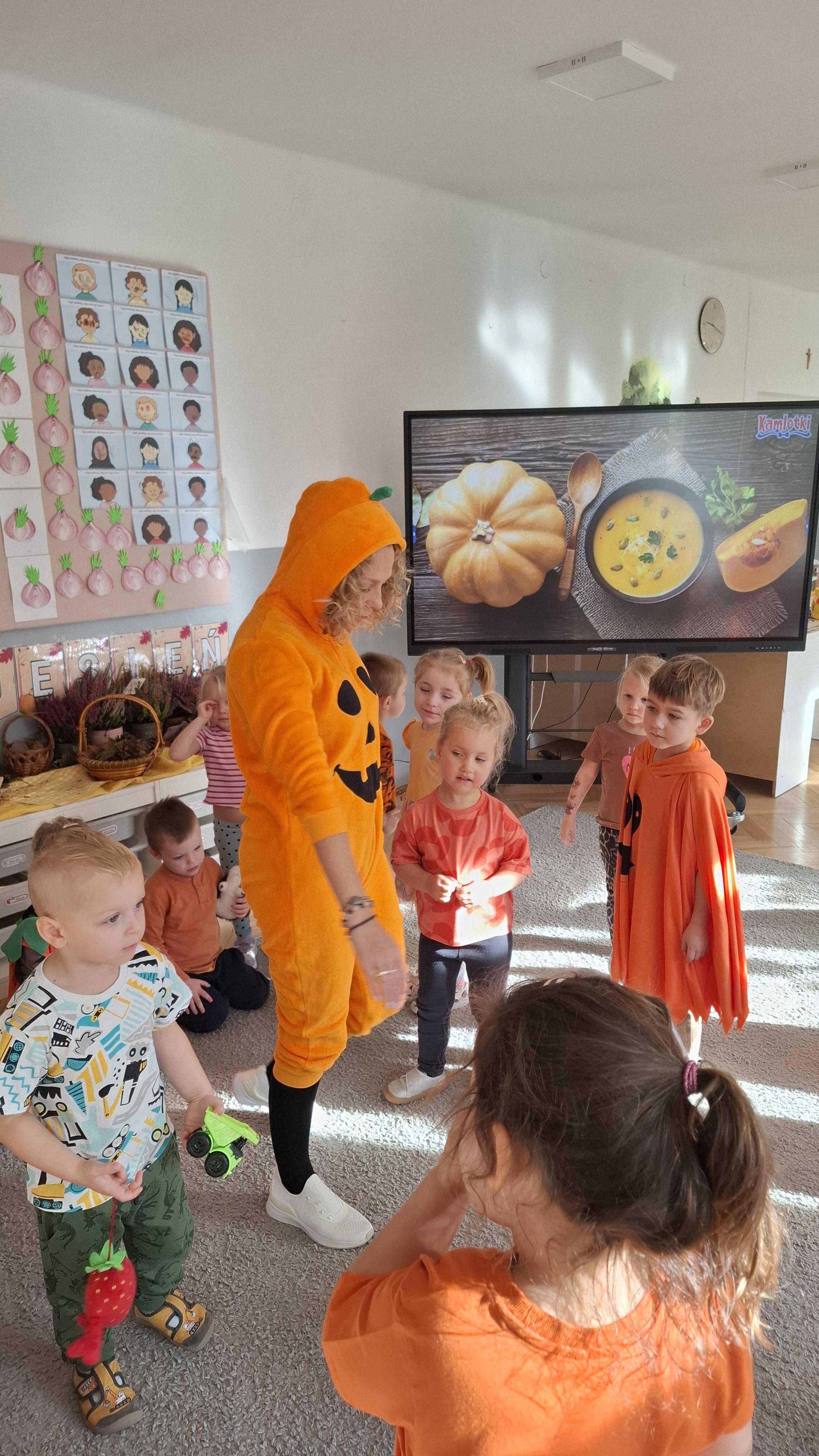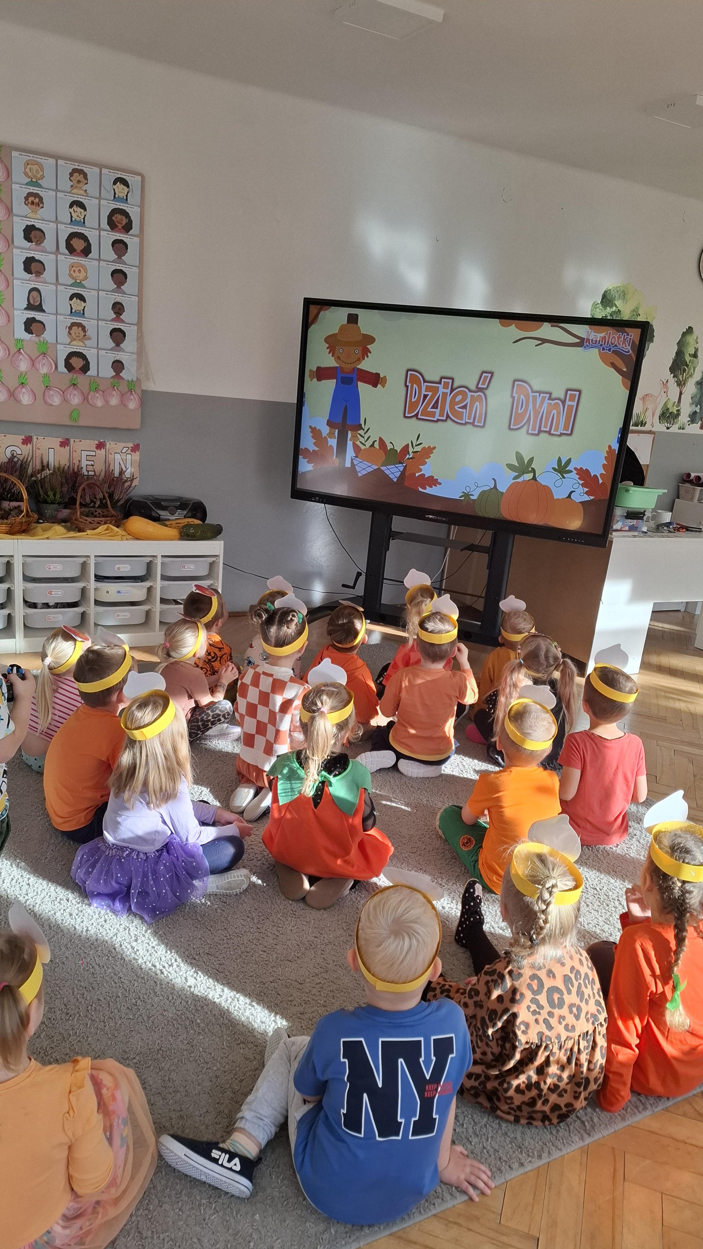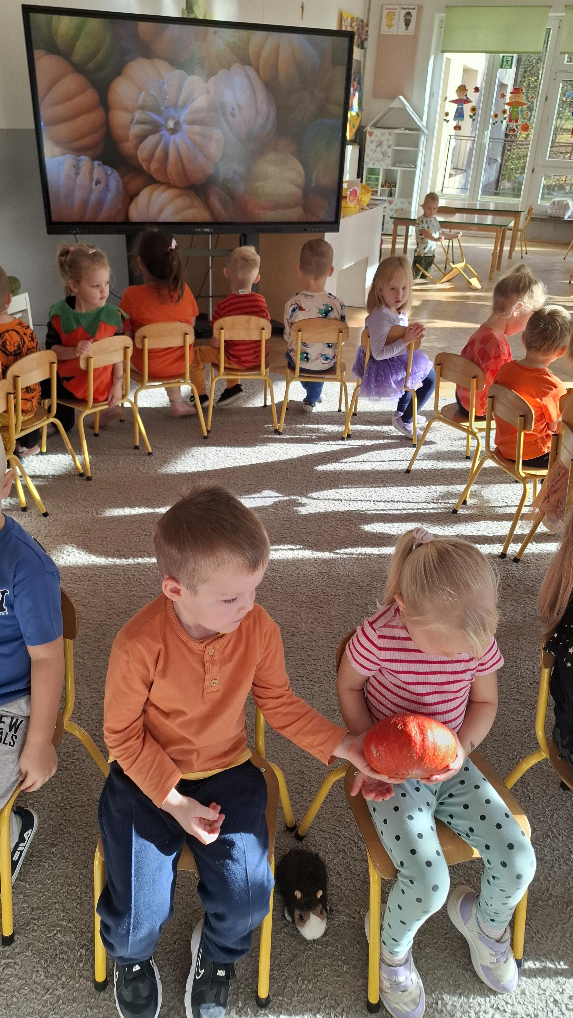 Na początku dzieci obejrzały film edukacyjny o dyni, dzięki któremu dowiedziały się, skąd pochodzi to warzywo, do czego można je wykorzystać i dlaczego jest takie wyjątkowe.