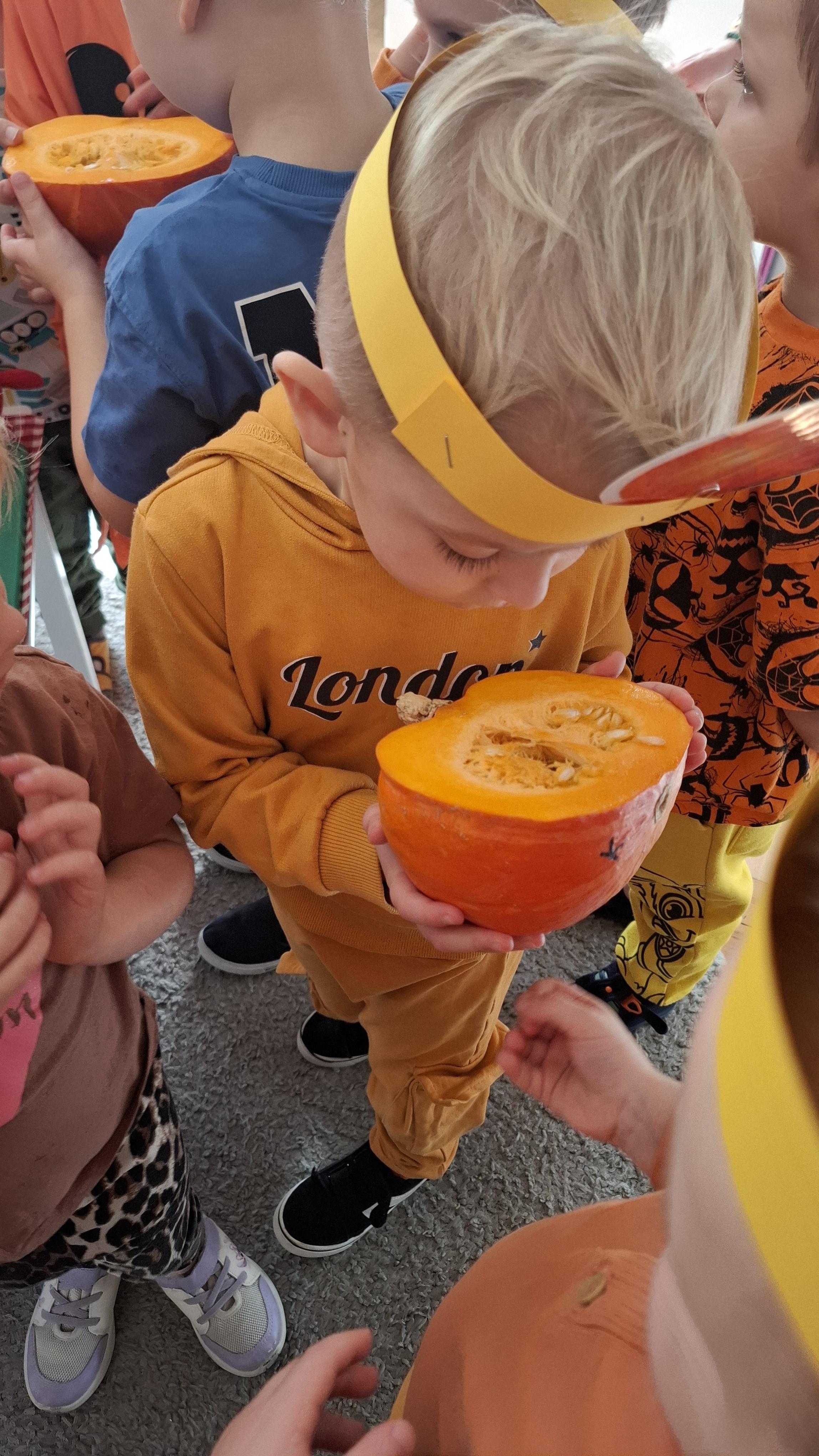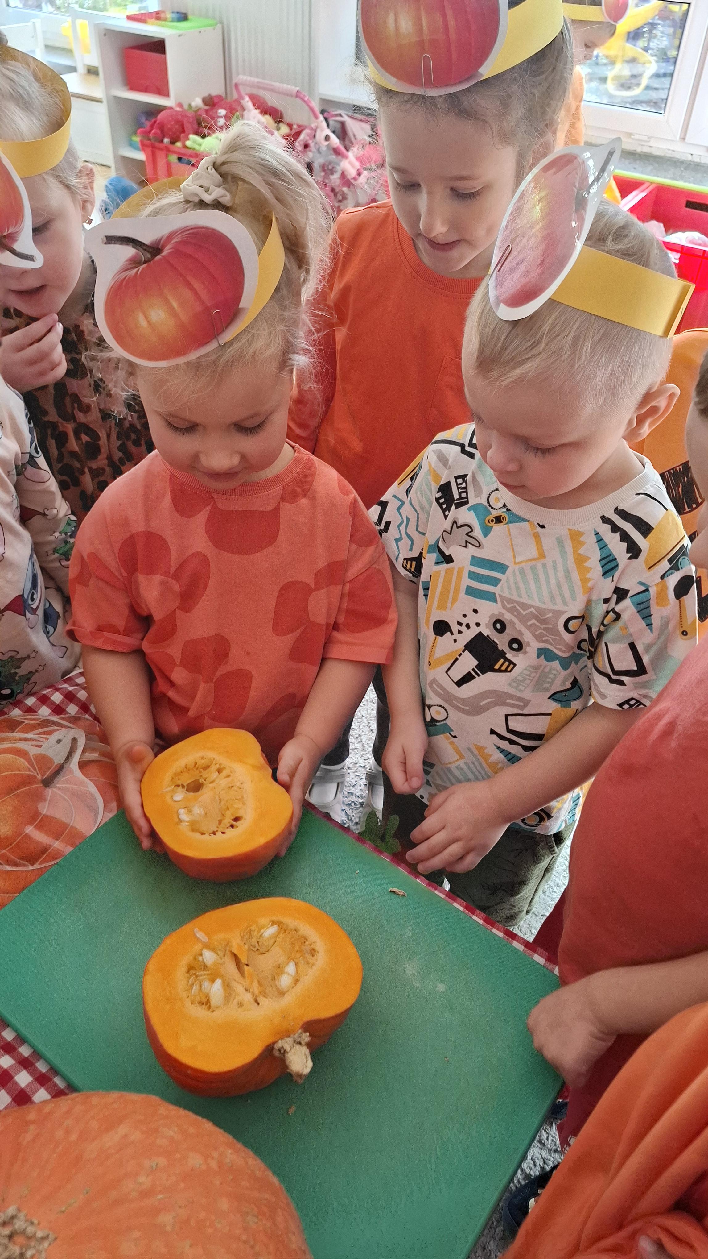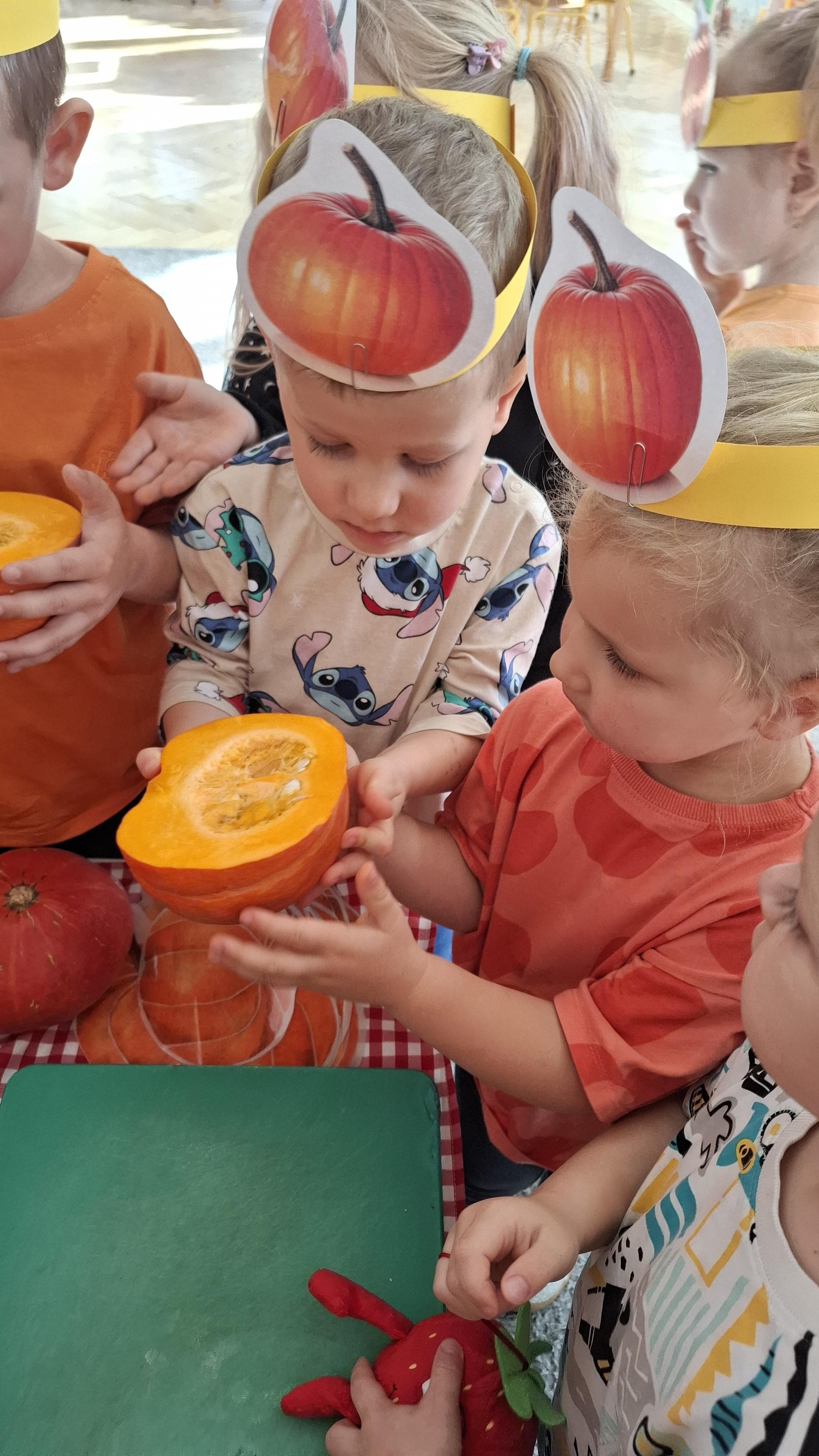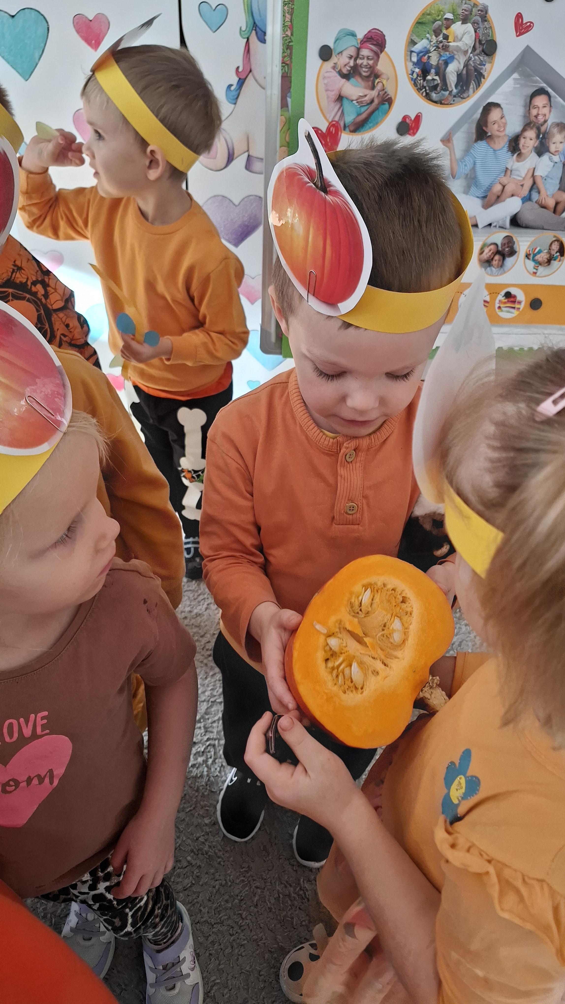 Po seansie rozpoczęliśmy poszukiwania ukrytych w sali dyń. Zabawa przyniosła wszystkim mnóstwo radości i emocji! Następnie dzieci mogły dokładnie obejrzeć dynie – porównywały ich kolory, kształty i wielkość, a także zajrzały do środka, by sprawdzić, jak dynia wygląda w środku, jak pachnie i co kryje – oczywiście pesteczki!
