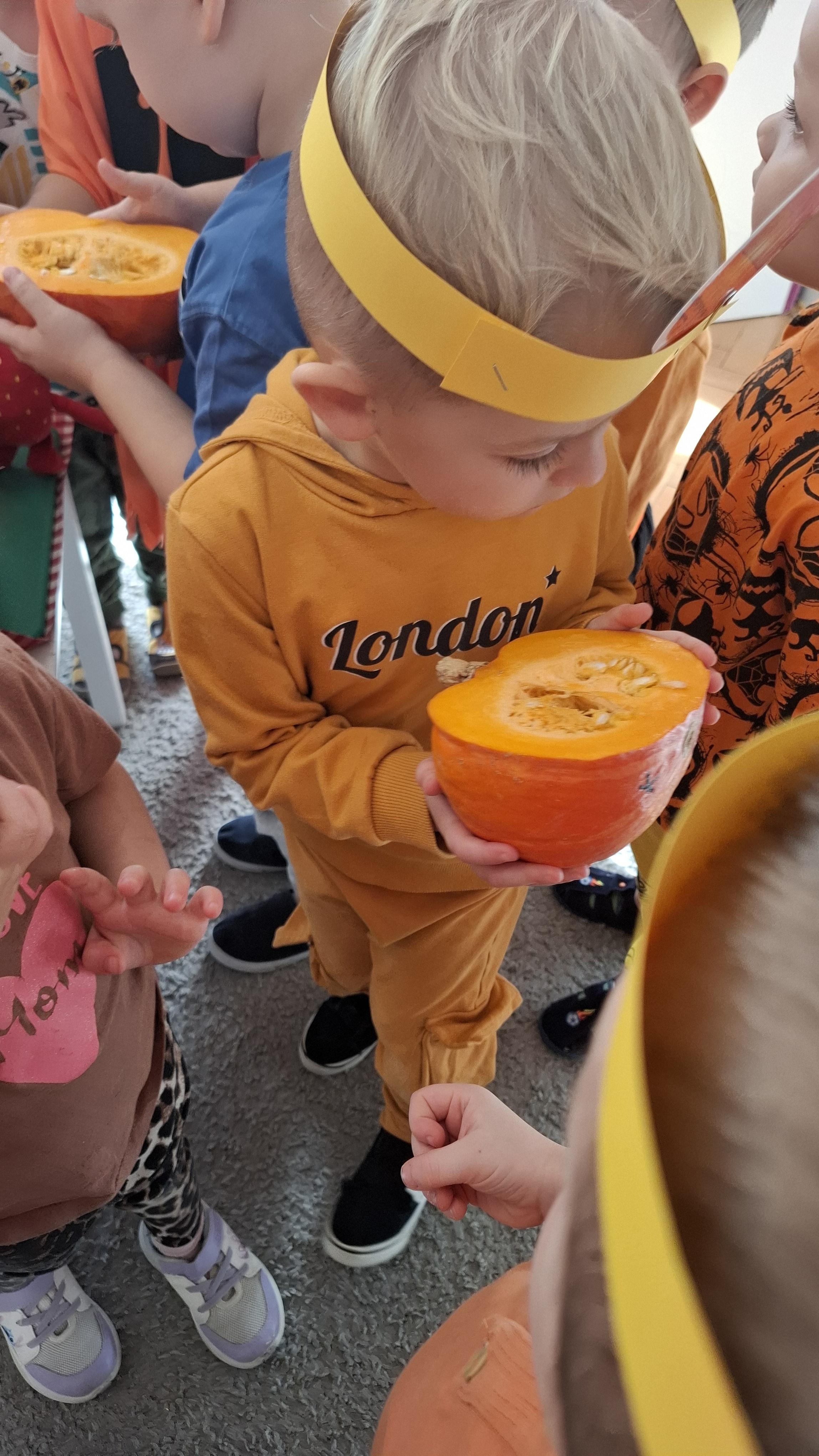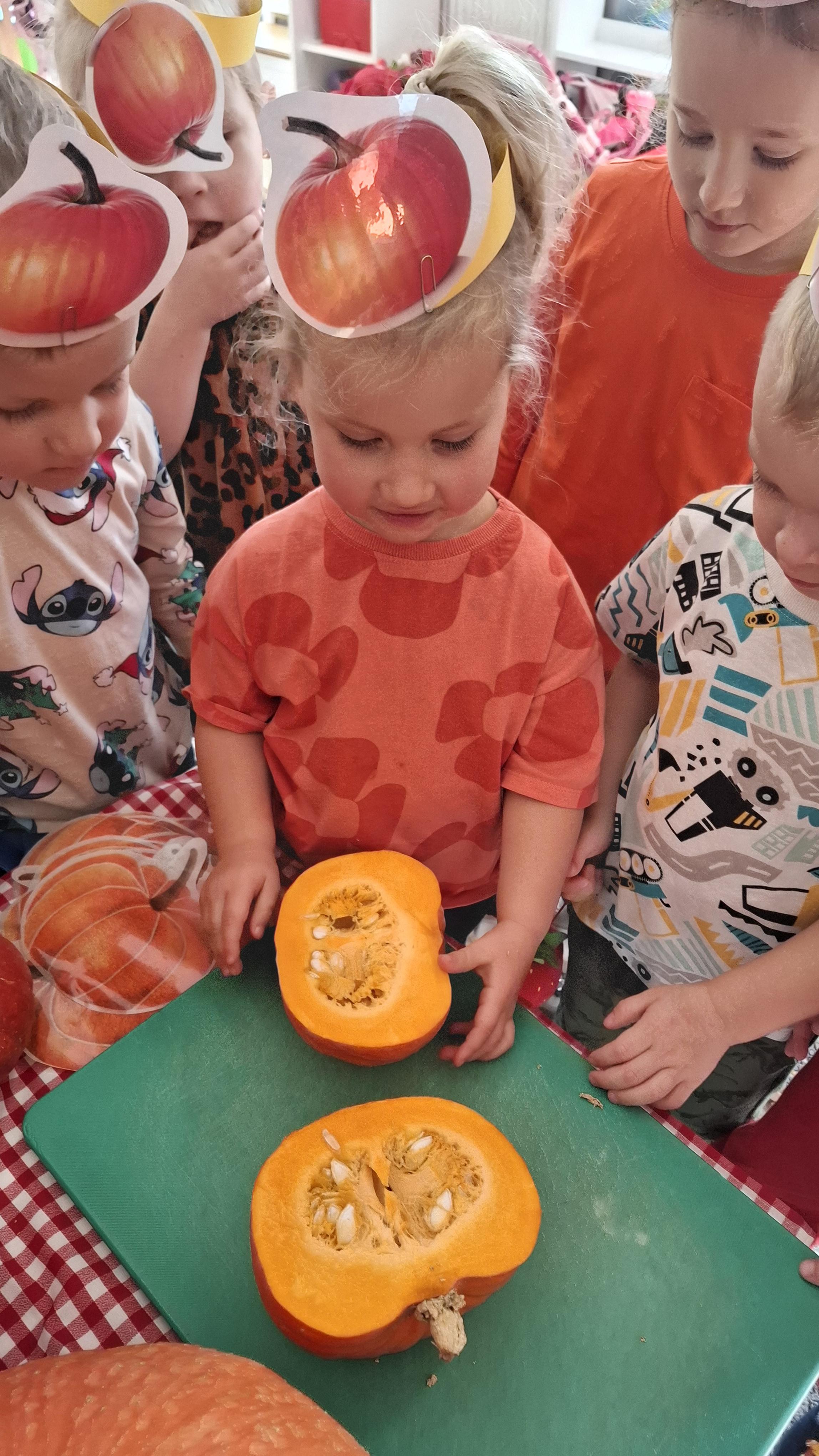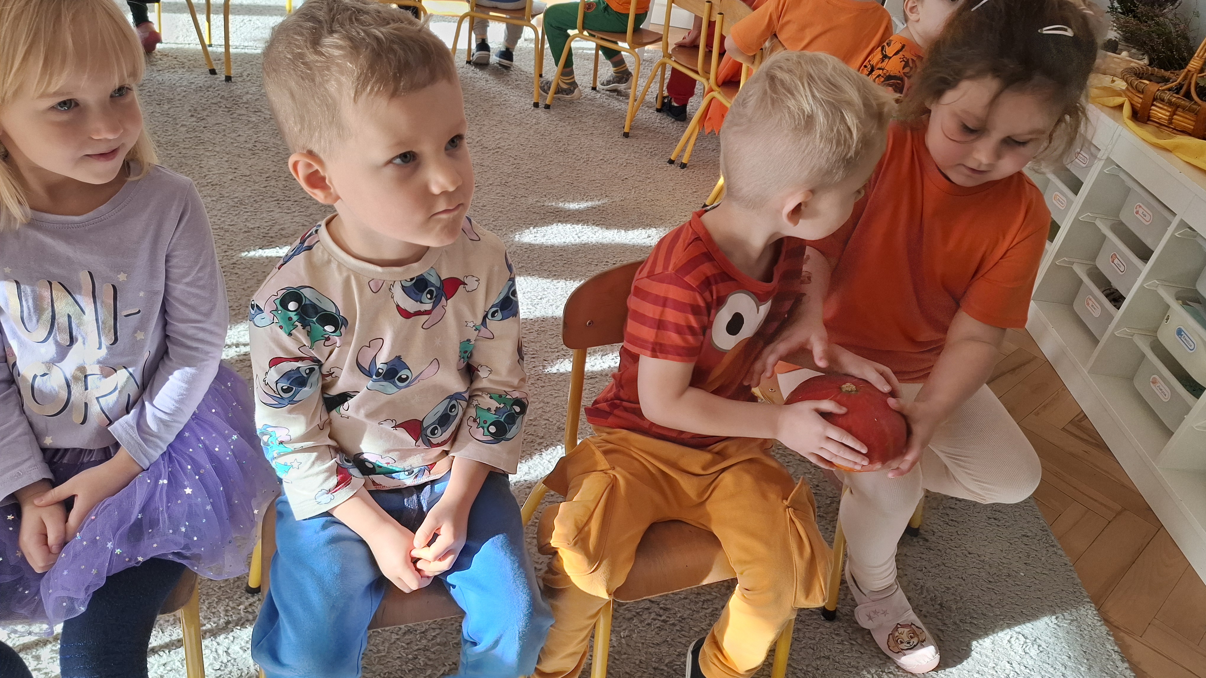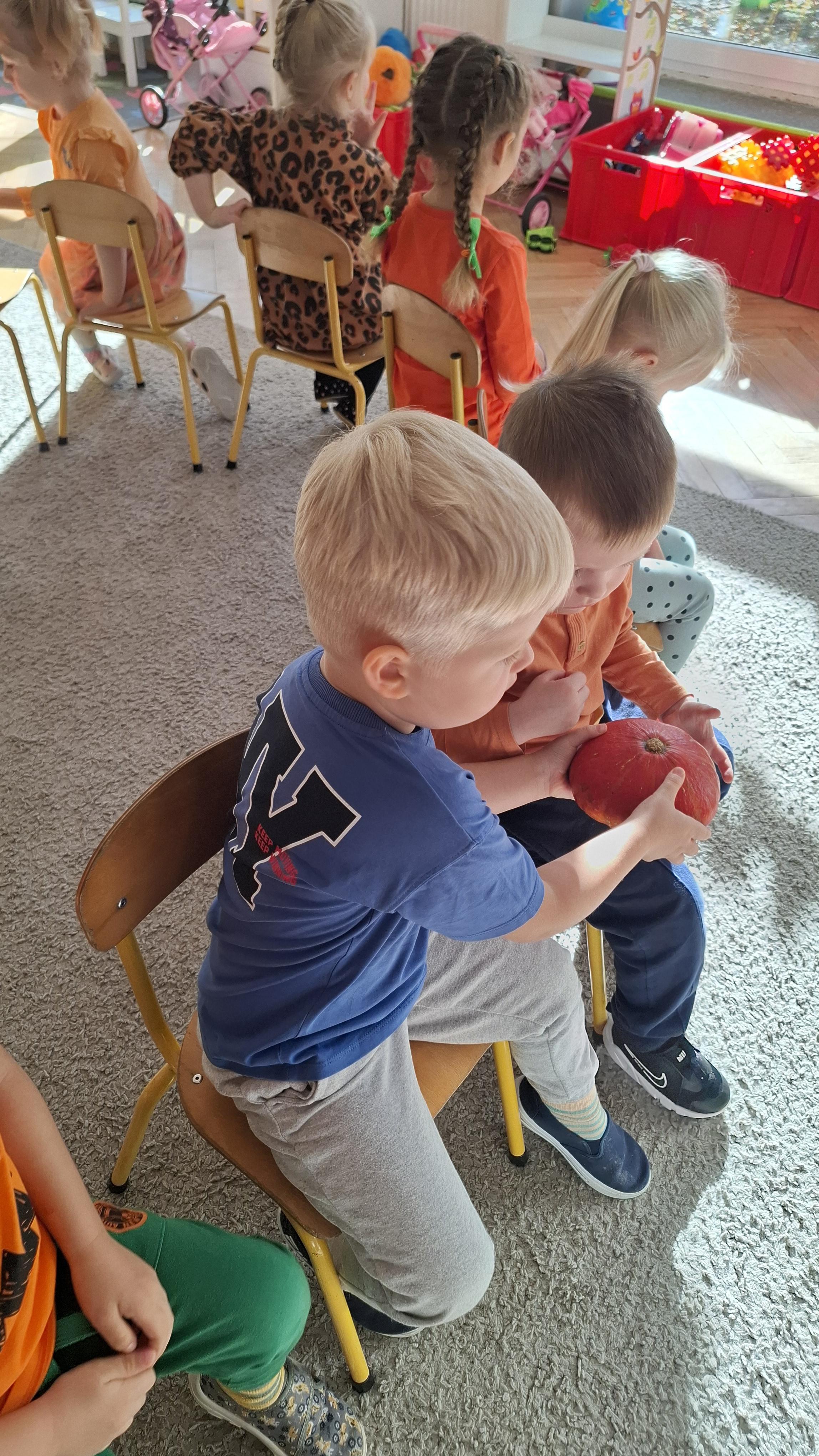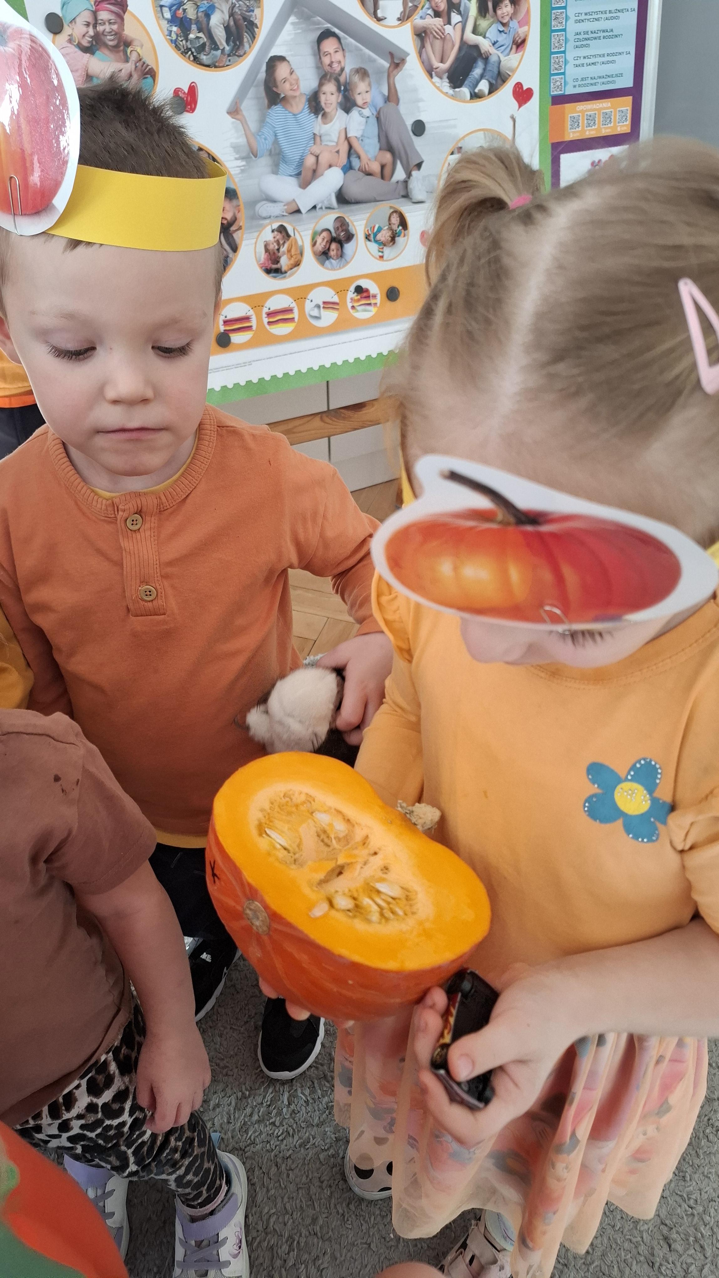 Po seansie rozpoczęliśmy poszukiwania ukrytych w sali dyń. Zabawa przyniosła wszystkim mnóstwo radości i emocji! Następnie dzieci mogły dokładnie obejrzeć dynie – porównywały ich kolory, kształty i wielkość, a także zajrzały do środka, by sprawdzić, jak dynia wygląda w środku, jak pachnie i co kryje – oczywiście pesteczki!