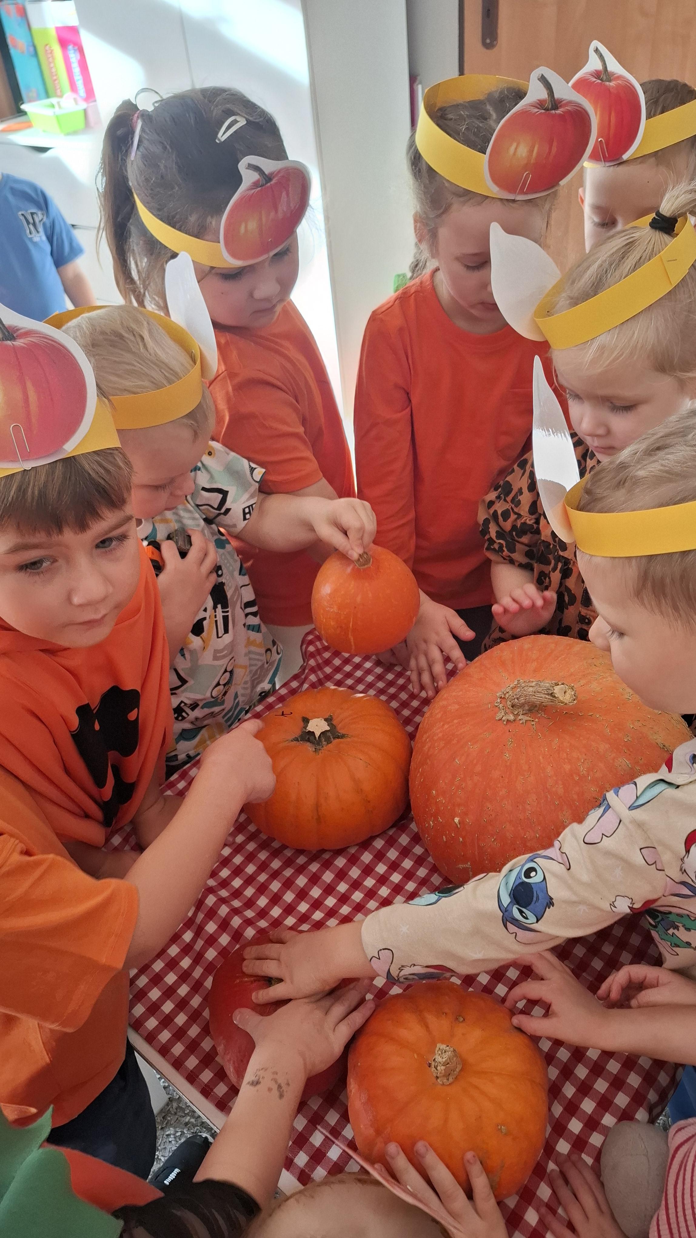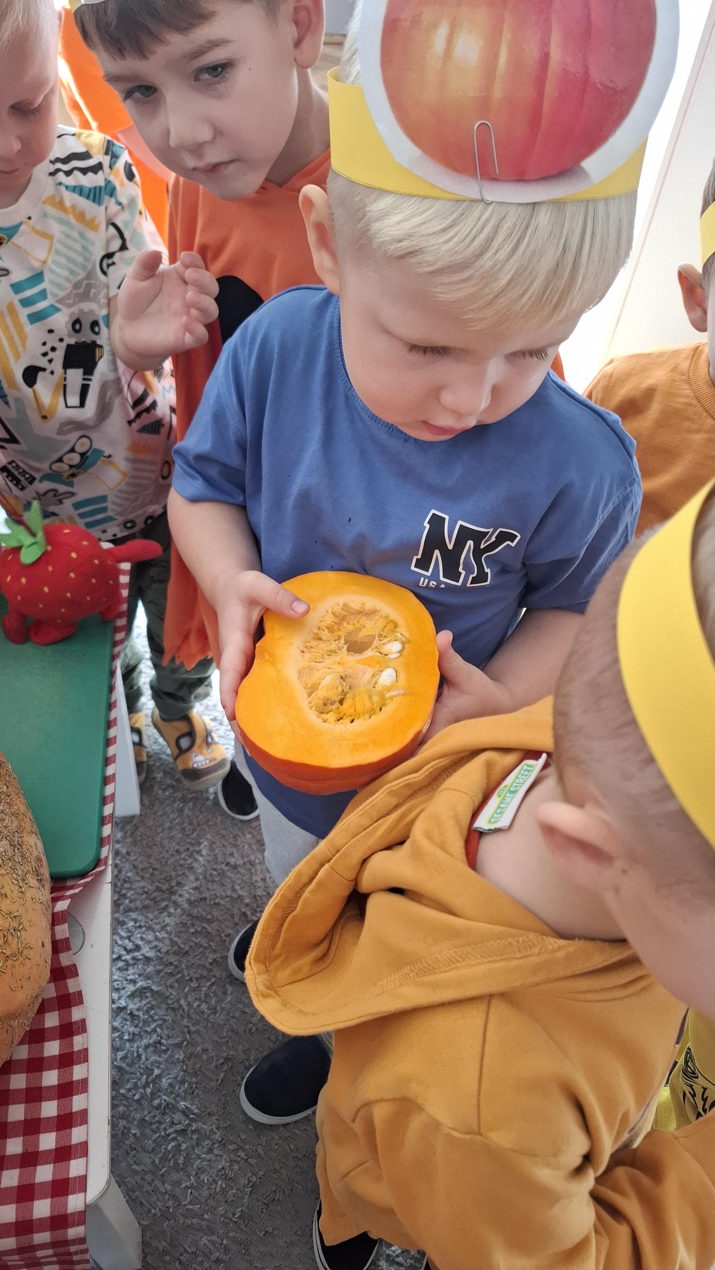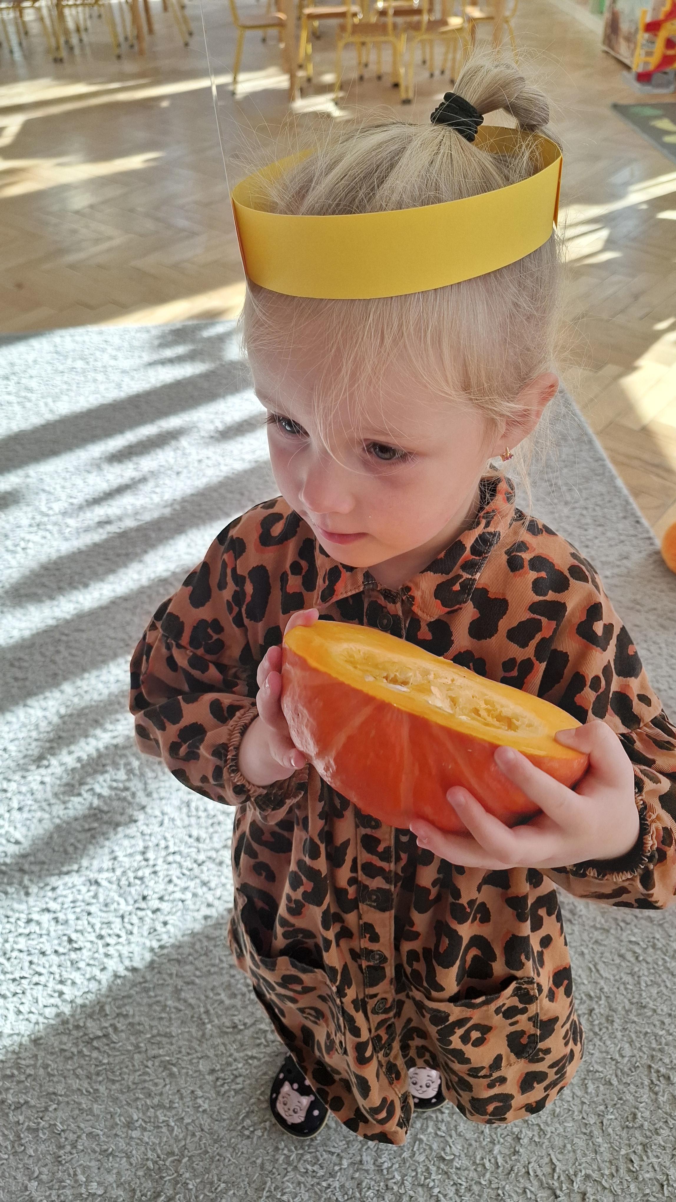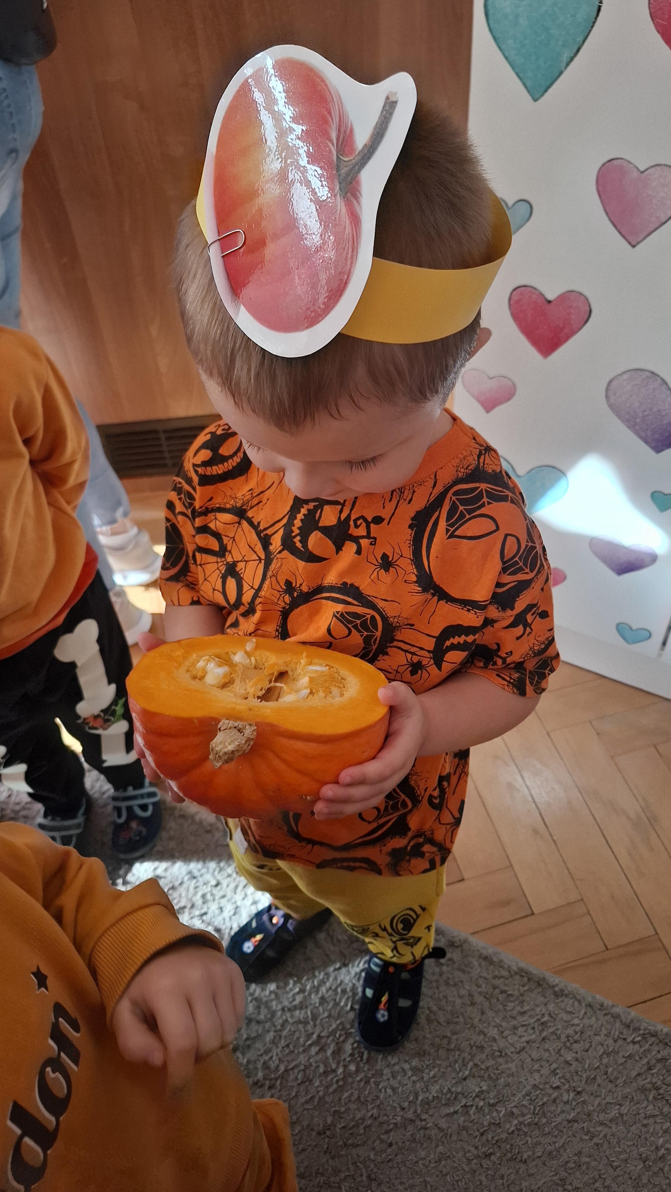 Po seansie rozpoczęliśmy poszukiwania ukrytych w sali dyń. Zabawa przyniosła wszystkim mnóstwo radości i emocji! Następnie dzieci mogły dokładnie obejrzeć dynie – porównywały ich kolory, kształty i wielkość, a także zajrzały do środka, by sprawdzić, jak dynia wygląda w środku, jak pachnie i co kryje – oczywiście pesteczki!