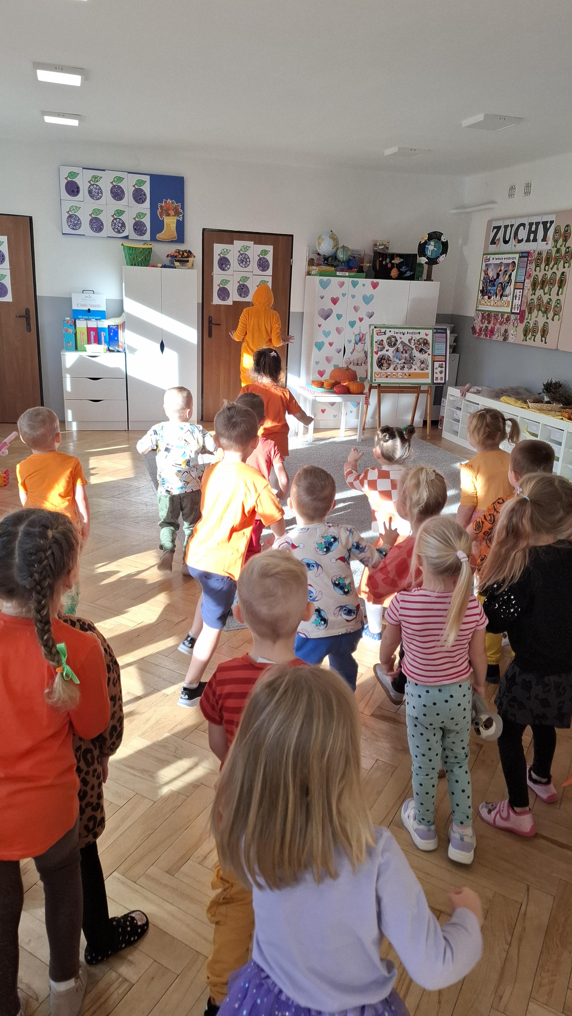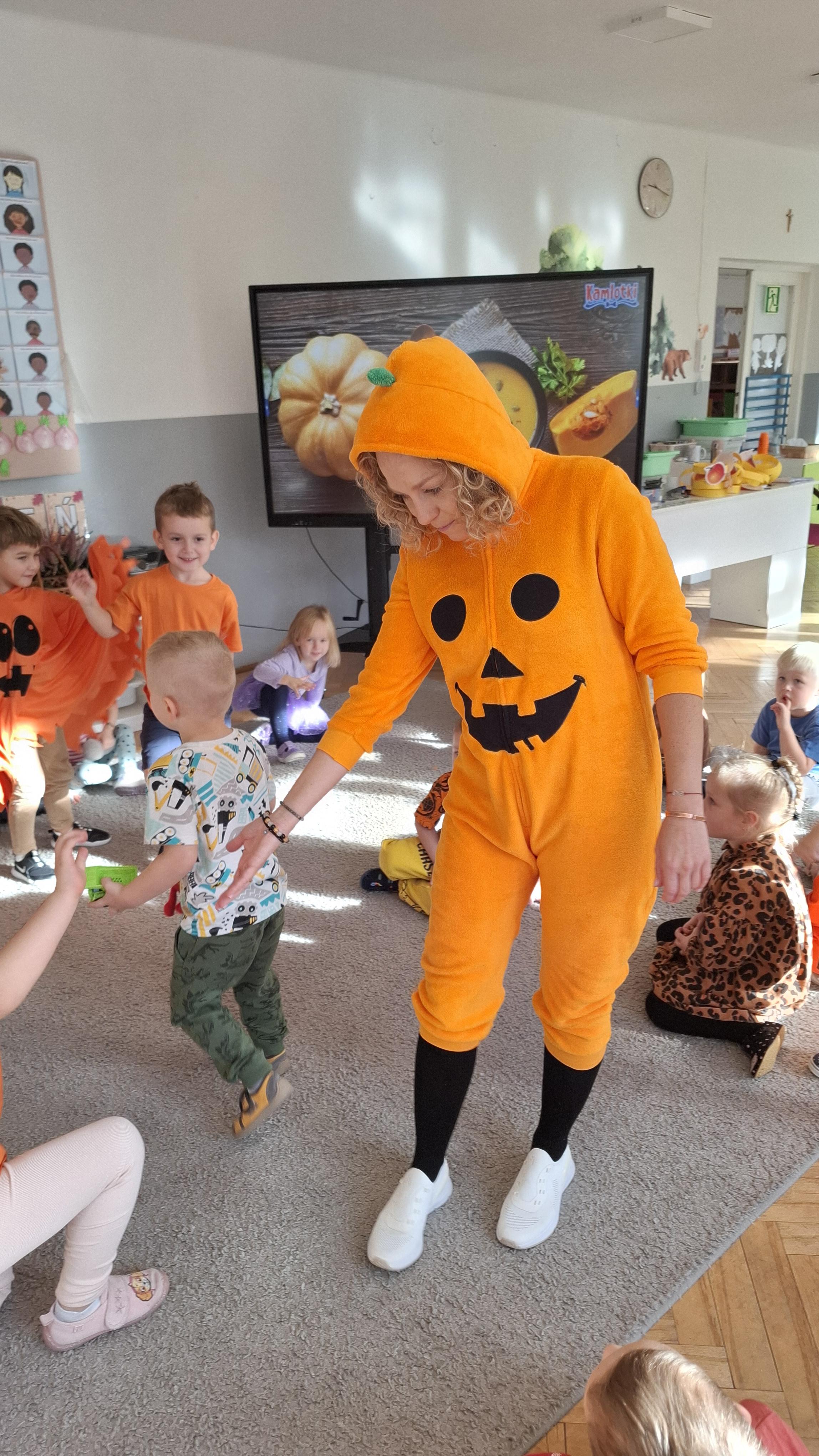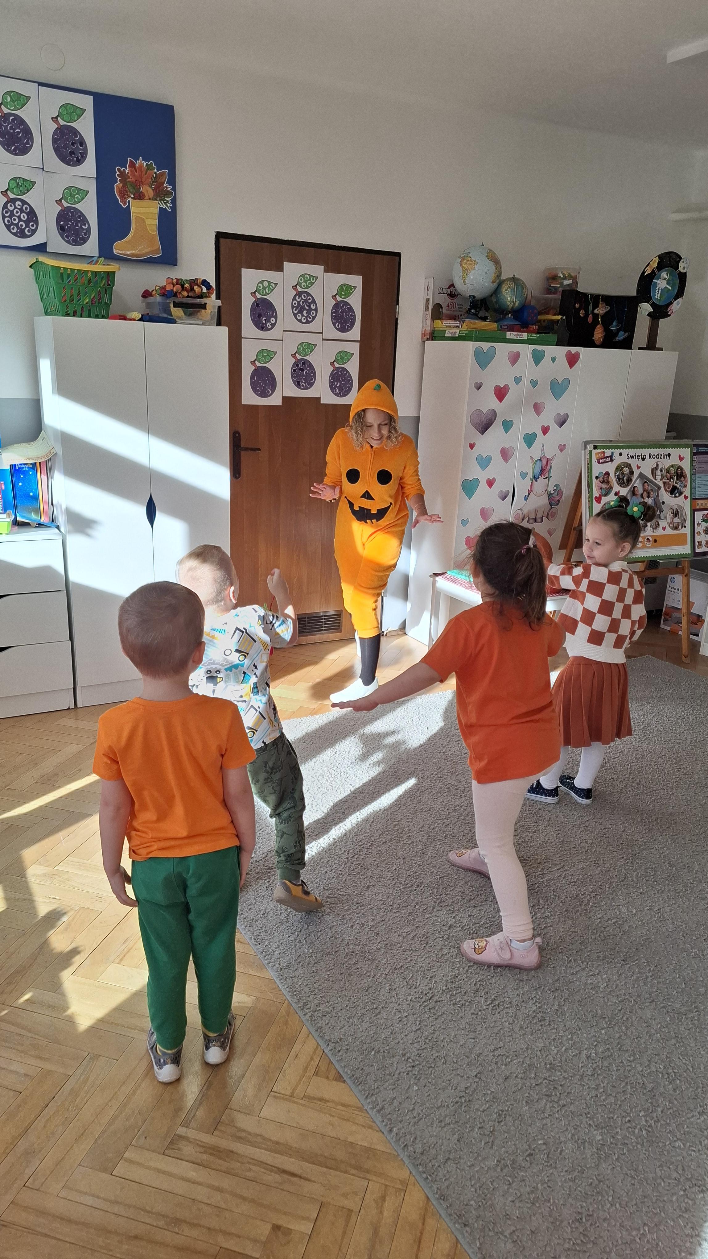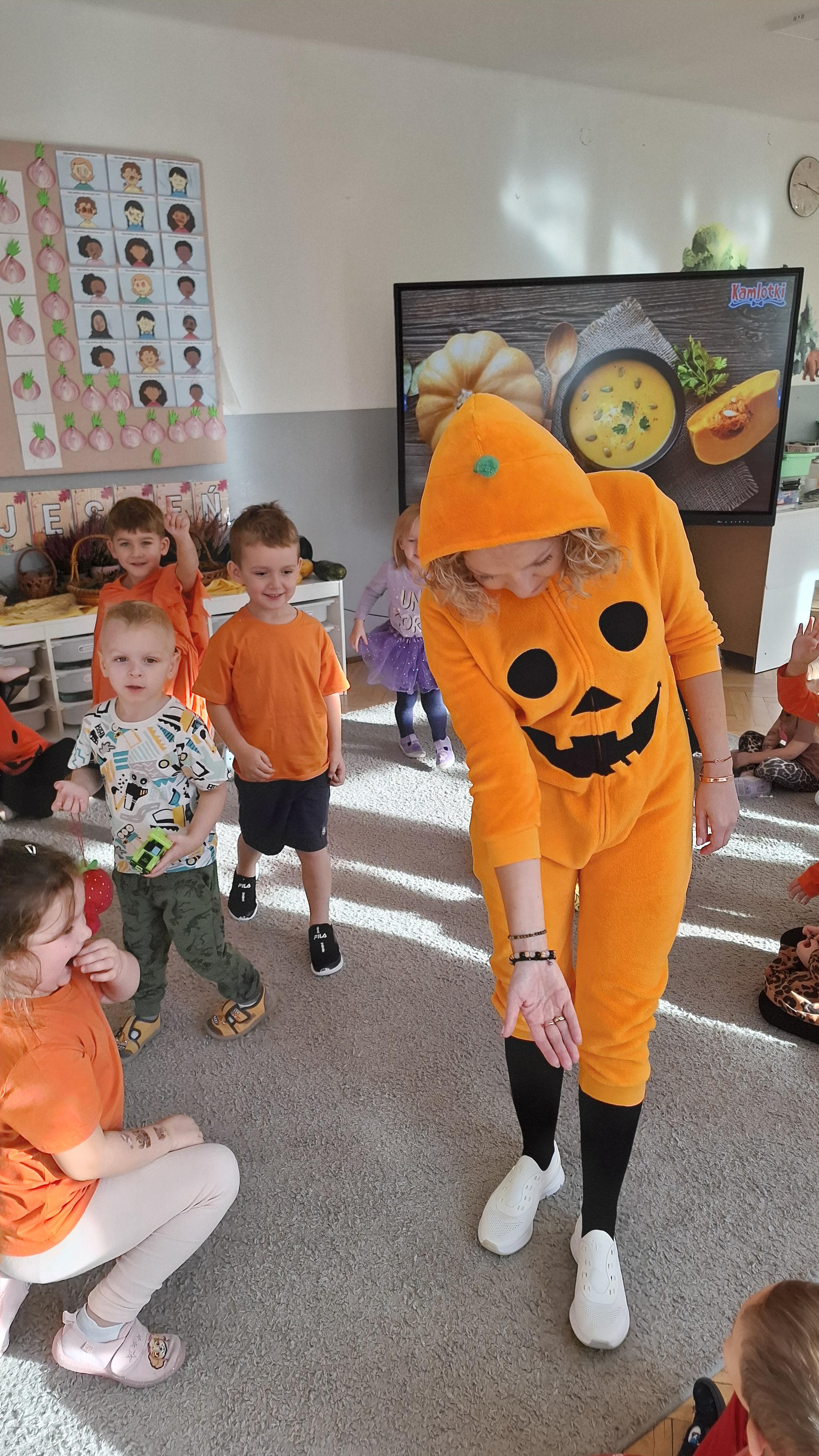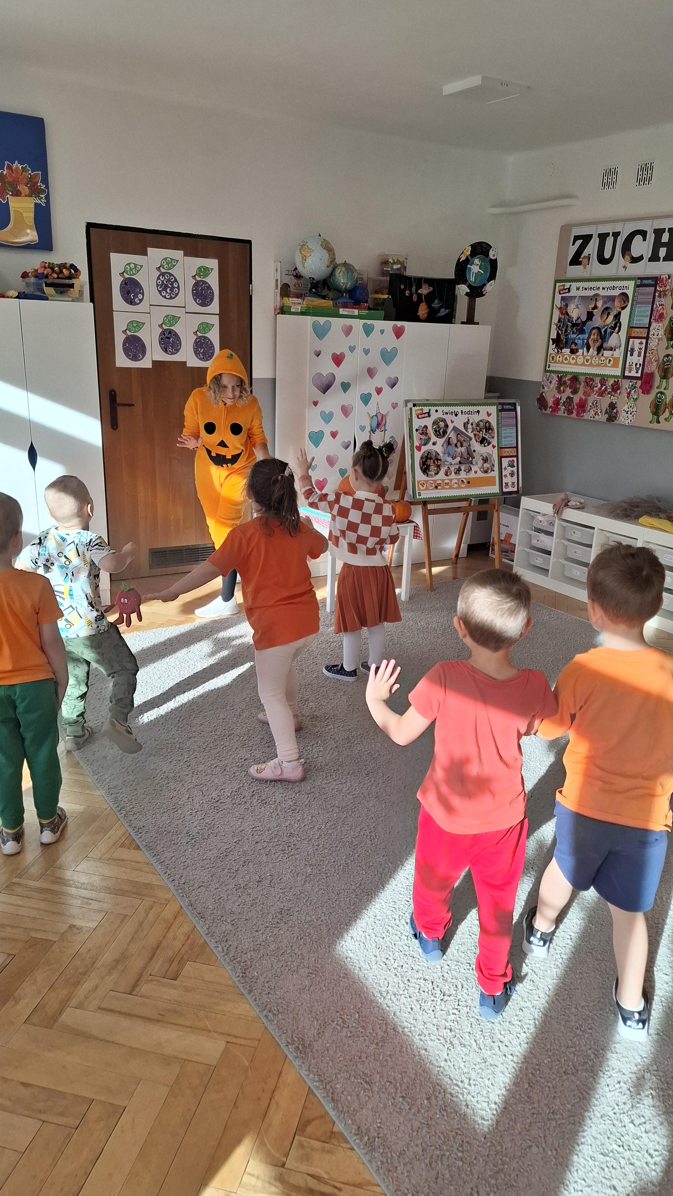 W trakcie zajęć odwiedził nas niezwykły gość – Pani Dynia, z którą bawiliśmy się w ulubione zabawy: „Raz, dwa, trzy, dynia patrzy” oraz „Gorącą dynię”. Śmiechu i ruchu było co niemiara!