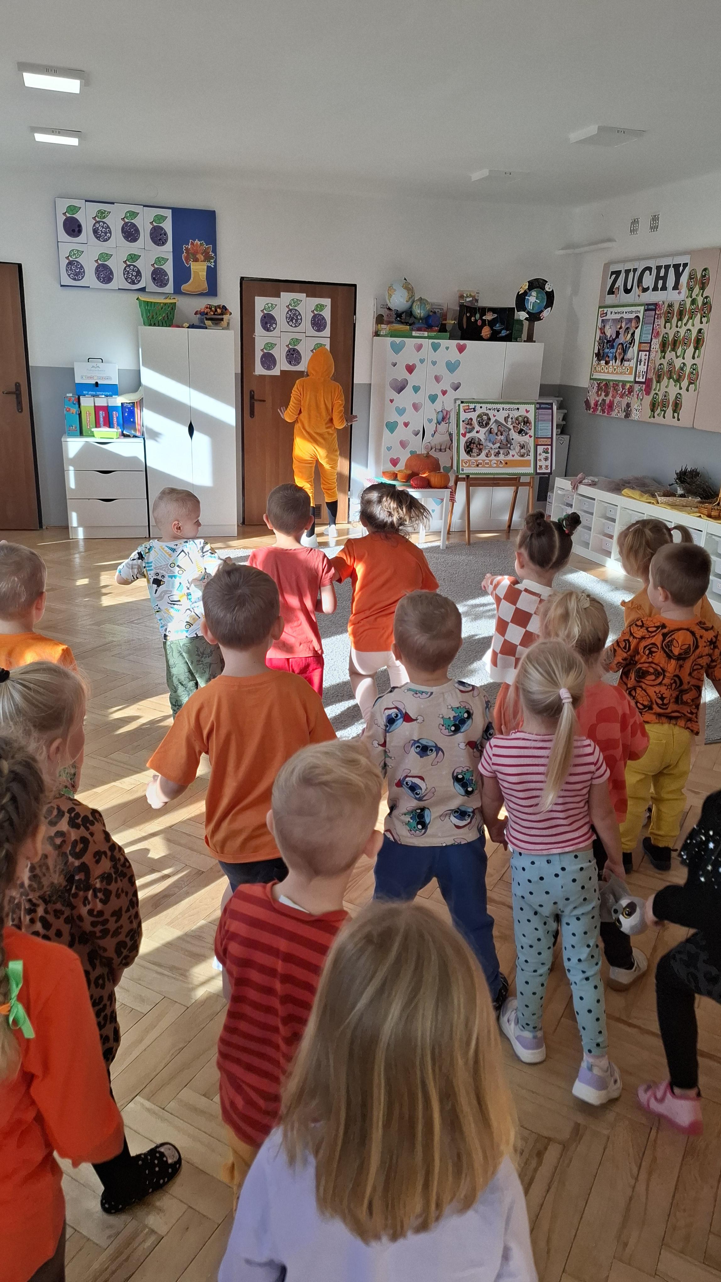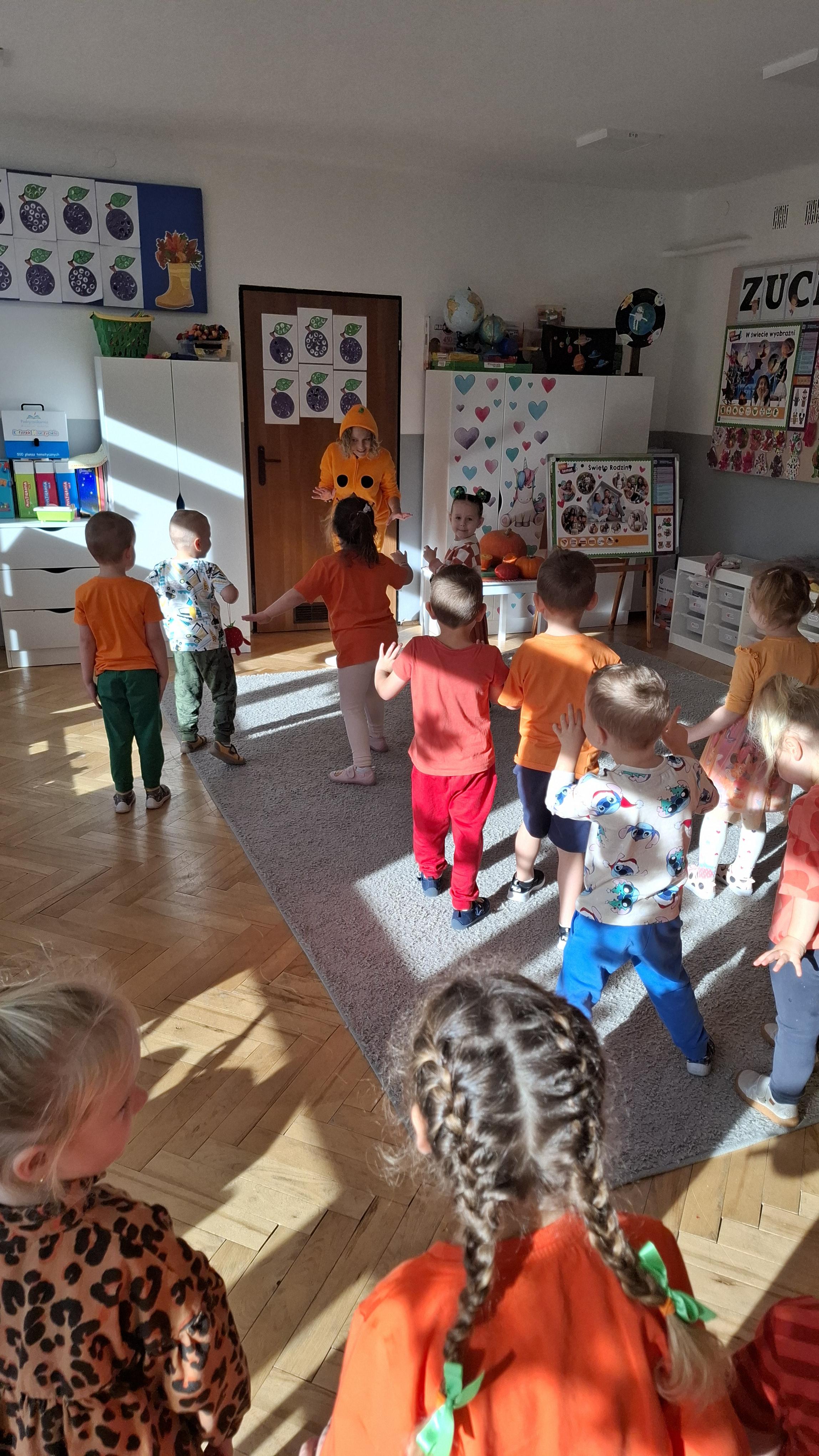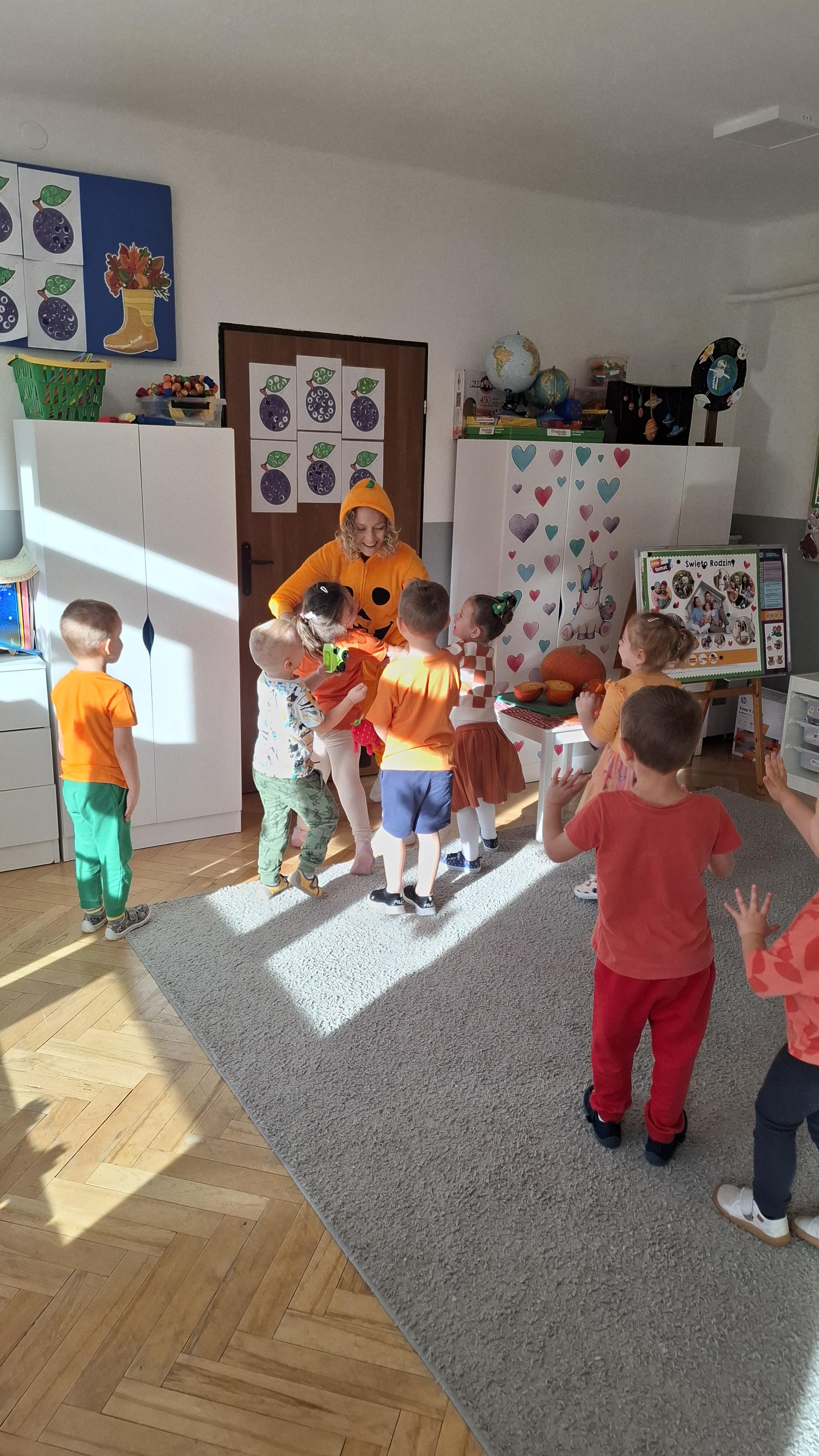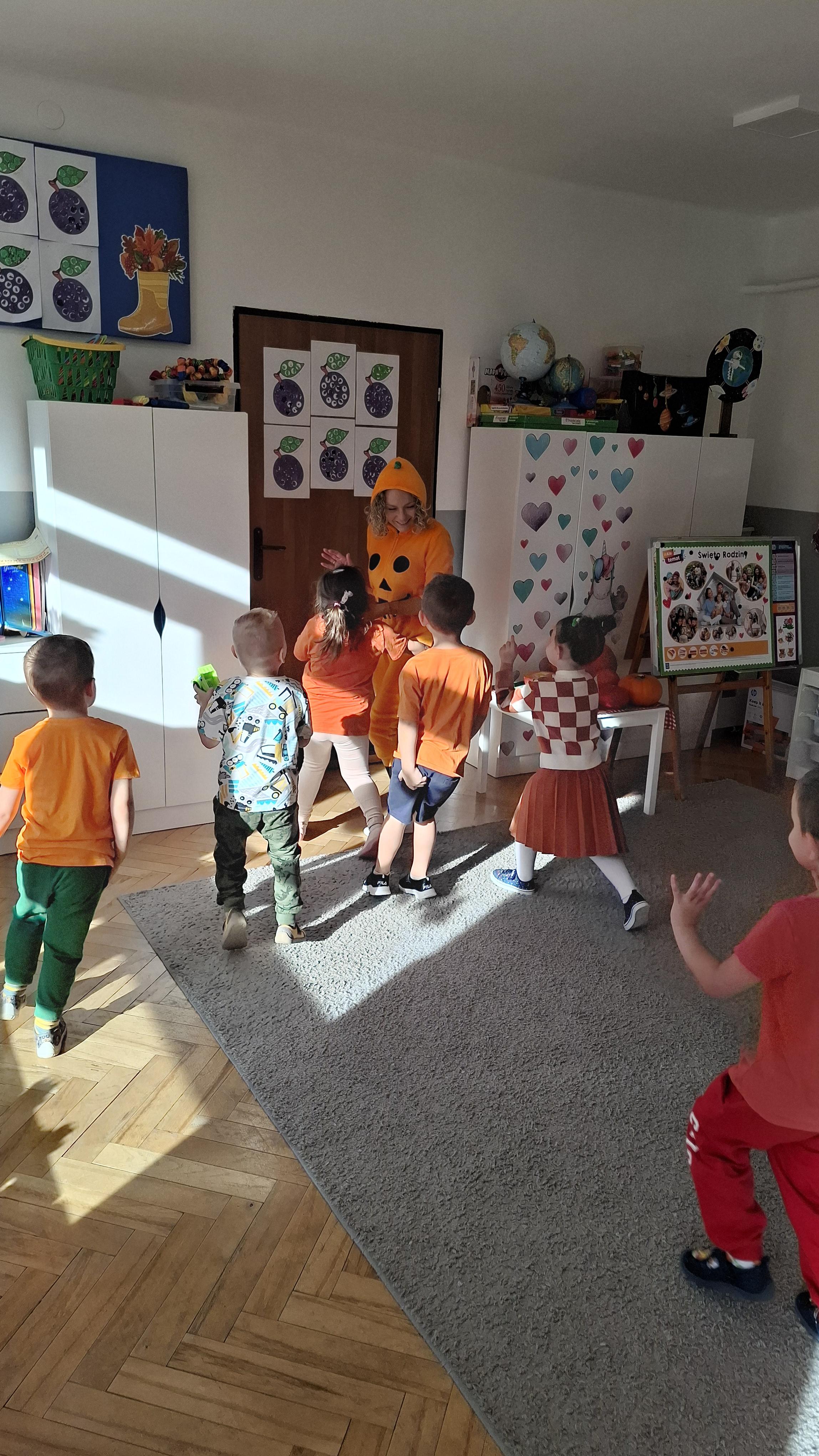 W trakcie zajęć odwiedził nas niezwykły gość – Pani Dynia, z którą bawiliśmy się w ulubione zabawy: „Raz, dwa, trzy, dynia patrzy” oraz „Gorącą dynię”. Śmiechu i ruchu było co niemiara!