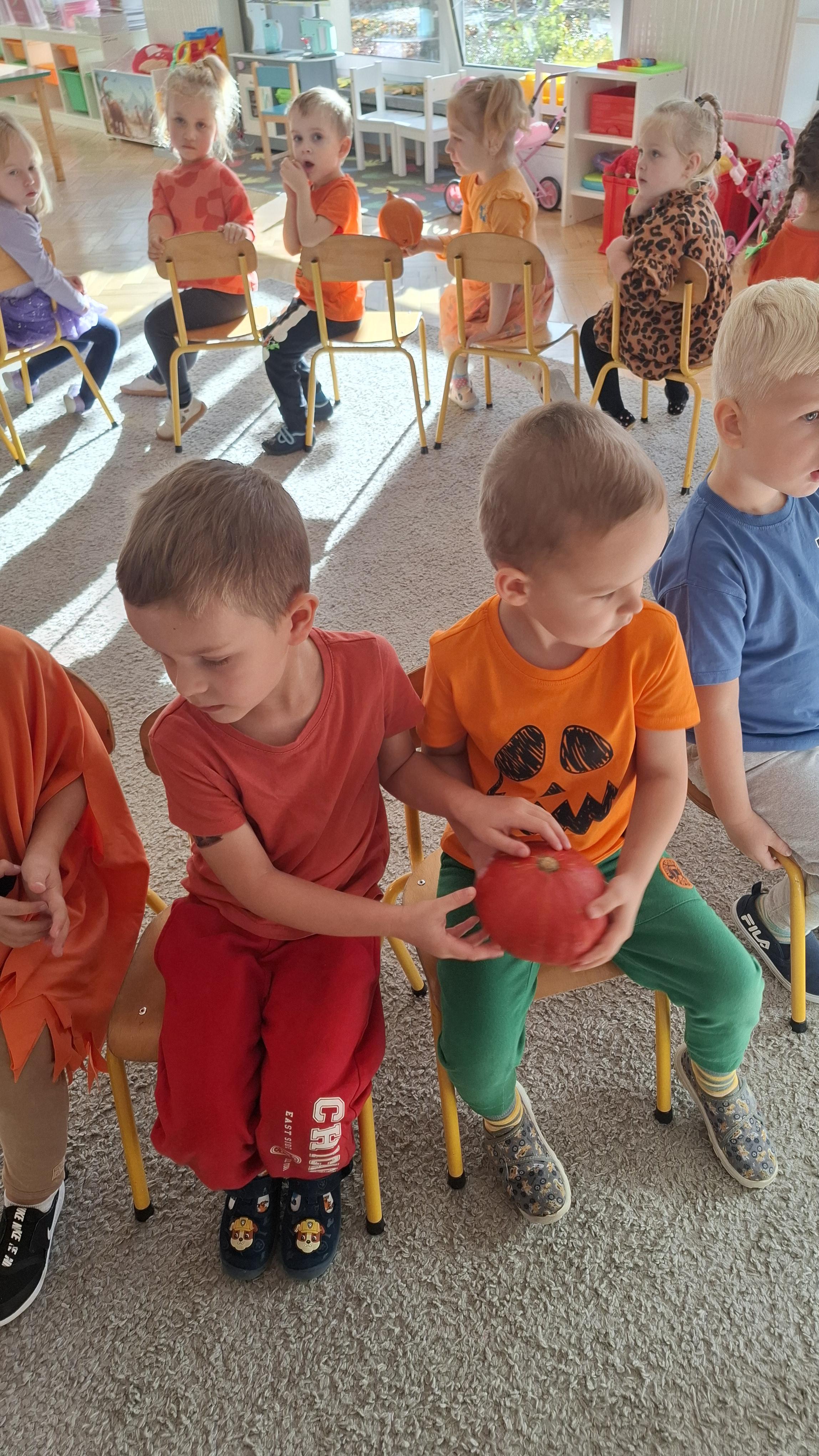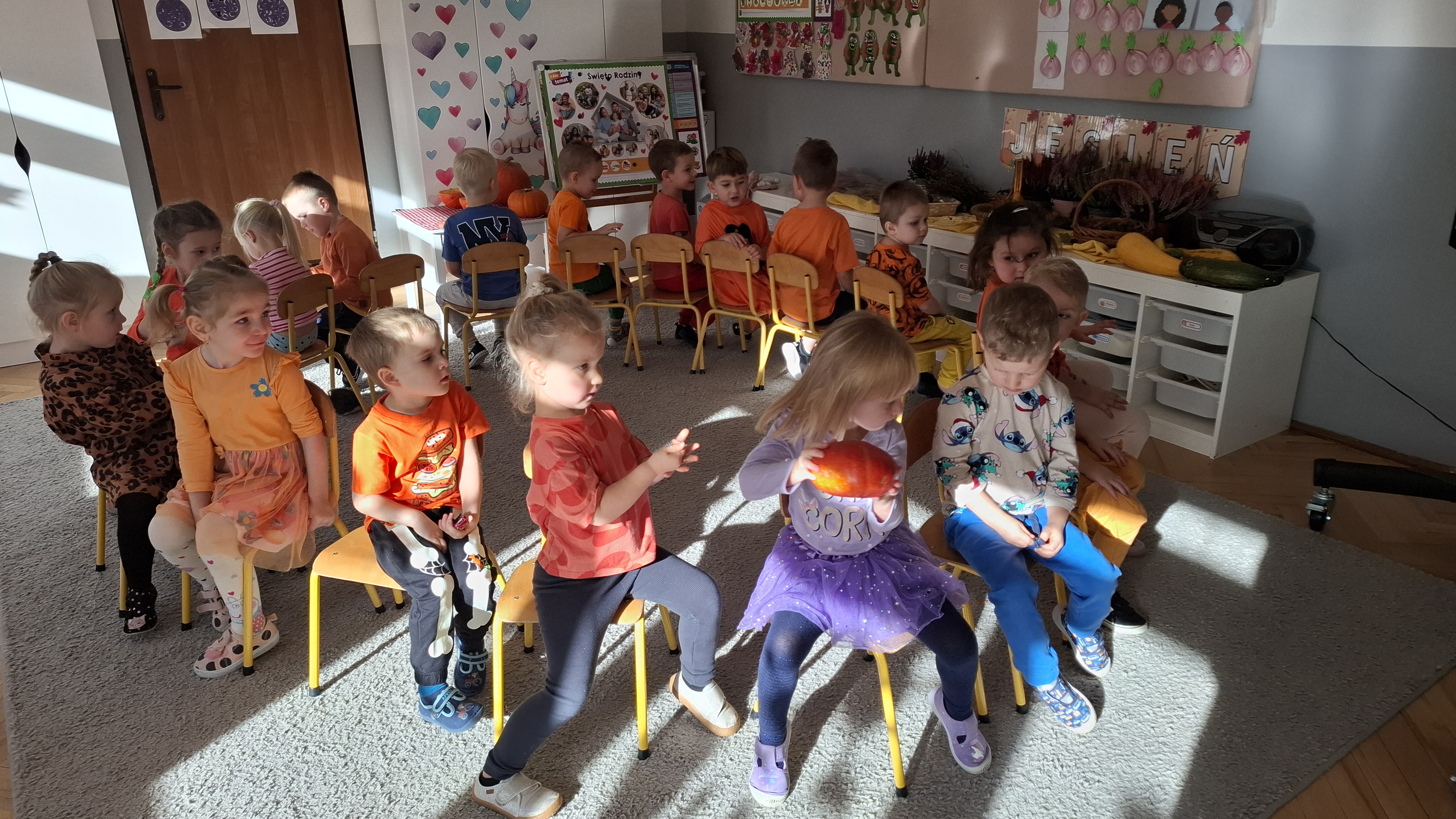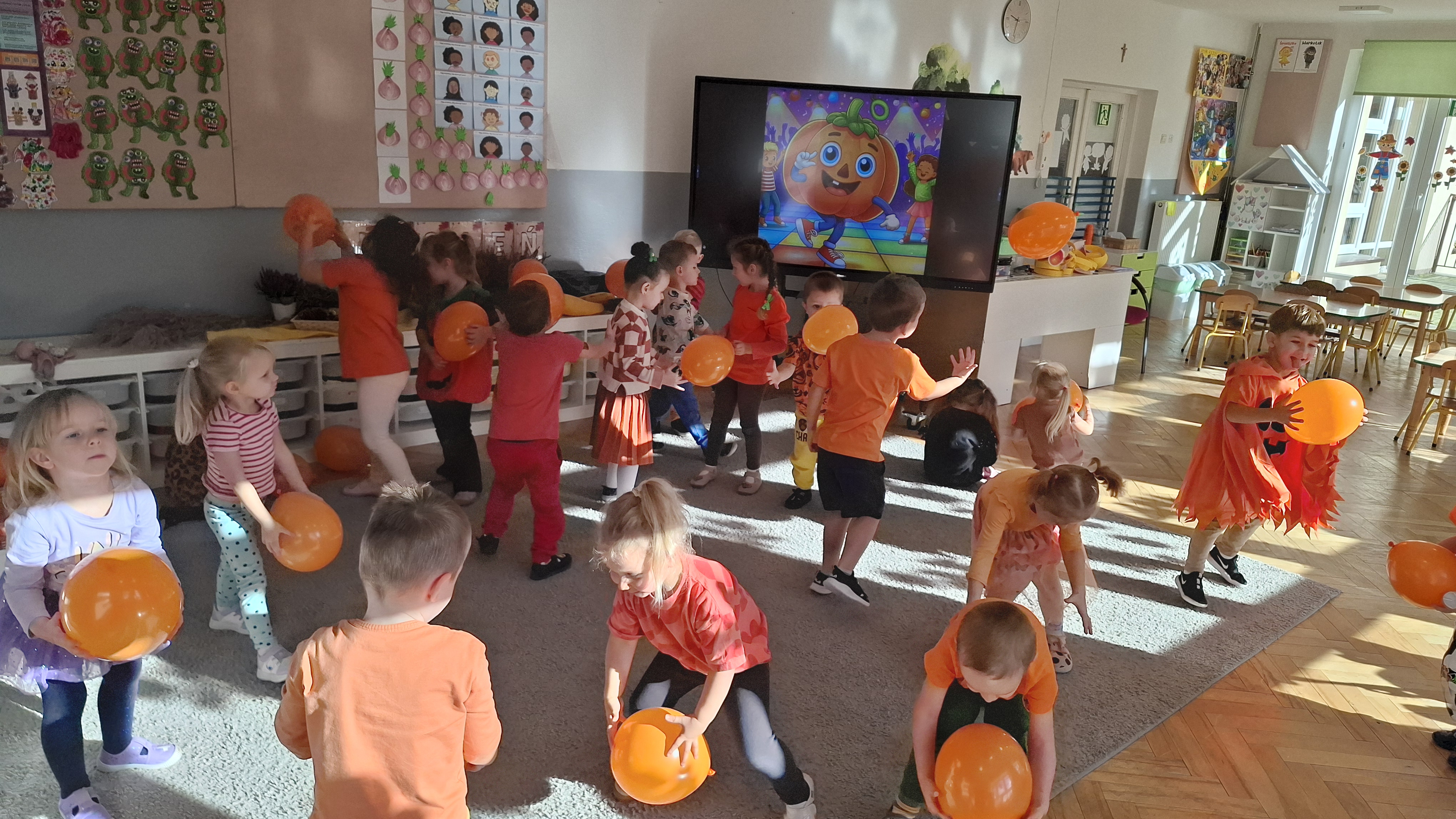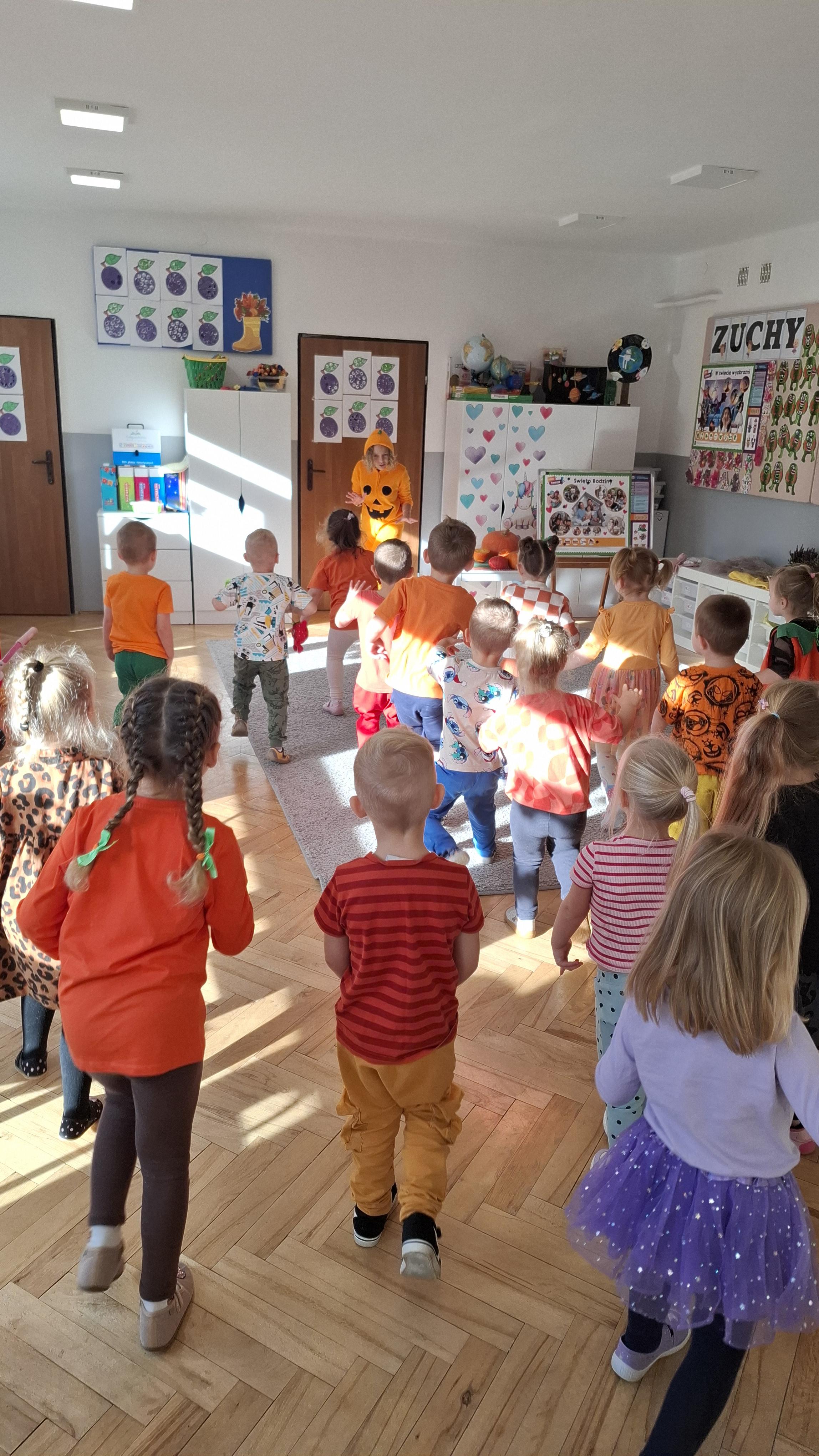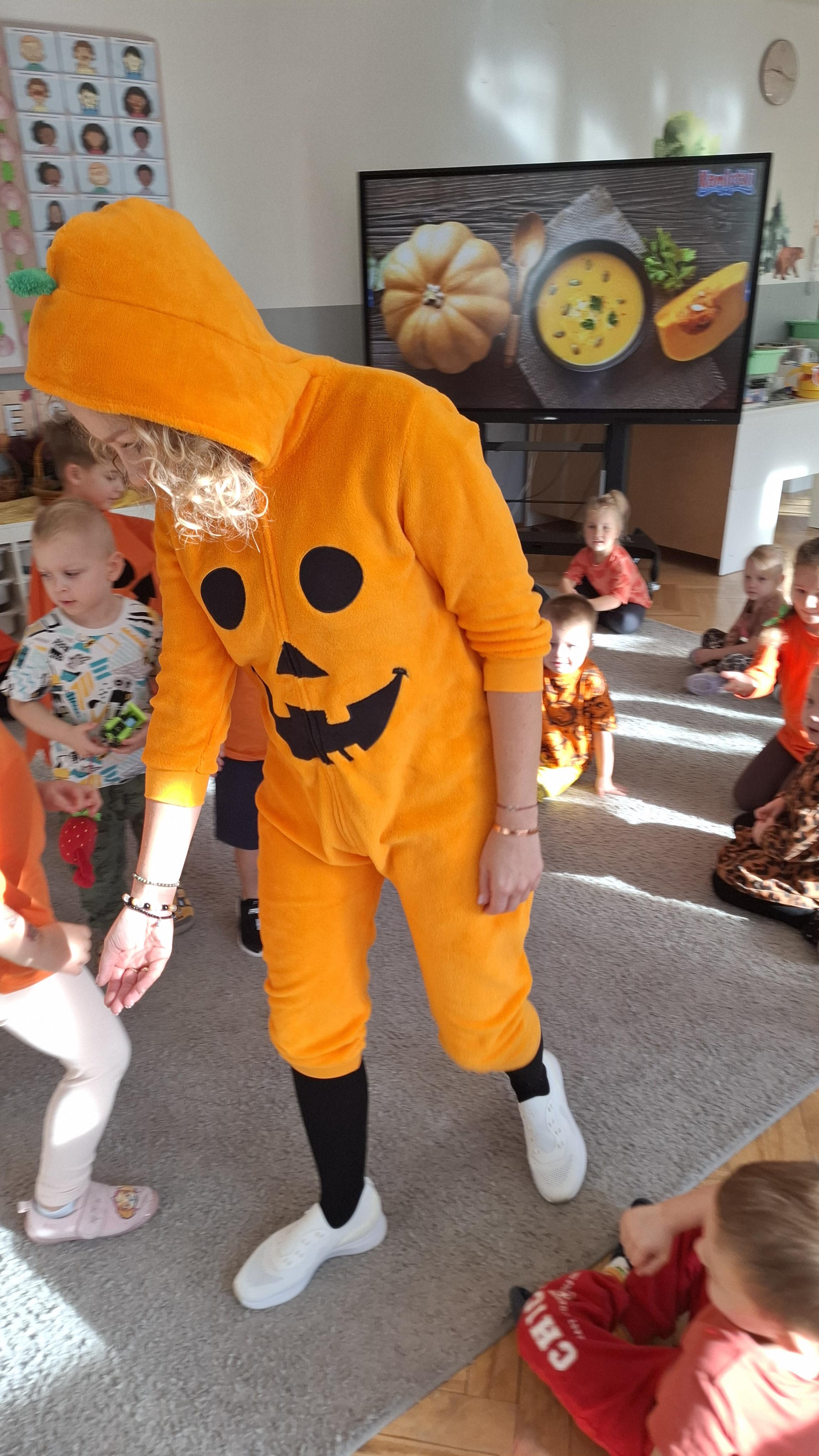 W trakcie zajęć odwiedził nas niezwykły gość – Pani Dynia, z którą bawiliśmy się w ulubione zabawy: „Raz, dwa, trzy, dynia patrzy” oraz „Gorącą dynię”. Śmiechu i ruchu było co niemiara!