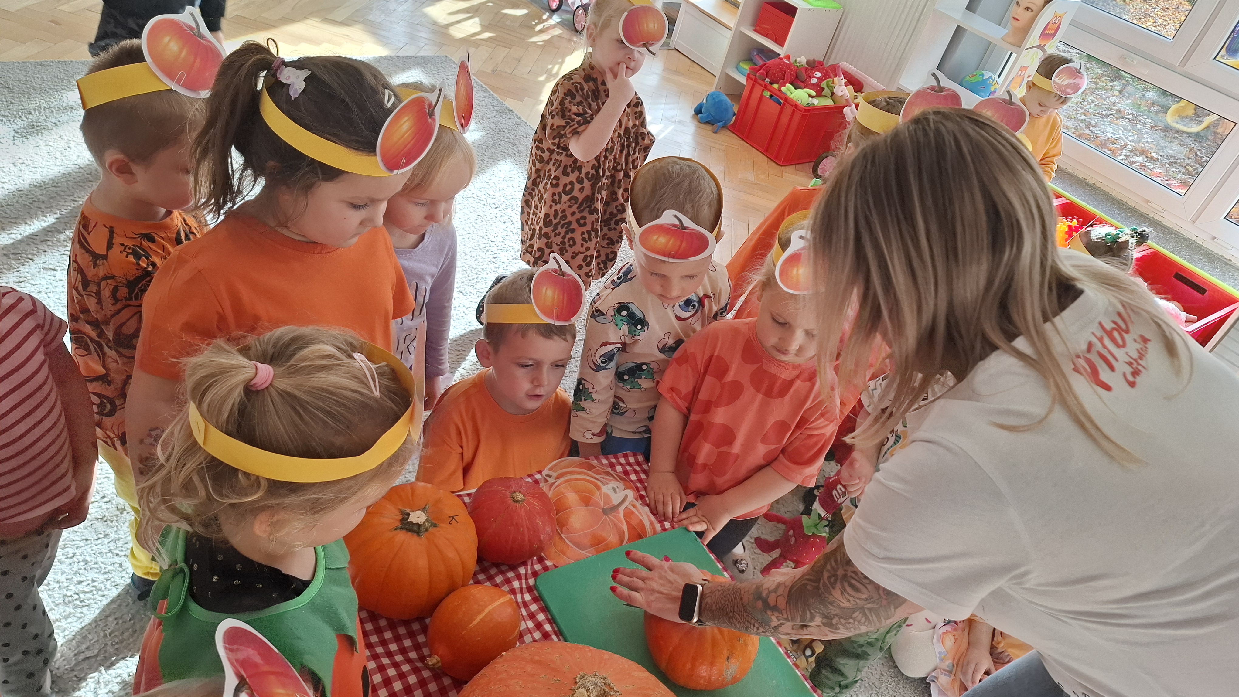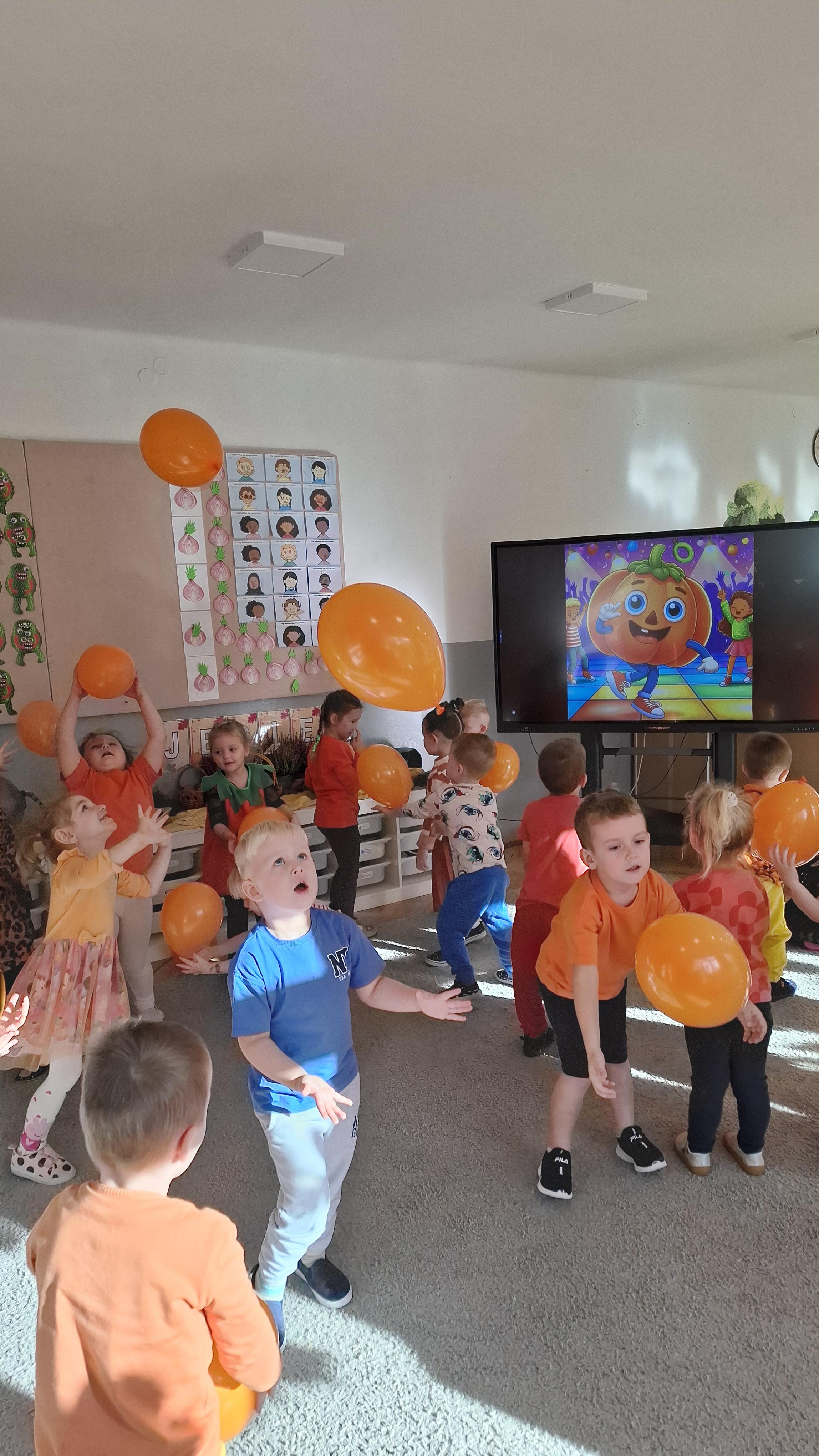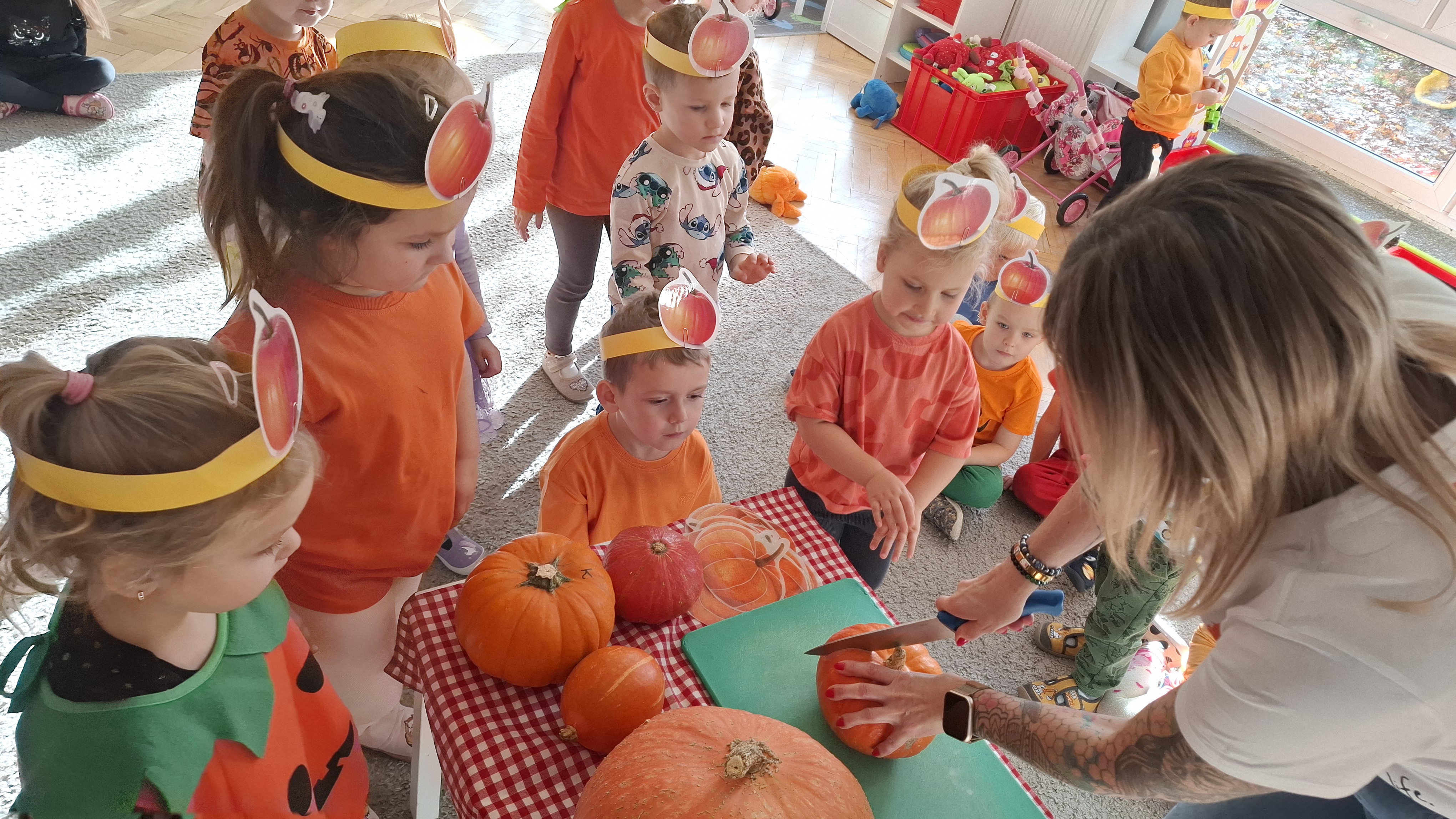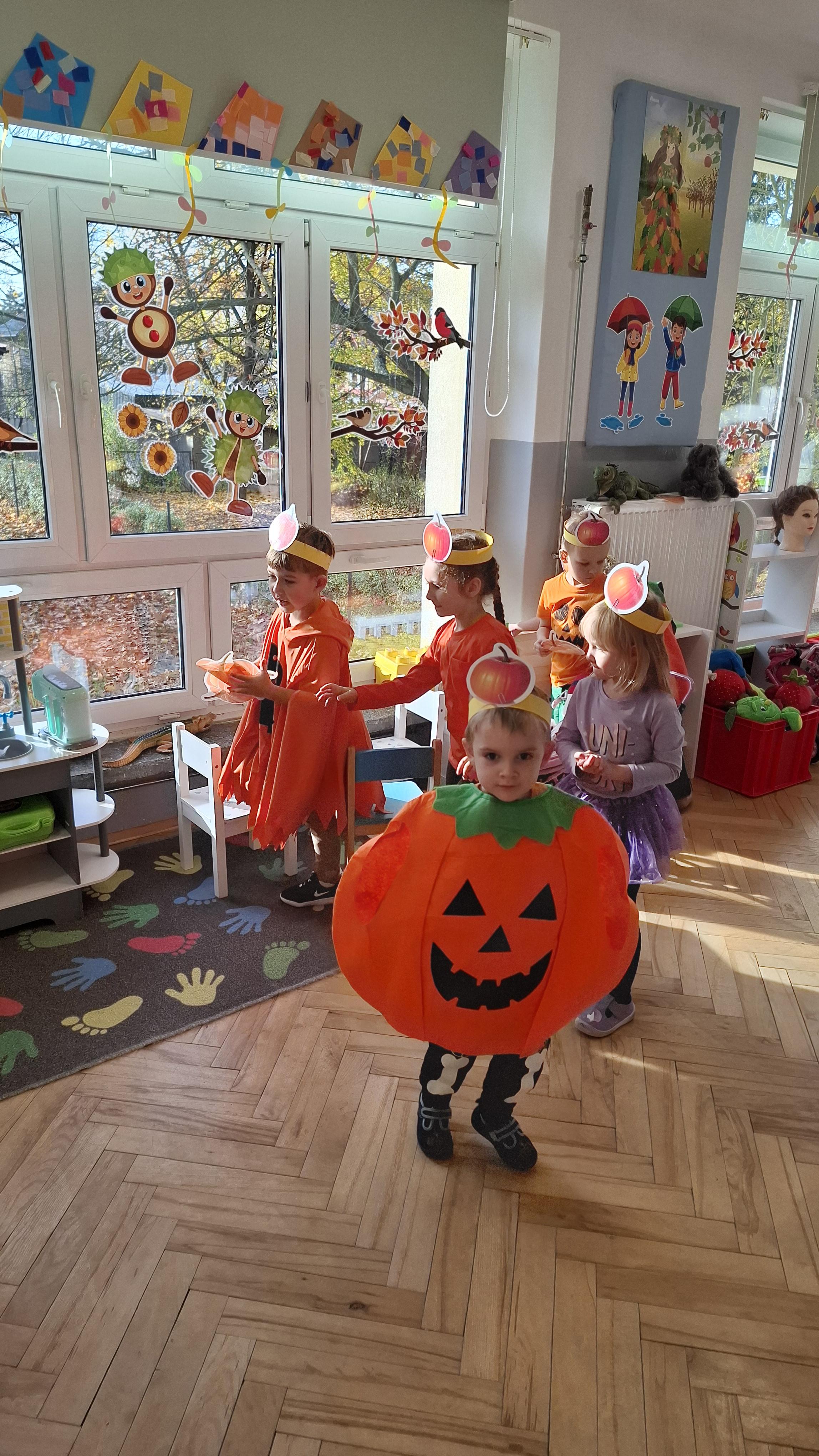 W trakcie zajęć odwiedził nas niezwykły gość – Pani Dynia, z którą bawiliśmy się w ulubione zabawy: „Raz, dwa, trzy, dynia patrzy” oraz „Gorącą dynię”. Śmiechu i ruchu było co niemiara!