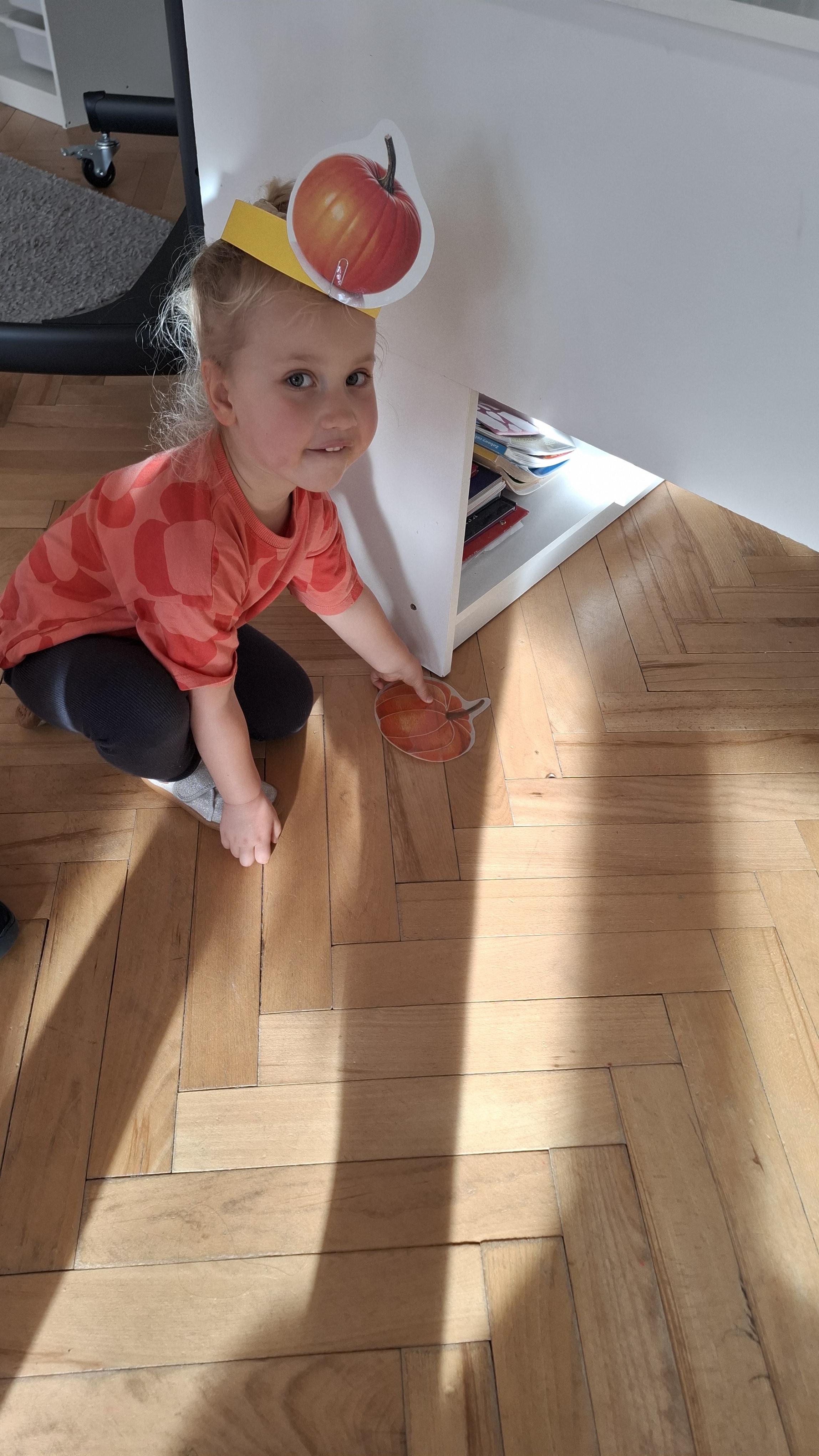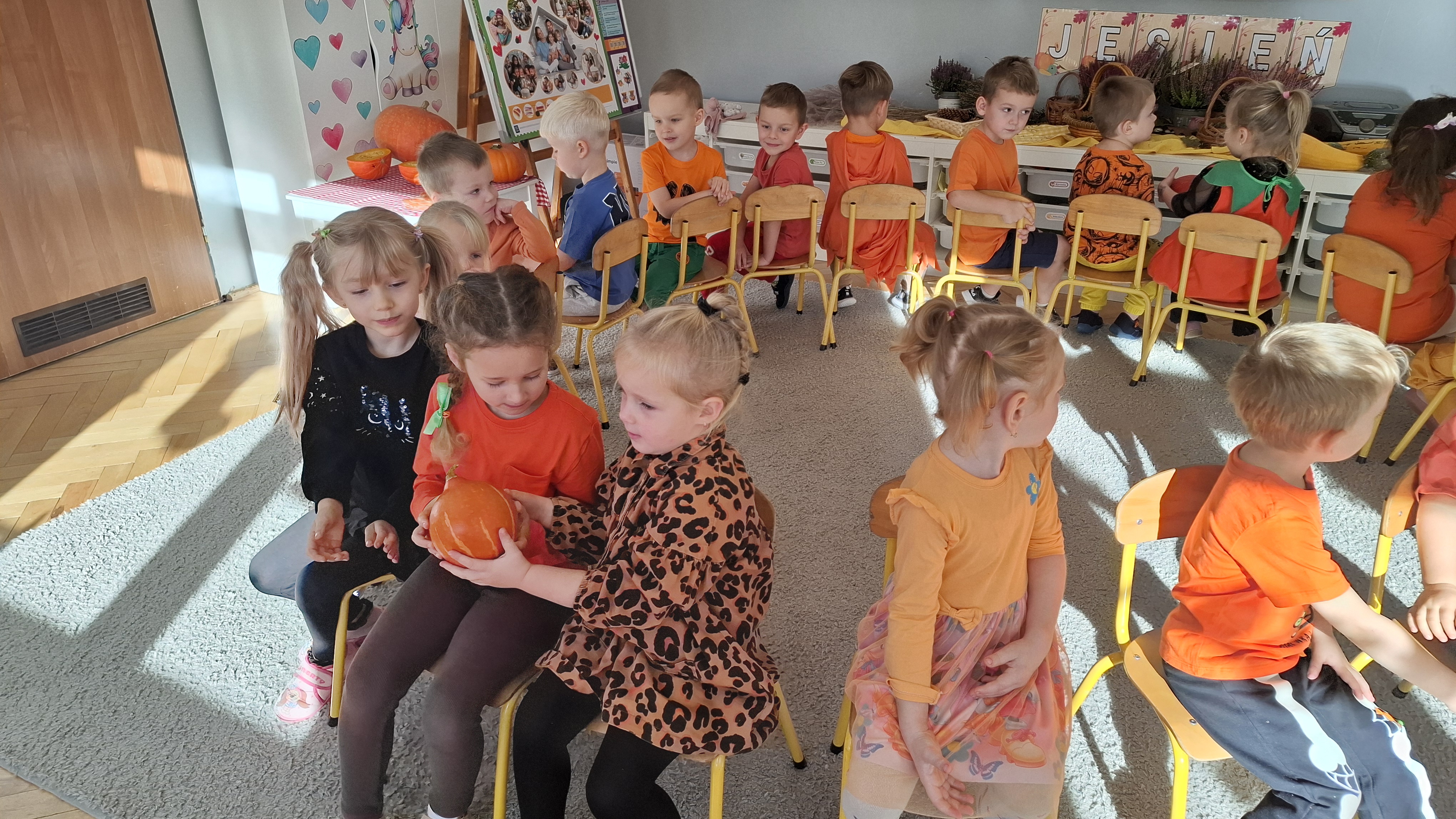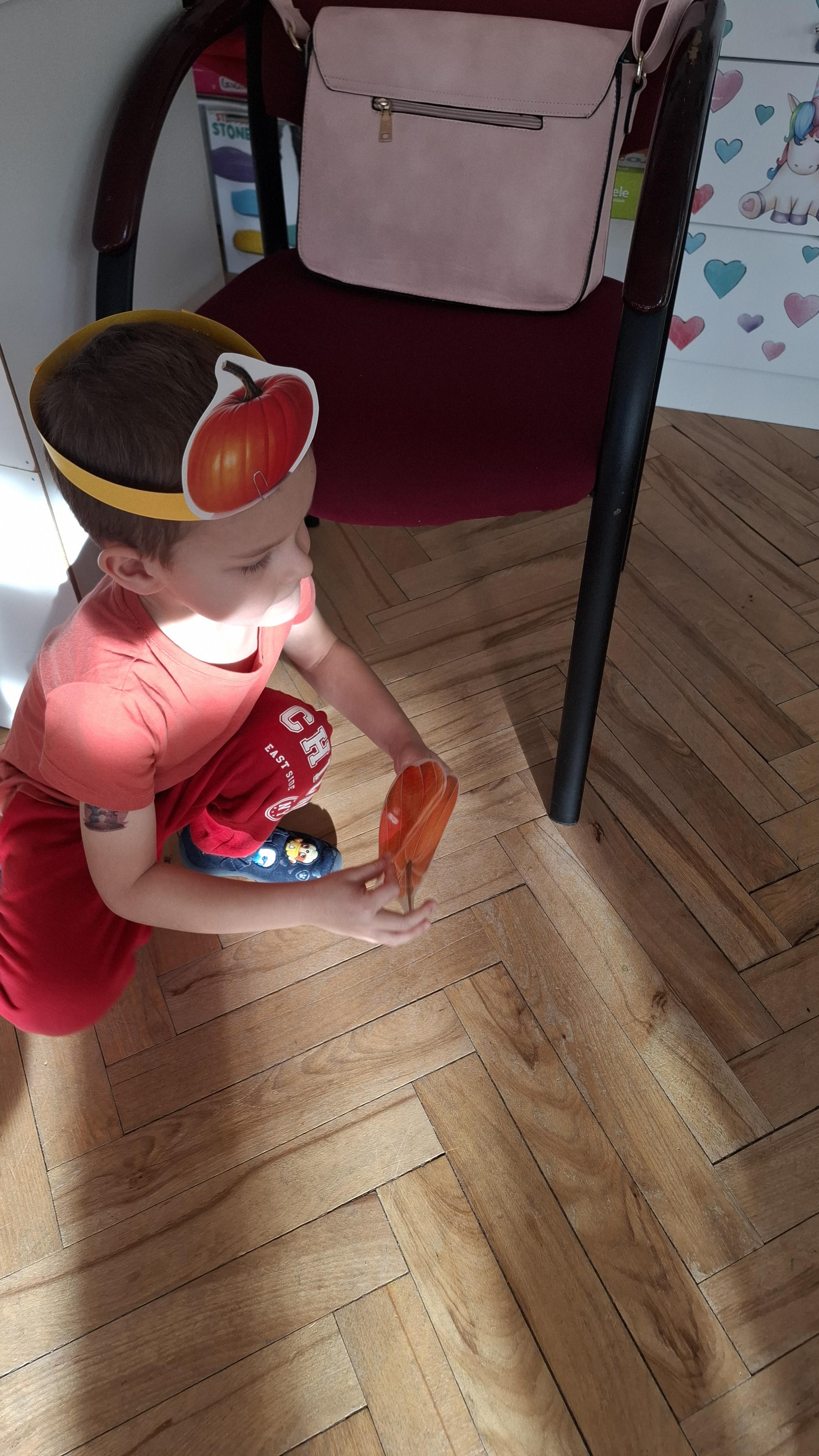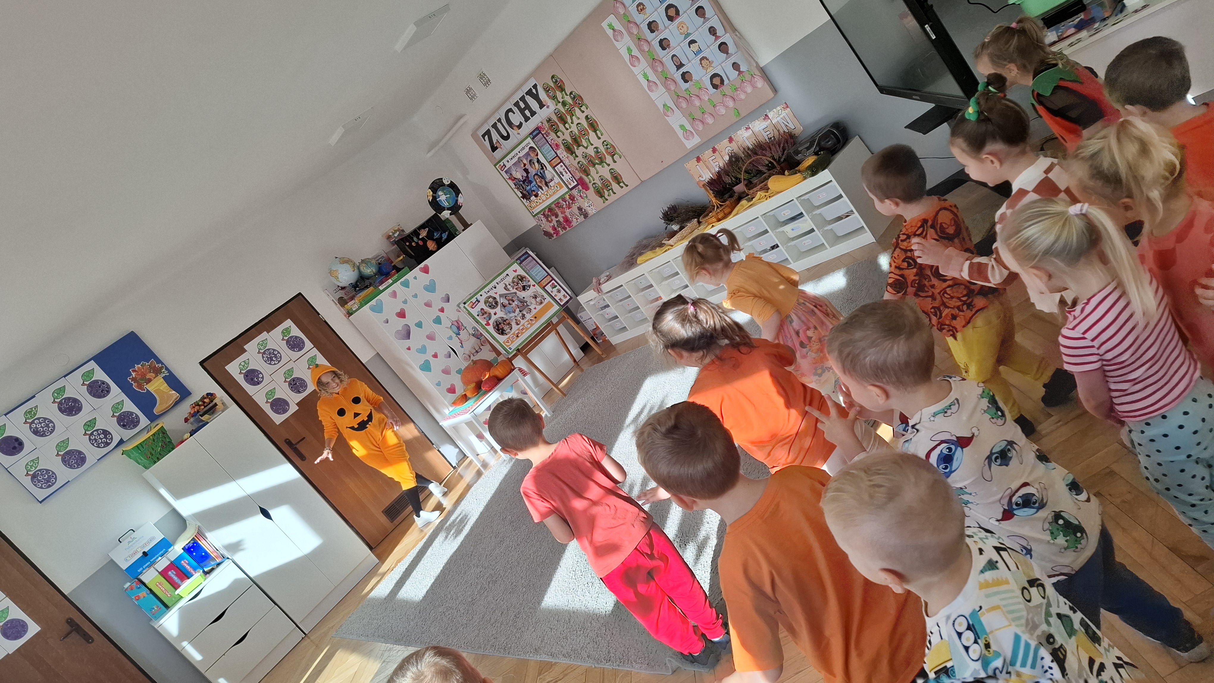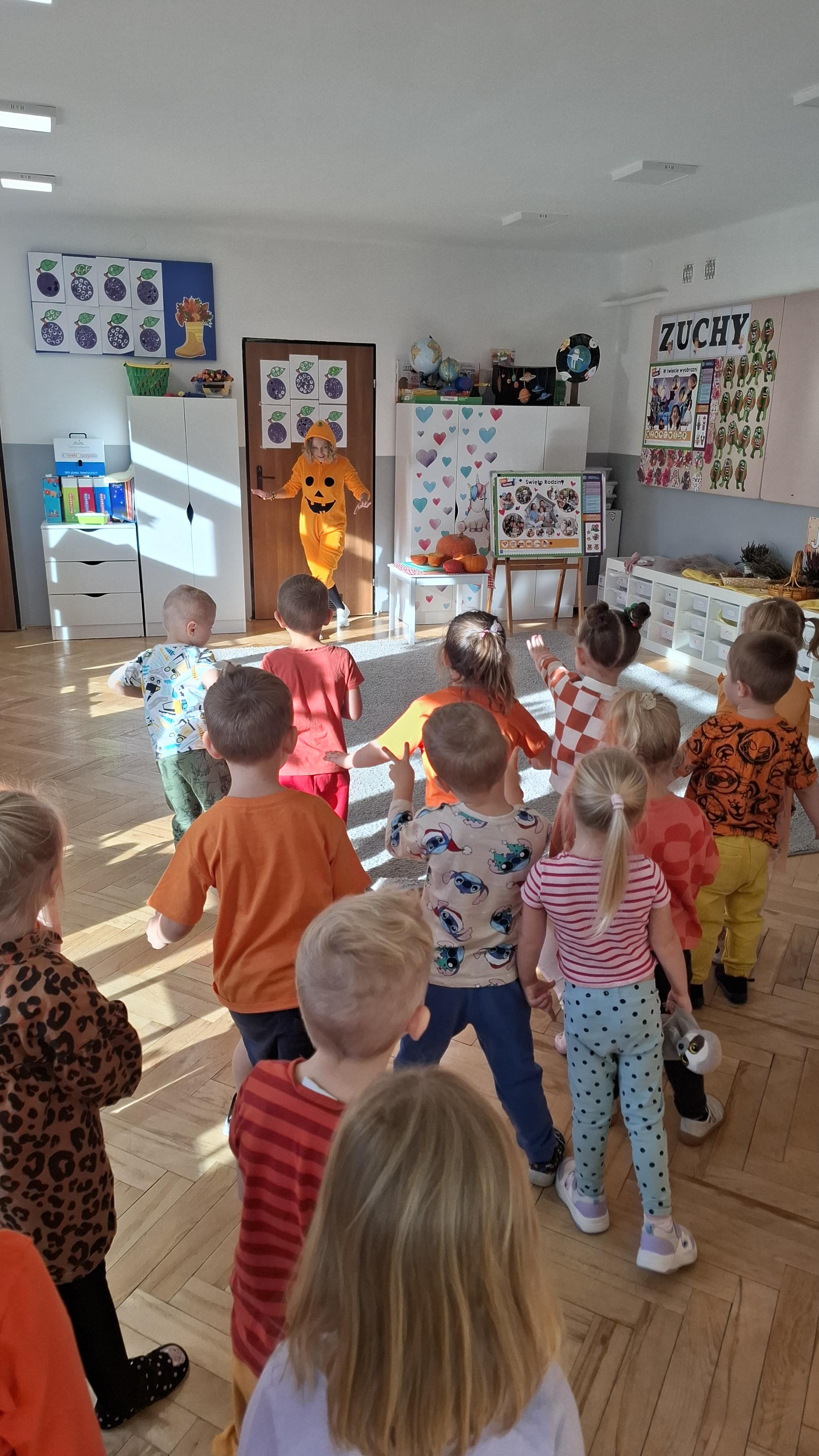 W trakcie zajęć odwiedził nas niezwykły gość – Pani Dynia, z którą bawiliśmy się w ulubione zabawy: „Raz, dwa, trzy, dynia patrzy” oraz „Gorącą dynię”. Śmiechu i ruchu było co niemiara!