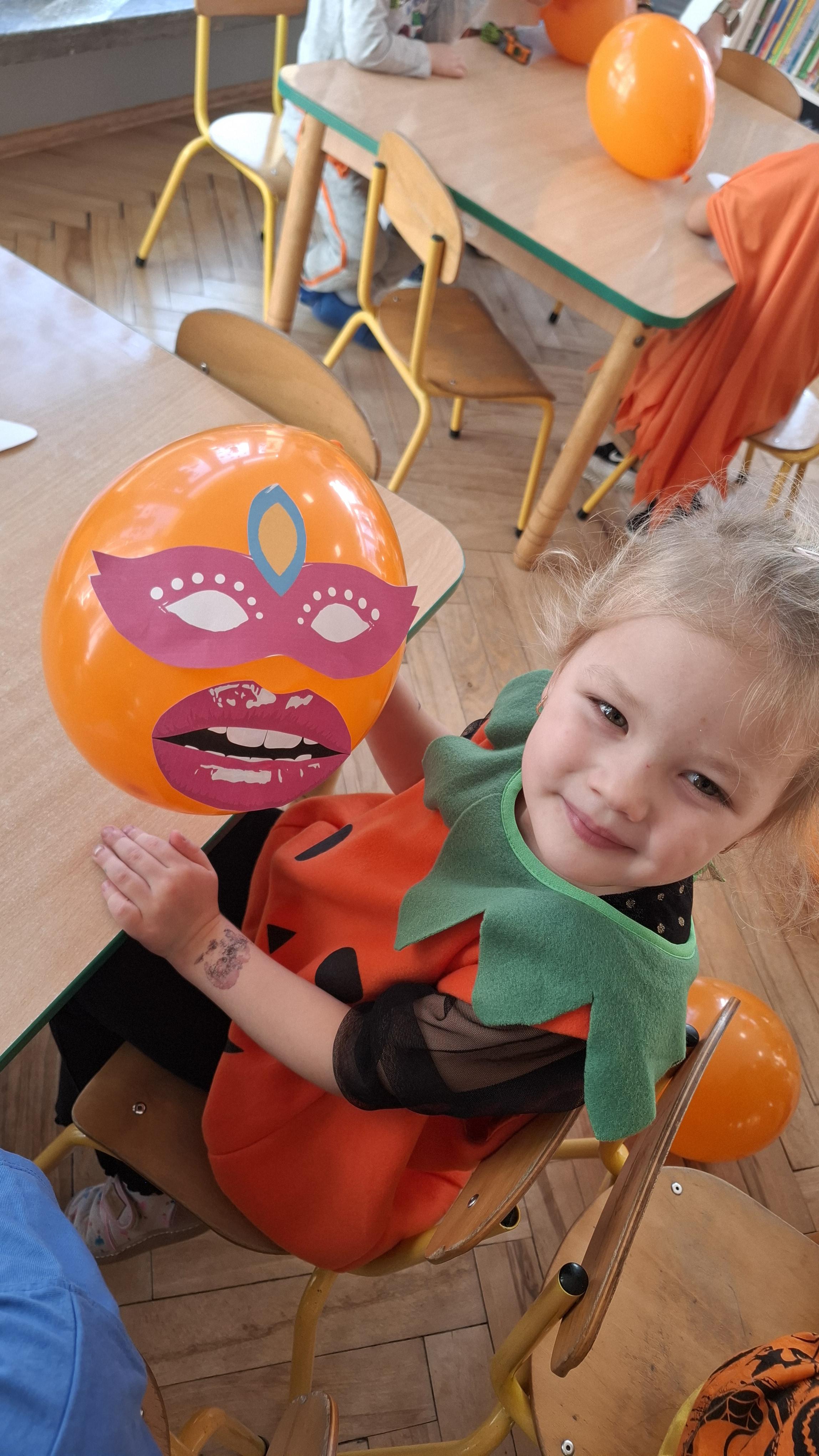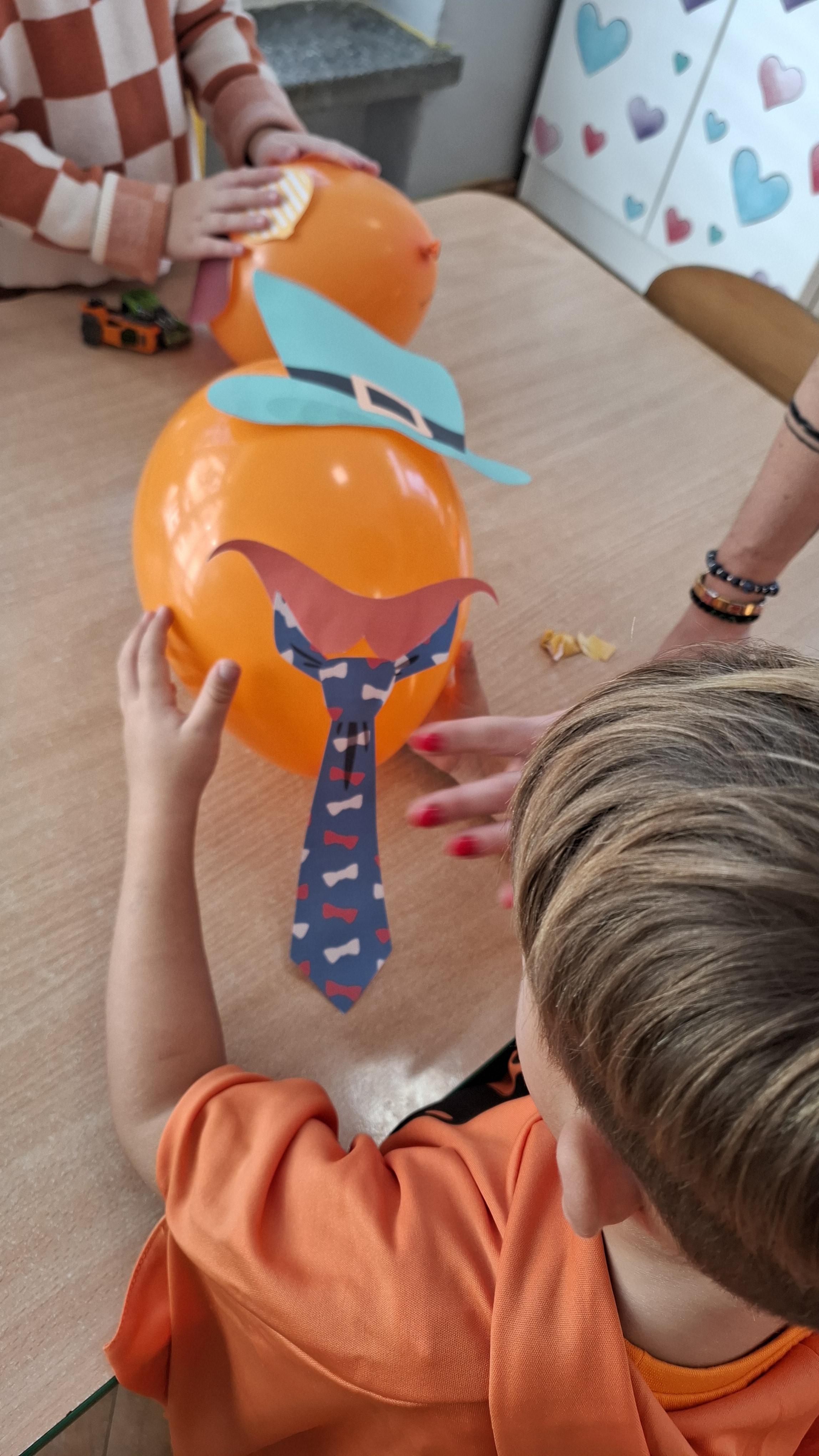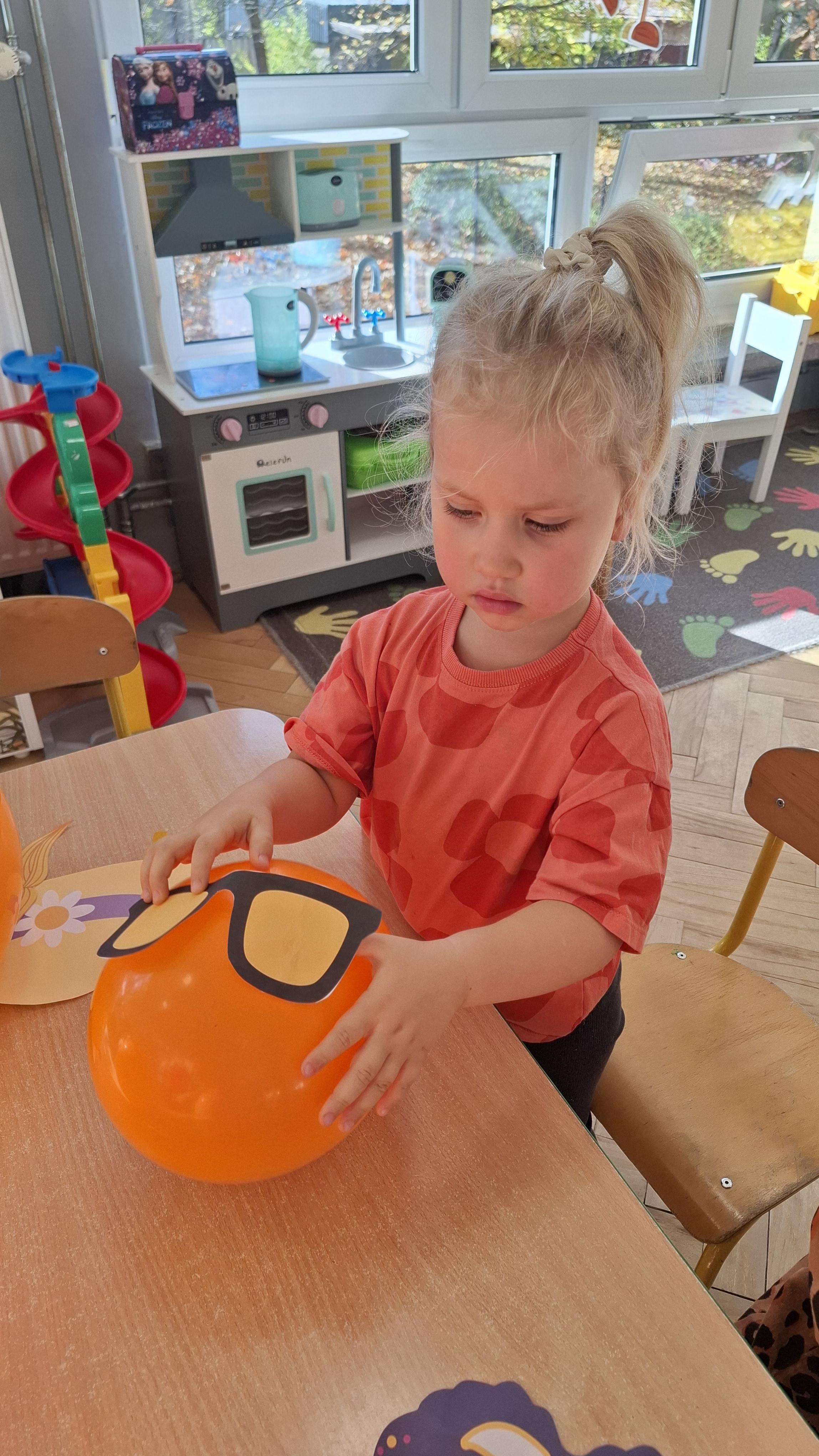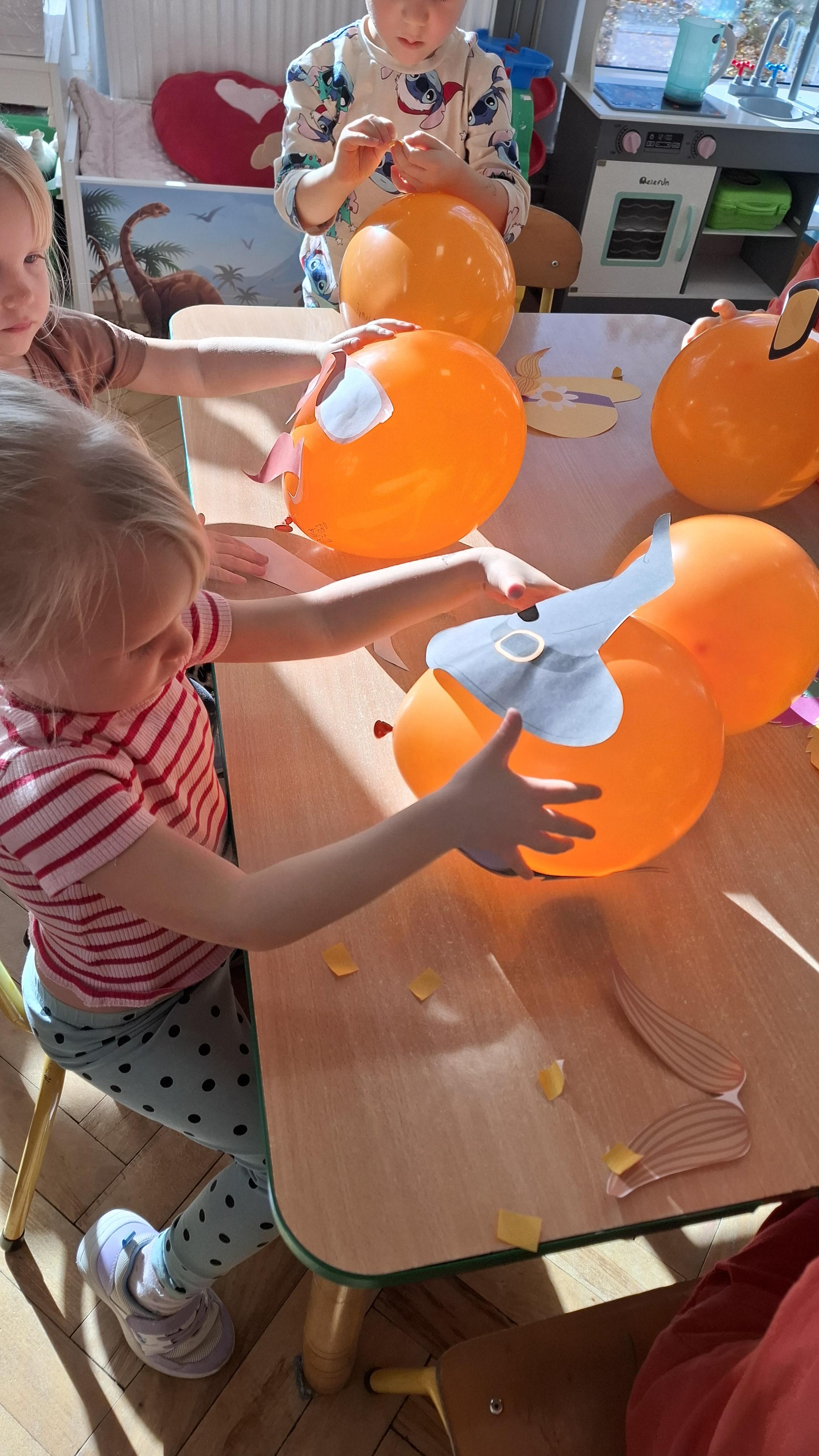 Na zakończenie dnia dzieci wykonały pracę plastyczną „Dyniowe balony”. Każdy przedszkolak ozdabiał swój pomarańczowy balonik, tworząc dyniową buzię – można było dodać okulary, maski, kapelusze, korony, usta, krawaty czy wąsy. Powstały wspaniałe, pomysłowe i zabawne dyniowe głowy, które ozdobiły naszą salę.