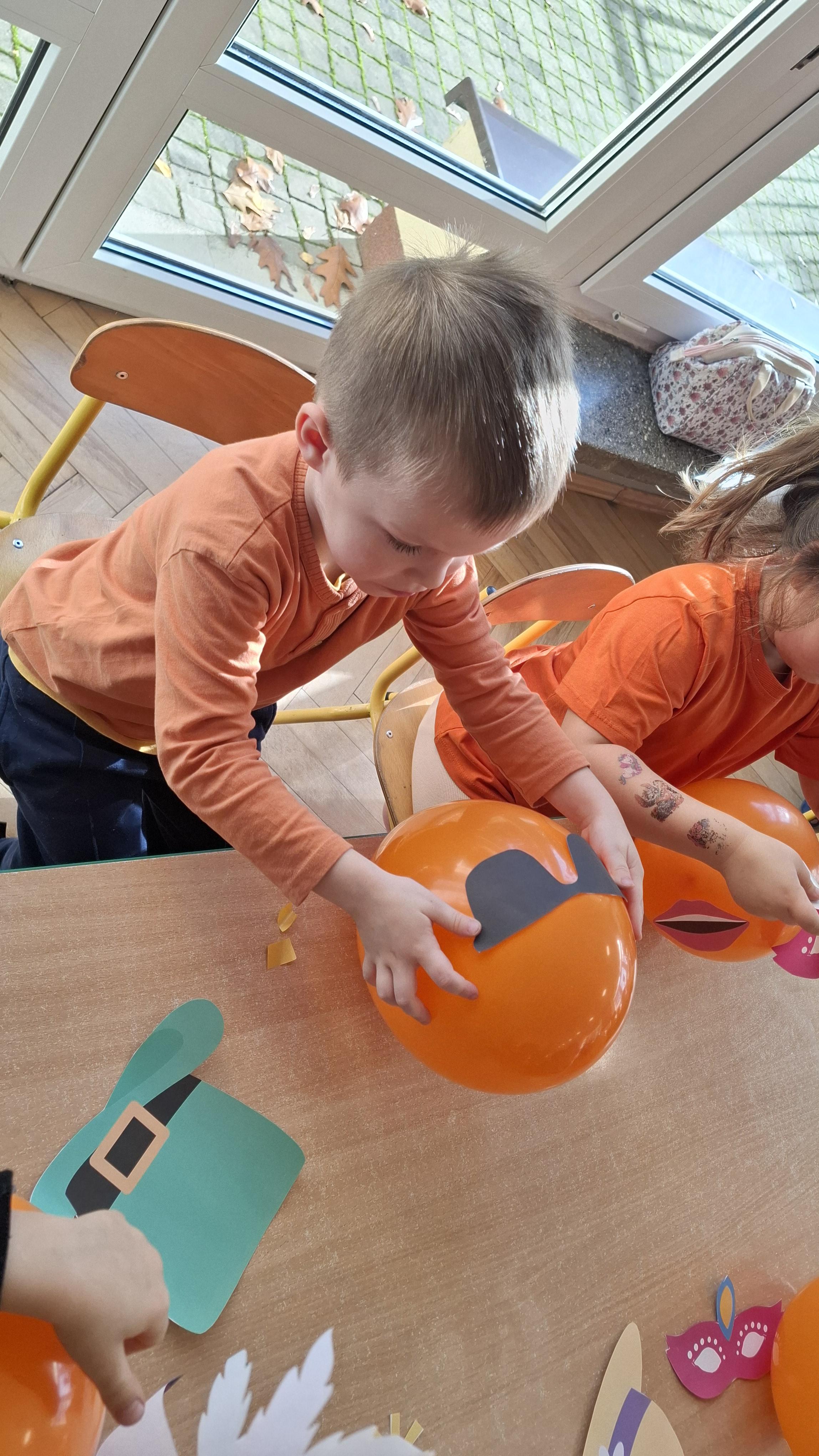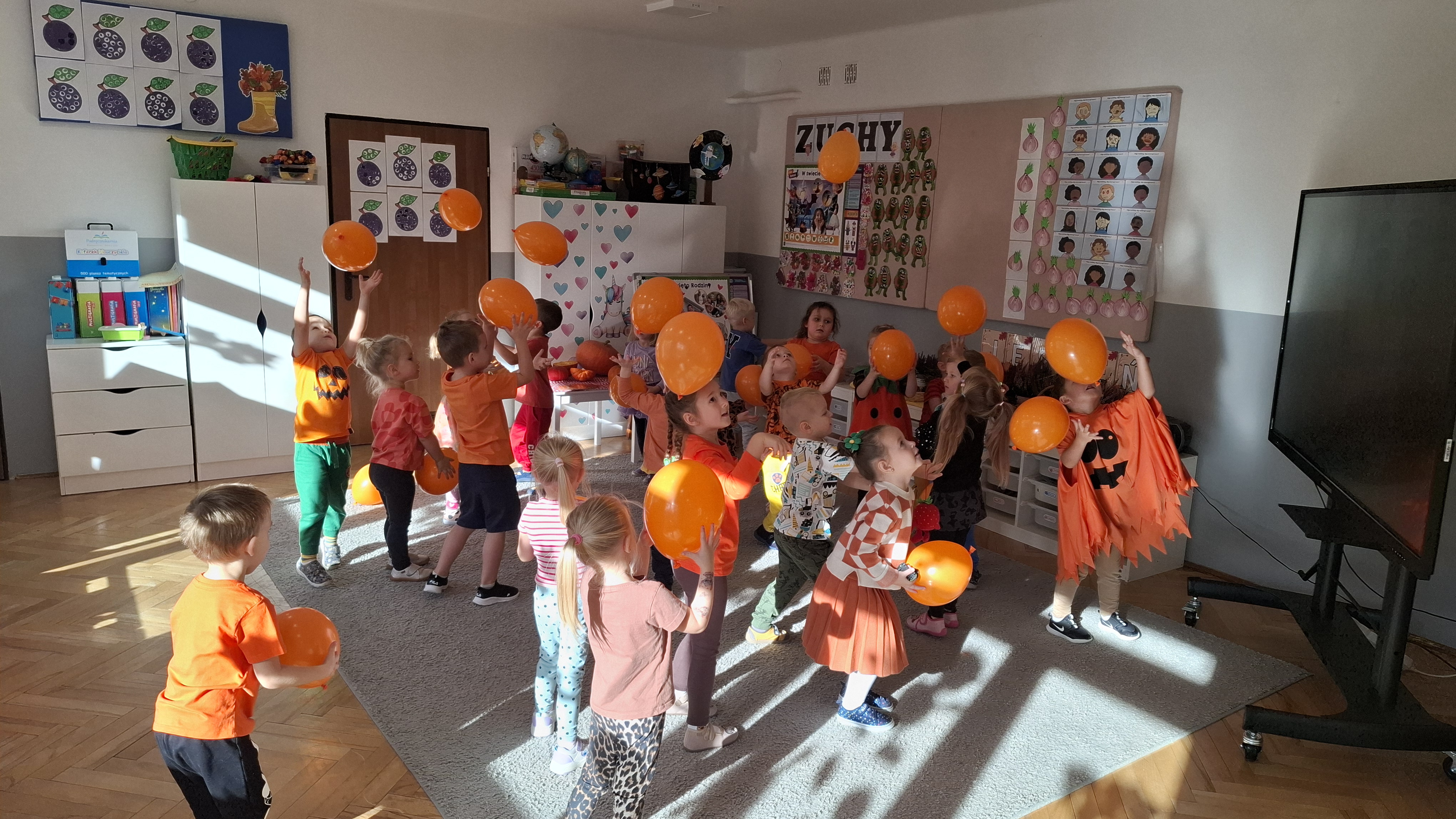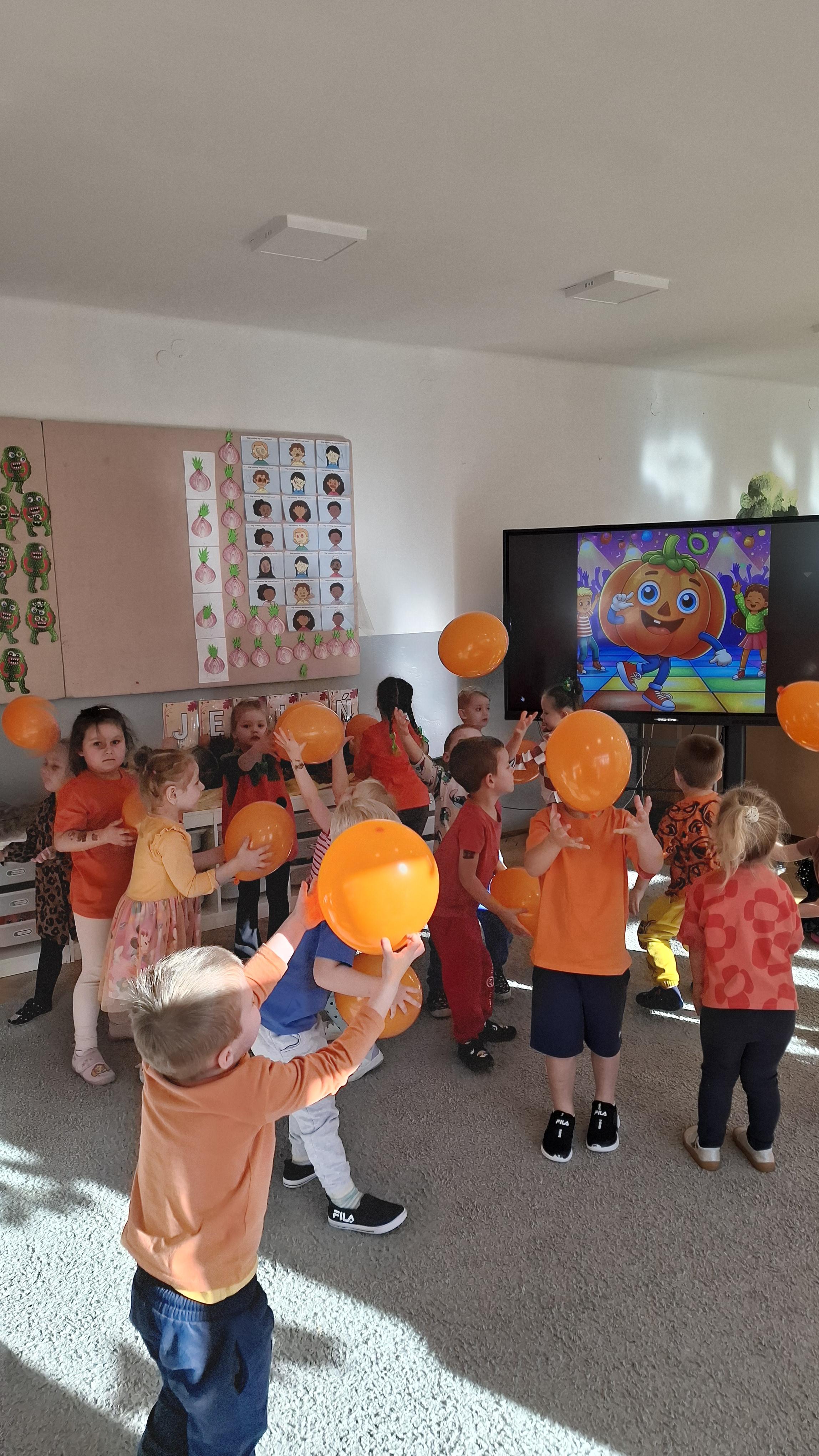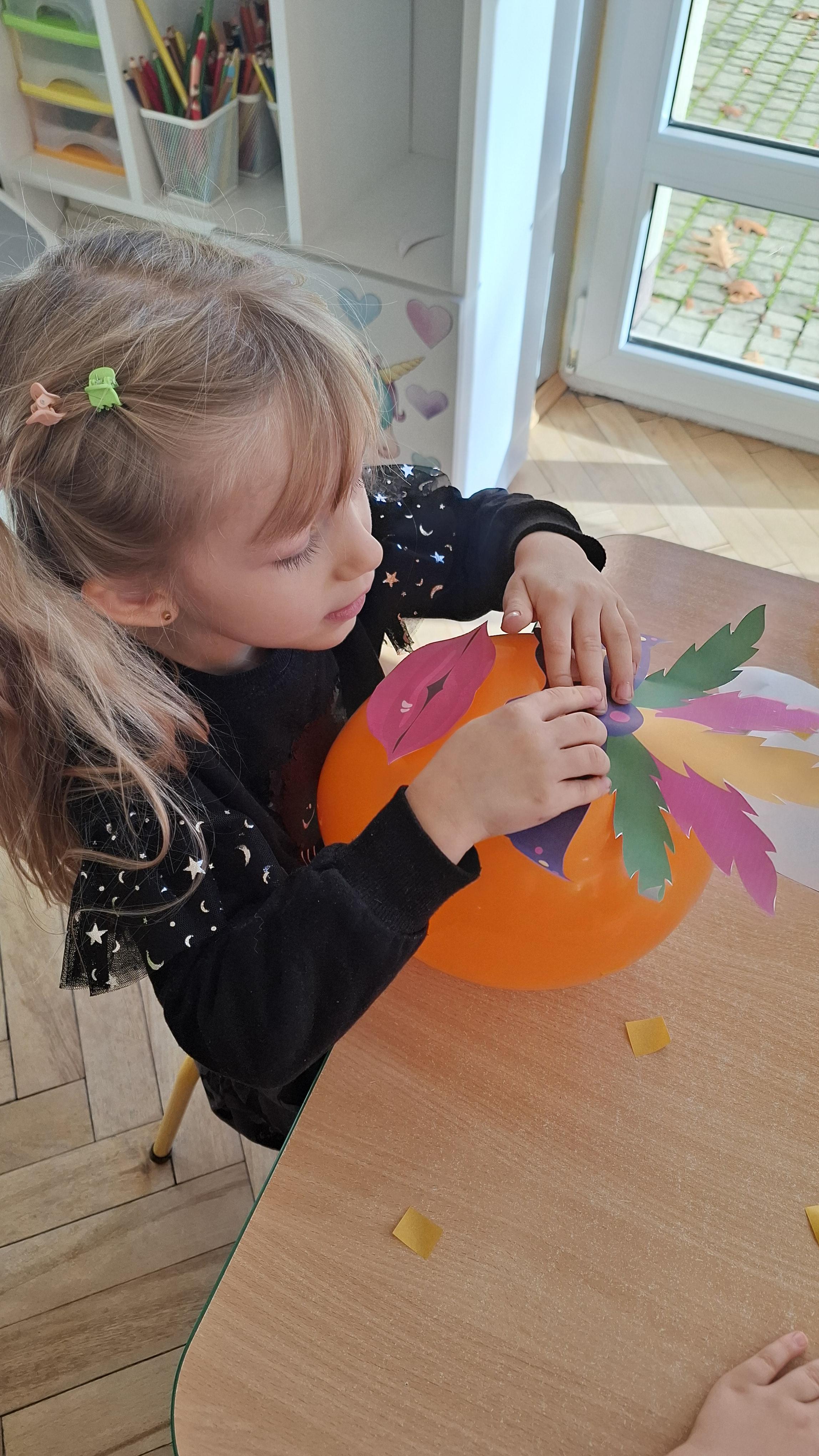 Na zakończenie dnia dzieci wykonały pracę plastyczną „Dyniowe balony”. Każdy przedszkolak ozdabiał swój pomarańczowy balonik, tworząc dyniową buzię – można było dodać okulary, maski, kapelusze, korony, usta, krawaty czy wąsy. Powstały wspaniałe, pomysłowe i zabawne dyniowe głowy, które ozdobiły naszą salę.
