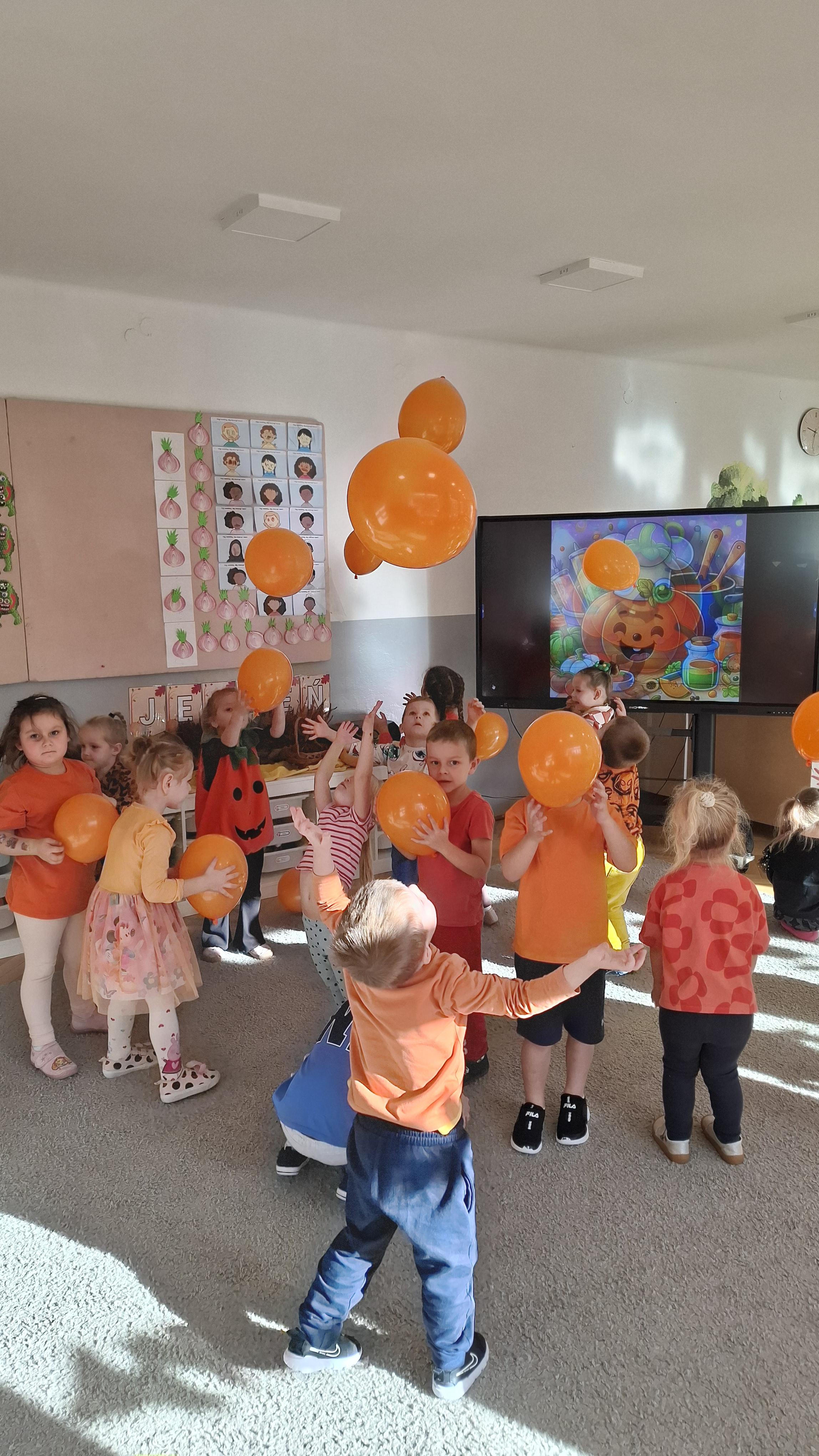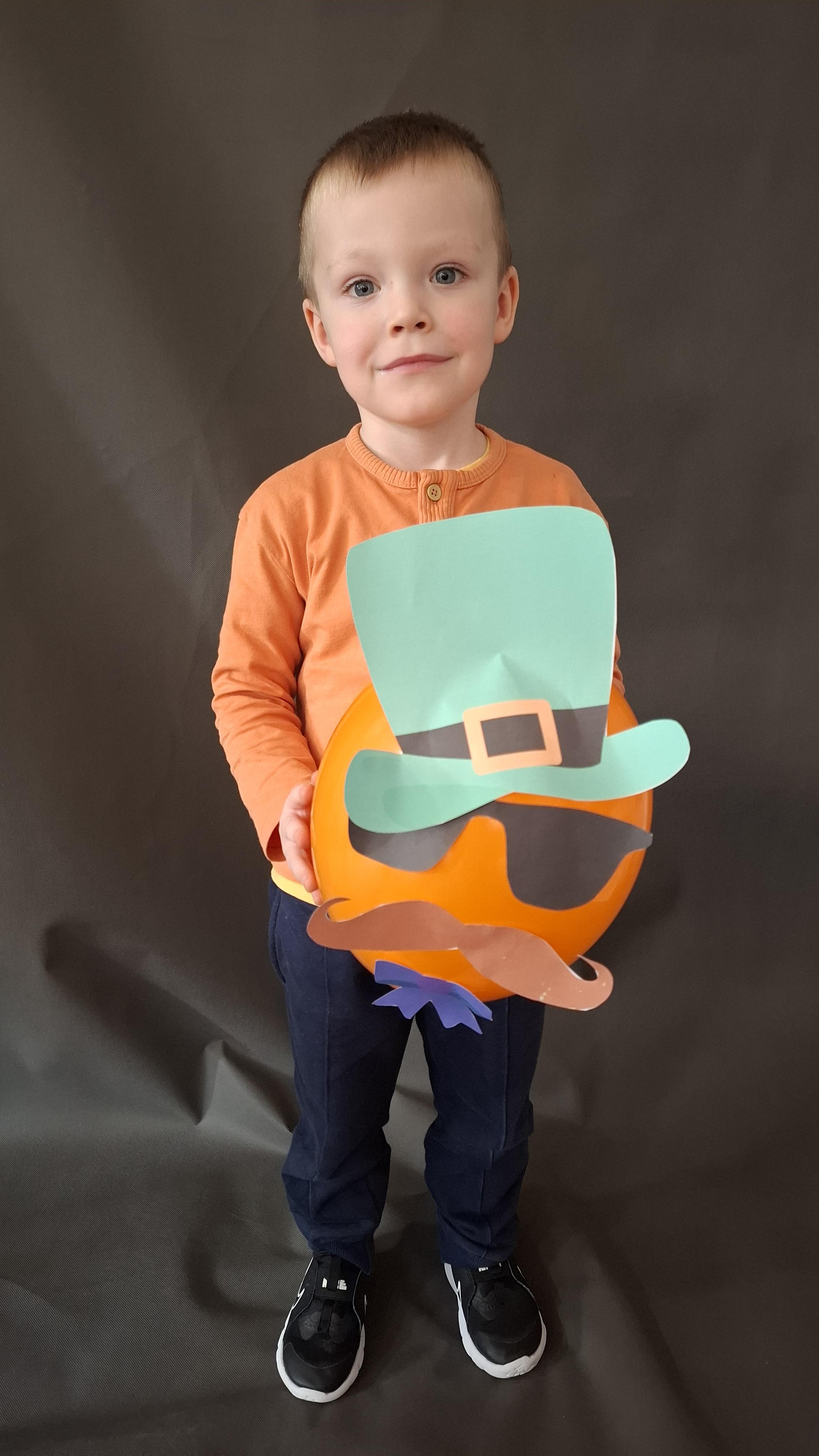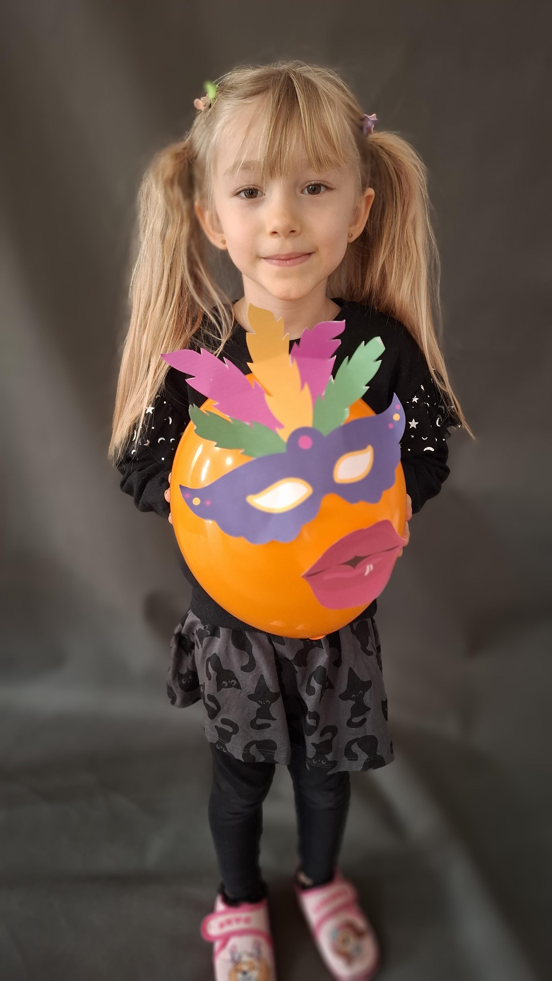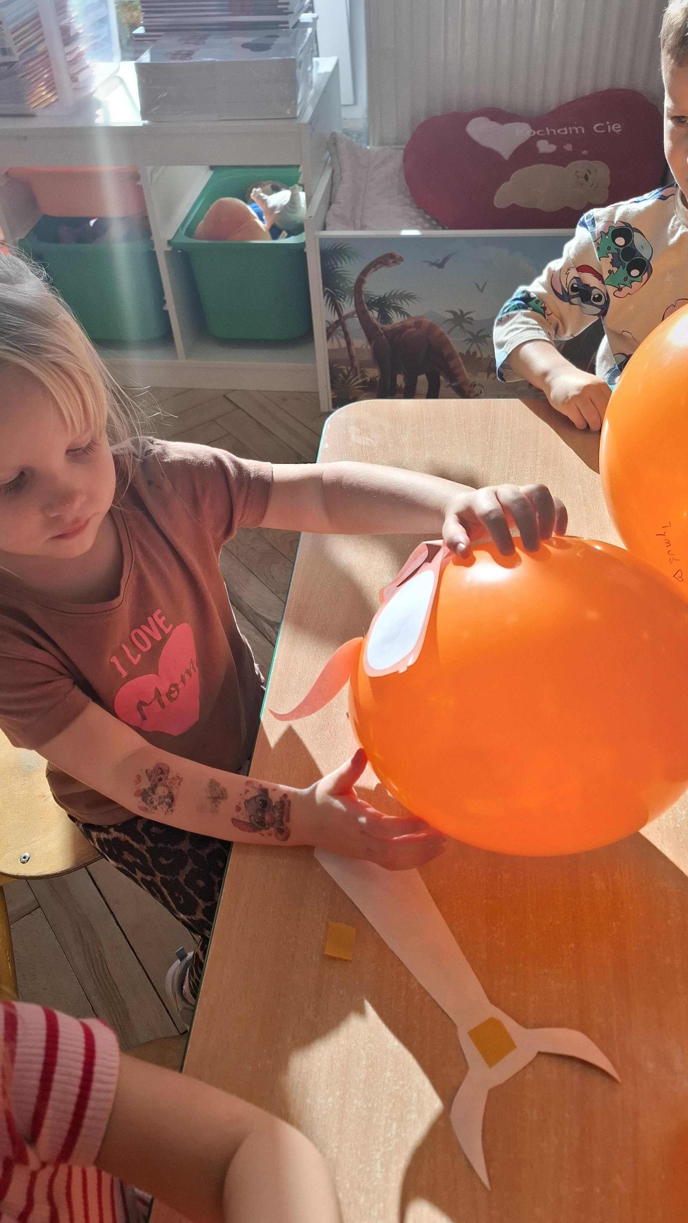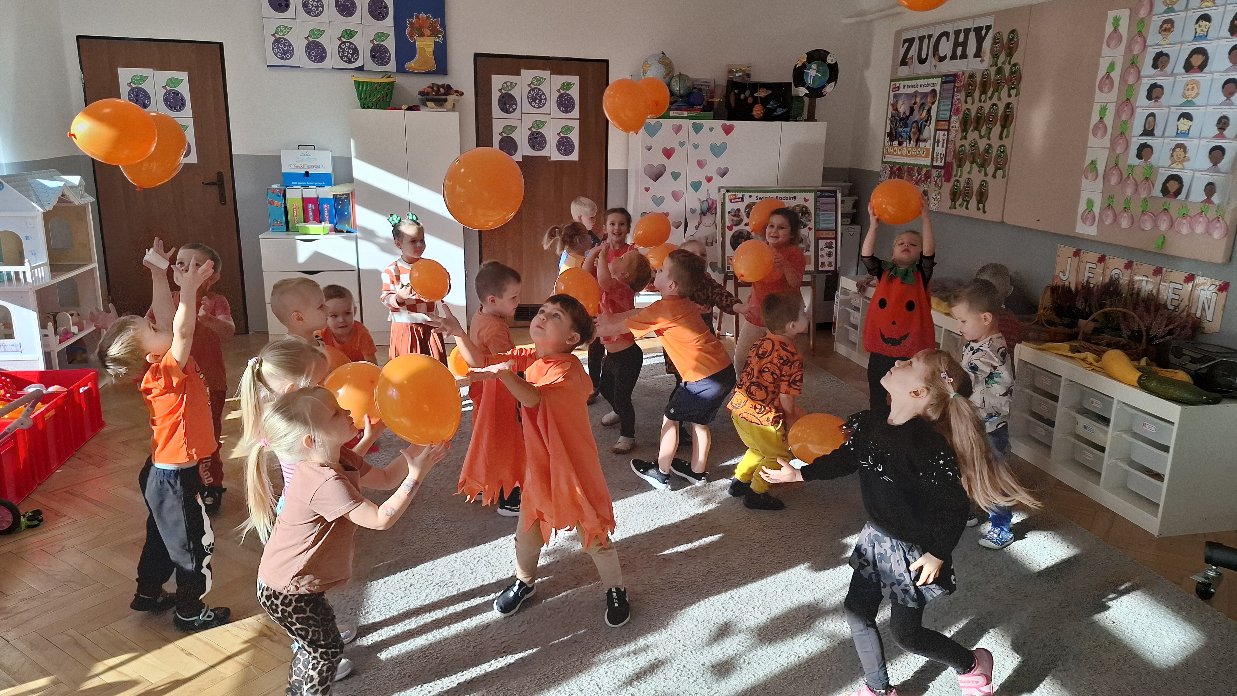 Na zakończenie dnia dzieci wykonały pracę plastyczną „Dyniowe balony”. Każdy przedszkolak ozdabiał swój pomarańczowy balonik, tworząc dyniową buzię – można było dodać okulary, maski, kapelusze, korony, usta, krawaty czy wąsy. Powstały wspaniałe, pomysłowe i zabawne dyniowe głowy, które ozdobiły naszą salę.