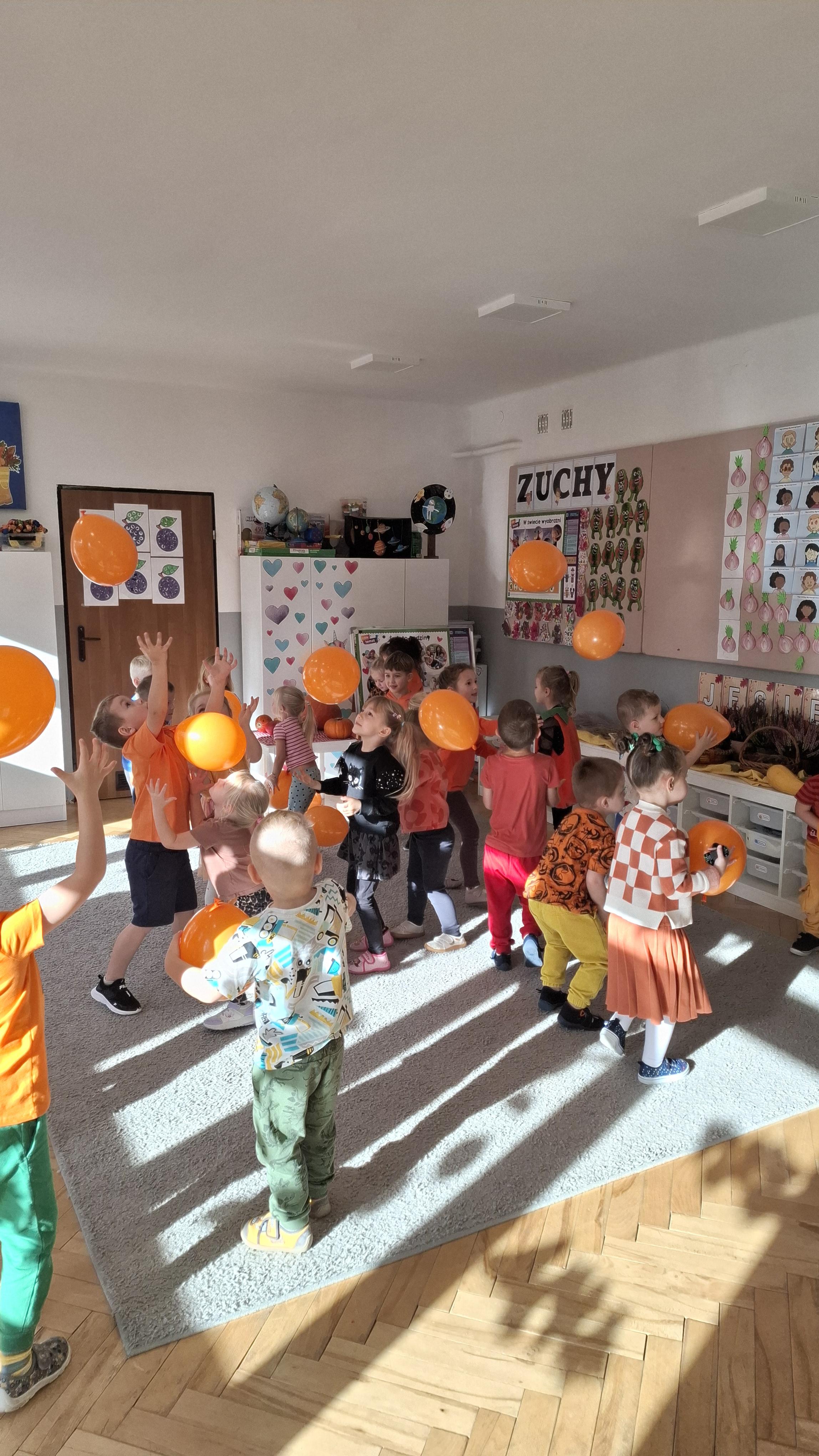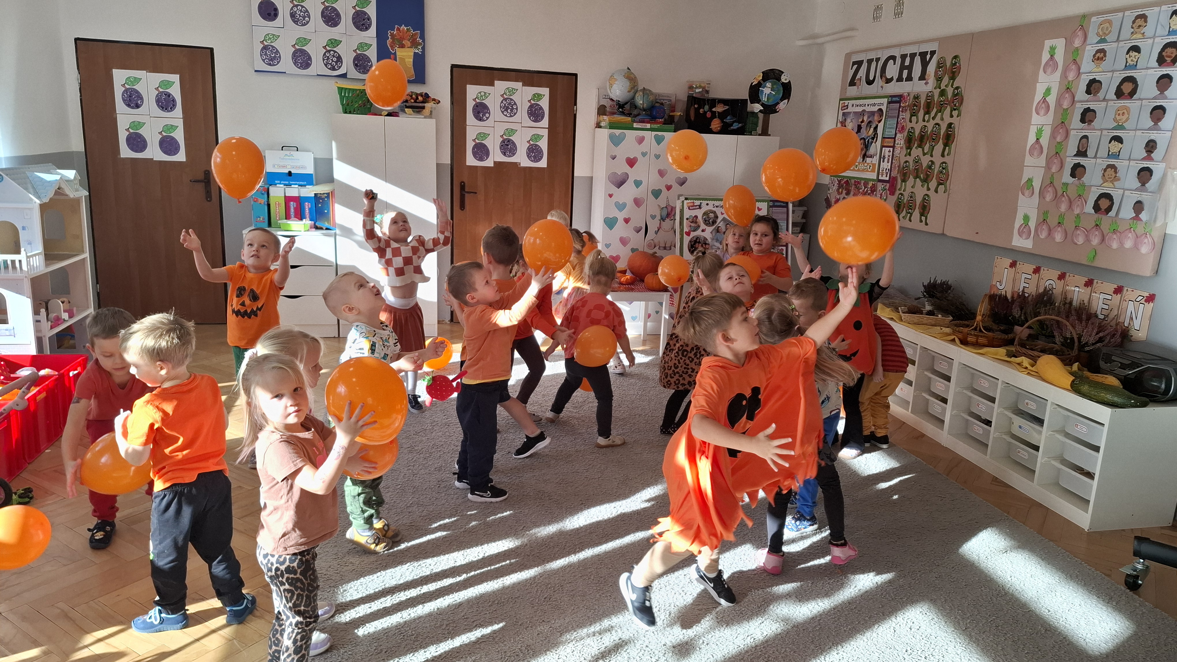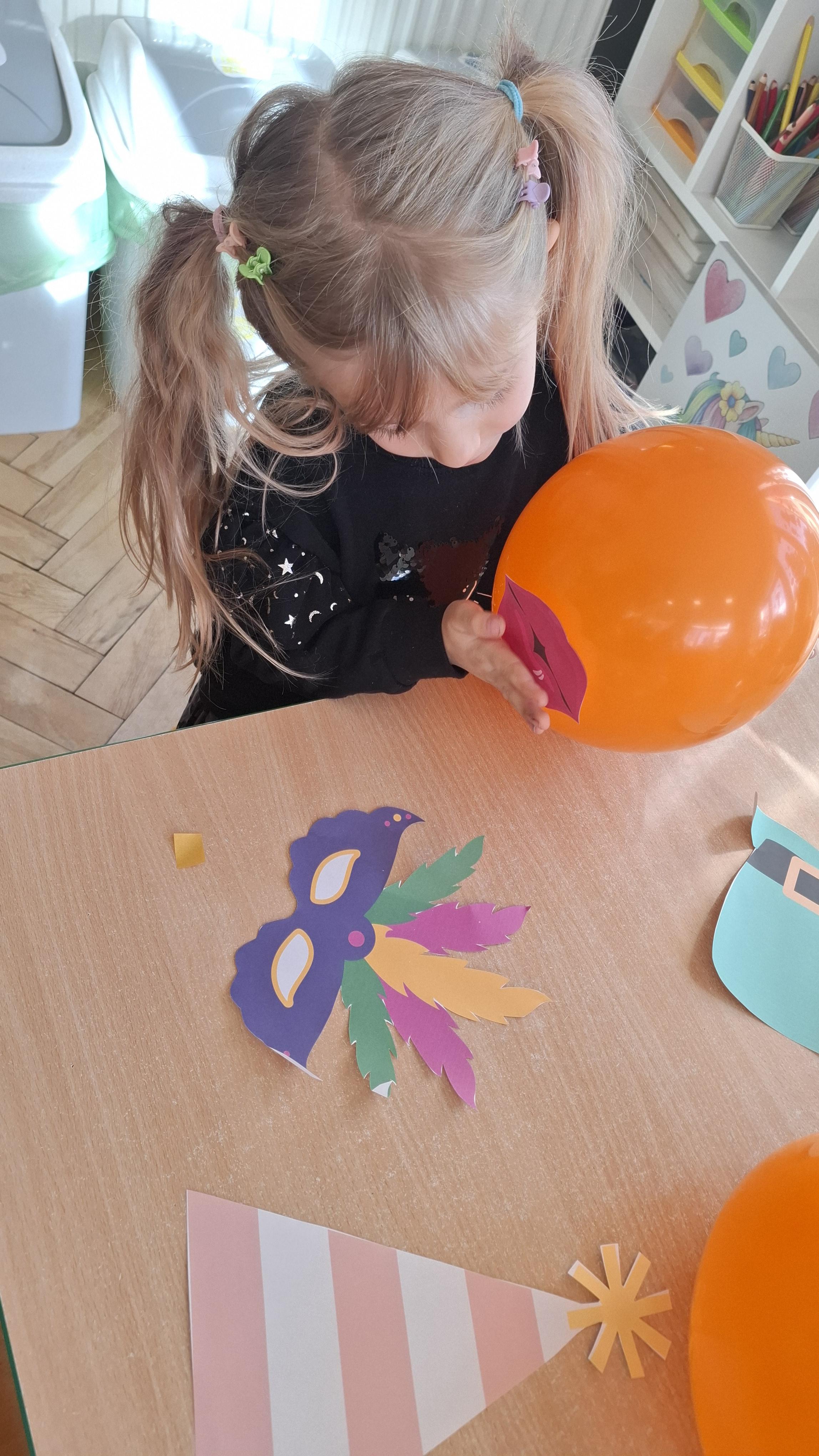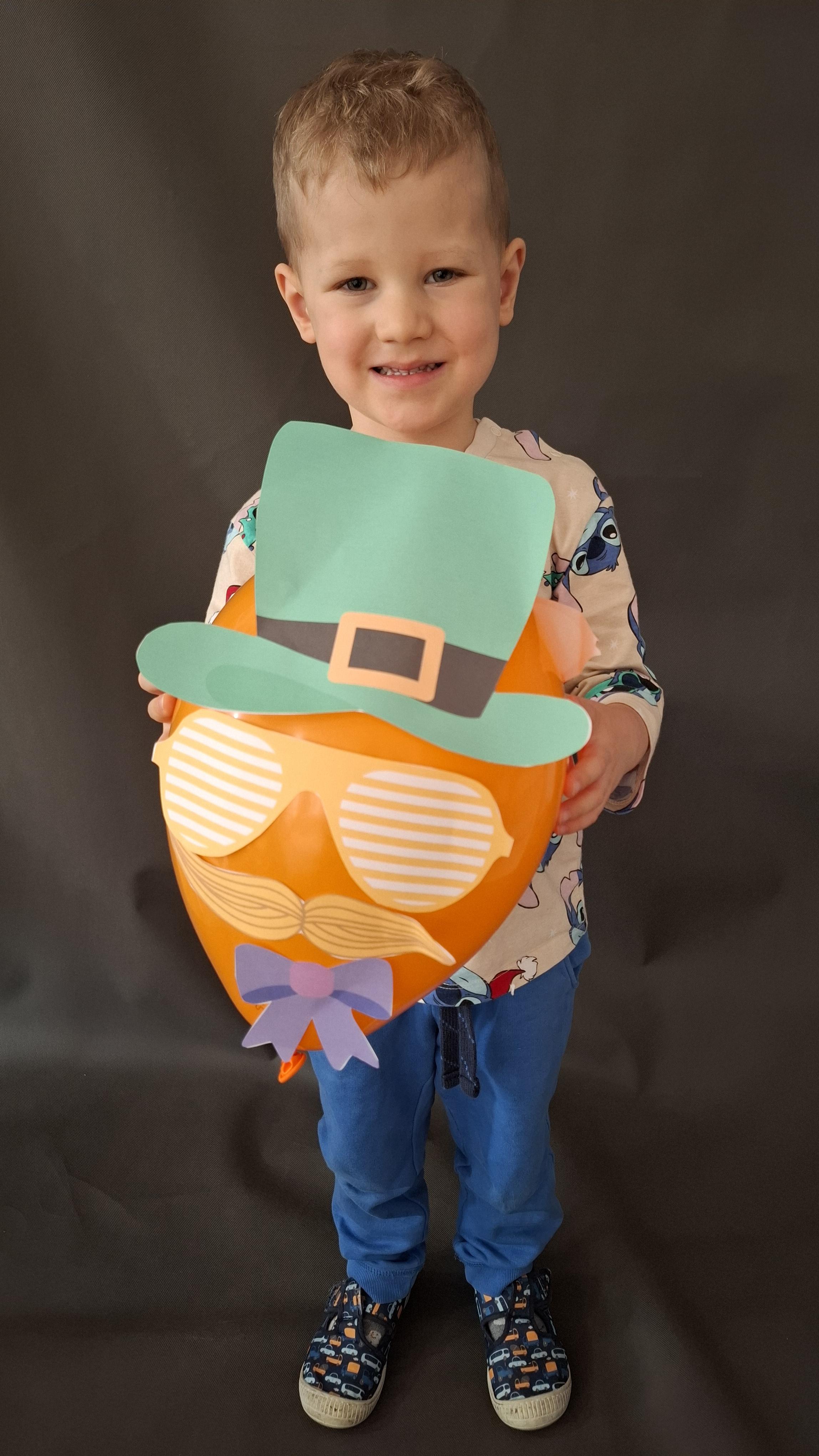 Na zakończenie dnia dzieci wykonały pracę plastyczną „Dyniowe balony”. Każdy przedszkolak ozdabiał swój pomarańczowy balonik, tworząc dyniową buzię – można było dodać okulary, maski, kapelusze, korony, usta, krawaty czy wąsy. Powstały wspaniałe, pomysłowe i zabawne dyniowe głowy, które ozdobiły naszą salę.