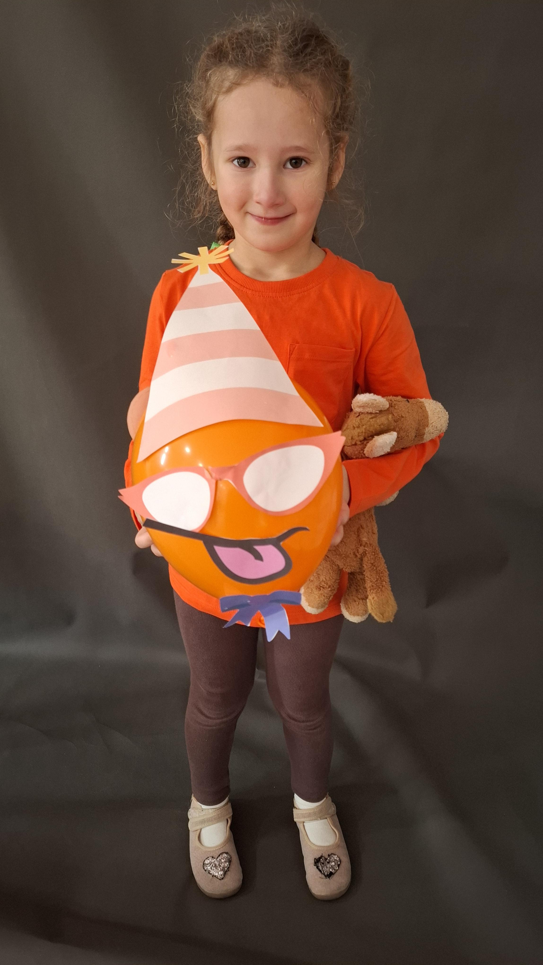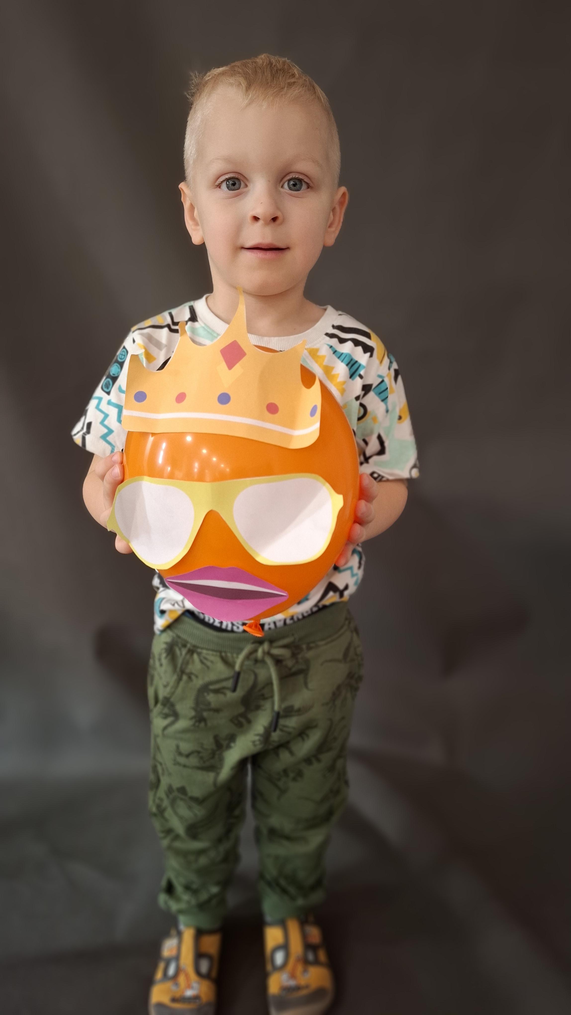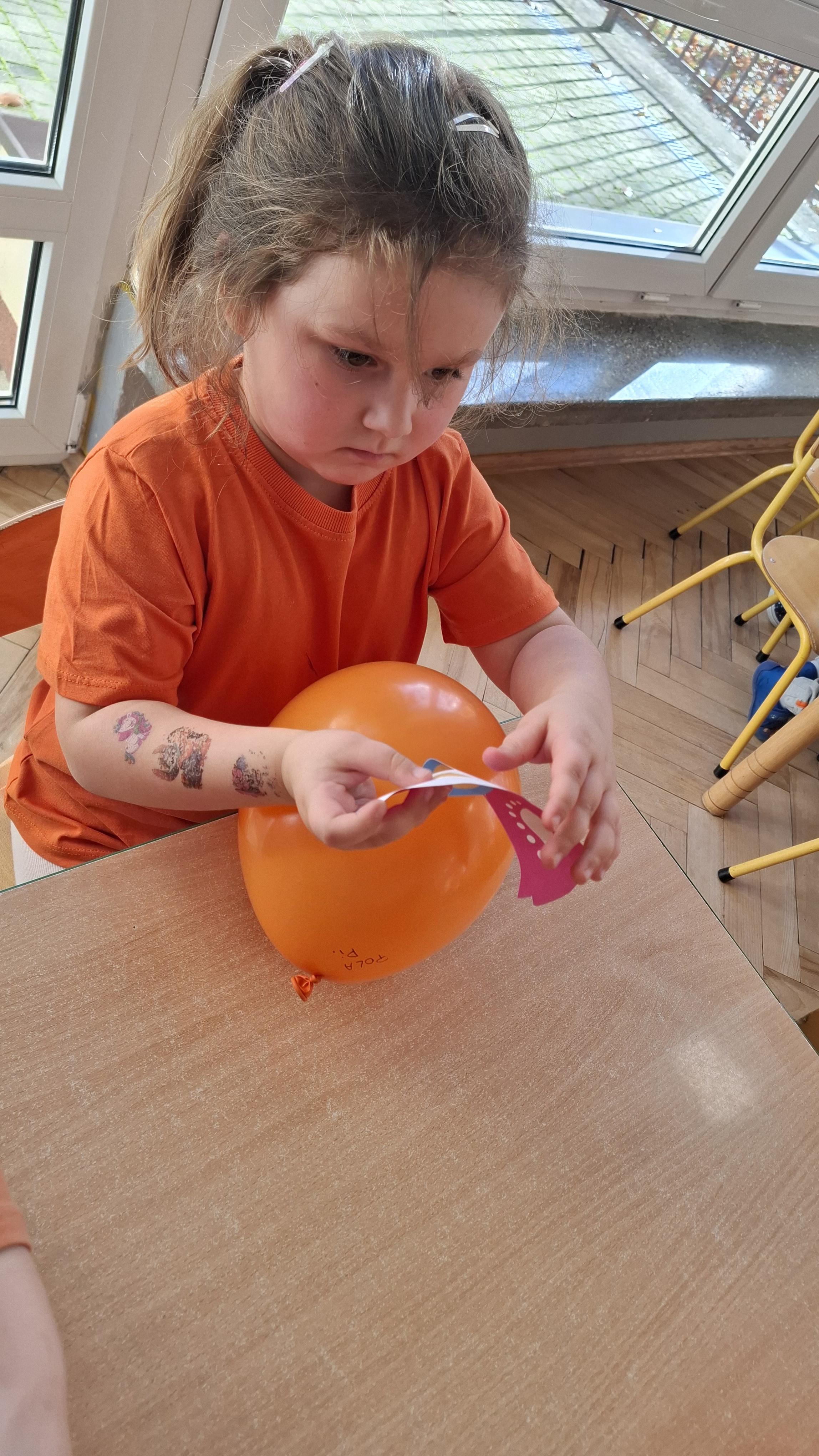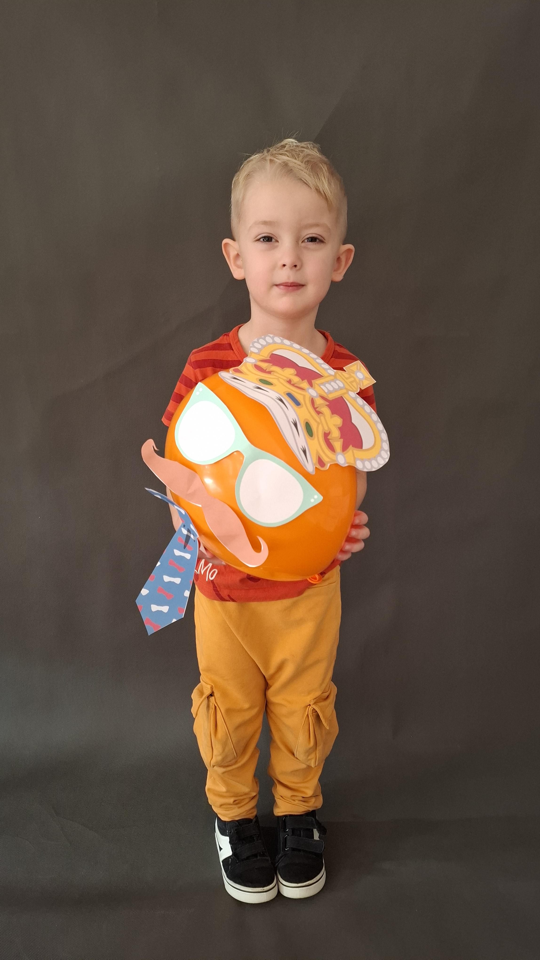 Na zakończenie dnia dzieci wykonały pracę plastyczną „Dyniowe balony”. Każdy przedszkolak ozdabiał swój pomarańczowy balonik, tworząc dyniową buzię – można było dodać okulary, maski, kapelusze, korony, usta, krawaty czy wąsy. Powstały wspaniałe, pomysłowe i zabawne dyniowe głowy, które ozdobiły naszą salę.