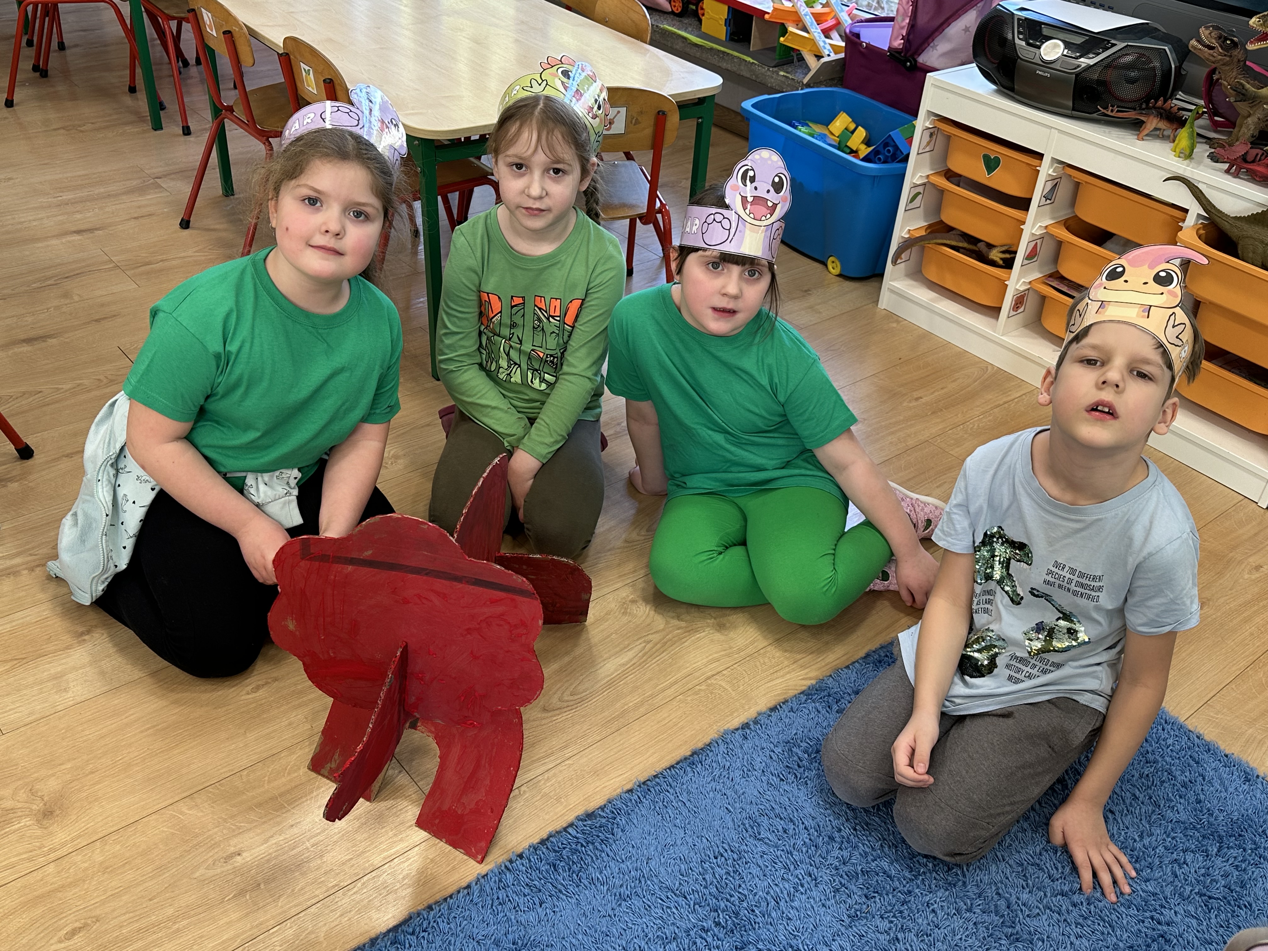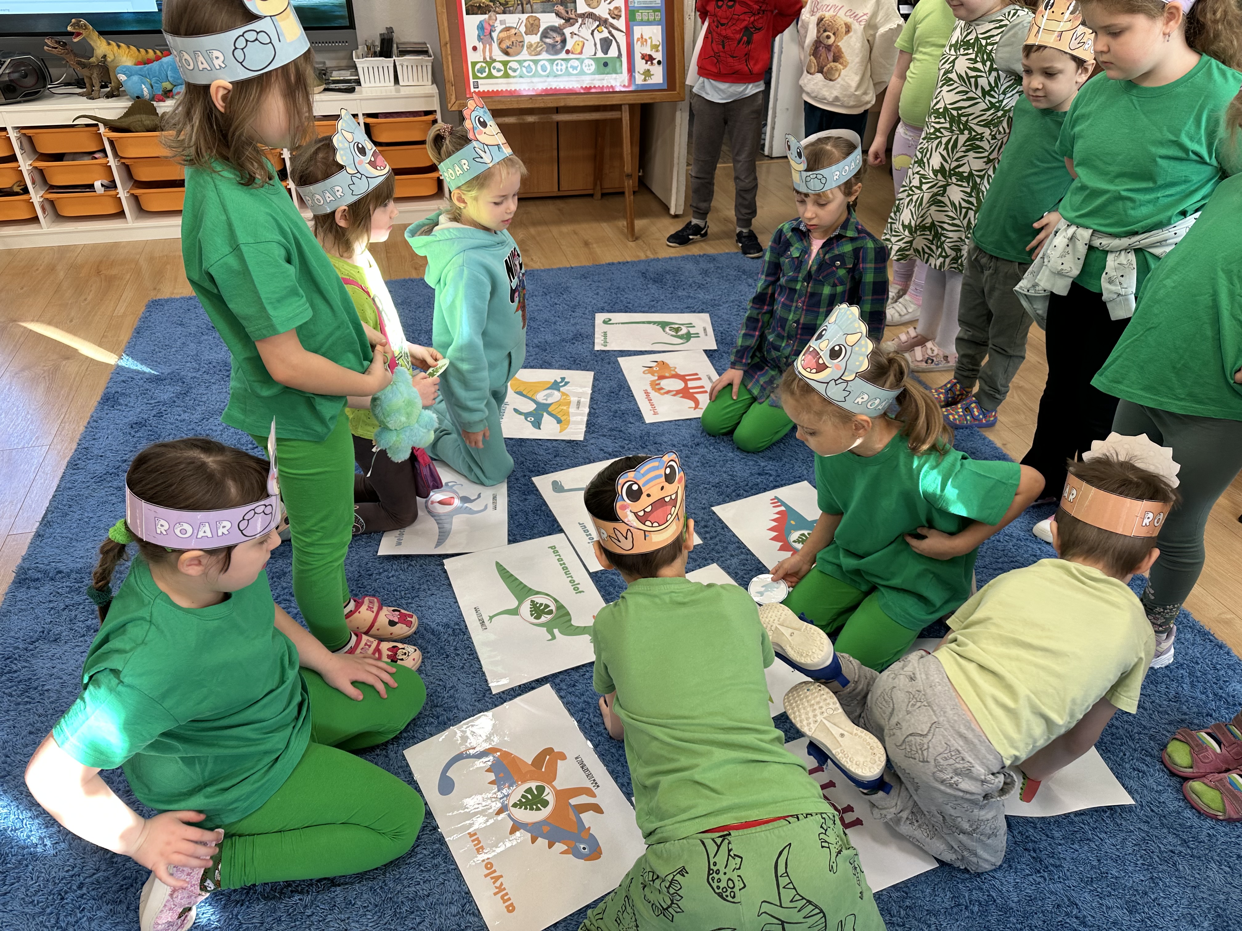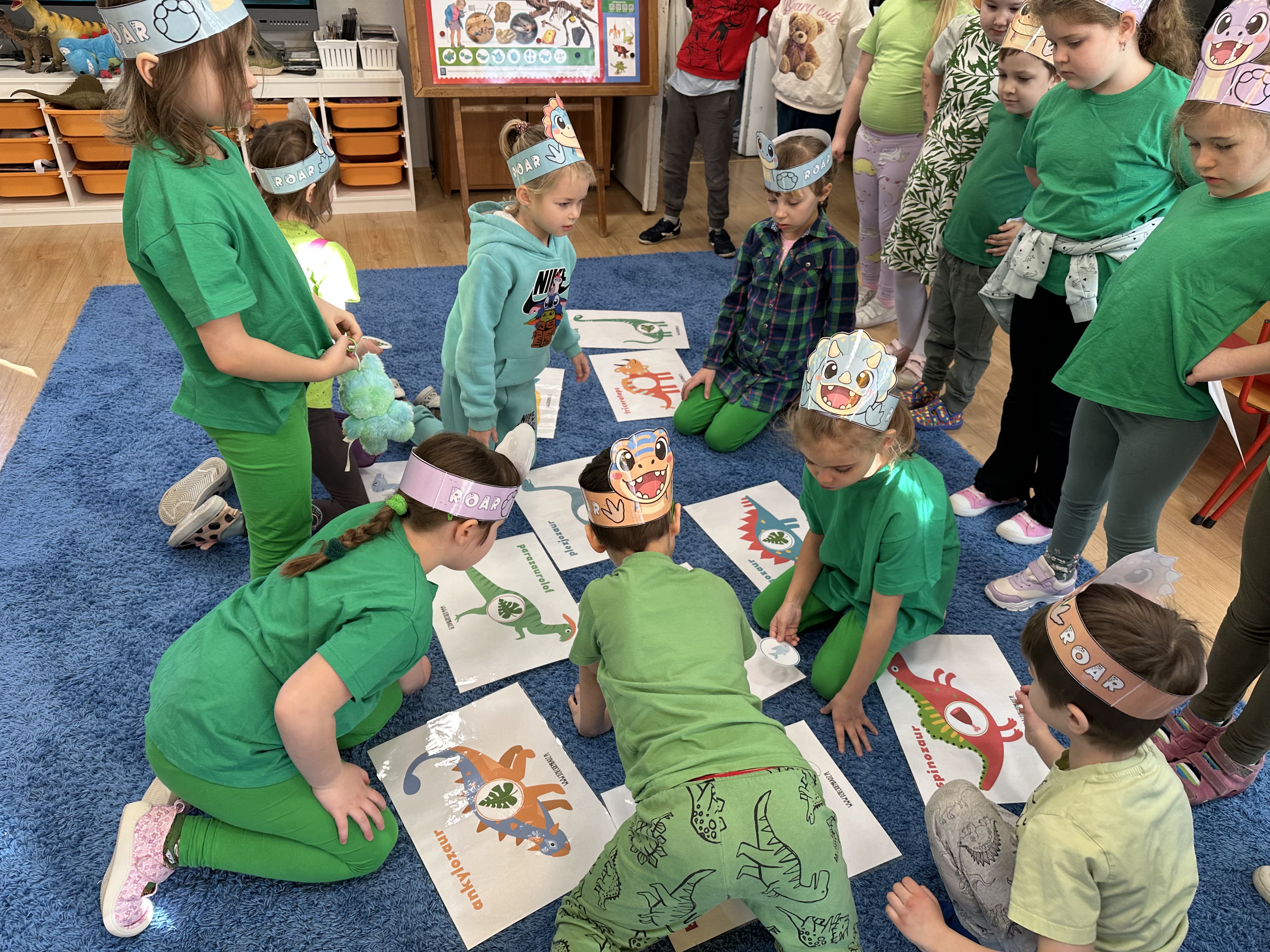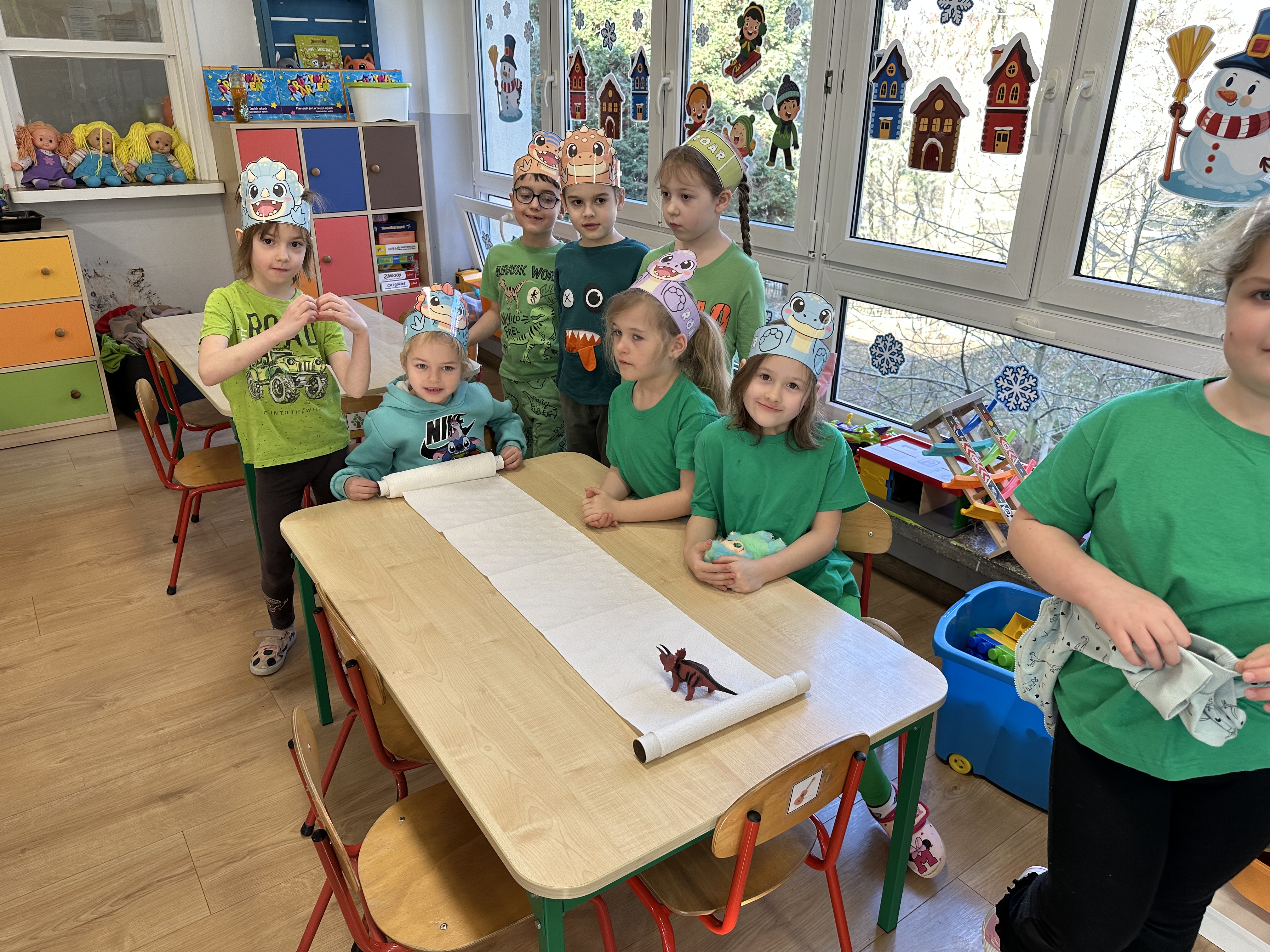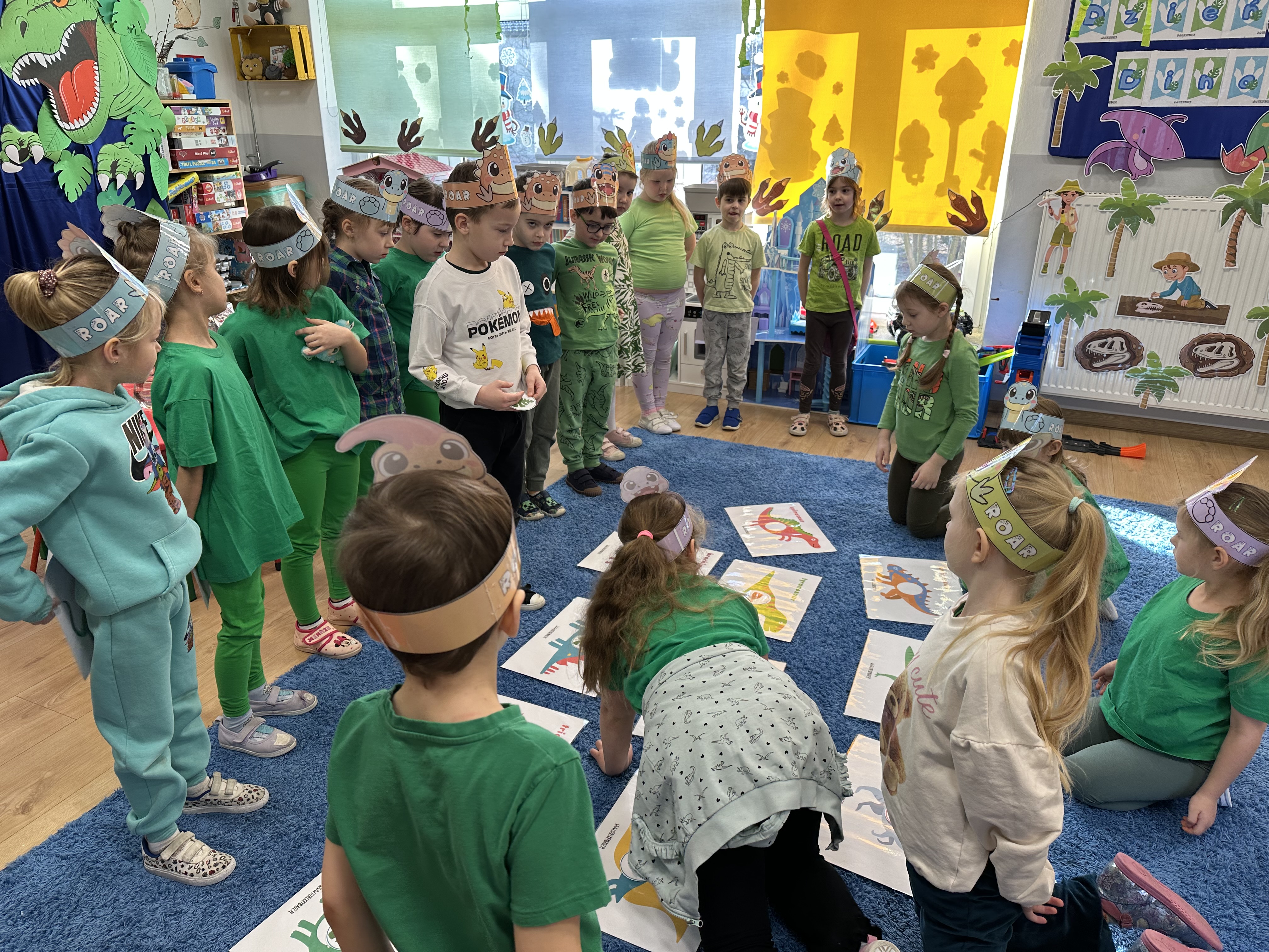 W naszej grupie odbył się Dzień Dinozaura, który dostarczył dzieciom wielu radosnych chwil oraz wzbogacił ich wiedzę o prehistorycznym świecie. Już od samego rana w sali został przygotowany kącik dinozaurów, w którym znalazły się figurki, książki oraz ilustracje przedstawiające różne gatunki tych niezwykłych stworzeń. Jedną z pierwszych aktywności była zabawa w paleontologów. Dzieci z ogromnym zaangażowaniem poszukiwały ukrytych „skamieniałości” i figurek dinozaurów, ucząc się przy tym, na czym polega praca naukowca badającego przeszłość Ziemi. Następnie wspólnie segregowały dinozaury na roślinożerne i mięsożerne, poznając ich charakterystyczne cechy oraz sposób odżywiania. Kolejnym punktem programu były „Dino-malowanki” – przestrzenna praca plastyczna, podczas której dzieci rozwijały swoją wyobraźnię i zdolności manualne. Duże zainteresowanie wzbudził również eksperyment „Wulkan”. Wykorzystując sodę i ocet, dzieci mogły zaobserwować efektowną „erupcję”, co było nie tylko świetną zabawą, ale także ciekawą lekcją przyrody. Nie zabrakło również aktywności ruchowych i gier. W „Wyścigach dinozaurów” dzieci sprawdzały, który dinozaur najszybciej dotrze do mety. Dużo emocji dostarczyła także gra „Dino droga”, w której zadaniem było bezpieczne przeprowadzenie dinozaurów przez prehistoryczny krajobraz pełen przygód i niespodzianek. Na zakończenie odbył się quiz sprawdzający wiadomości o dinozaurach. Dzieci wykazały się dużą wiedzą i zaangażowaniem. Dzień zakończył się wykonaniem pamiątkowej fotografii, która będzie miłym wspomnieniem wspólnie spędzonego czasu. Obchody Dnia Dinozaura były nie tylko okazją do świetnej zabawy, ale również do zdobywania nowych informacji i rozwijania zainteresowań przyrodniczych.