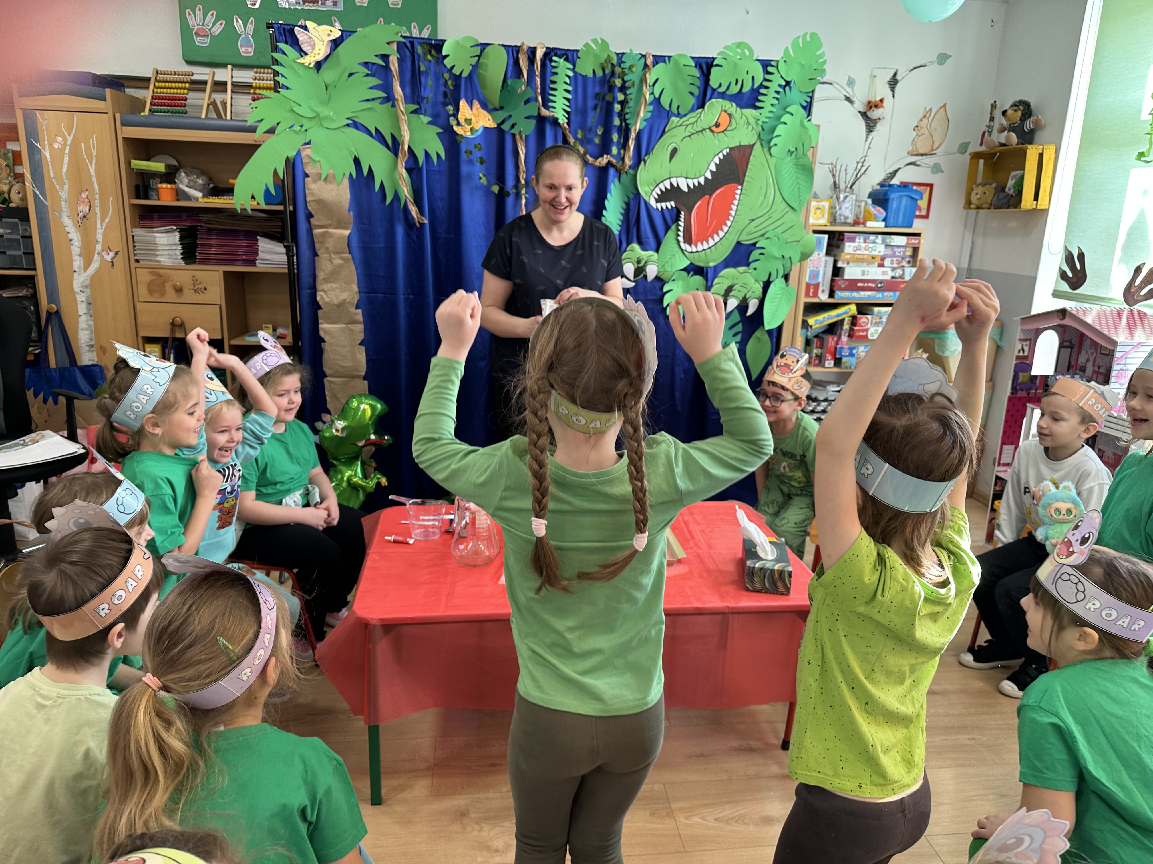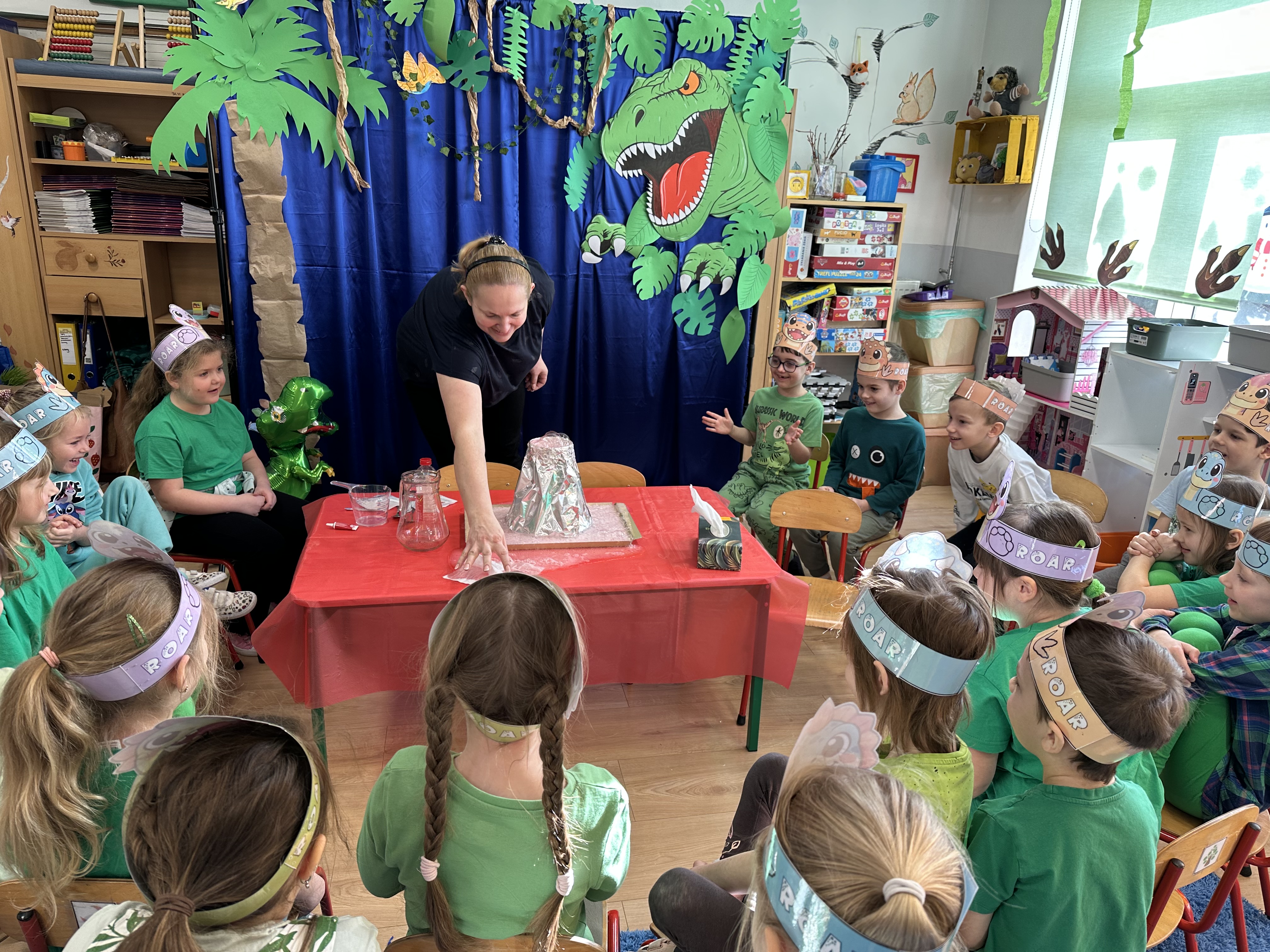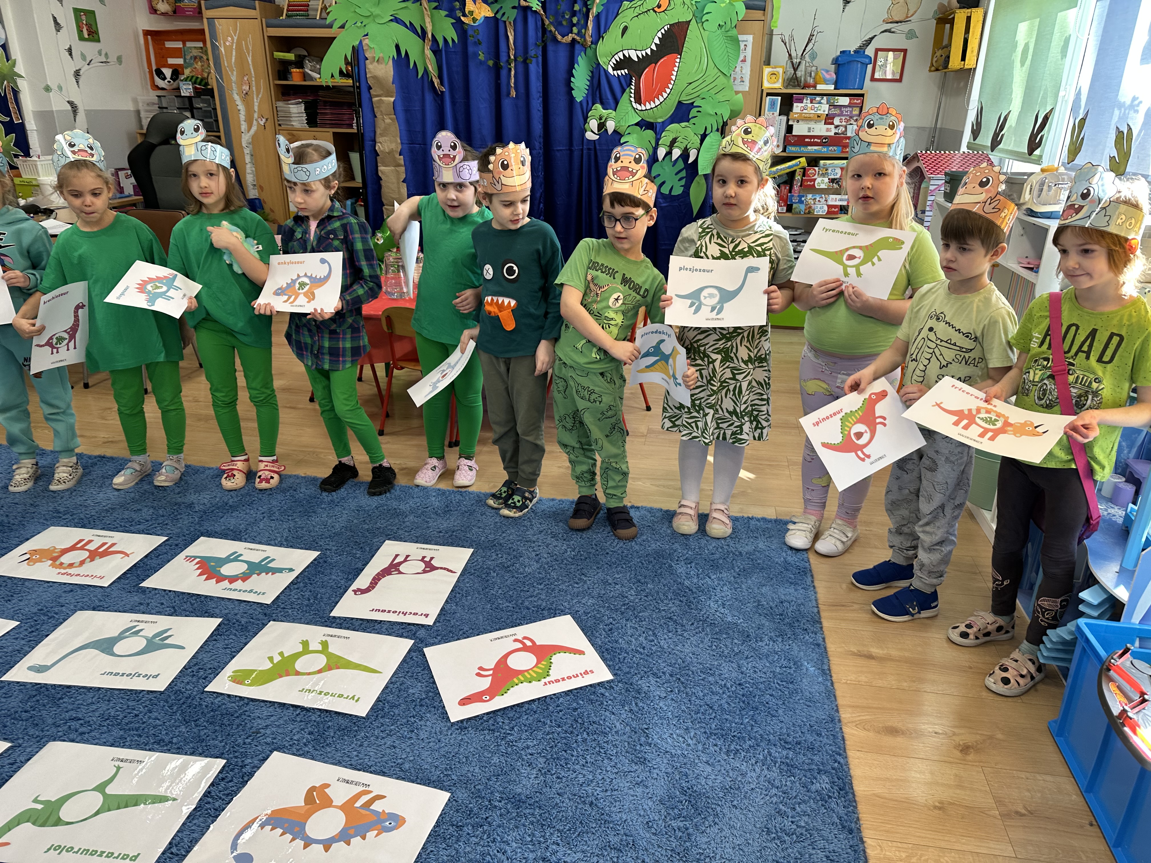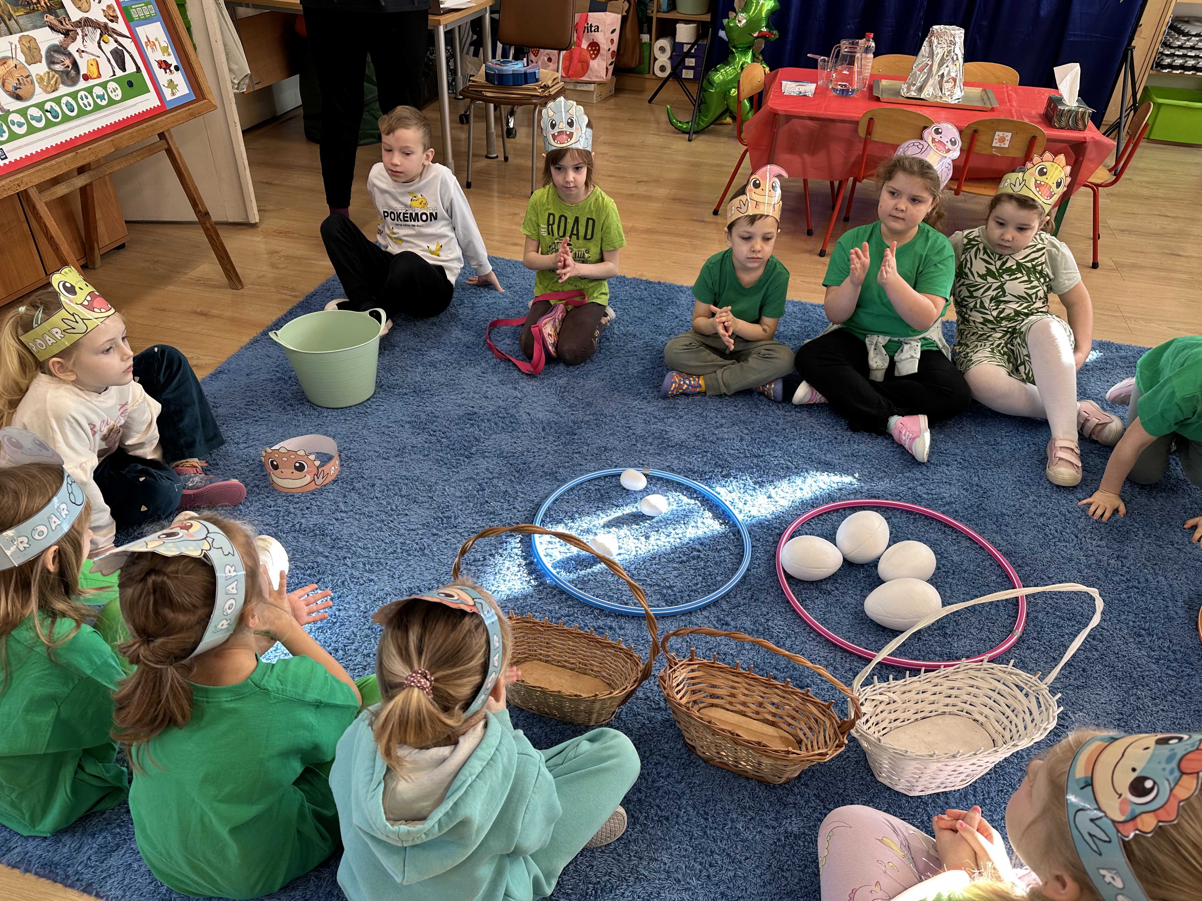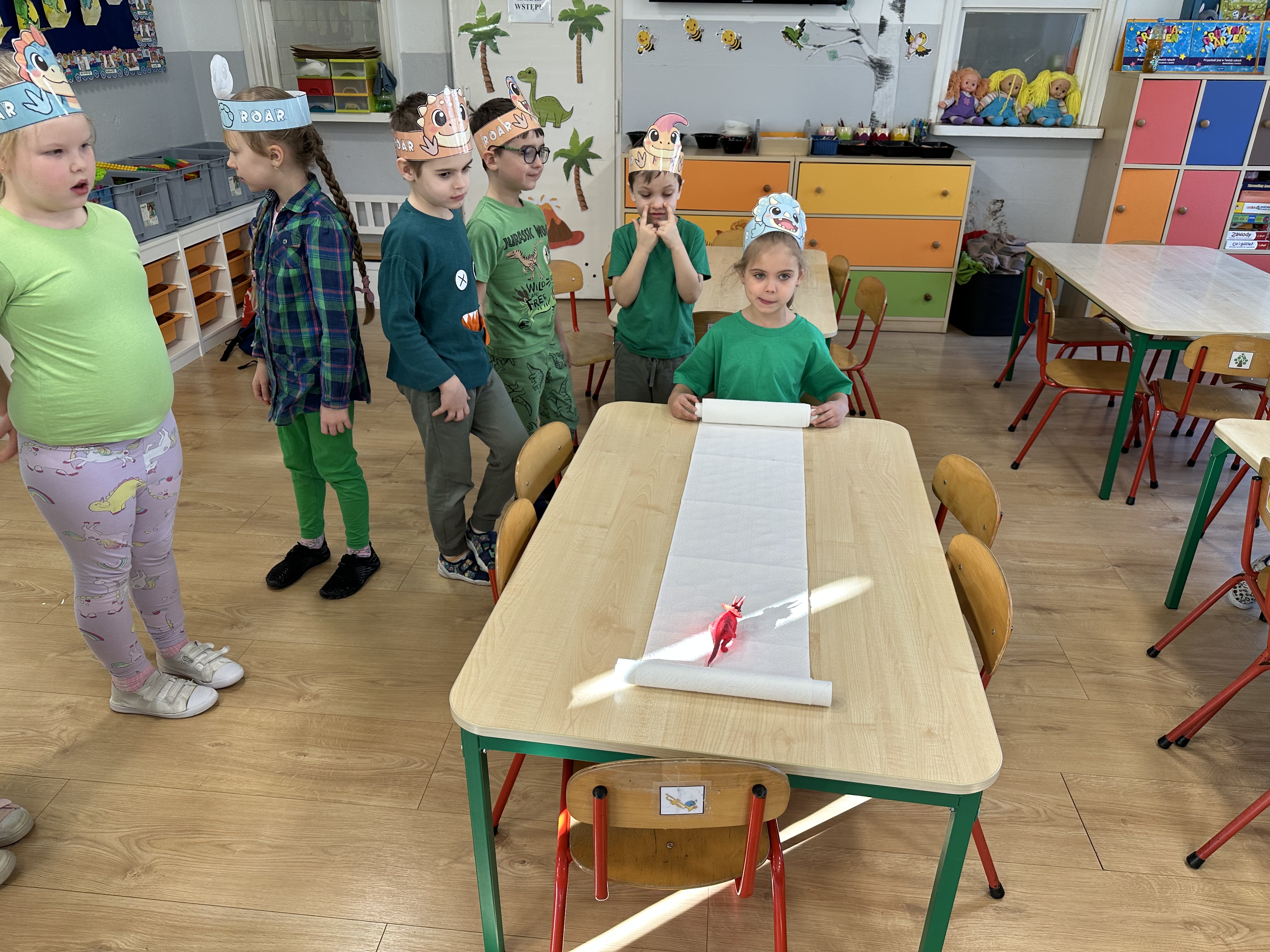 W naszej grupie odbył się Dzień Dinozaura, który dostarczył dzieciom wielu radosnych chwil oraz wzbogacił ich wiedzę o prehistorycznym świecie. Już od samego rana w sali został przygotowany kącik dinozaurów, w którym znalazły się figurki, książki oraz ilustracje przedstawiające różne gatunki tych niezwykłych stworzeń. Jedną z pierwszych aktywności była zabawa w paleontologów. Dzieci z ogromnym zaangażowaniem poszukiwały ukrytych „skamieniałości” i figurek dinozaurów, ucząc się przy tym, na czym polega praca naukowca badającego przeszłość Ziemi. Następnie wspólnie segregowały dinozaury na roślinożerne i mięsożerne, poznając ich charakterystyczne cechy oraz sposób odżywiania. Kolejnym punktem programu były „Dino-malowanki” – przestrzenna praca plastyczna, podczas której dzieci rozwijały swoją wyobraźnię i zdolności manualne. Duże zainteresowanie wzbudził również eksperyment „Wulkan”. Wykorzystując sodę i ocet, dzieci mogły zaobserwować efektowną „erupcję”, co było nie tylko świetną zabawą, ale także ciekawą lekcją przyrody. Nie zabrakło również aktywności ruchowych i gier. W „Wyścigach dinozaurów” dzieci sprawdzały, który dinozaur najszybciej dotrze do mety. Dużo emocji dostarczyła także gra „Dino droga”, w której zadaniem było bezpieczne przeprowadzenie dinozaurów przez prehistoryczny krajobraz pełen przygód i niespodzianek. Na zakończenie odbył się quiz sprawdzający wiadomości o dinozaurach. Dzieci wykazały się dużą wiedzą i zaangażowaniem. Dzień zakończył się wykonaniem pamiątkowej fotografii, która będzie miłym wspomnieniem wspólnie spędzonego czasu. Obchody Dnia Dinozaura były nie tylko okazją do świetnej zabawy, ale również do zdobywania nowych informacji i rozwijania zainteresowań przyrodniczych.