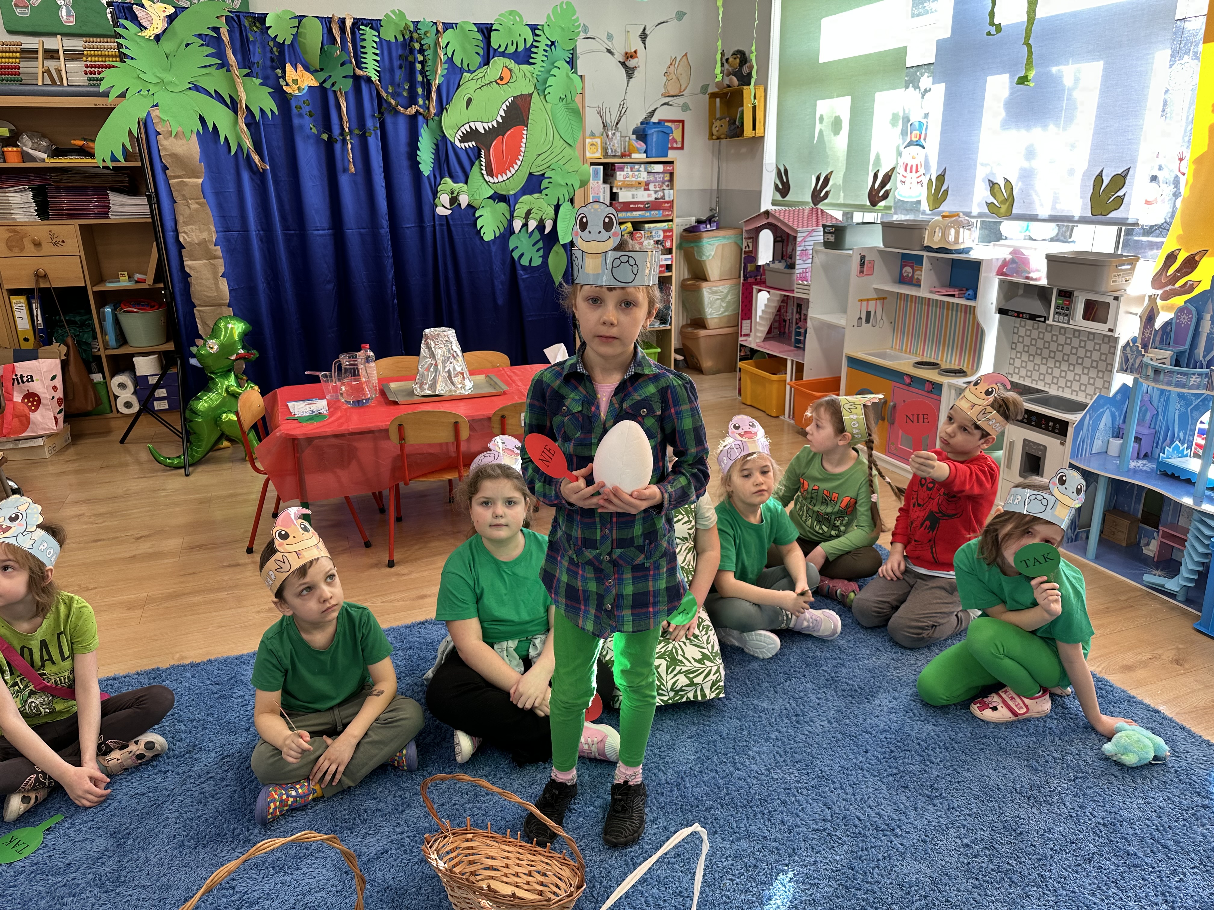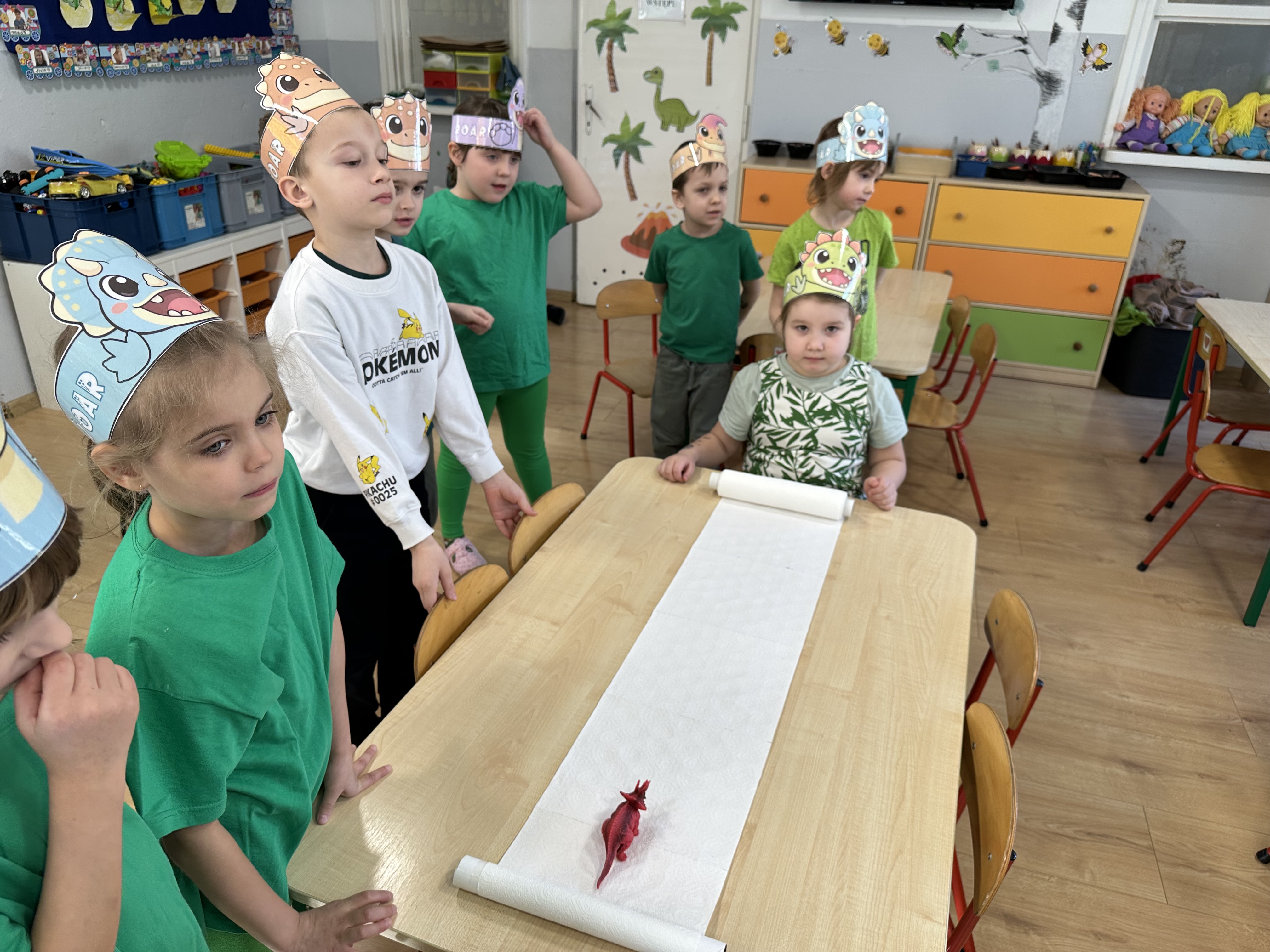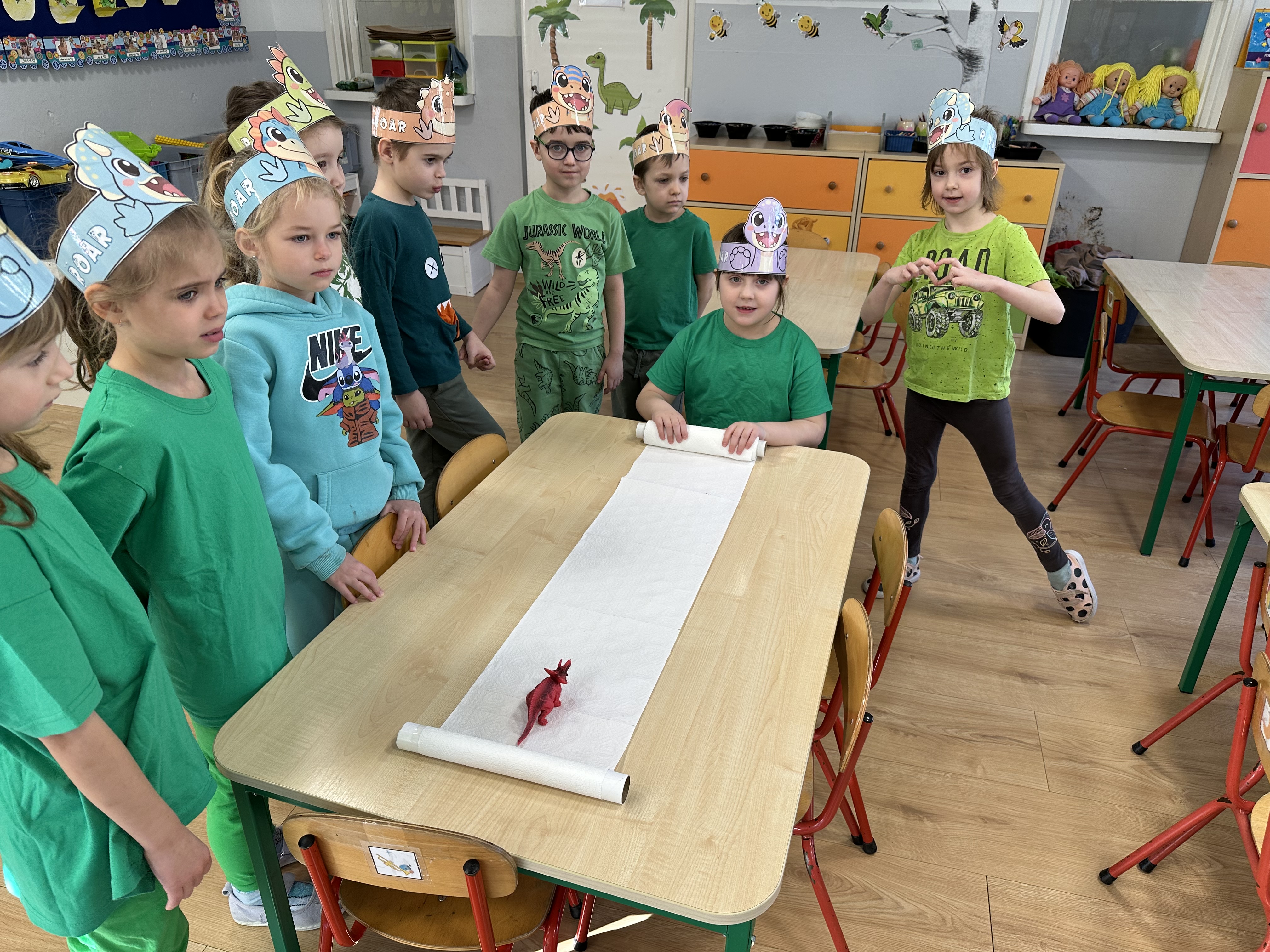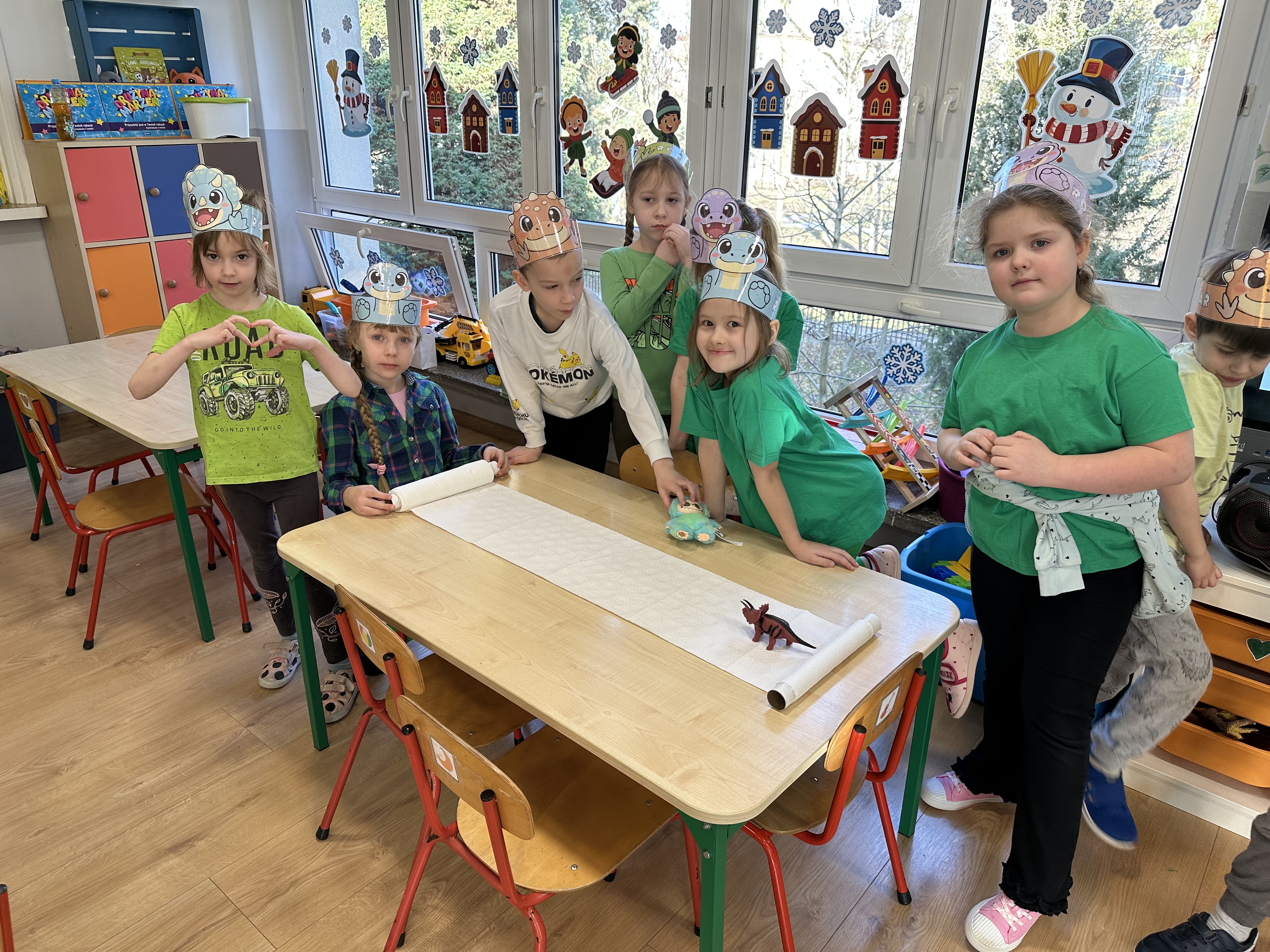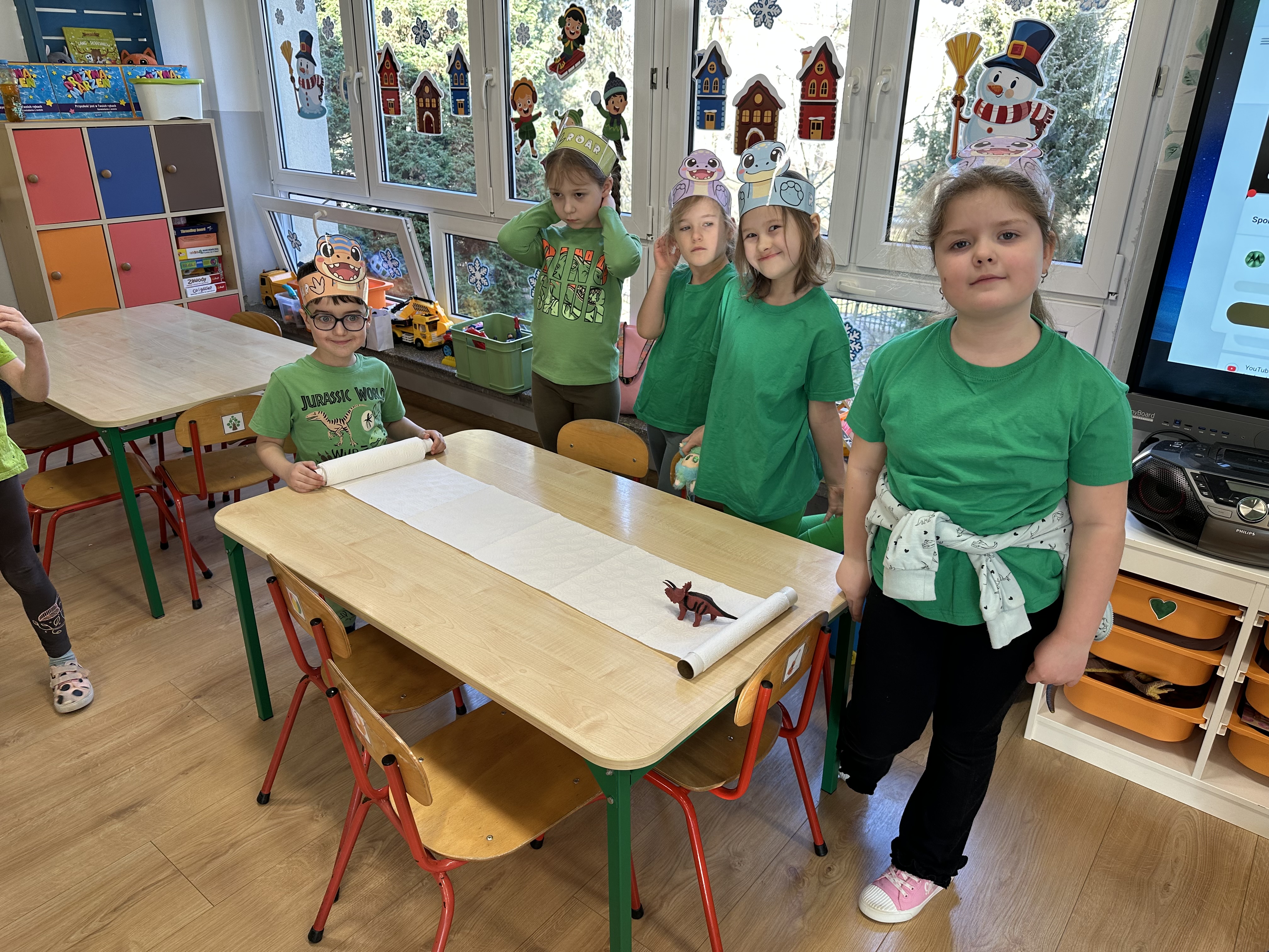 W naszej grupie odbył się Dzień Dinozaura, który dostarczył dzieciom wielu radosnych chwil oraz wzbogacił ich wiedzę o prehistorycznym świecie. Już od samego rana w sali został przygotowany kącik dinozaurów, w którym znalazły się figurki, książki oraz ilustracje przedstawiające różne gatunki tych niezwykłych stworzeń. Jedną z pierwszych aktywności była zabawa w paleontologów. Dzieci z ogromnym zaangażowaniem poszukiwały ukrytych „skamieniałości” i figurek dinozaurów, ucząc się przy tym, na czym polega praca naukowca badającego przeszłość Ziemi. Następnie wspólnie segregowały dinozaury na roślinożerne i mięsożerne, poznając ich charakterystyczne cechy oraz sposób odżywiania. Kolejnym punktem programu były „Dino-malowanki” – przestrzenna praca plastyczna, podczas której dzieci rozwijały swoją wyobraźnię i zdolności manualne. Duże zainteresowanie wzbudził również eksperyment „Wulkan”. Wykorzystując sodę i ocet, dzieci mogły zaobserwować efektowną „erupcję”, co było nie tylko świetną zabawą, ale także ciekawą lekcją przyrody. Nie zabrakło również aktywności ruchowych i gier. W „Wyścigach dinozaurów” dzieci sprawdzały, który dinozaur najszybciej dotrze do mety. Dużo emocji dostarczyła także gra „Dino droga”, w której zadaniem było bezpieczne przeprowadzenie dinozaurów przez prehistoryczny krajobraz pełen przygód i niespodzianek. Na zakończenie odbył się quiz sprawdzający wiadomości o dinozaurach. Dzieci wykazały się dużą wiedzą i zaangażowaniem. Dzień zakończył się wykonaniem pamiątkowej fotografii, która będzie miłym wspomnieniem wspólnie spędzonego czasu. Obchody Dnia Dinozaura były nie tylko okazją do świetnej zabawy, ale również do zdobywania nowych informacji i rozwijania zainteresowań przyrodniczych.