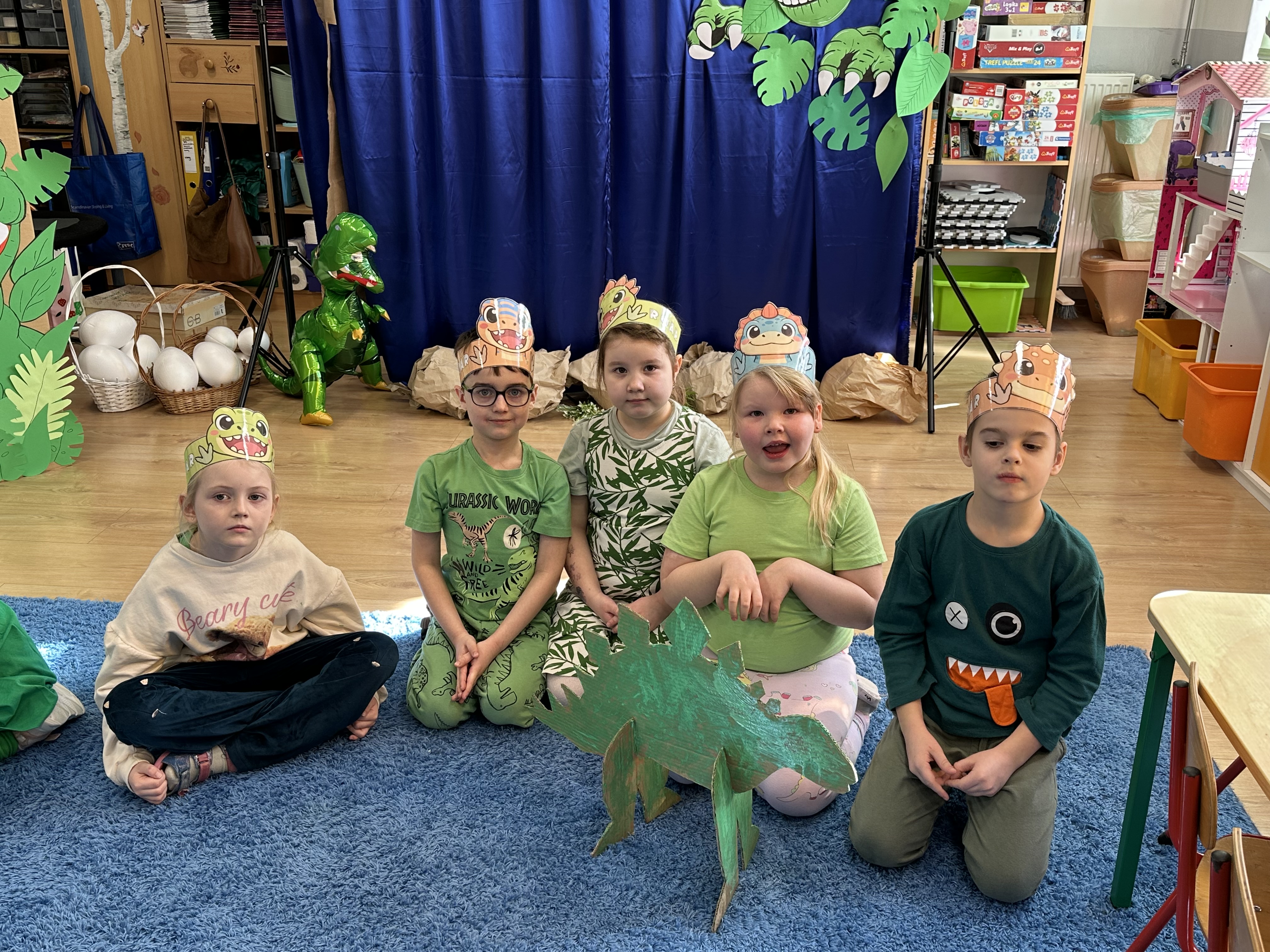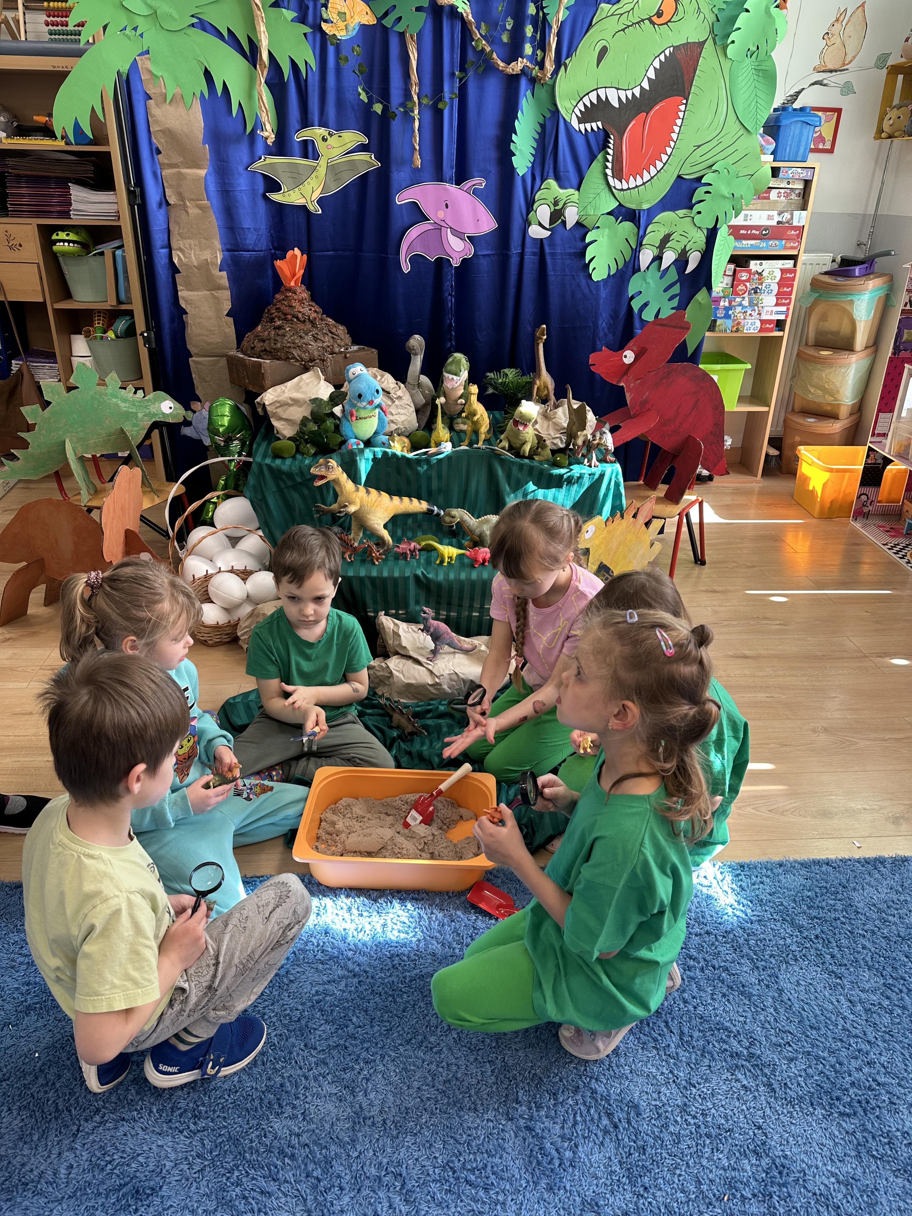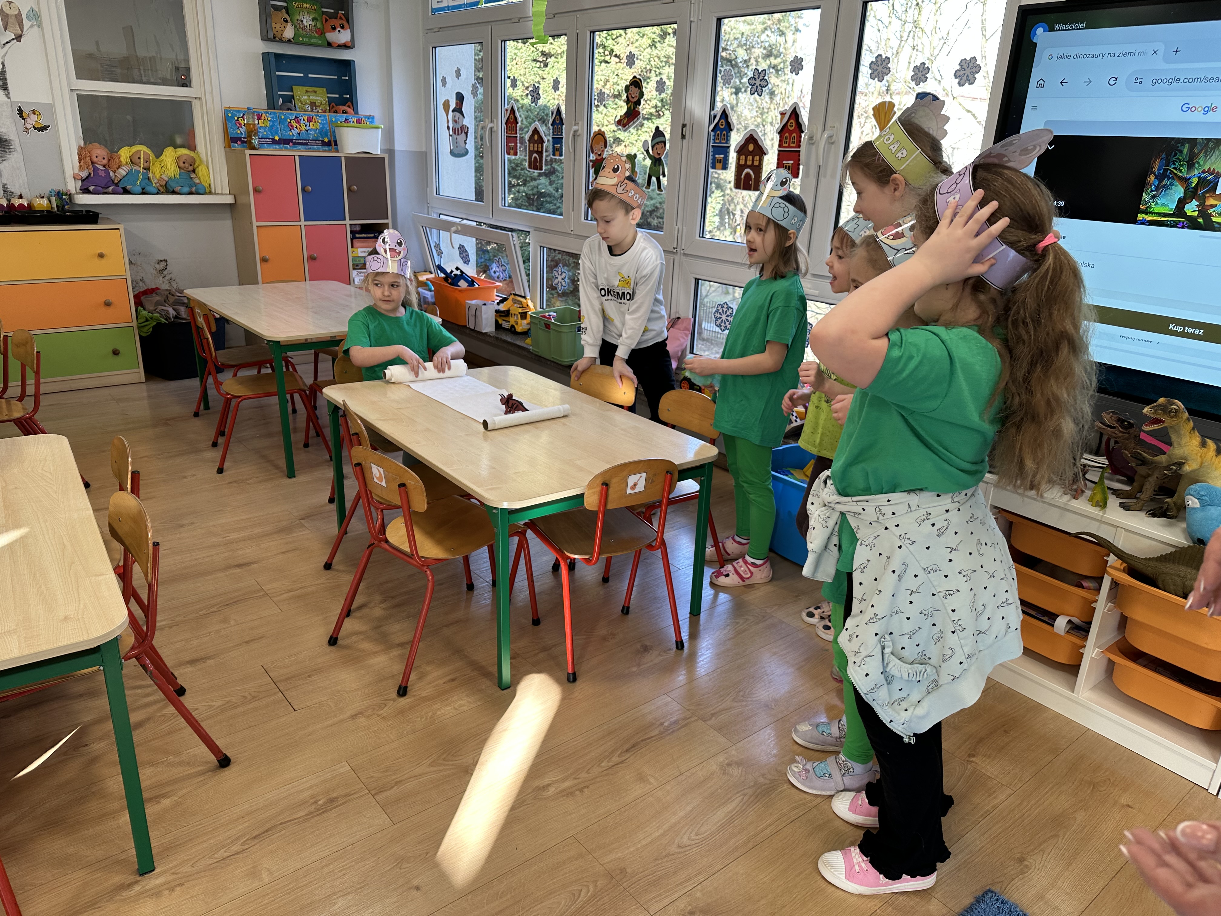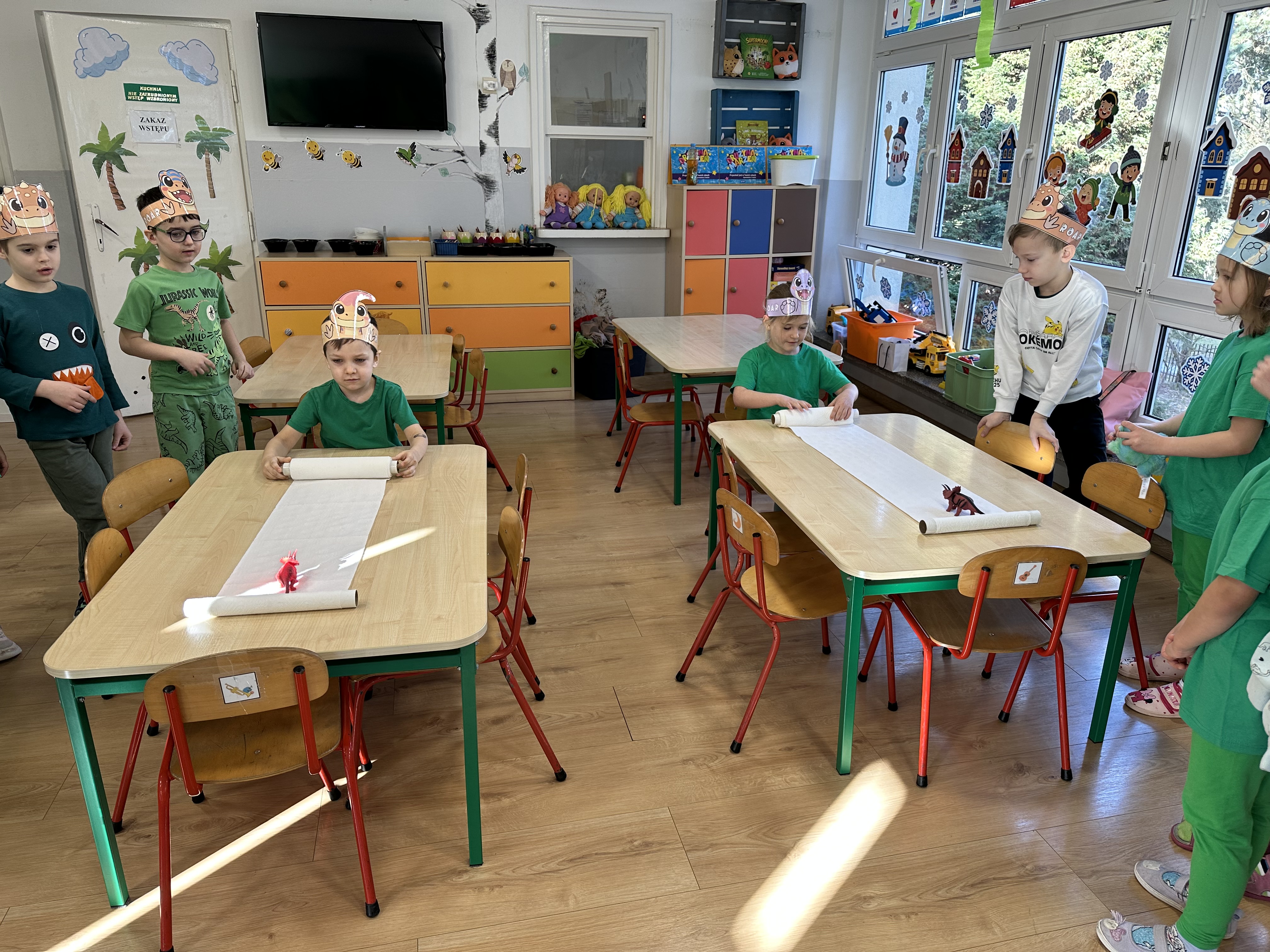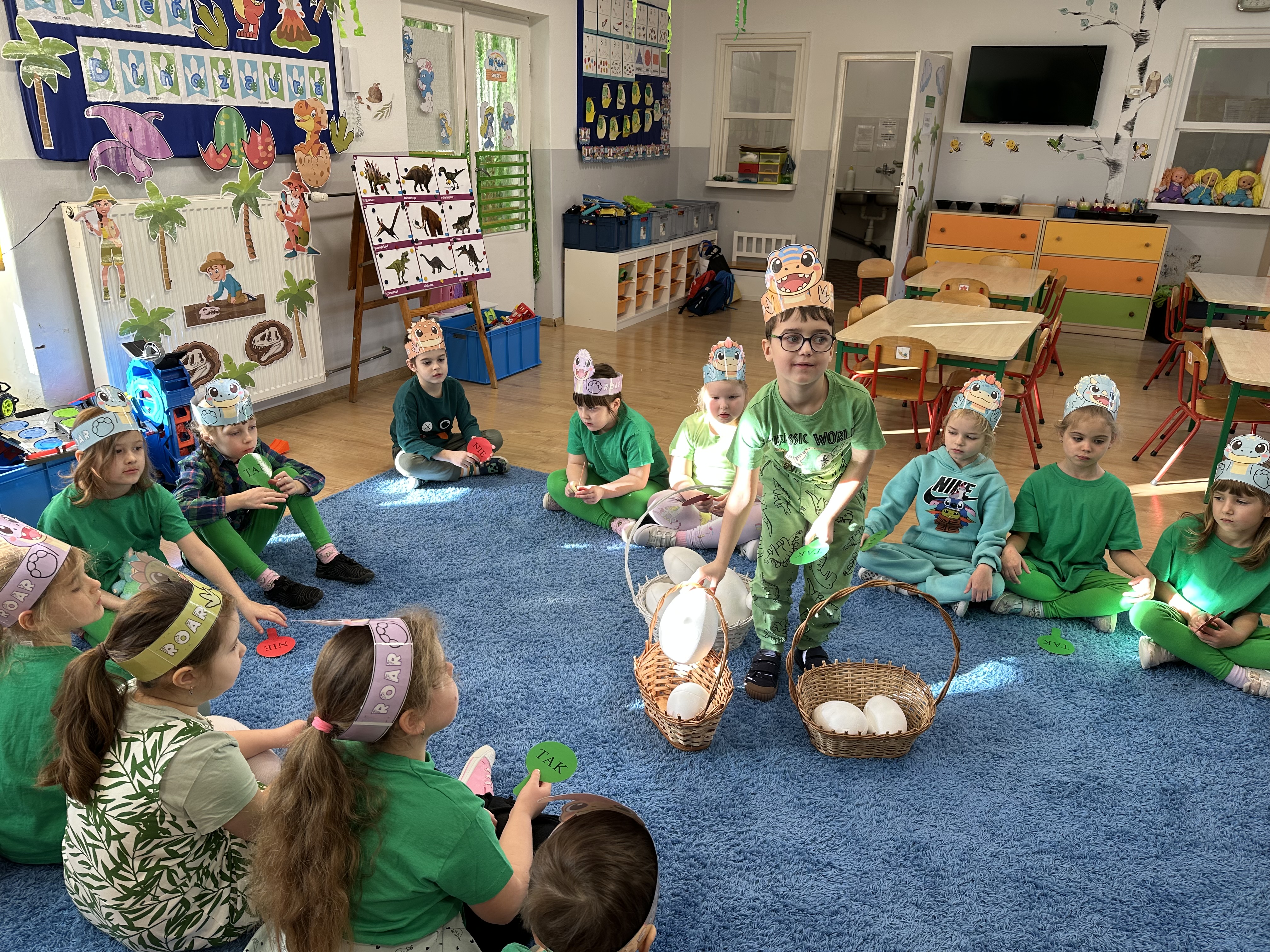 W naszej grupie odbył się Dzień Dinozaura, który dostarczył dzieciom wielu radosnych chwil oraz wzbogacił ich wiedzę o prehistorycznym świecie. Już od samego rana w sali został przygotowany kącik dinozaurów, w którym znalazły się figurki, książki oraz ilustracje przedstawiające różne gatunki tych niezwykłych stworzeń. Jedną z pierwszych aktywności była zabawa w paleontologów. Dzieci z ogromnym zaangażowaniem poszukiwały ukrytych „skamieniałości” i figurek dinozaurów, ucząc się przy tym, na czym polega praca naukowca badającego przeszłość Ziemi. Następnie wspólnie segregowały dinozaury na roślinożerne i mięsożerne, poznając ich charakterystyczne cechy oraz sposób odżywiania. Kolejnym punktem programu były „Dino-malowanki” – przestrzenna praca plastyczna, podczas której dzieci rozwijały swoją wyobraźnię i zdolności manualne. Duże zainteresowanie wzbudził również eksperyment „Wulkan”. Wykorzystując sodę i ocet, dzieci mogły zaobserwować efektowną „erupcję”, co było nie tylko świetną zabawą, ale także ciekawą lekcją przyrody. Nie zabrakło również aktywności ruchowych i gier. W „Wyścigach dinozaurów” dzieci sprawdzały, który dinozaur najszybciej dotrze do mety. Dużo emocji dostarczyła także gra „Dino droga”, w której zadaniem było bezpieczne przeprowadzenie dinozaurów przez prehistoryczny krajobraz pełen przygód i niespodzianek. Na zakończenie odbył się quiz sprawdzający wiadomości o dinozaurach. Dzieci wykazały się dużą wiedzą i zaangażowaniem. Dzień zakończył się wykonaniem pamiątkowej fotografii, która będzie miłym wspomnieniem wspólnie spędzonego czasu. Obchody Dnia Dinozaura były nie tylko okazją do świetnej zabawy, ale również do zdobywania nowych informacji i rozwijania zainteresowań przyrodniczych.