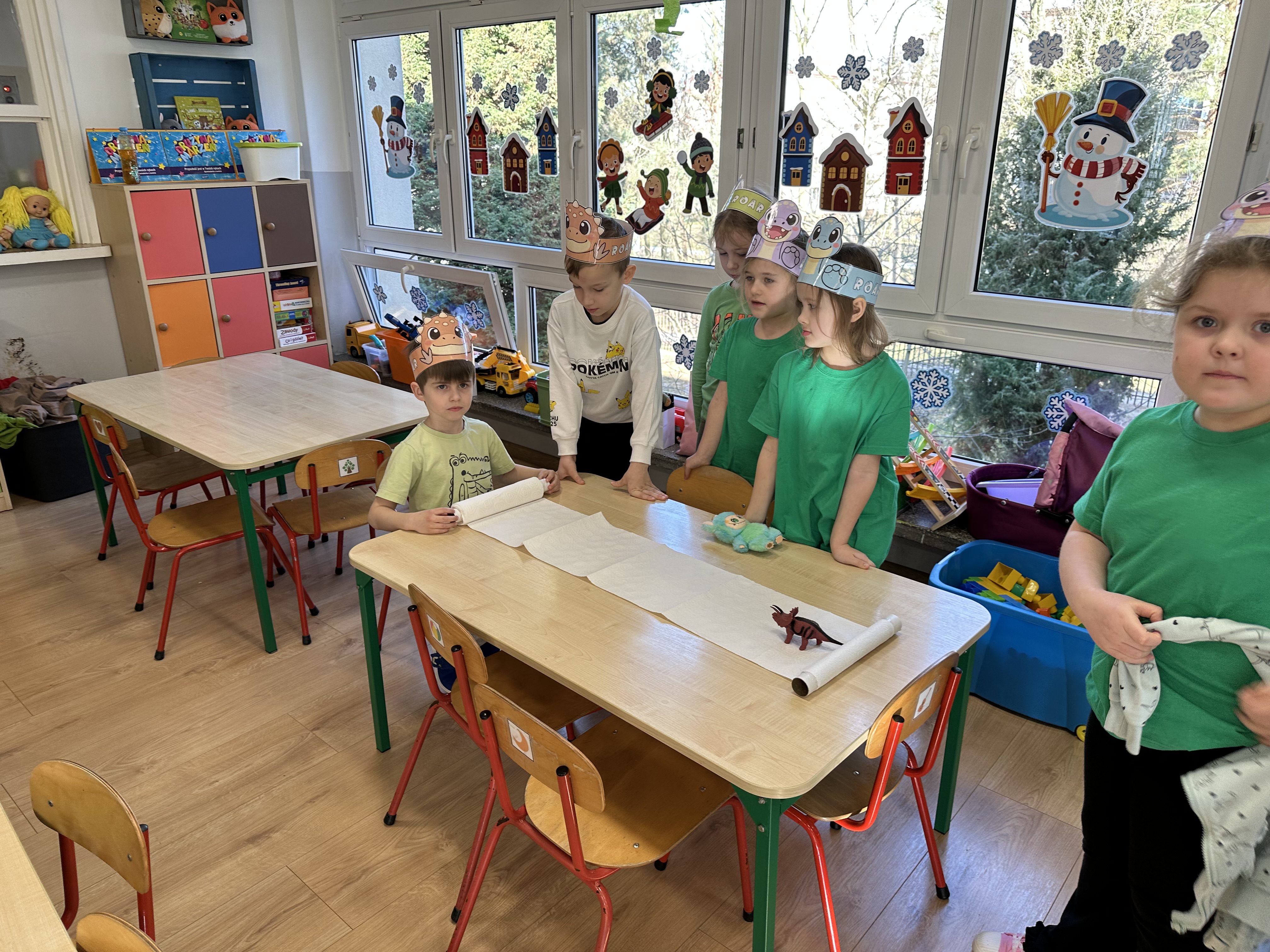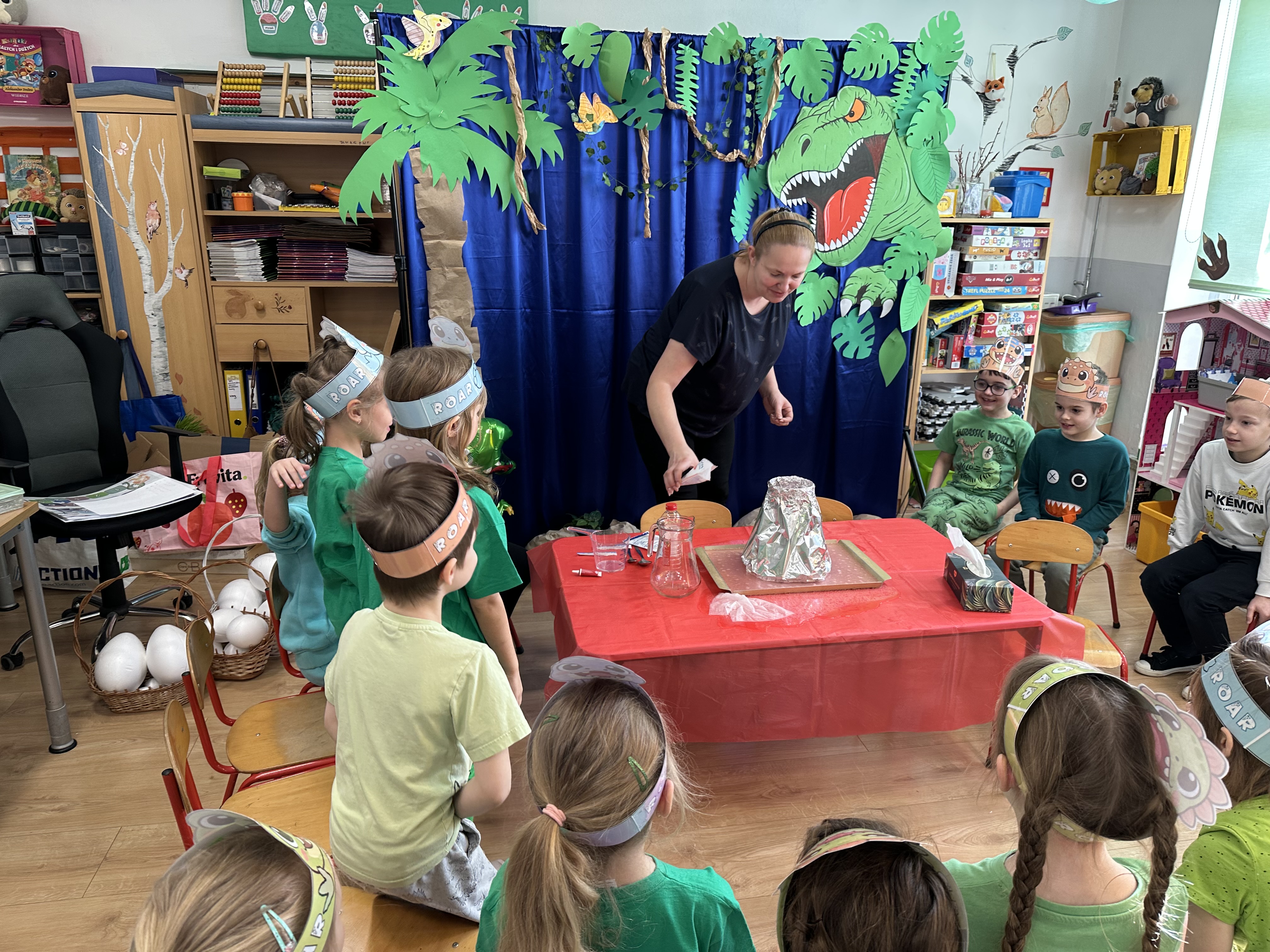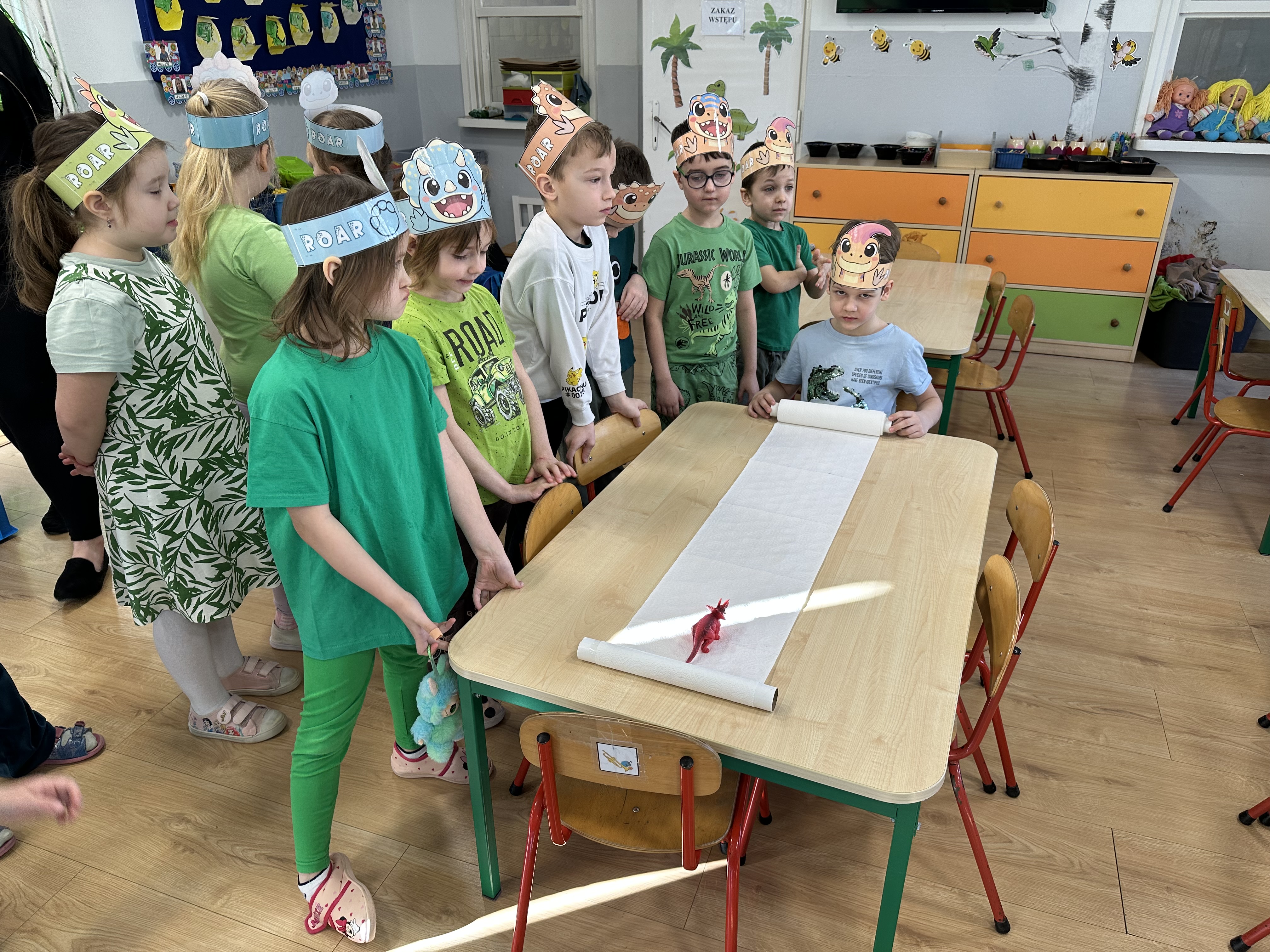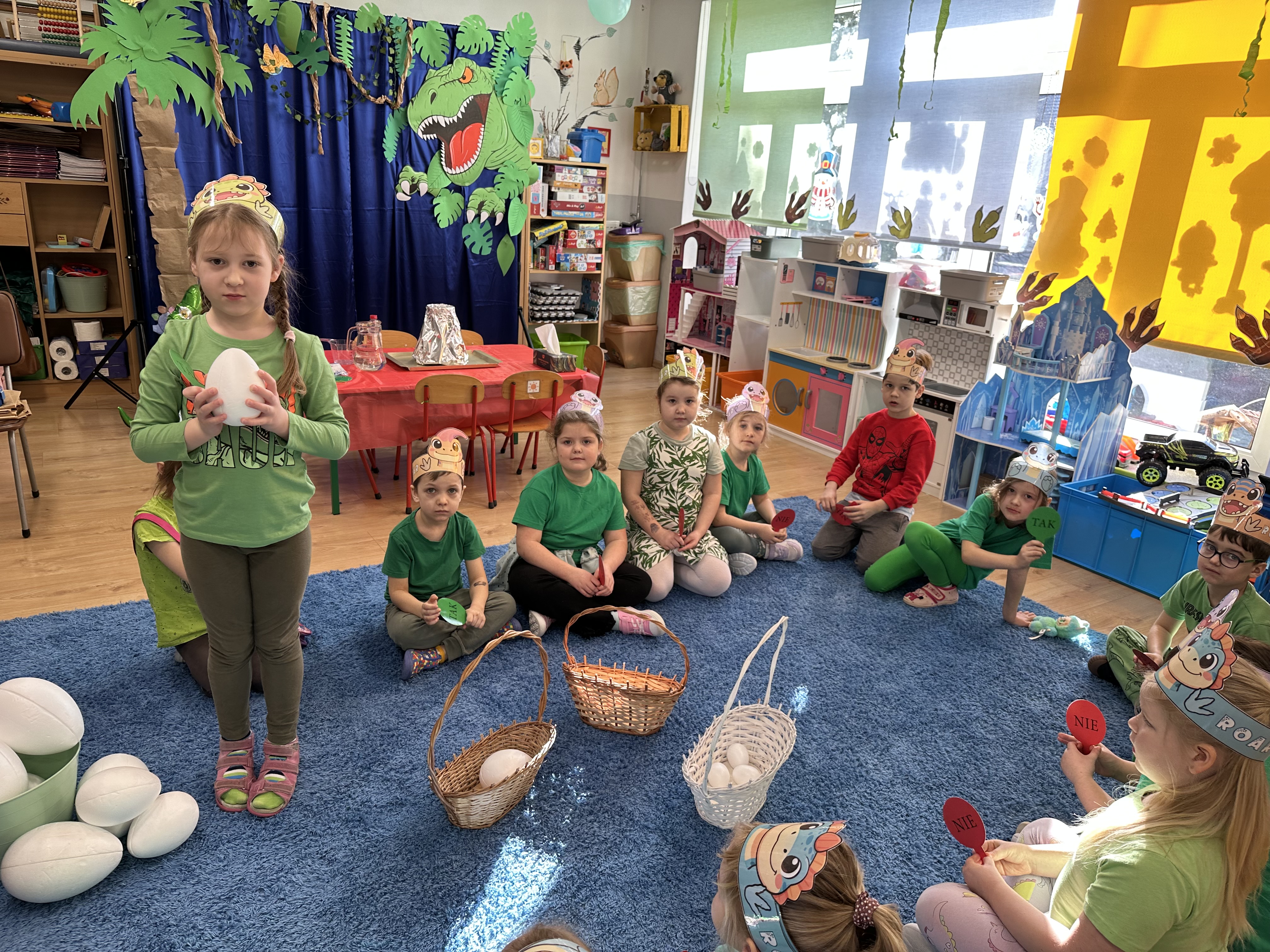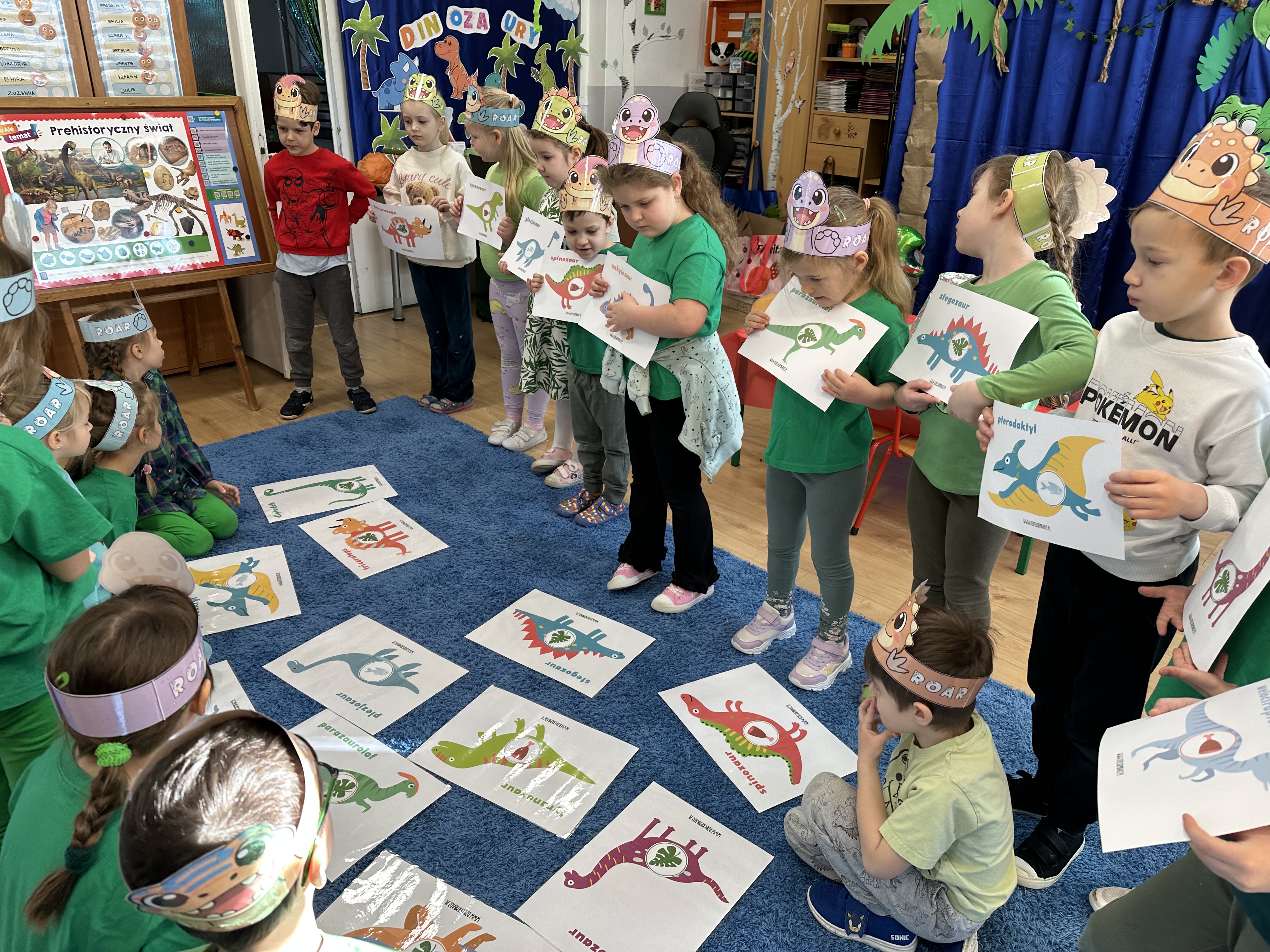 W naszej grupie odbył się Dzień Dinozaura, który dostarczył dzieciom wielu radosnych chwil oraz wzbogacił ich wiedzę o prehistorycznym świecie. Już od samego rana w sali został przygotowany kącik dinozaurów, w którym znalazły się figurki, książki oraz ilustracje przedstawiające różne gatunki tych niezwykłych stworzeń. Jedną z pierwszych aktywności była zabawa w paleontologów. Dzieci z ogromnym zaangażowaniem poszukiwały ukrytych „skamieniałości” i figurek dinozaurów, ucząc się przy tym, na czym polega praca naukowca badającego przeszłość Ziemi. Następnie wspólnie segregowały dinozaury na roślinożerne i mięsożerne, poznając ich charakterystyczne cechy oraz sposób odżywiania. Kolejnym punktem programu były „Dino-malowanki” – przestrzenna praca plastyczna, podczas której dzieci rozwijały swoją wyobraźnię i zdolności manualne. Duże zainteresowanie wzbudził również eksperyment „Wulkan”. Wykorzystując sodę i ocet, dzieci mogły zaobserwować efektowną „erupcję”, co było nie tylko świetną zabawą, ale także ciekawą lekcją przyrody. Nie zabrakło również aktywności ruchowych i gier. W „Wyścigach dinozaurów” dzieci sprawdzały, który dinozaur najszybciej dotrze do mety. Dużo emocji dostarczyła także gra „Dino droga”, w której zadaniem było bezpieczne przeprowadzenie dinozaurów przez prehistoryczny krajobraz pełen przygód i niespodzianek. Na zakończenie odbył się quiz sprawdzający wiadomości o dinozaurach. Dzieci wykazały się dużą wiedzą i zaangażowaniem. Dzień zakończył się wykonaniem pamiątkowej fotografii, która będzie miłym wspomnieniem wspólnie spędzonego czasu. Obchody Dnia Dinozaura były nie tylko okazją do świetnej zabawy, ale również do zdobywania nowych informacji i rozwijania zainteresowań przyrodniczych.