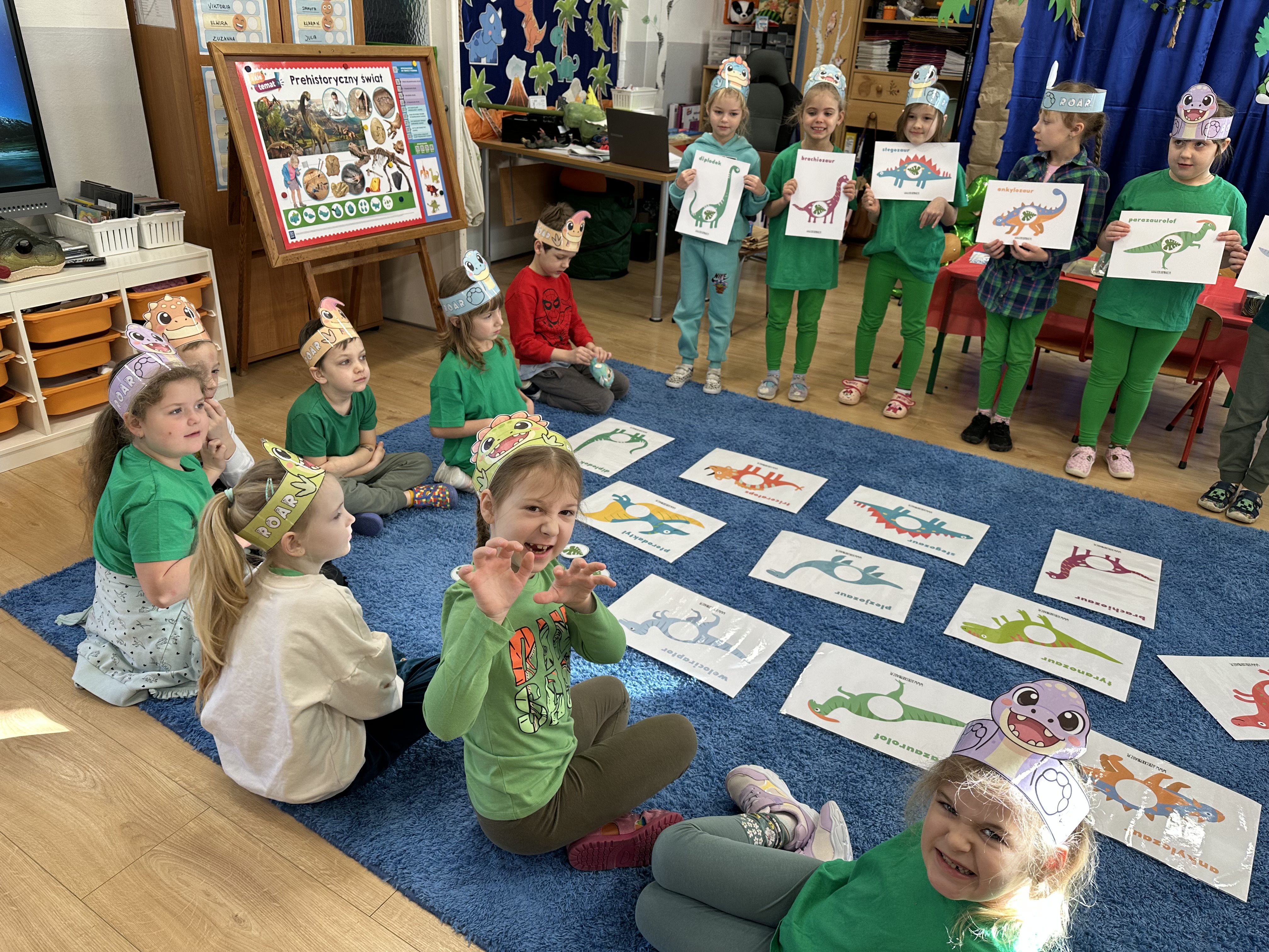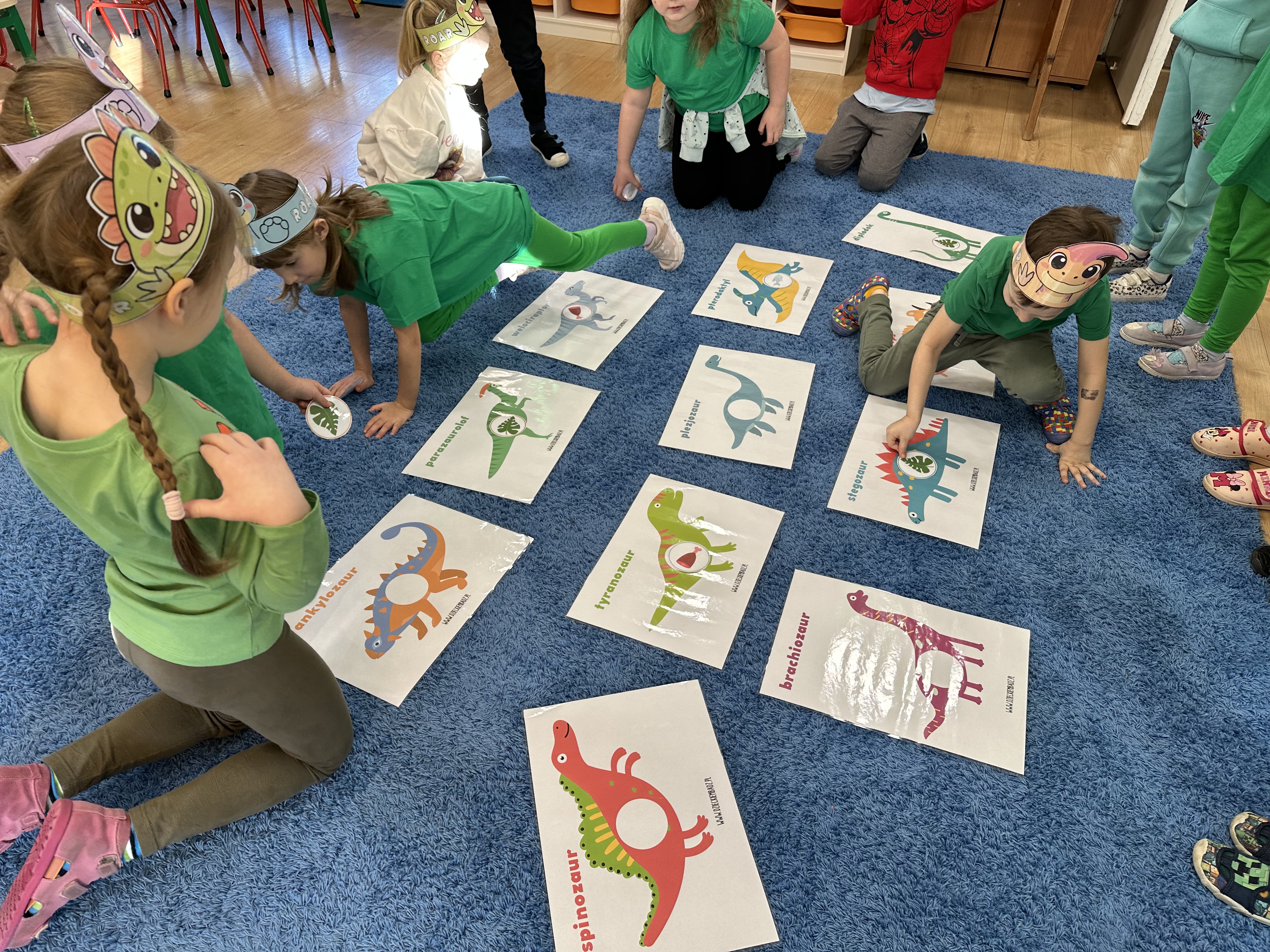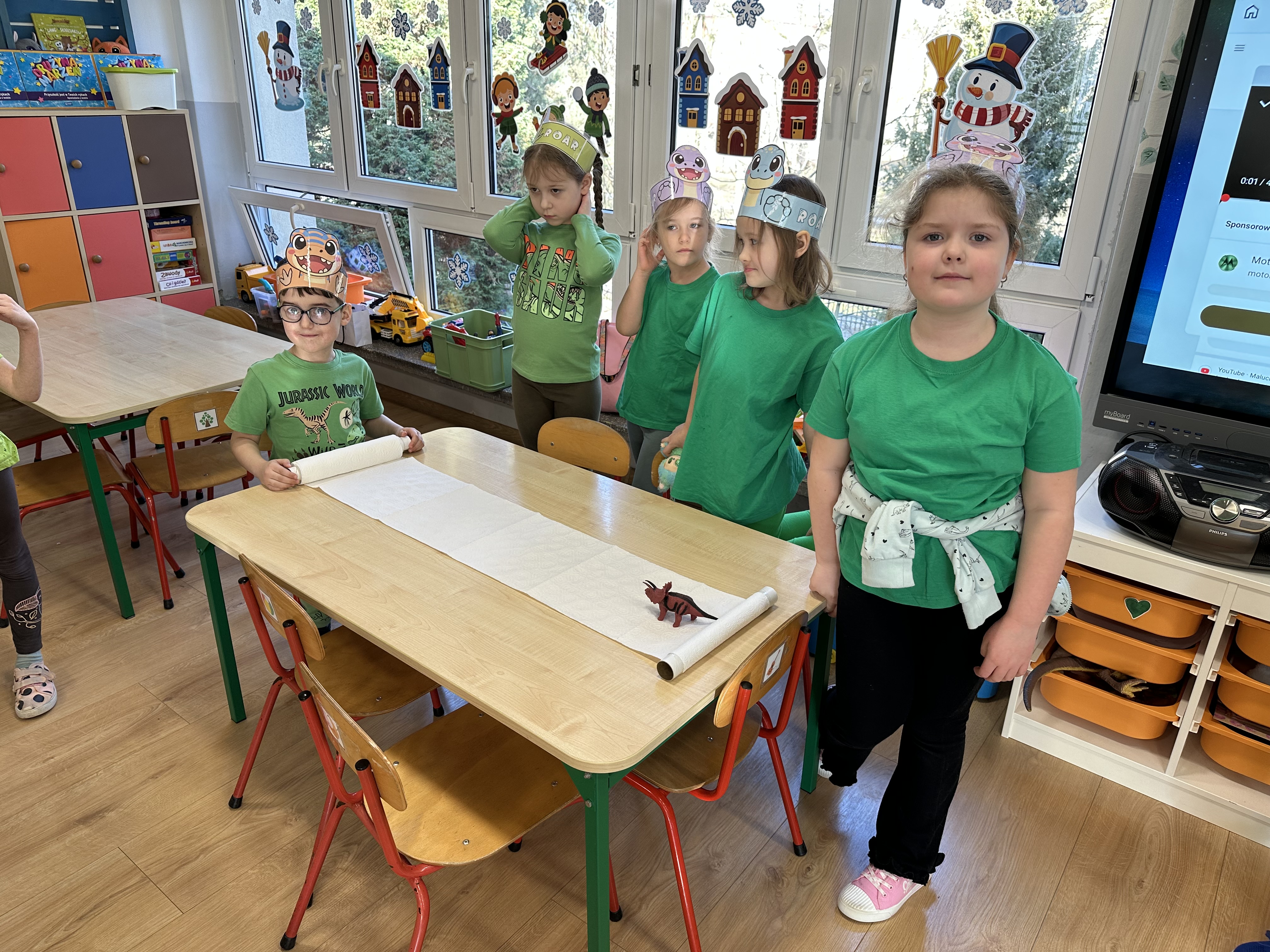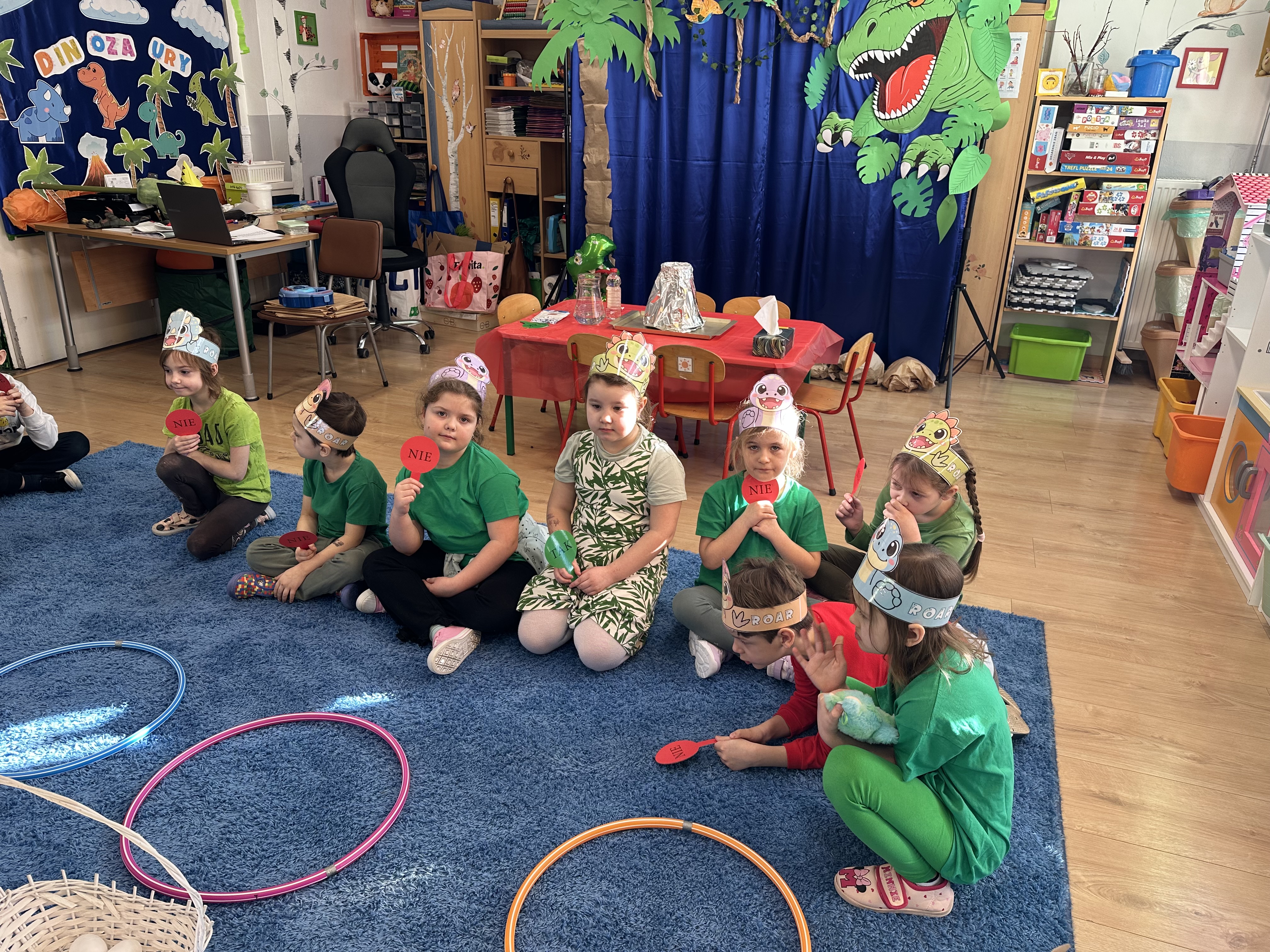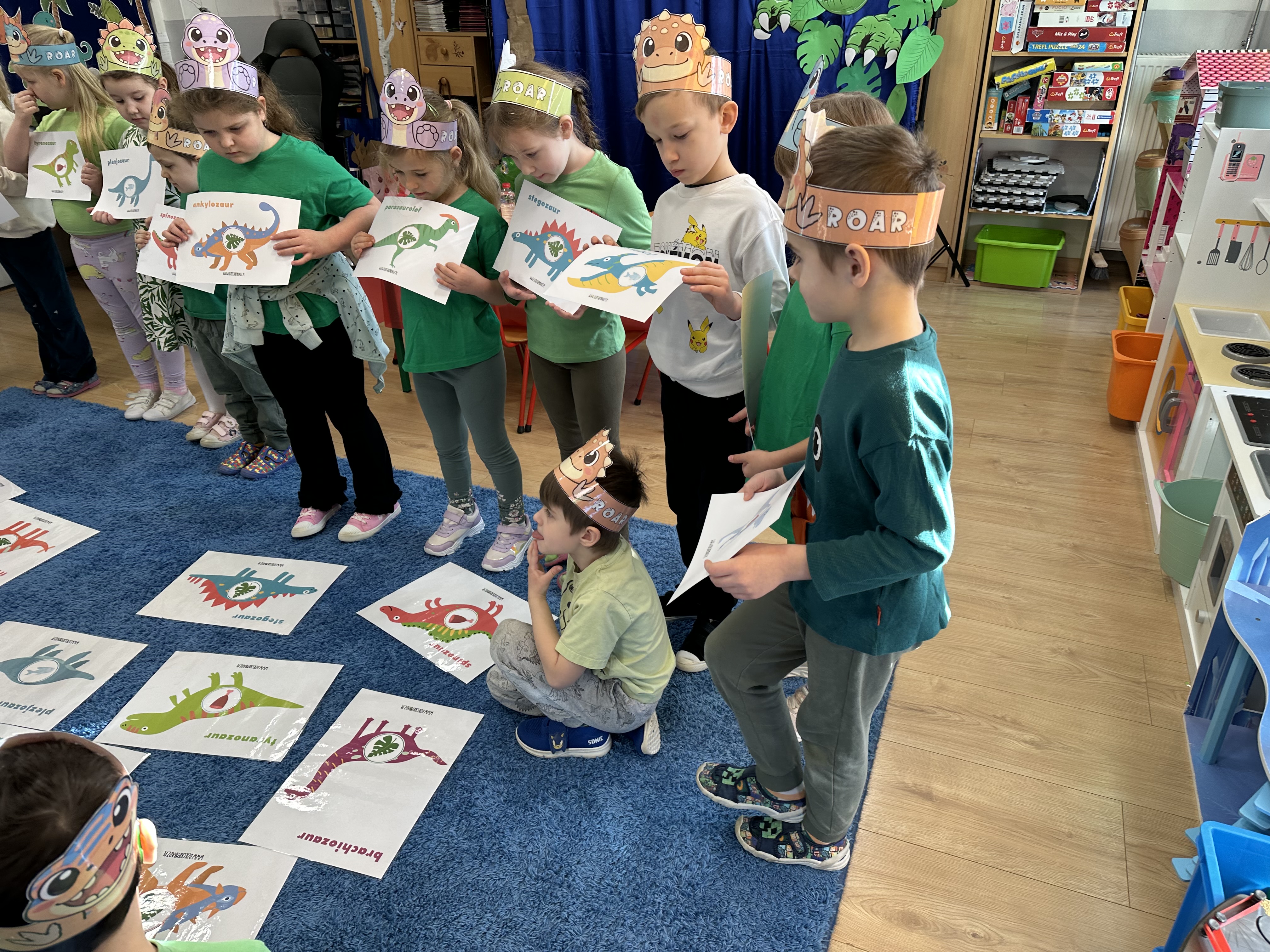 W naszej grupie odbył się Dzień Dinozaura, który dostarczył dzieciom wielu radosnych chwil oraz wzbogacił ich wiedzę o prehistorycznym świecie. Już od samego rana w sali został przygotowany kącik dinozaurów, w którym znalazły się figurki, książki oraz ilustracje przedstawiające różne gatunki tych niezwykłych stworzeń. Jedną z pierwszych aktywności była zabawa w paleontologów. Dzieci z ogromnym zaangażowaniem poszukiwały ukrytych „skamieniałości” i figurek dinozaurów, ucząc się przy tym, na czym polega praca naukowca badającego przeszłość Ziemi. Następnie wspólnie segregowały dinozaury na roślinożerne i mięsożerne, poznając ich charakterystyczne cechy oraz sposób odżywiania. Kolejnym punktem programu były „Dino-malowanki” – przestrzenna praca plastyczna, podczas której dzieci rozwijały swoją wyobraźnię i zdolności manualne. Duże zainteresowanie wzbudził również eksperyment „Wulkan”. Wykorzystując sodę i ocet, dzieci mogły zaobserwować efektowną „erupcję”, co było nie tylko świetną zabawą, ale także ciekawą lekcją przyrody. Nie zabrakło również aktywności ruchowych i gier. W „Wyścigach dinozaurów” dzieci sprawdzały, który dinozaur najszybciej dotrze do mety. Dużo emocji dostarczyła także gra „Dino droga”, w której zadaniem było bezpieczne przeprowadzenie dinozaurów przez prehistoryczny krajobraz pełen przygód i niespodzianek. Na zakończenie odbył się quiz sprawdzający wiadomości o dinozaurach. Dzieci wykazały się dużą wiedzą i zaangażowaniem. Dzień zakończył się wykonaniem pamiątkowej fotografii, która będzie miłym wspomnieniem wspólnie spędzonego czasu. Obchody Dnia Dinozaura były nie tylko okazją do świetnej zabawy, ale również do zdobywania nowych informacji i rozwijania zainteresowań przyrodniczych.