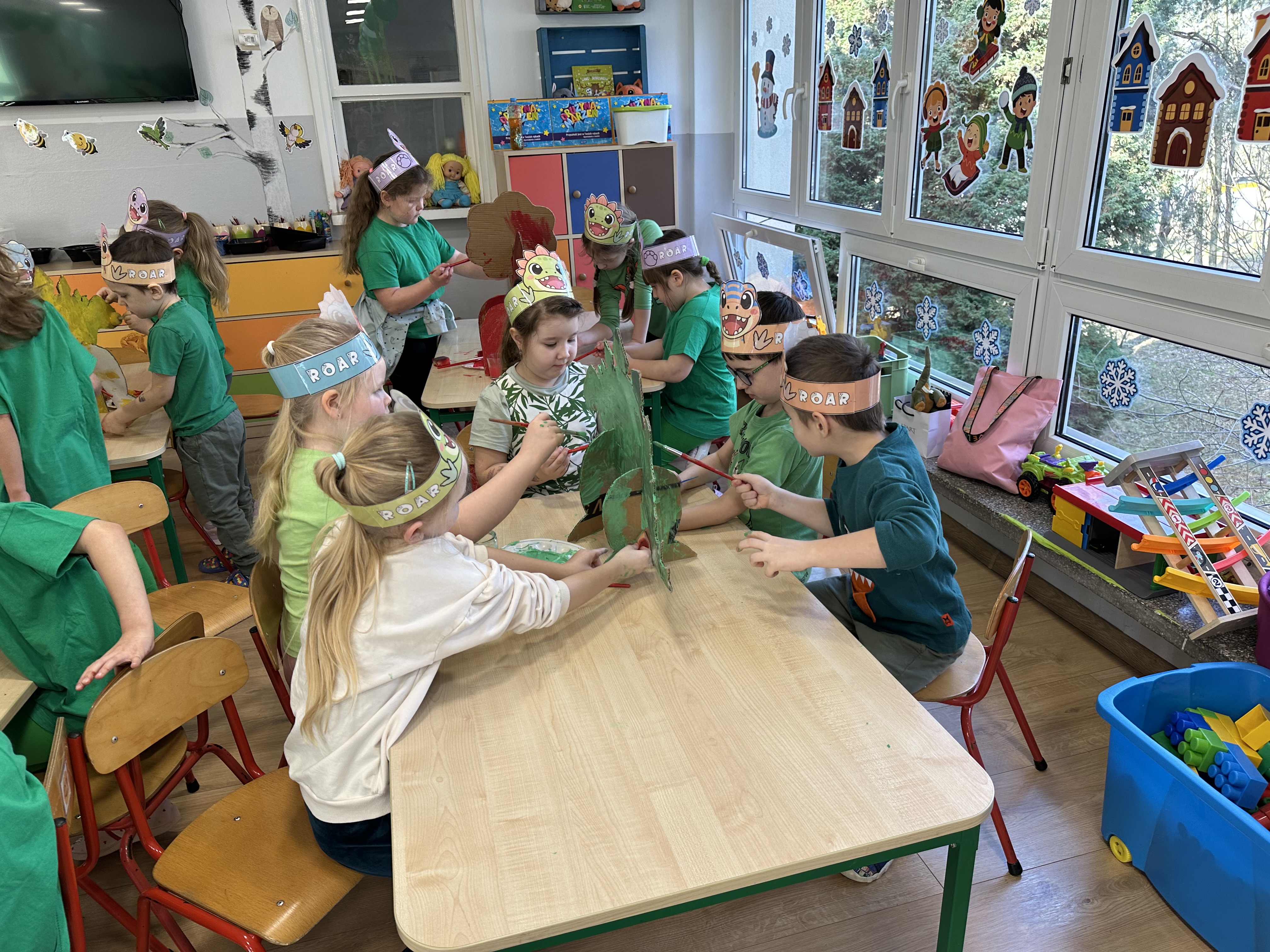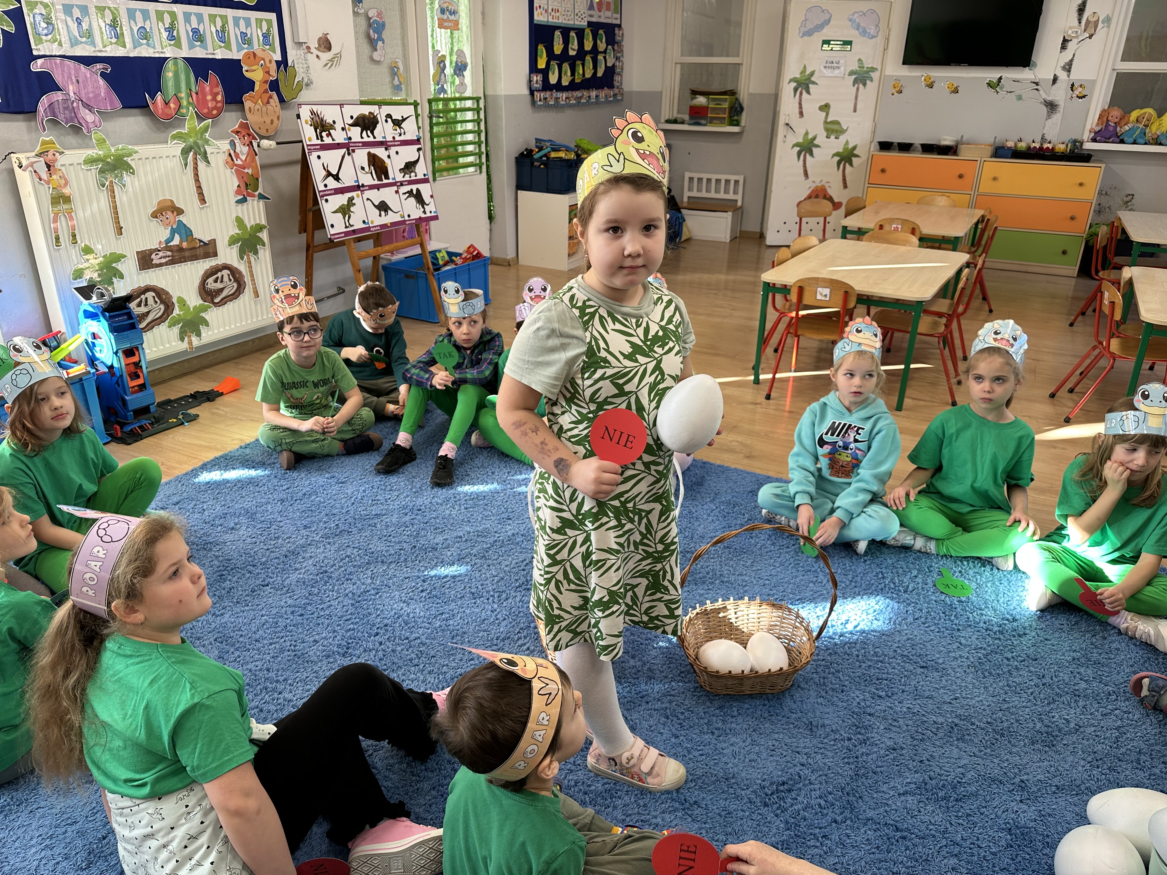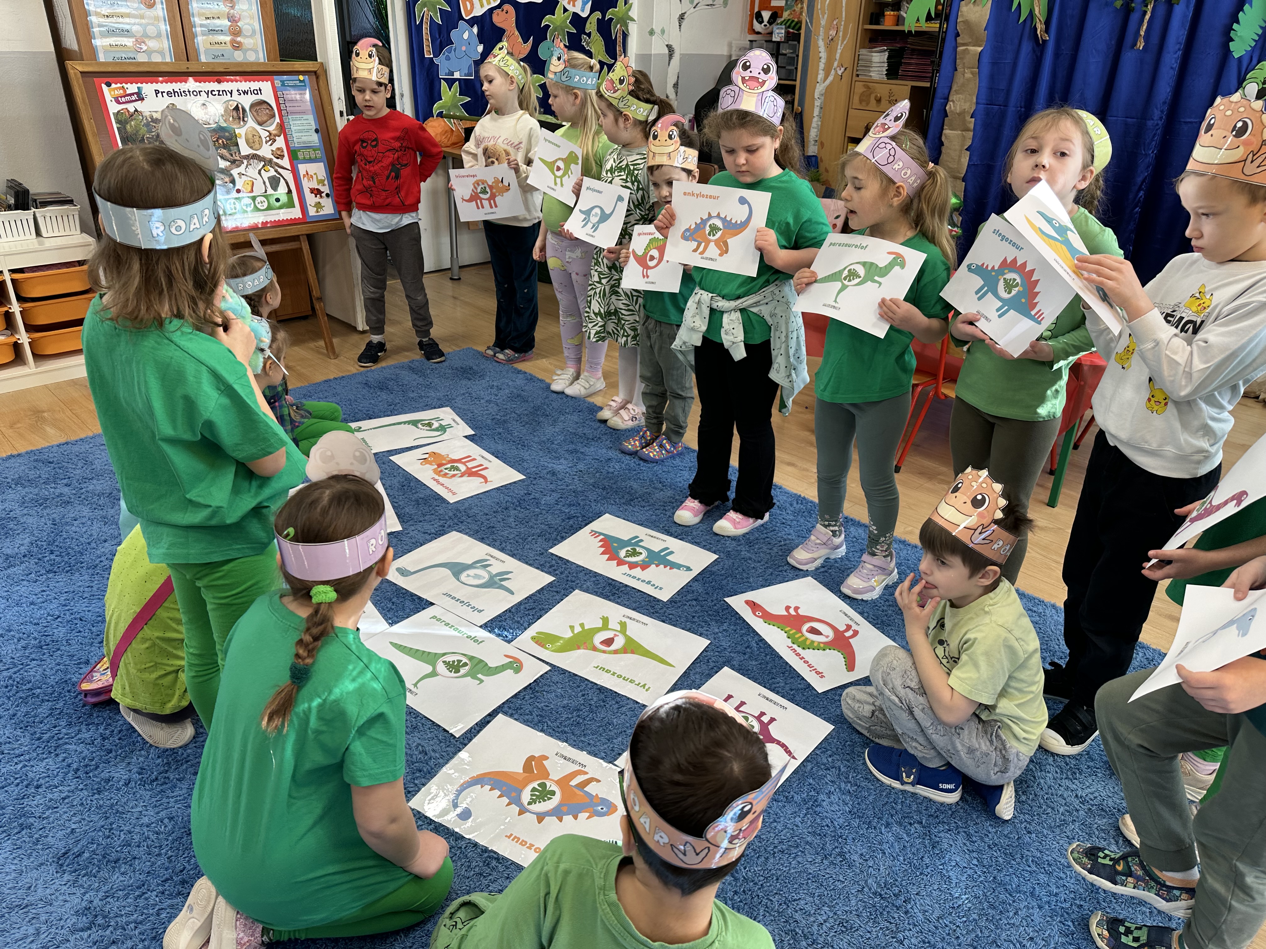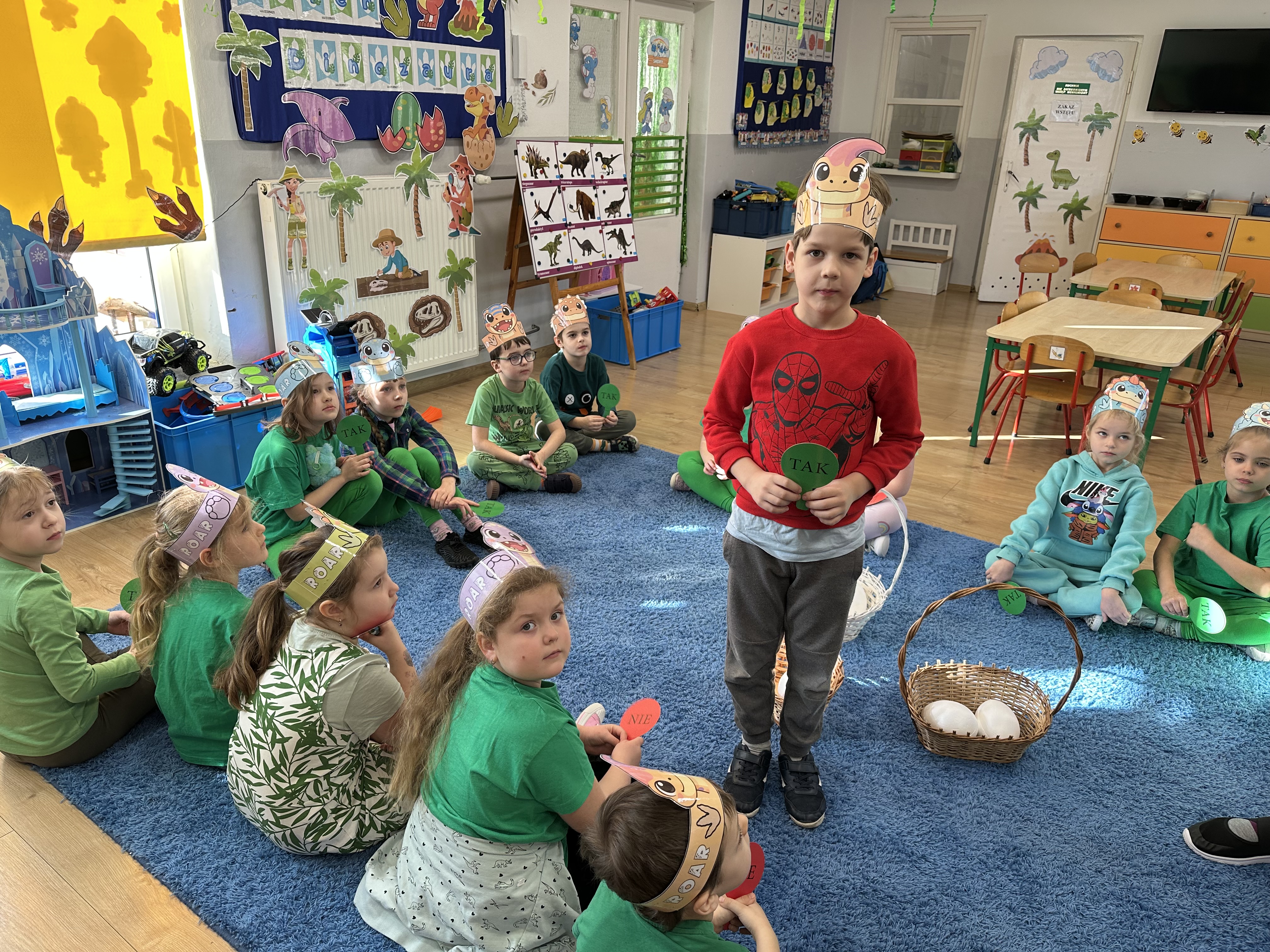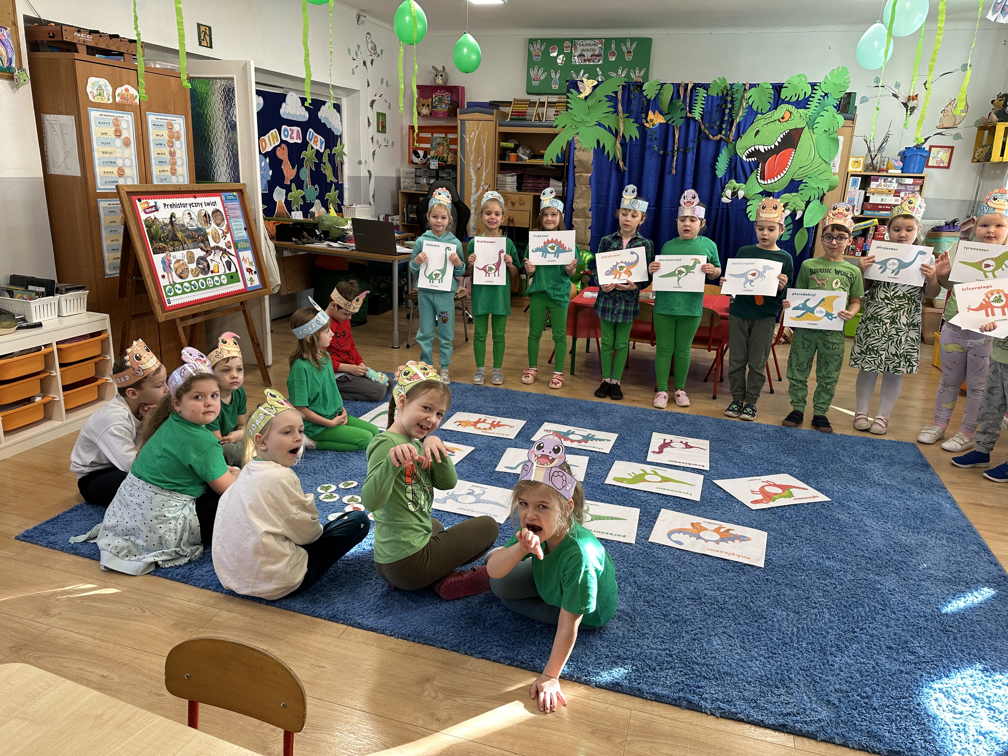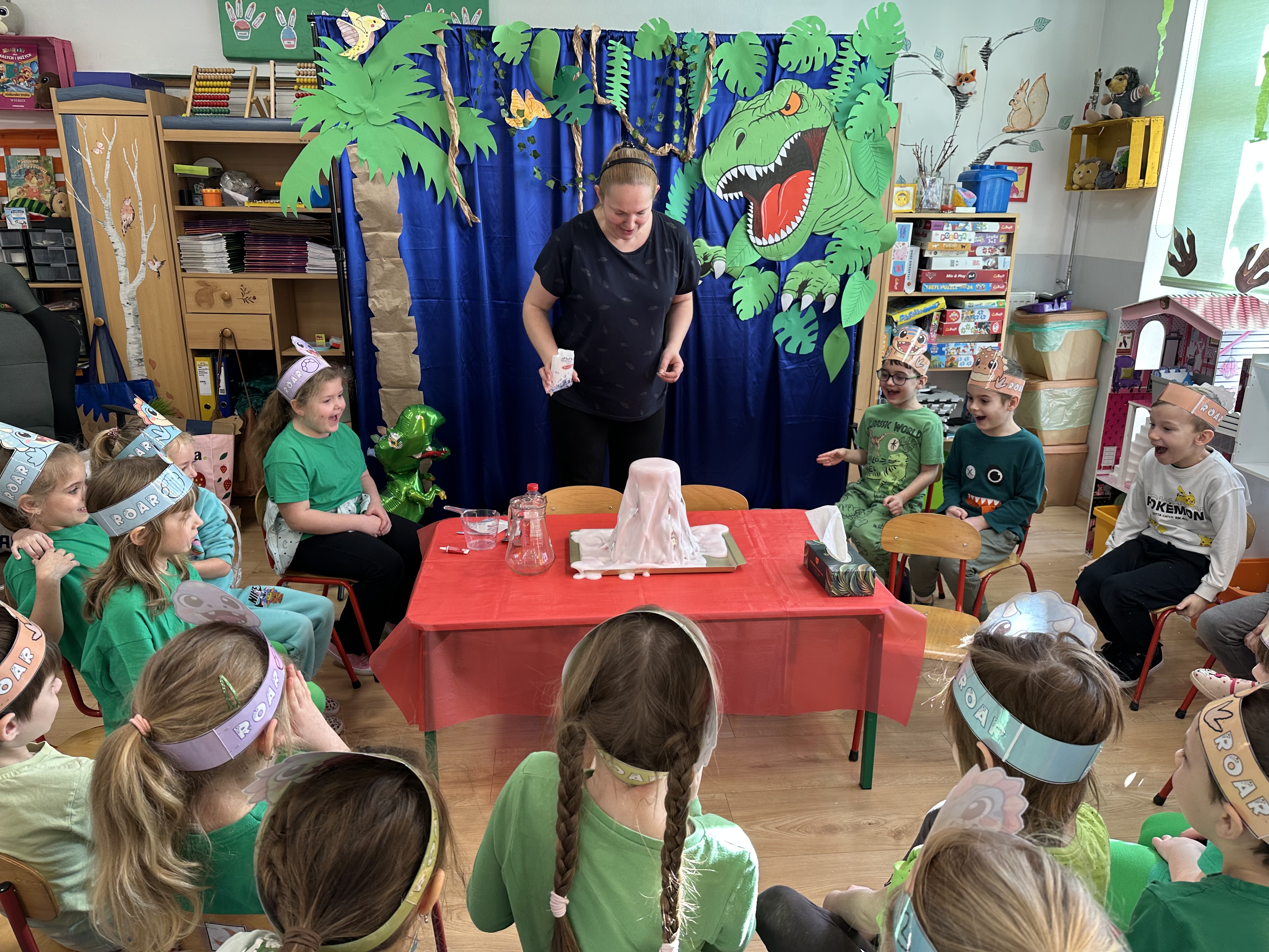 W naszej grupie odbył się Dzień Dinozaura, który dostarczył dzieciom wielu radosnych chwil oraz wzbogacił ich wiedzę o prehistorycznym świecie. Już od samego rana w sali został przygotowany kącik dinozaurów, w którym znalazły się figurki, książki oraz ilustracje przedstawiające różne gatunki tych niezwykłych stworzeń. Jedną z pierwszych aktywności była zabawa w paleontologów. Dzieci z ogromnym zaangażowaniem poszukiwały ukrytych „skamieniałości” i figurek dinozaurów, ucząc się przy tym, na czym polega praca naukowca badającego przeszłość Ziemi. Następnie wspólnie segregowały dinozaury na roślinożerne i mięsożerne, poznając ich charakterystyczne cechy oraz sposób odżywiania. Kolejnym punktem programu były „Dino-malowanki” – przestrzenna praca plastyczna, podczas której dzieci rozwijały swoją wyobraźnię i zdolności manualne. Duże zainteresowanie wzbudził również eksperyment „Wulkan”. Wykorzystując sodę i ocet, dzieci mogły zaobserwować efektowną „erupcję”, co było nie tylko świetną zabawą, ale także ciekawą lekcją przyrody. Nie zabrakło również aktywności ruchowych i gier. W „Wyścigach dinozaurów” dzieci sprawdzały, który dinozaur najszybciej dotrze do mety. Dużo emocji dostarczyła także gra „Dino droga”, w której zadaniem było bezpieczne przeprowadzenie dinozaurów przez prehistoryczny krajobraz pełen przygód i niespodzianek. Na zakończenie odbył się quiz sprawdzający wiadomości o dinozaurach. Dzieci wykazały się dużą wiedzą i zaangażowaniem. Dzień zakończył się wykonaniem pamiątkowej fotografii, która będzie miłym wspomnieniem wspólnie spędzonego czasu. Obchody Dnia Dinozaura były nie tylko okazją do świetnej zabawy, ale również do zdobywania nowych informacji i rozwijania zainteresowań przyrodniczych.