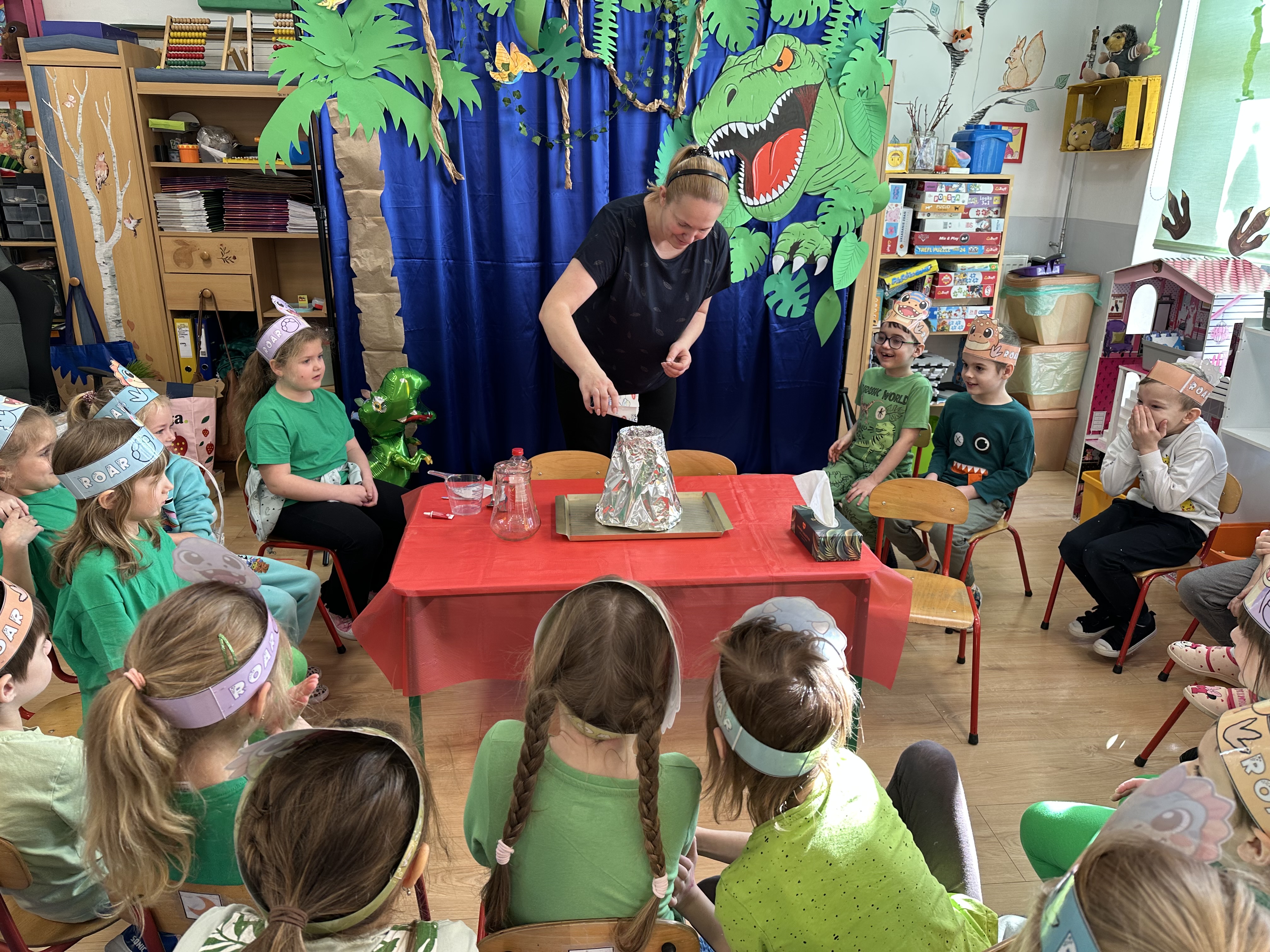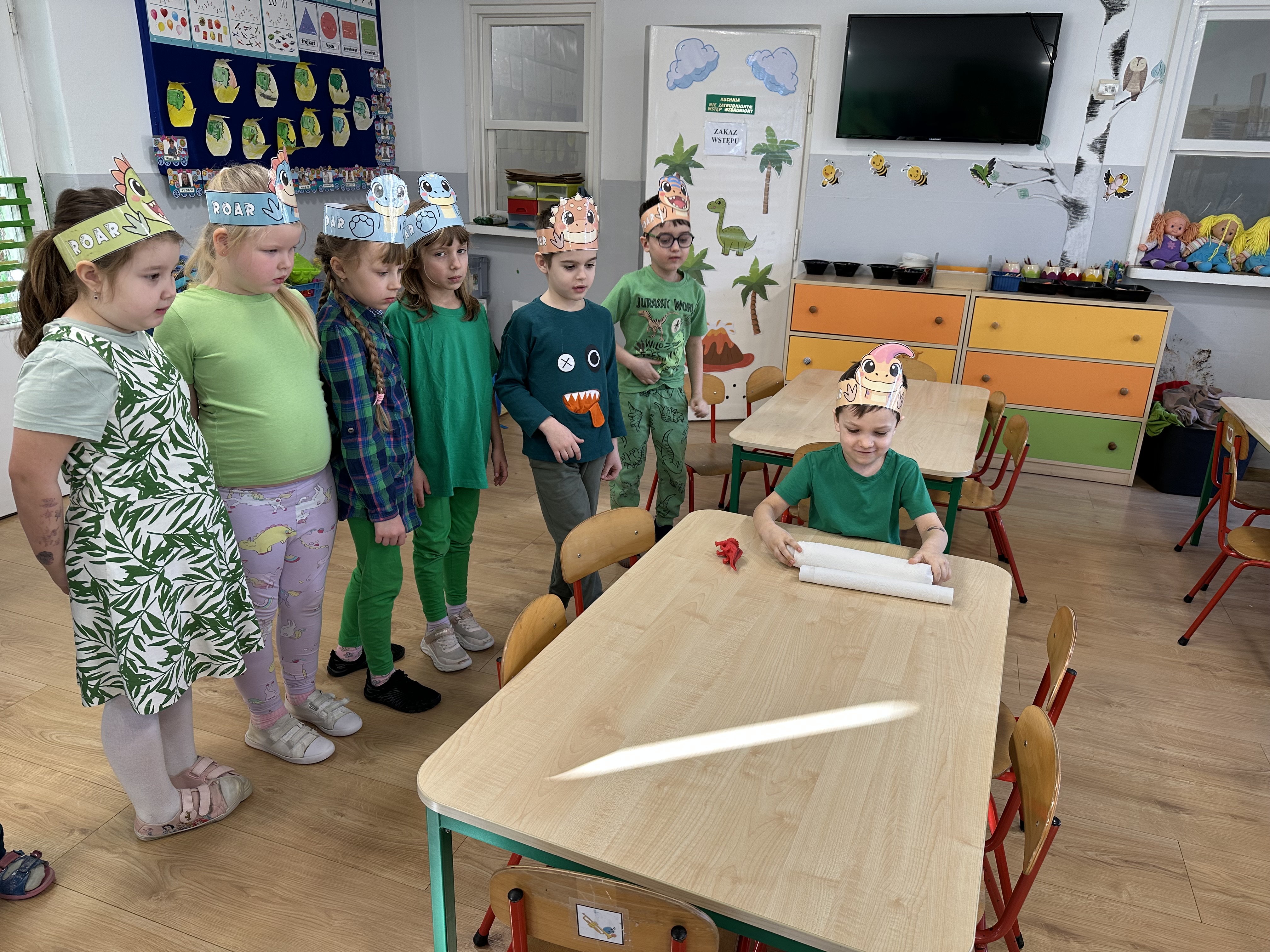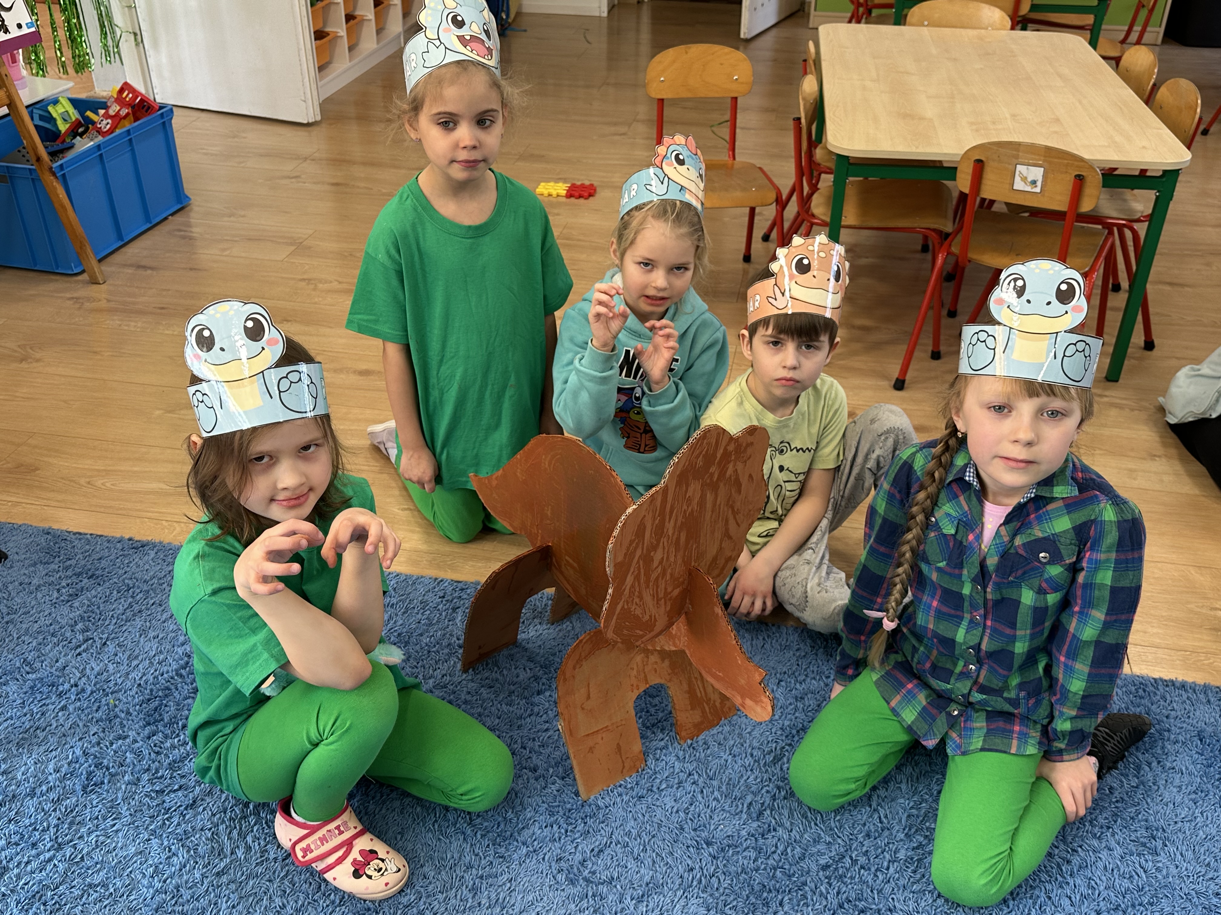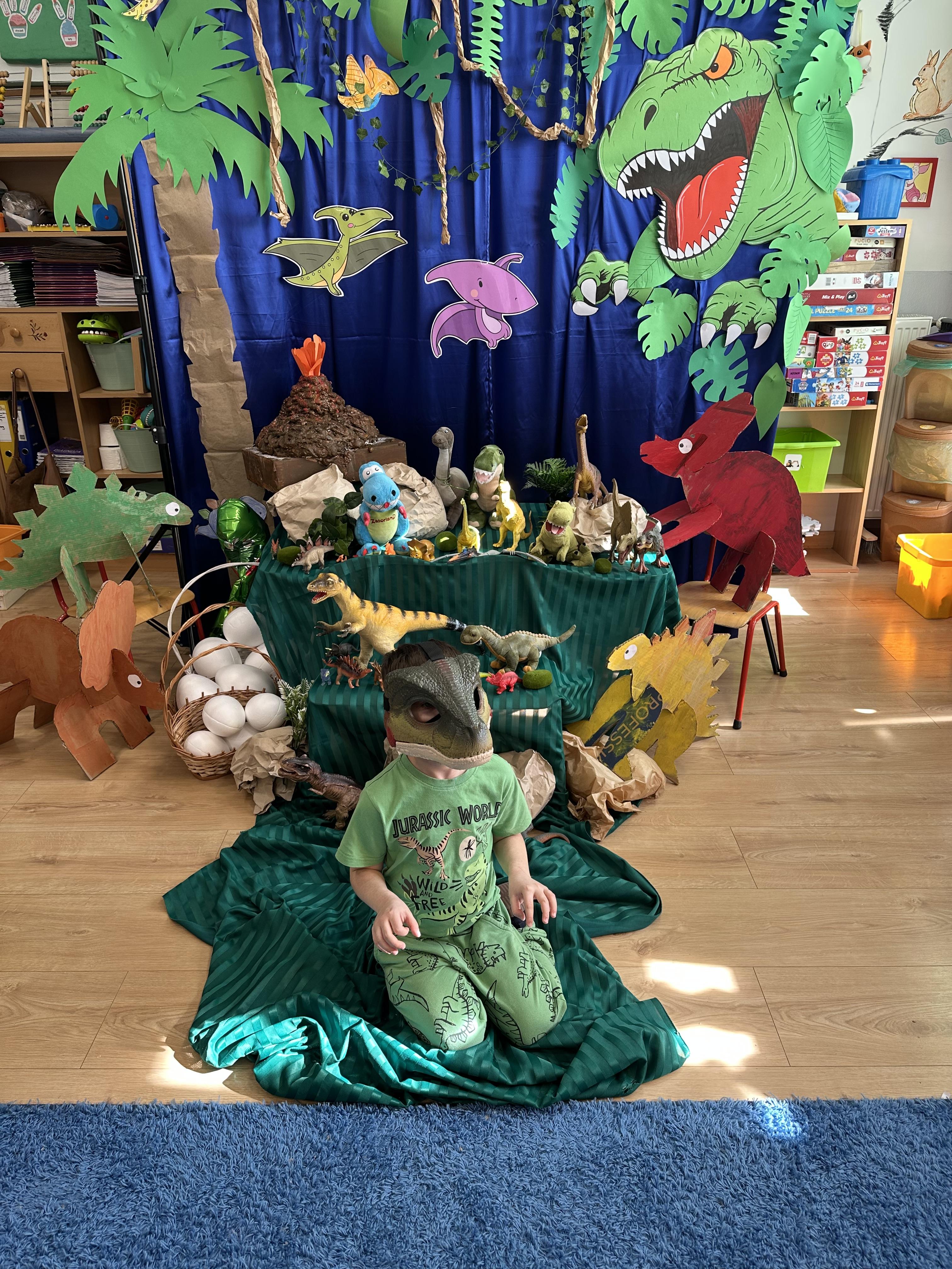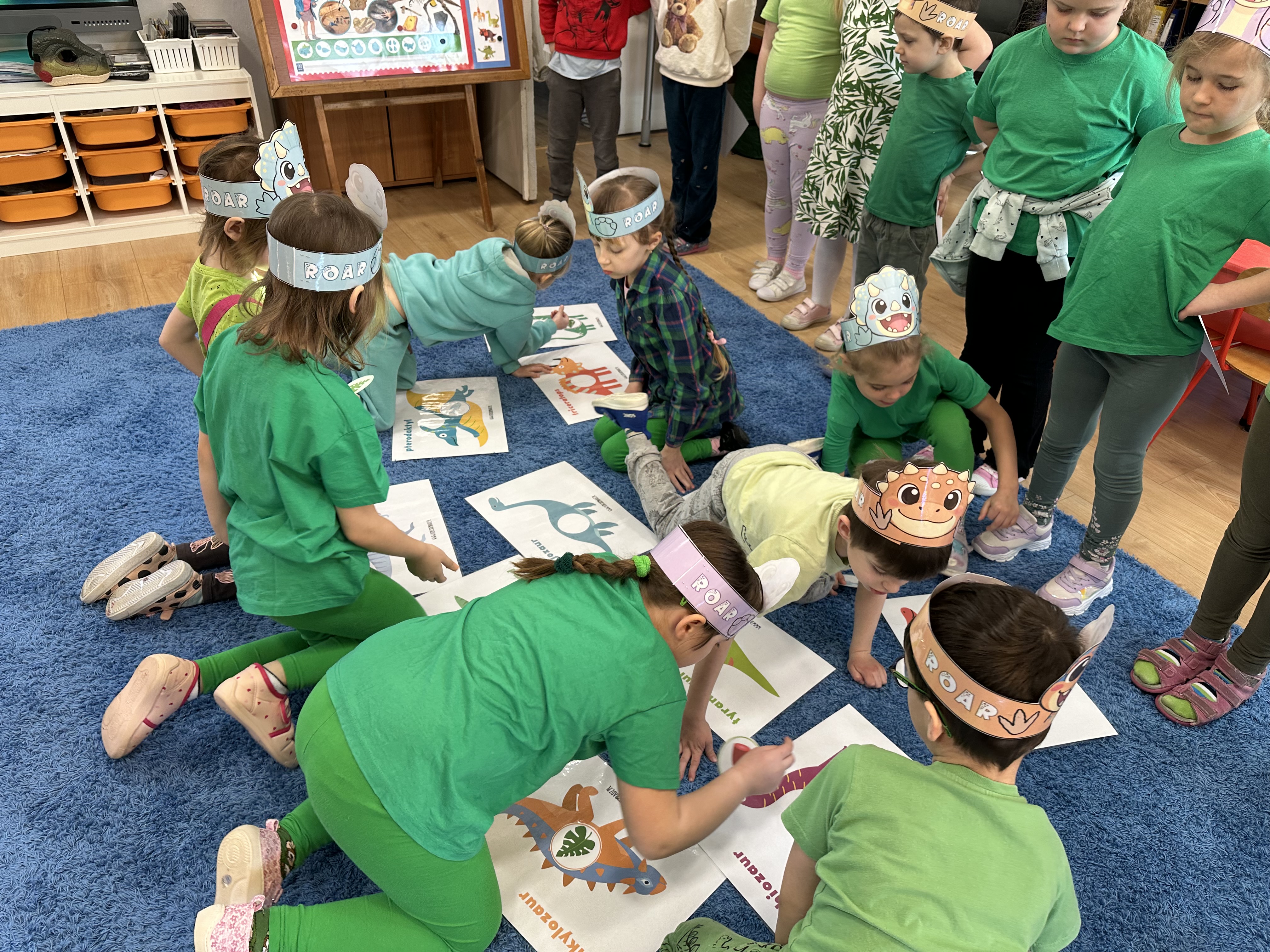 W naszej grupie odbył się Dzień Dinozaura, który dostarczył dzieciom wielu radosnych chwil oraz wzbogacił ich wiedzę o prehistorycznym świecie. Już od samego rana w sali został przygotowany kącik dinozaurów, w którym znalazły się figurki, książki oraz ilustracje przedstawiające różne gatunki tych niezwykłych stworzeń. Jedną z pierwszych aktywności była zabawa w paleontologów. Dzieci z ogromnym zaangażowaniem poszukiwały ukrytych „skamieniałości” i figurek dinozaurów, ucząc się przy tym, na czym polega praca naukowca badającego przeszłość Ziemi. Następnie wspólnie segregowały dinozaury na roślinożerne i mięsożerne, poznając ich charakterystyczne cechy oraz sposób odżywiania. Kolejnym punktem programu były „Dino-malowanki” – przestrzenna praca plastyczna, podczas której dzieci rozwijały swoją wyobraźnię i zdolności manualne. Duże zainteresowanie wzbudził również eksperyment „Wulkan”. Wykorzystując sodę i ocet, dzieci mogły zaobserwować efektowną „erupcję”, co było nie tylko świetną zabawą, ale także ciekawą lekcją przyrody. Nie zabrakło również aktywności ruchowych i gier. W „Wyścigach dinozaurów” dzieci sprawdzały, który dinozaur najszybciej dotrze do mety. Dużo emocji dostarczyła także gra „Dino droga”, w której zadaniem było bezpieczne przeprowadzenie dinozaurów przez prehistoryczny krajobraz pełen przygód i niespodzianek. Na zakończenie odbył się quiz sprawdzający wiadomości o dinozaurach. Dzieci wykazały się dużą wiedzą i zaangażowaniem. Dzień zakończył się wykonaniem pamiątkowej fotografii, która będzie miłym wspomnieniem wspólnie spędzonego czasu. Obchody Dnia Dinozaura były nie tylko okazją do świetnej zabawy, ale również do zdobywania nowych informacji i rozwijania zainteresowań przyrodniczych.