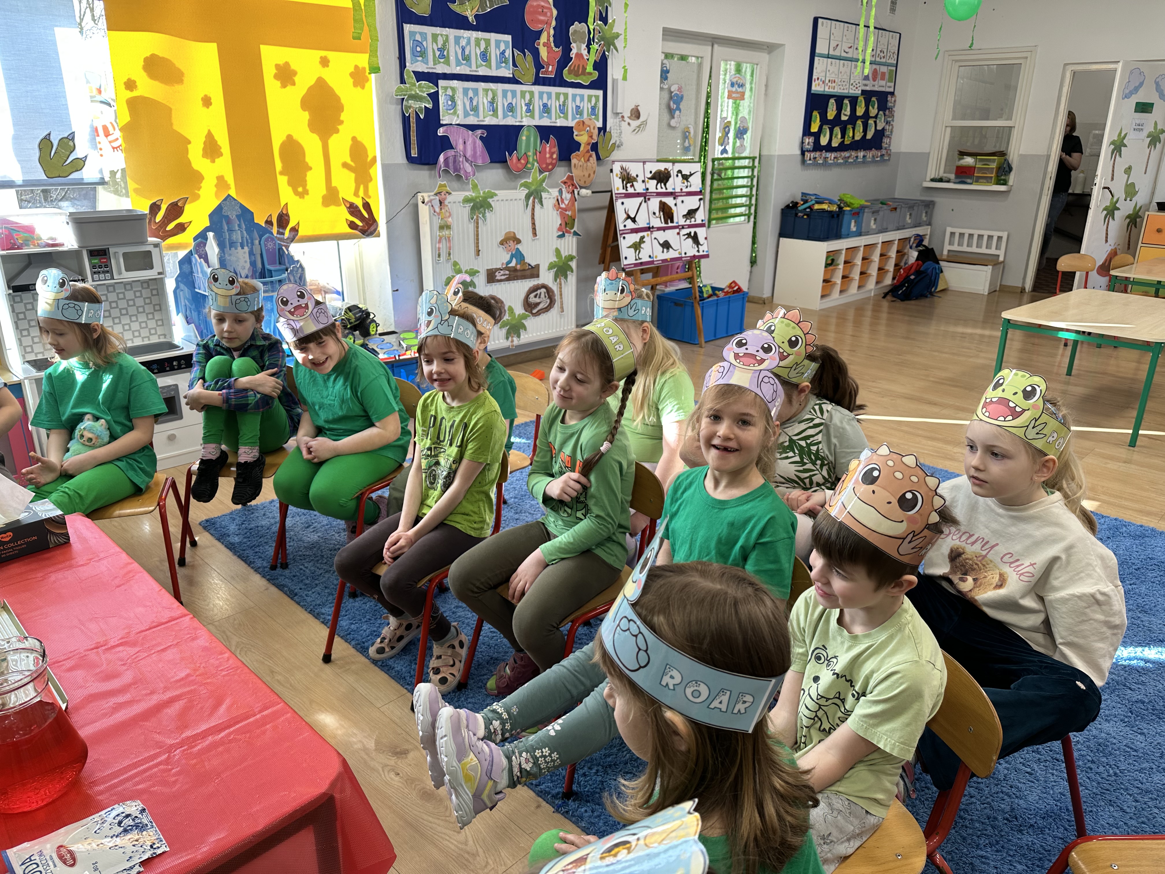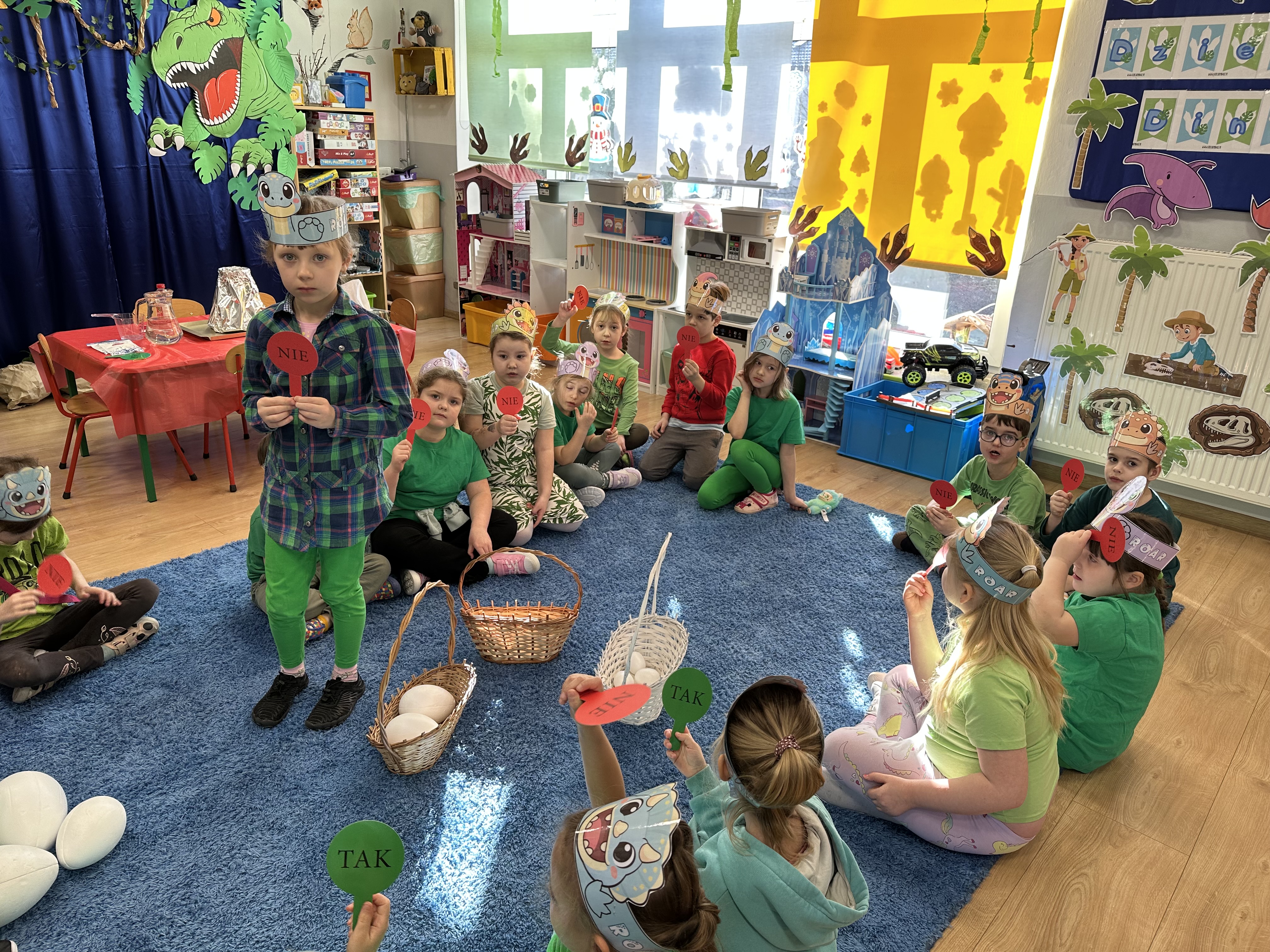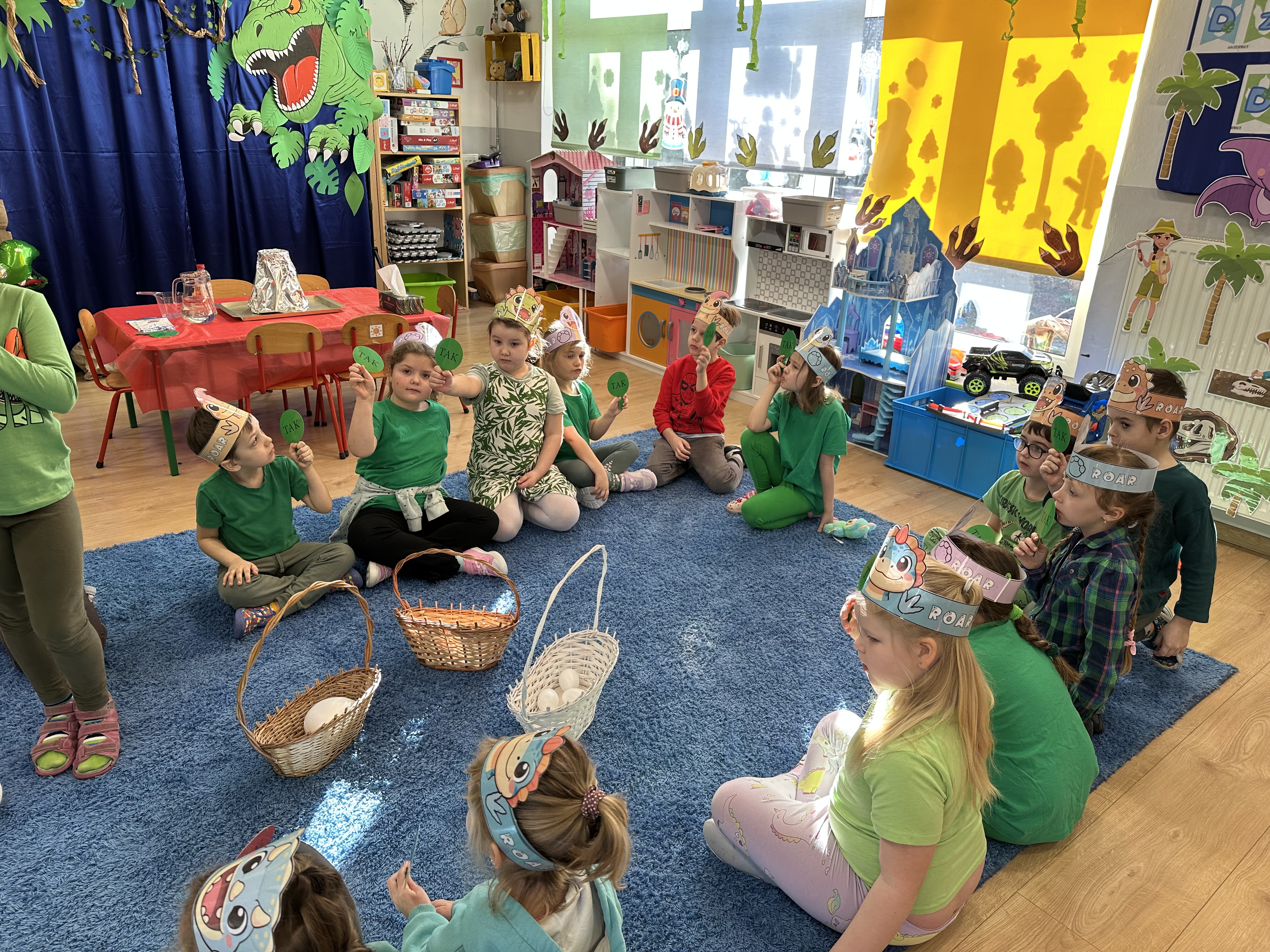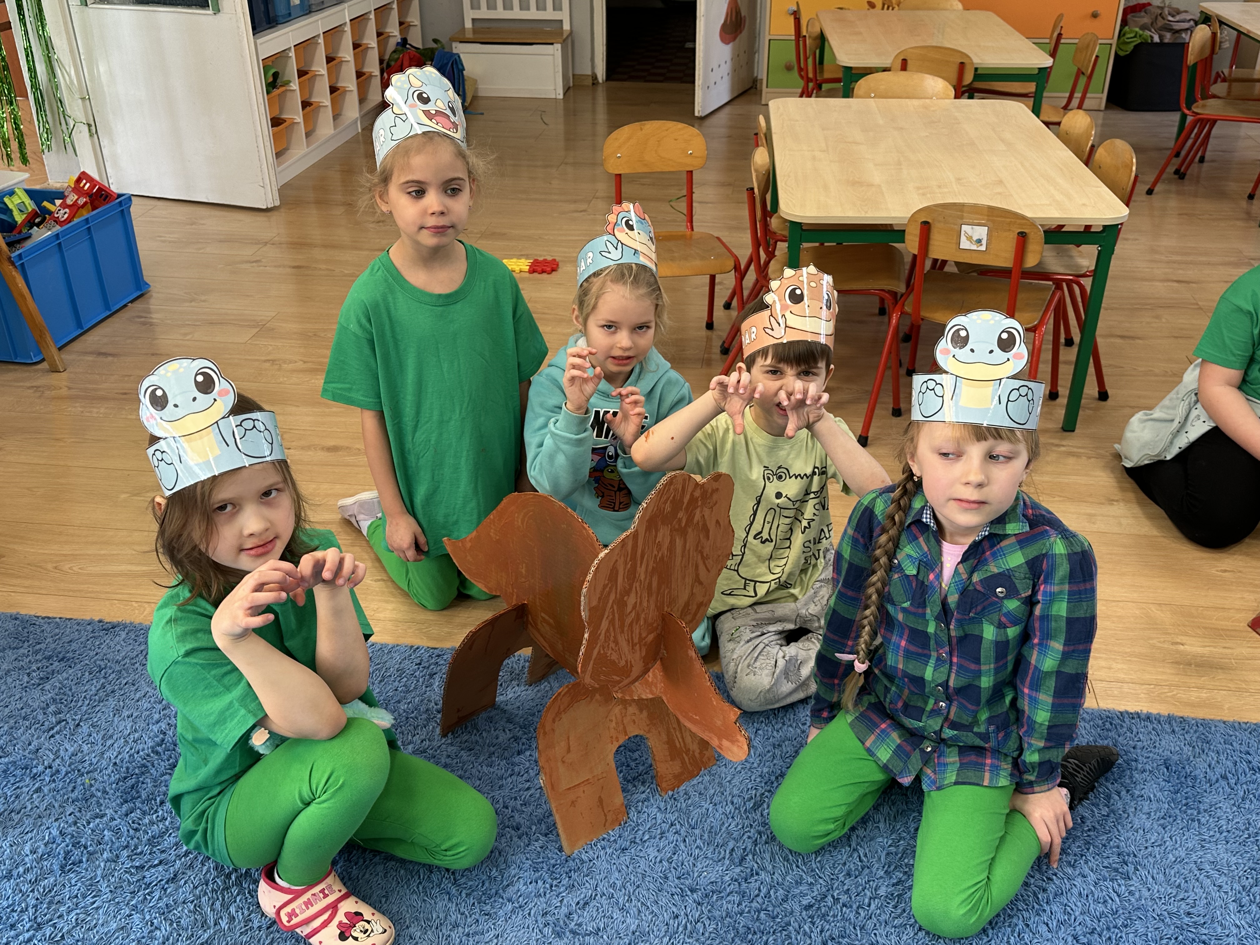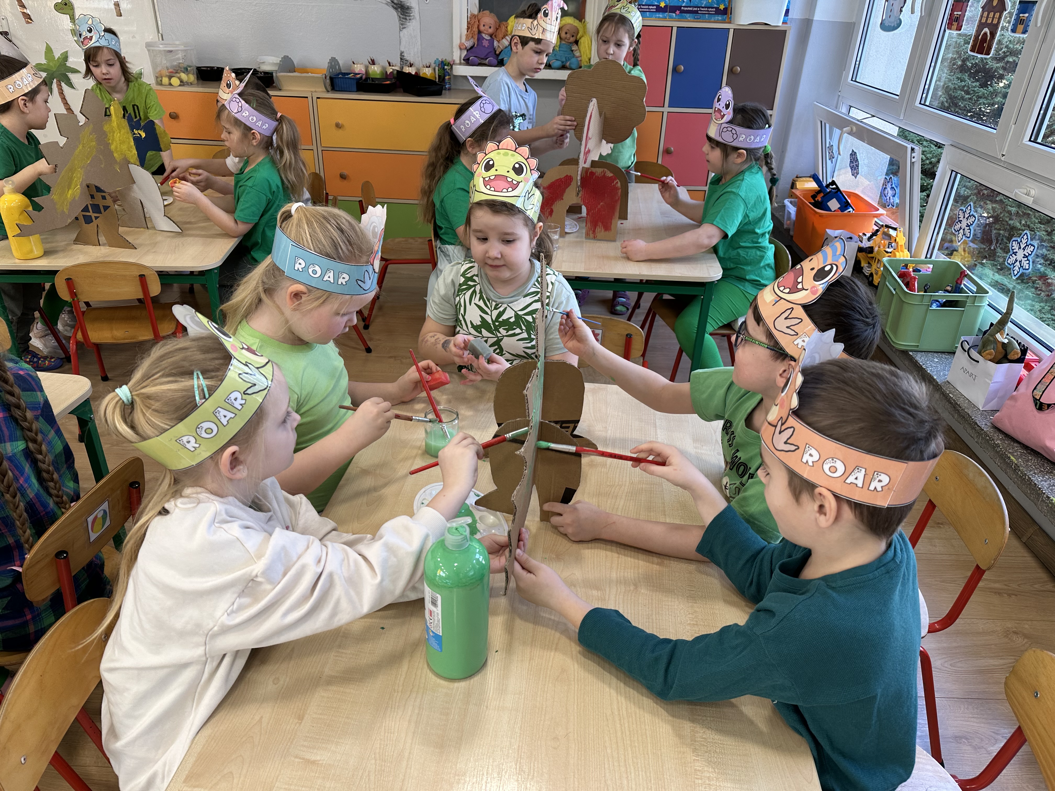 W naszej grupie odbył się Dzień Dinozaura, który dostarczył dzieciom wielu radosnych chwil oraz wzbogacił ich wiedzę o prehistorycznym świecie. Już od samego rana w sali został przygotowany kącik dinozaurów, w którym znalazły się figurki, książki oraz ilustracje przedstawiające różne gatunki tych niezwykłych stworzeń. Jedną z pierwszych aktywności była zabawa w paleontologów. Dzieci z ogromnym zaangażowaniem poszukiwały ukrytych „skamieniałości” i figurek dinozaurów, ucząc się przy tym, na czym polega praca naukowca badającego przeszłość Ziemi. Następnie wspólnie segregowały dinozaury na roślinożerne i mięsożerne, poznając ich charakterystyczne cechy oraz sposób odżywiania. Kolejnym punktem programu były „Dino-malowanki” – przestrzenna praca plastyczna, podczas której dzieci rozwijały swoją wyobraźnię i zdolności manualne. Duże zainteresowanie wzbudził również eksperyment „Wulkan”. Wykorzystując sodę i ocet, dzieci mogły zaobserwować efektowną „erupcję”, co było nie tylko świetną zabawą, ale także ciekawą lekcją przyrody. Nie zabrakło również aktywności ruchowych i gier. W „Wyścigach dinozaurów” dzieci sprawdzały, który dinozaur najszybciej dotrze do mety. Dużo emocji dostarczyła także gra „Dino droga”, w której zadaniem było bezpieczne przeprowadzenie dinozaurów przez prehistoryczny krajobraz pełen przygód i niespodzianek. Na zakończenie odbył się quiz sprawdzający wiadomości o dinozaurach. Dzieci wykazały się dużą wiedzą i zaangażowaniem. Dzień zakończył się wykonaniem pamiątkowej fotografii, która będzie miłym wspomnieniem wspólnie spędzonego czasu. Obchody Dnia Dinozaura były nie tylko okazją do świetnej zabawy, ale również do zdobywania nowych informacji i rozwijania zainteresowań przyrodniczych.