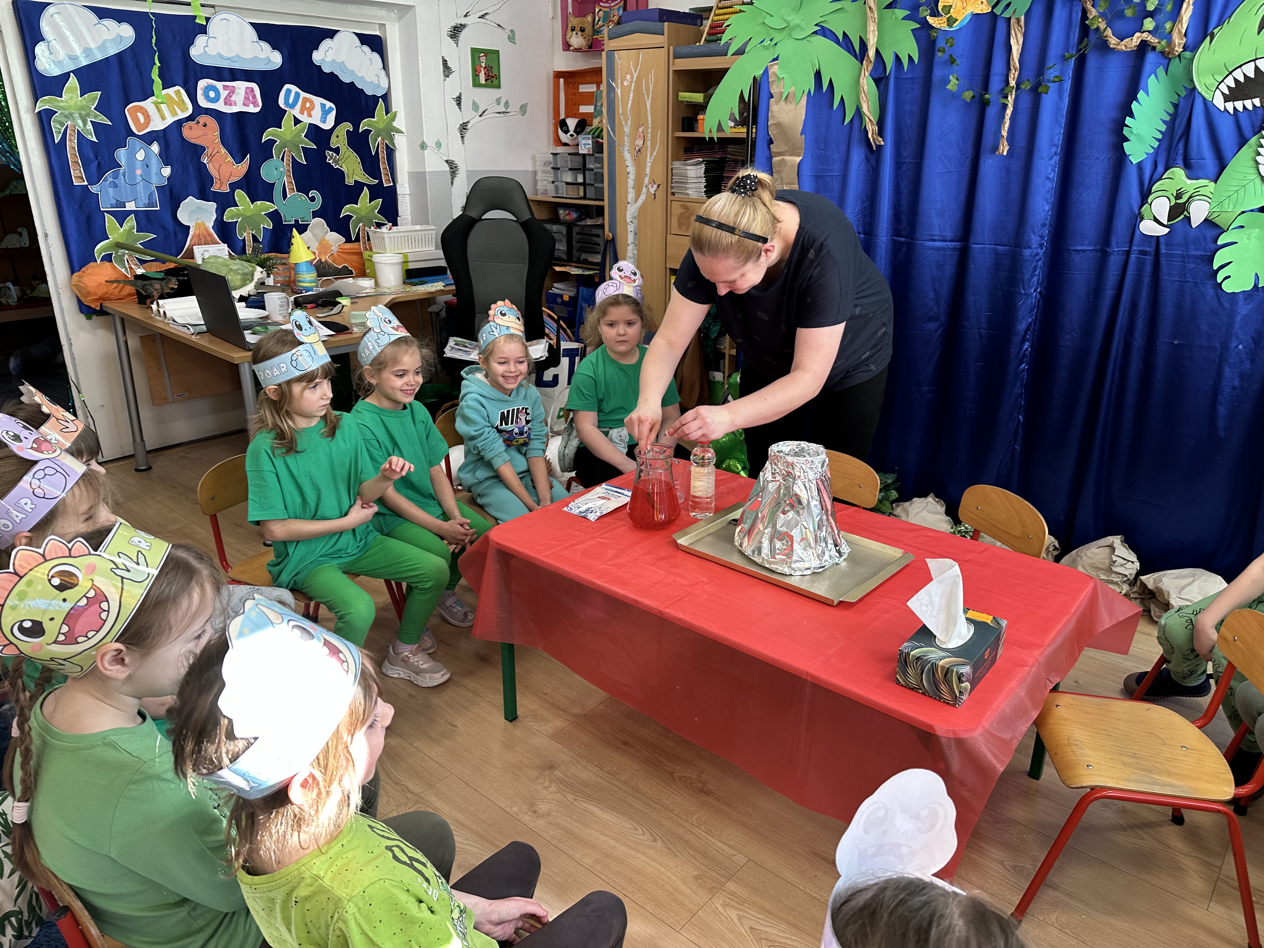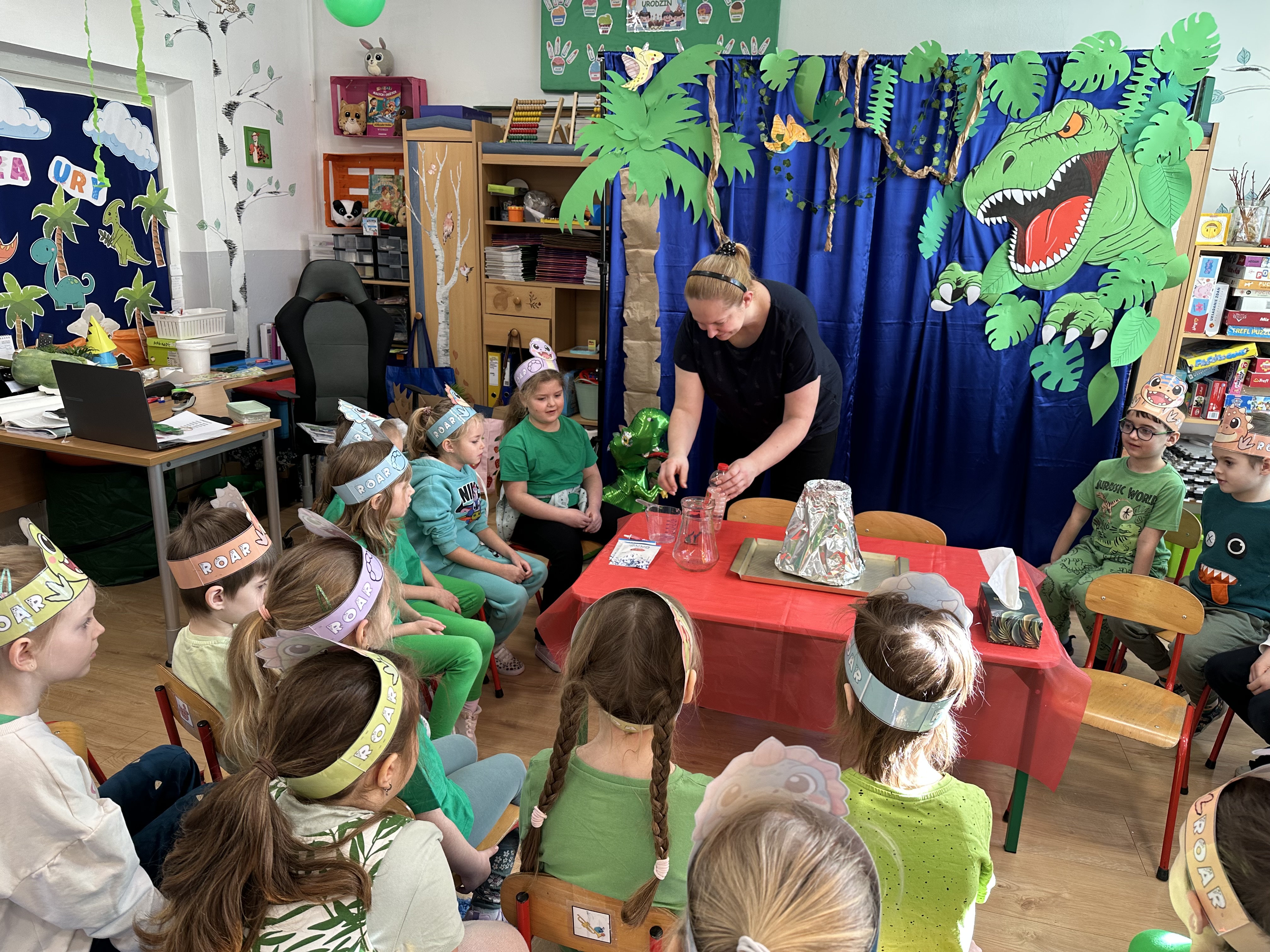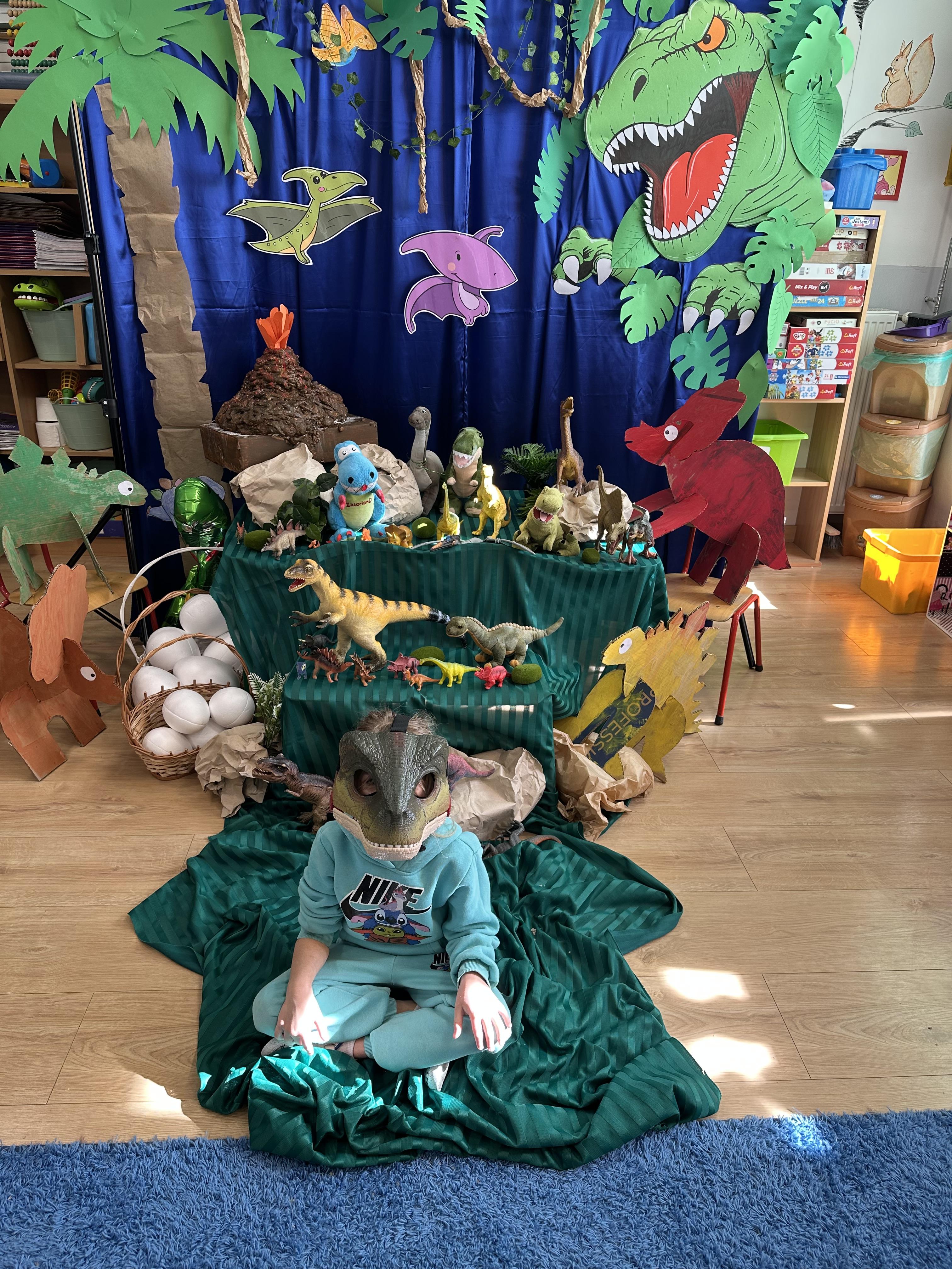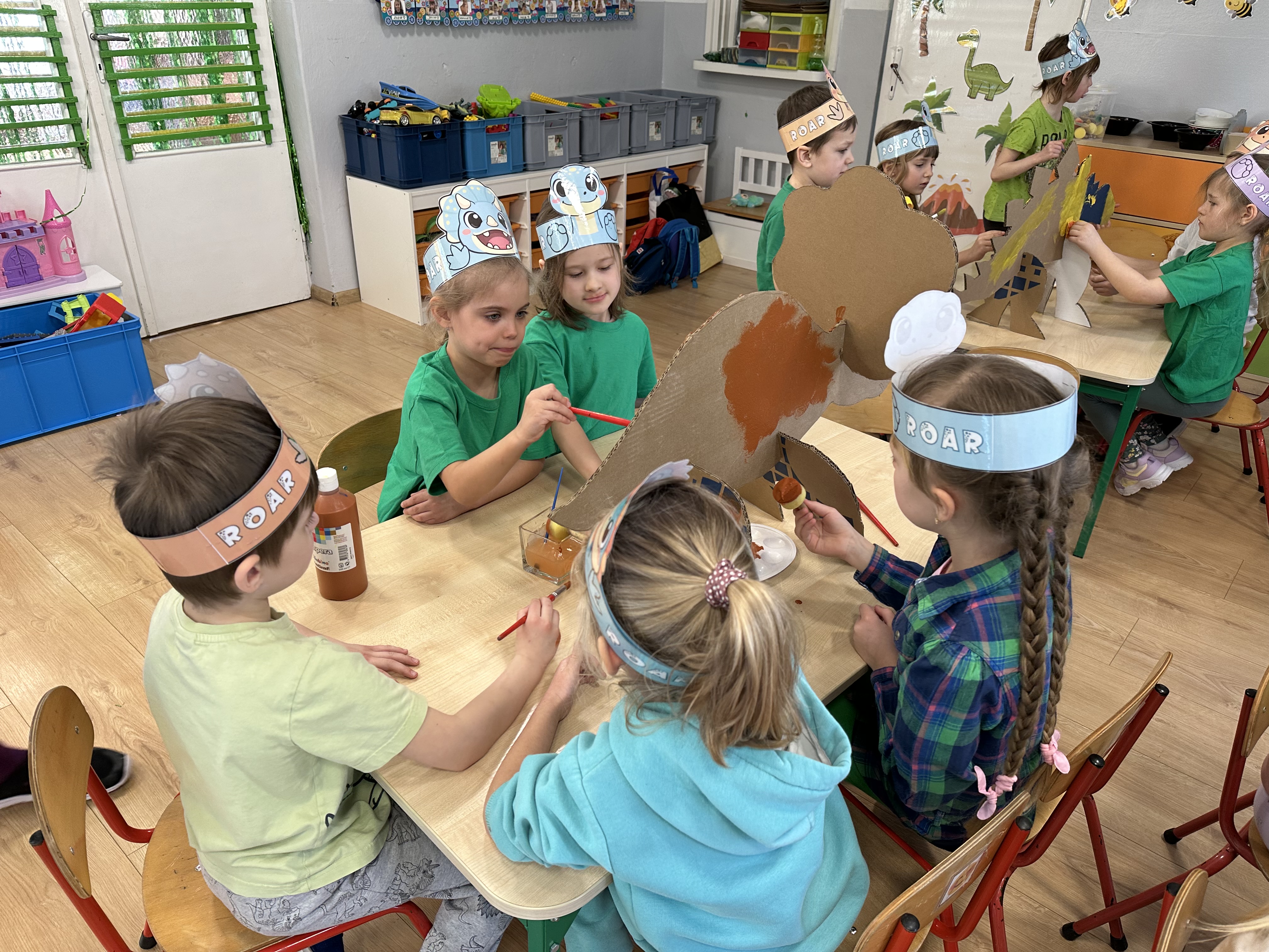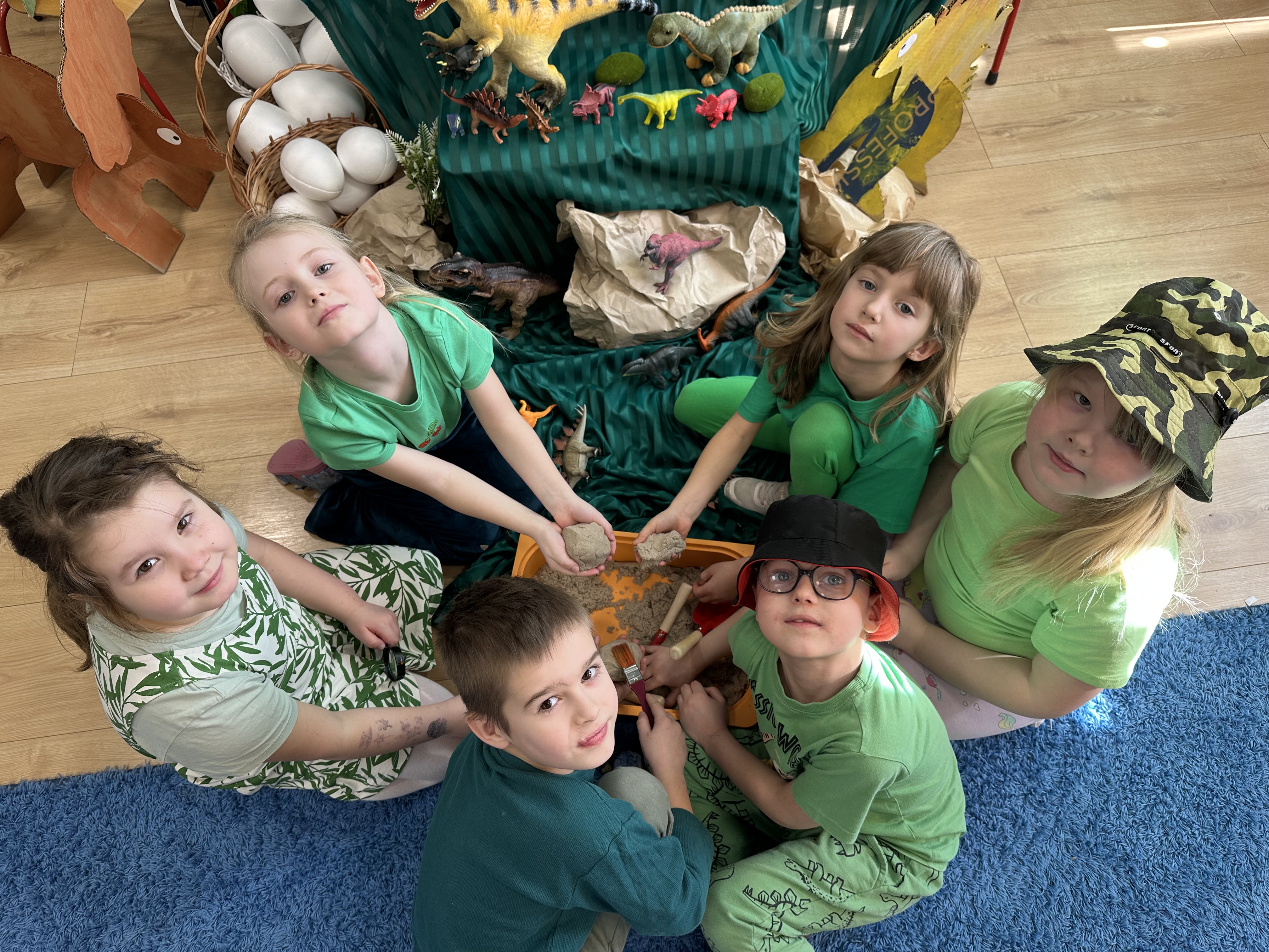 W naszej grupie odbył się Dzień Dinozaura, który dostarczył dzieciom wielu radosnych chwil oraz wzbogacił ich wiedzę o prehistorycznym świecie. Już od samego rana w sali został przygotowany kącik dinozaurów, w którym znalazły się figurki, książki oraz ilustracje przedstawiające różne gatunki tych niezwykłych stworzeń. Jedną z pierwszych aktywności była zabawa w paleontologów. Dzieci z ogromnym zaangażowaniem poszukiwały ukrytych „skamieniałości” i figurek dinozaurów, ucząc się przy tym, na czym polega praca naukowca badającego przeszłość Ziemi. Następnie wspólnie segregowały dinozaury na roślinożerne i mięsożerne, poznając ich charakterystyczne cechy oraz sposób odżywiania. Kolejnym punktem programu były „Dino-malowanki” – przestrzenna praca plastyczna, podczas której dzieci rozwijały swoją wyobraźnię i zdolności manualne. Duże zainteresowanie wzbudził również eksperyment „Wulkan”. Wykorzystując sodę i ocet, dzieci mogły zaobserwować efektowną „erupcję”, co było nie tylko świetną zabawą, ale także ciekawą lekcją przyrody. Nie zabrakło również aktywności ruchowych i gier. W „Wyścigach dinozaurów” dzieci sprawdzały, który dinozaur najszybciej dotrze do mety. Dużo emocji dostarczyła także gra „Dino droga”, w której zadaniem było bezpieczne przeprowadzenie dinozaurów przez prehistoryczny krajobraz pełen przygód i niespodzianek. Na zakończenie odbył się quiz sprawdzający wiadomości o dinozaurach. Dzieci wykazały się dużą wiedzą i zaangażowaniem. Dzień zakończył się wykonaniem pamiątkowej fotografii, która będzie miłym wspomnieniem wspólnie spędzonego czasu. Obchody Dnia Dinozaura były nie tylko okazją do świetnej zabawy, ale również do zdobywania nowych informacji i rozwijania zainteresowań przyrodniczych.