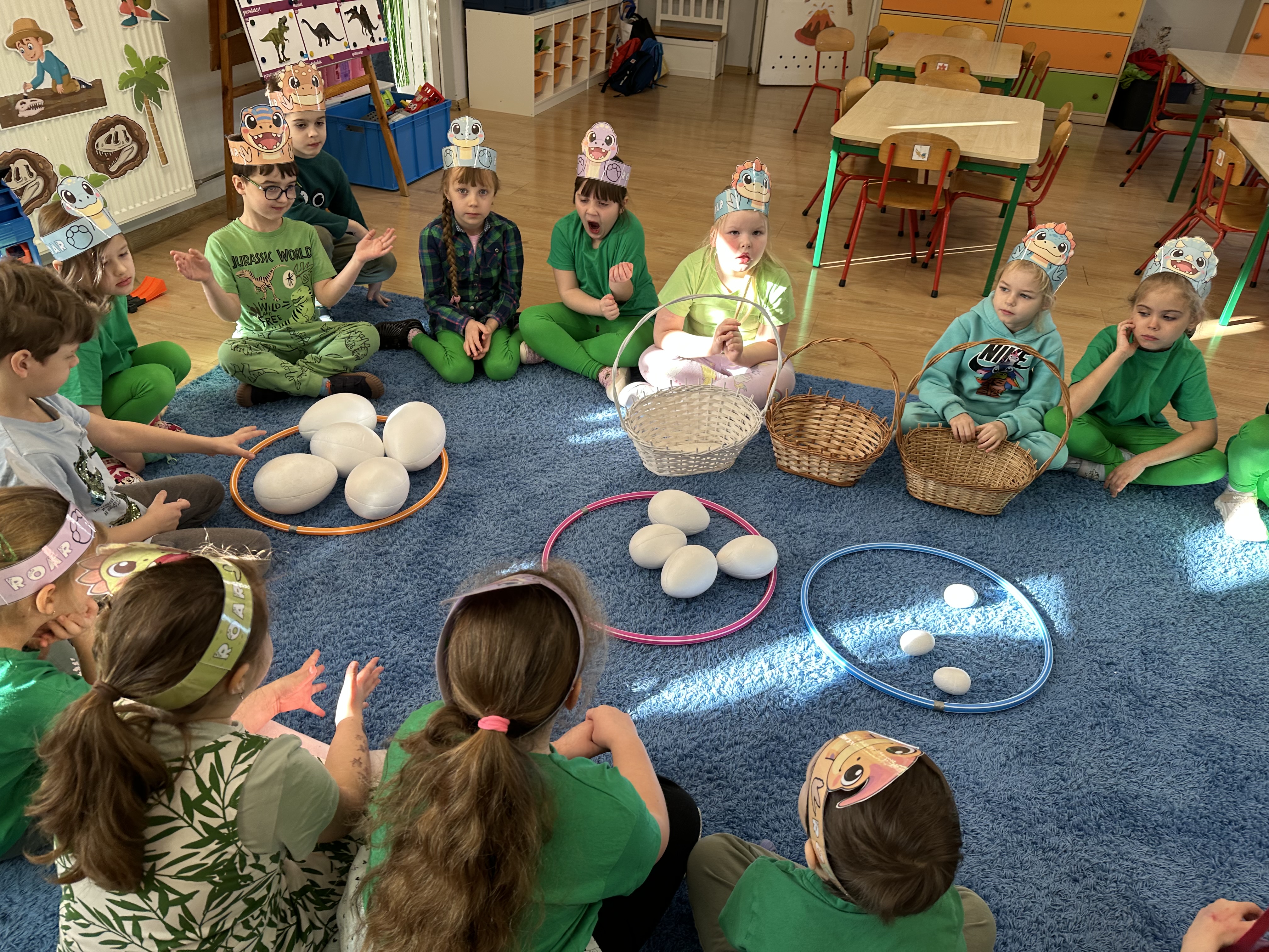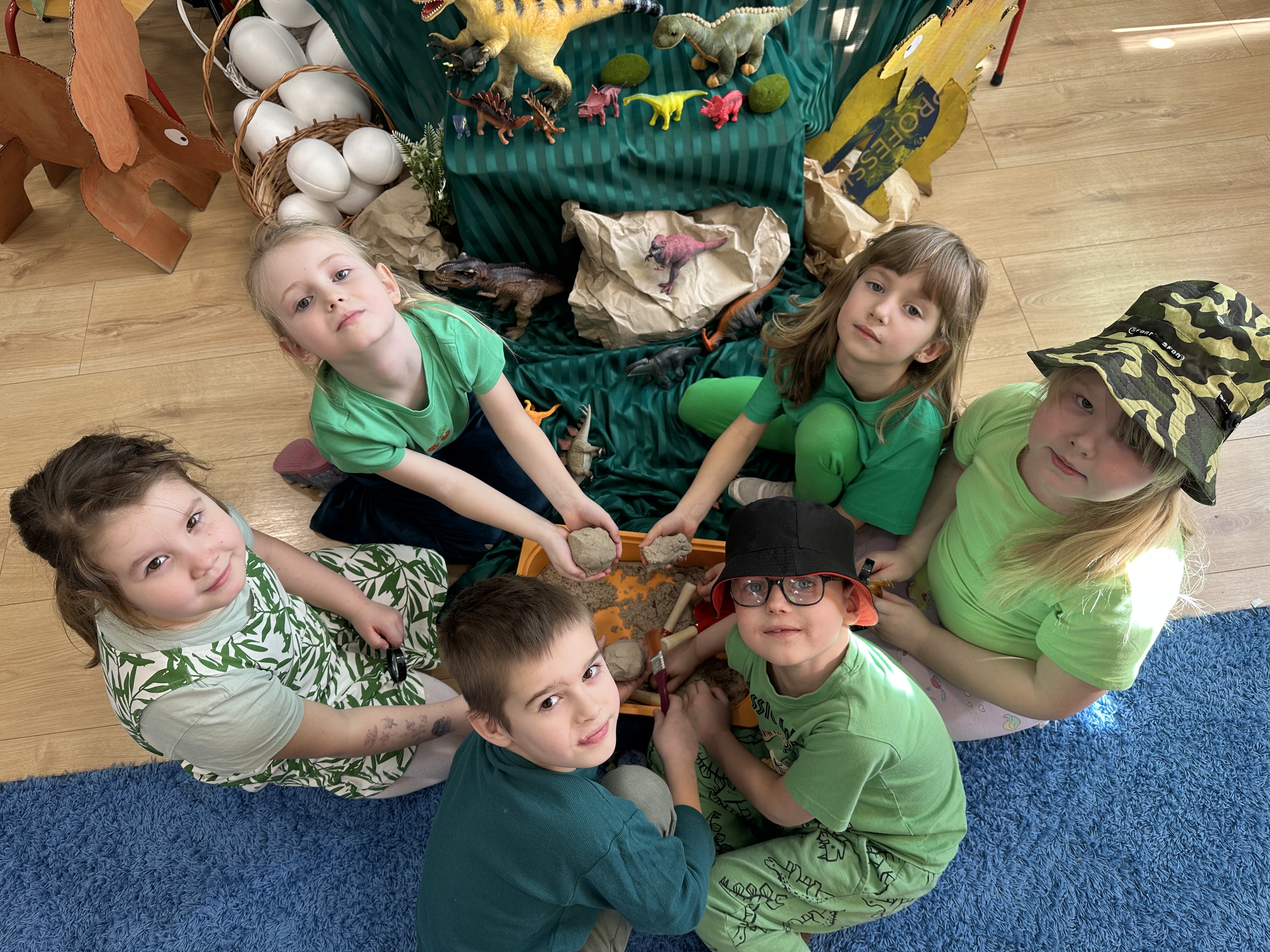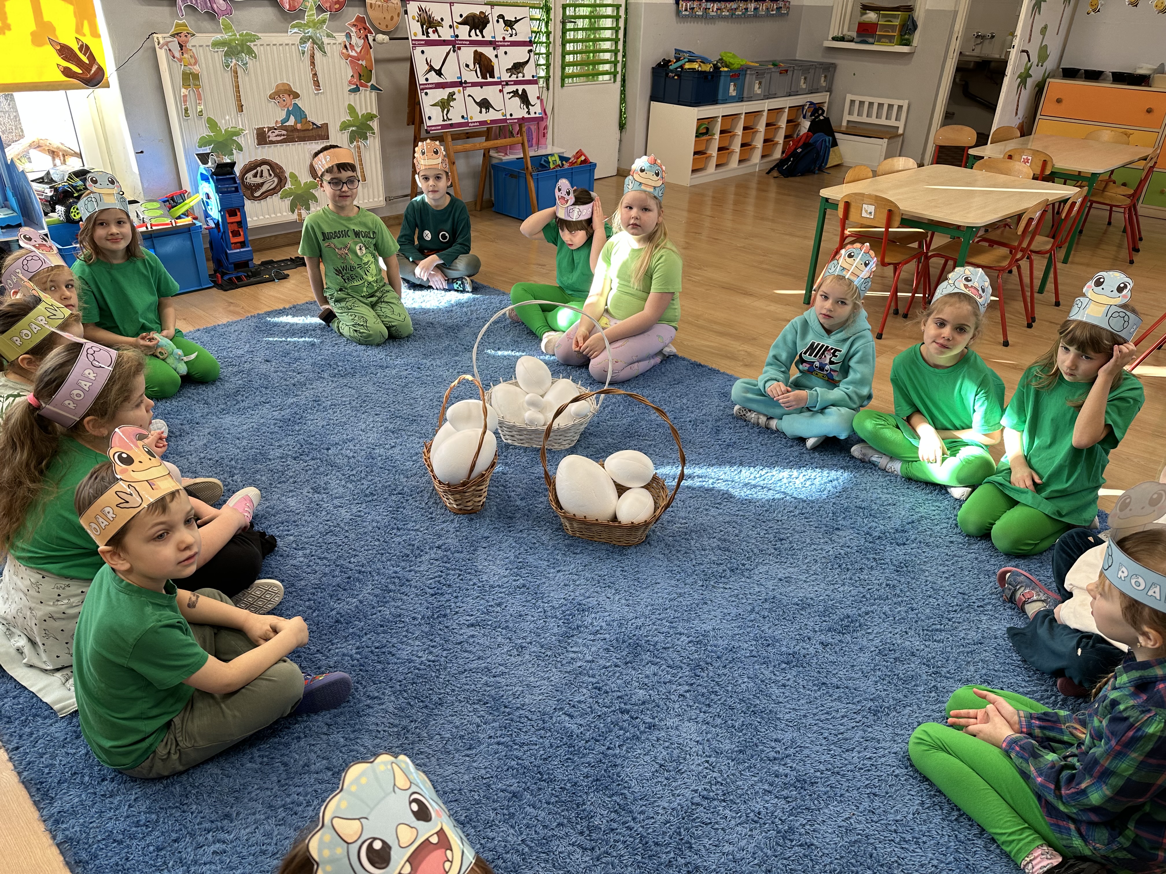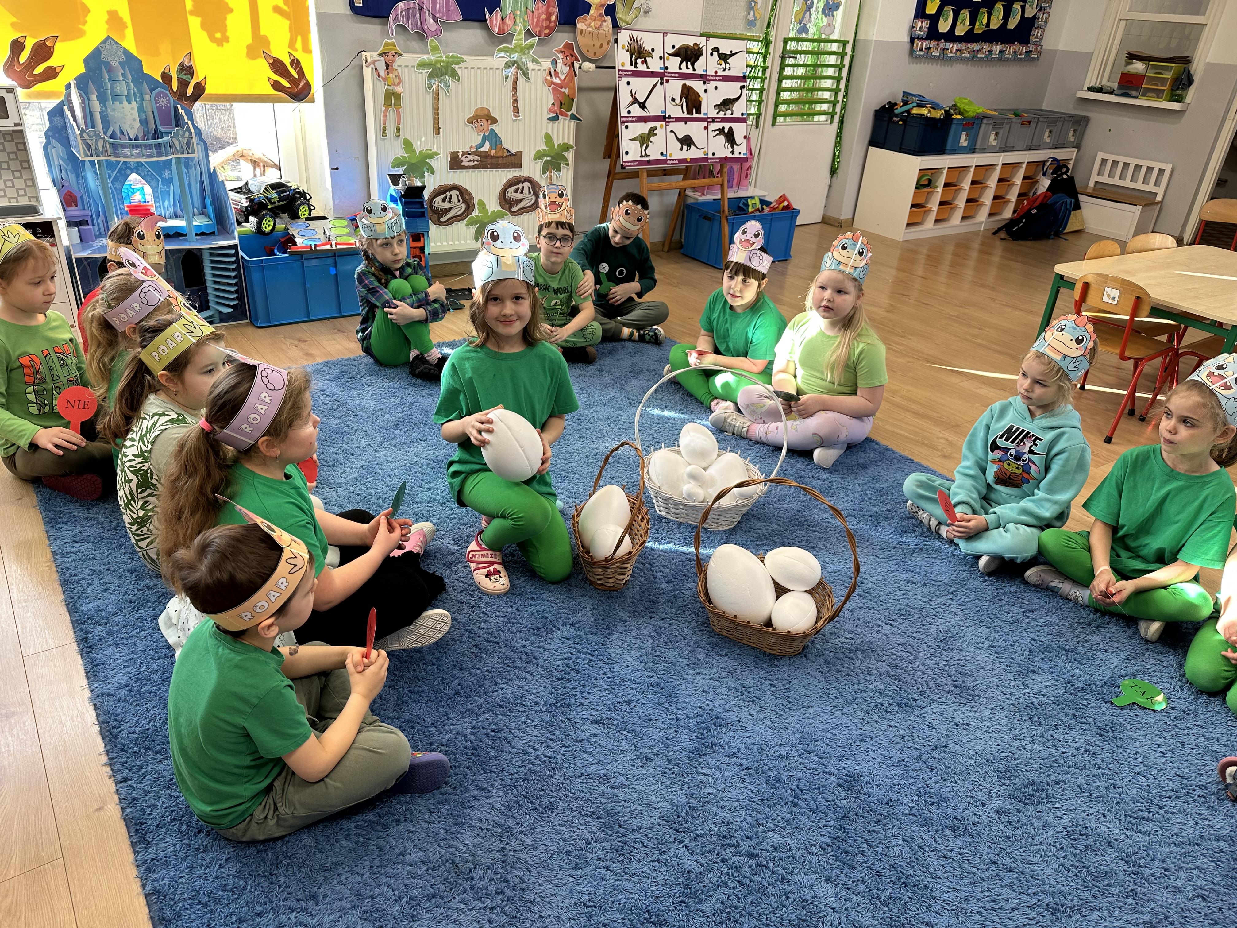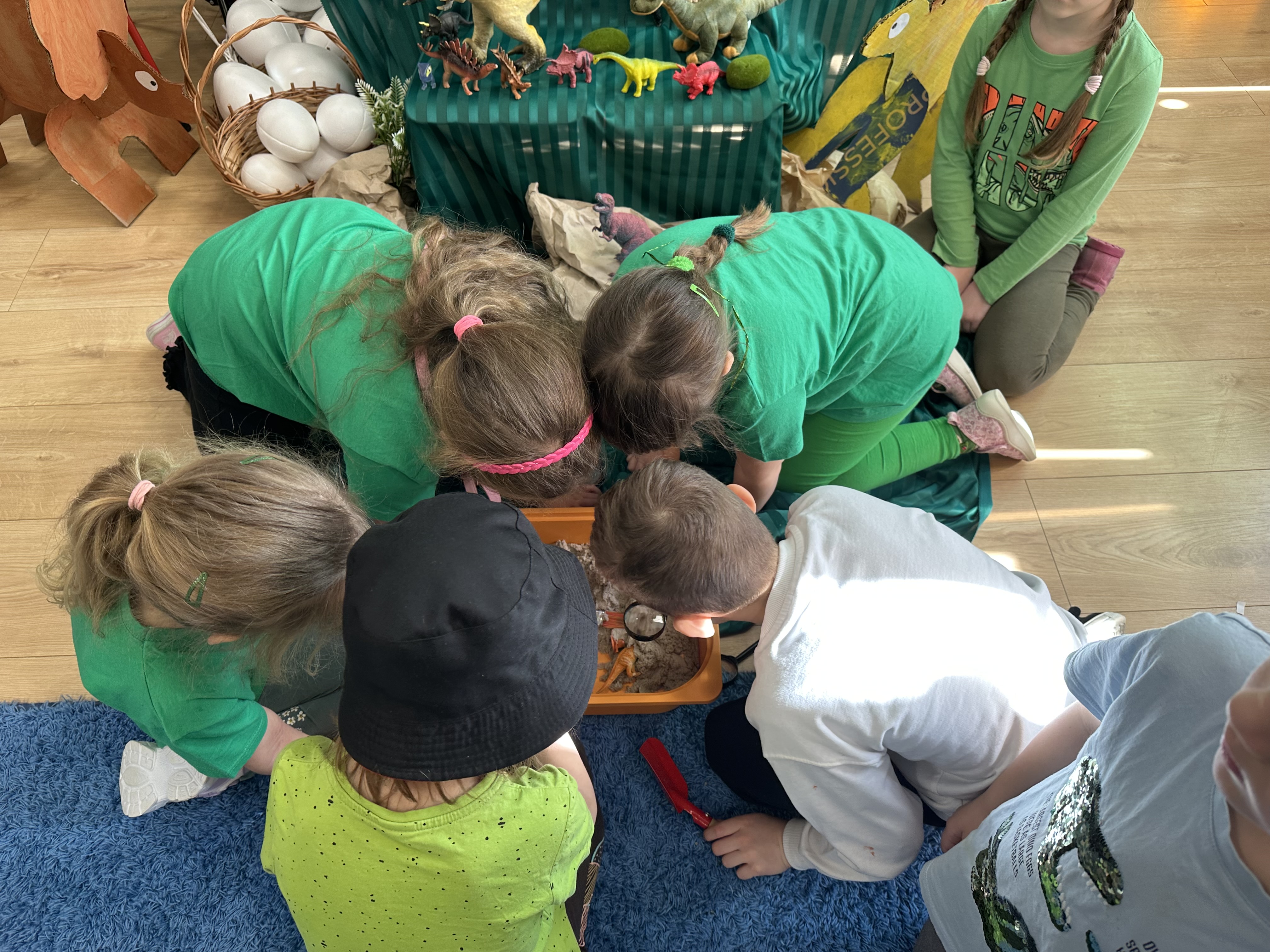 W naszej grupie odbył się Dzień Dinozaura, który dostarczył dzieciom wielu radosnych chwil oraz wzbogacił ich wiedzę o prehistorycznym świecie. Już od samego rana w sali został przygotowany kącik dinozaurów, w którym znalazły się figurki, książki oraz ilustracje przedstawiające różne gatunki tych niezwykłych stworzeń. Jedną z pierwszych aktywności była zabawa w paleontologów. Dzieci z ogromnym zaangażowaniem poszukiwały ukrytych „skamieniałości” i figurek dinozaurów, ucząc się przy tym, na czym polega praca naukowca badającego przeszłość Ziemi. Następnie wspólnie segregowały dinozaury na roślinożerne i mięsożerne, poznając ich charakterystyczne cechy oraz sposób odżywiania. Kolejnym punktem programu były „Dino-malowanki” – przestrzenna praca plastyczna, podczas której dzieci rozwijały swoją wyobraźnię i zdolności manualne. Duże zainteresowanie wzbudził również eksperyment „Wulkan”. Wykorzystując sodę i ocet, dzieci mogły zaobserwować efektowną „erupcję”, co było nie tylko świetną zabawą, ale także ciekawą lekcją przyrody. Nie zabrakło również aktywności ruchowych i gier. W „Wyścigach dinozaurów” dzieci sprawdzały, który dinozaur najszybciej dotrze do mety. Dużo emocji dostarczyła także gra „Dino droga”, w której zadaniem było bezpieczne przeprowadzenie dinozaurów przez prehistoryczny krajobraz pełen przygód i niespodzianek. Na zakończenie odbył się quiz sprawdzający wiadomości o dinozaurach. Dzieci wykazały się dużą wiedzą i zaangażowaniem. Dzień zakończył się wykonaniem pamiątkowej fotografii, która będzie miłym wspomnieniem wspólnie spędzonego czasu. Obchody Dnia Dinozaura były nie tylko okazją do świetnej zabawy, ale również do zdobywania nowych informacji i rozwijania zainteresowań przyrodniczych.