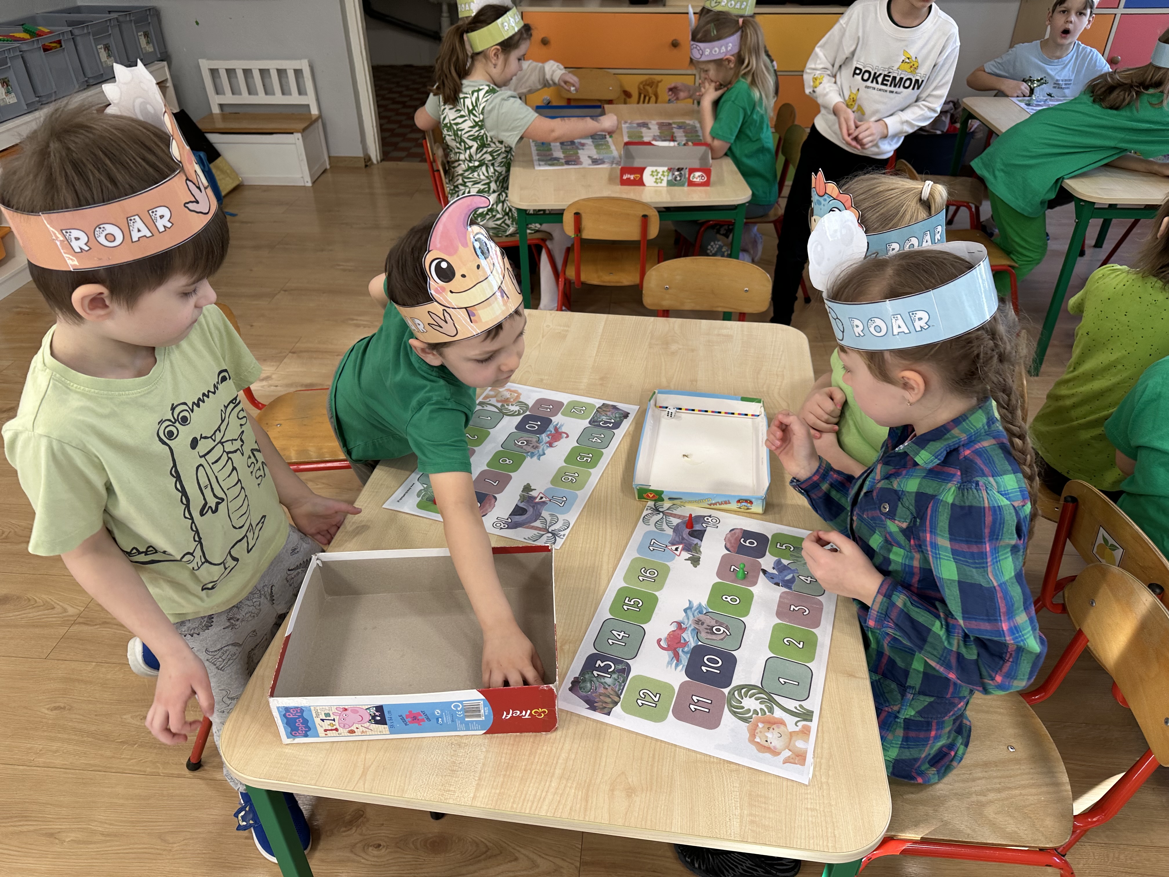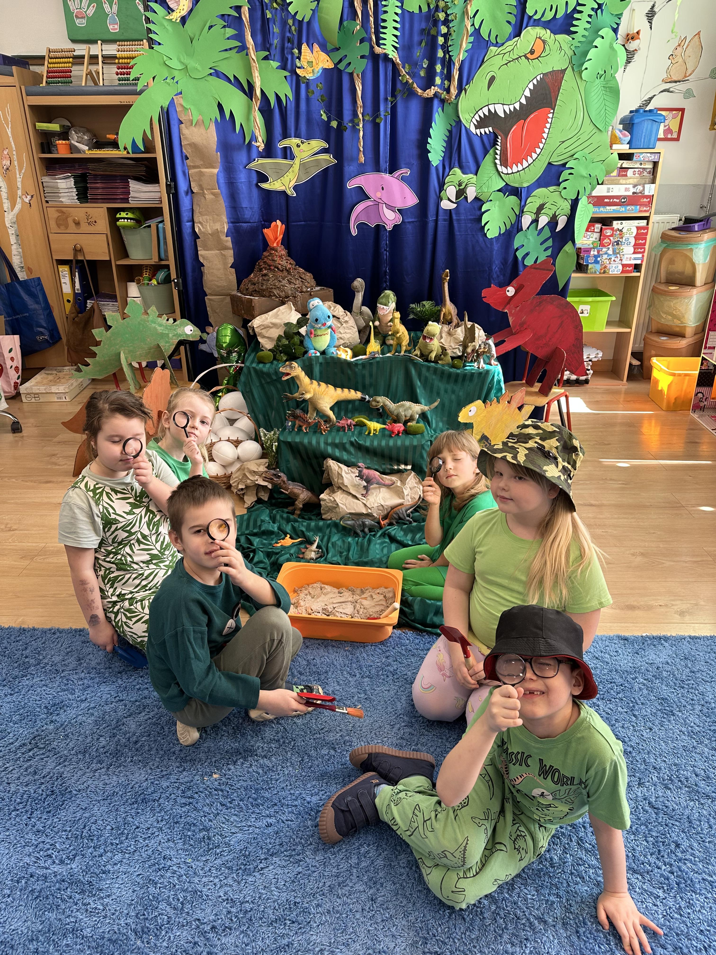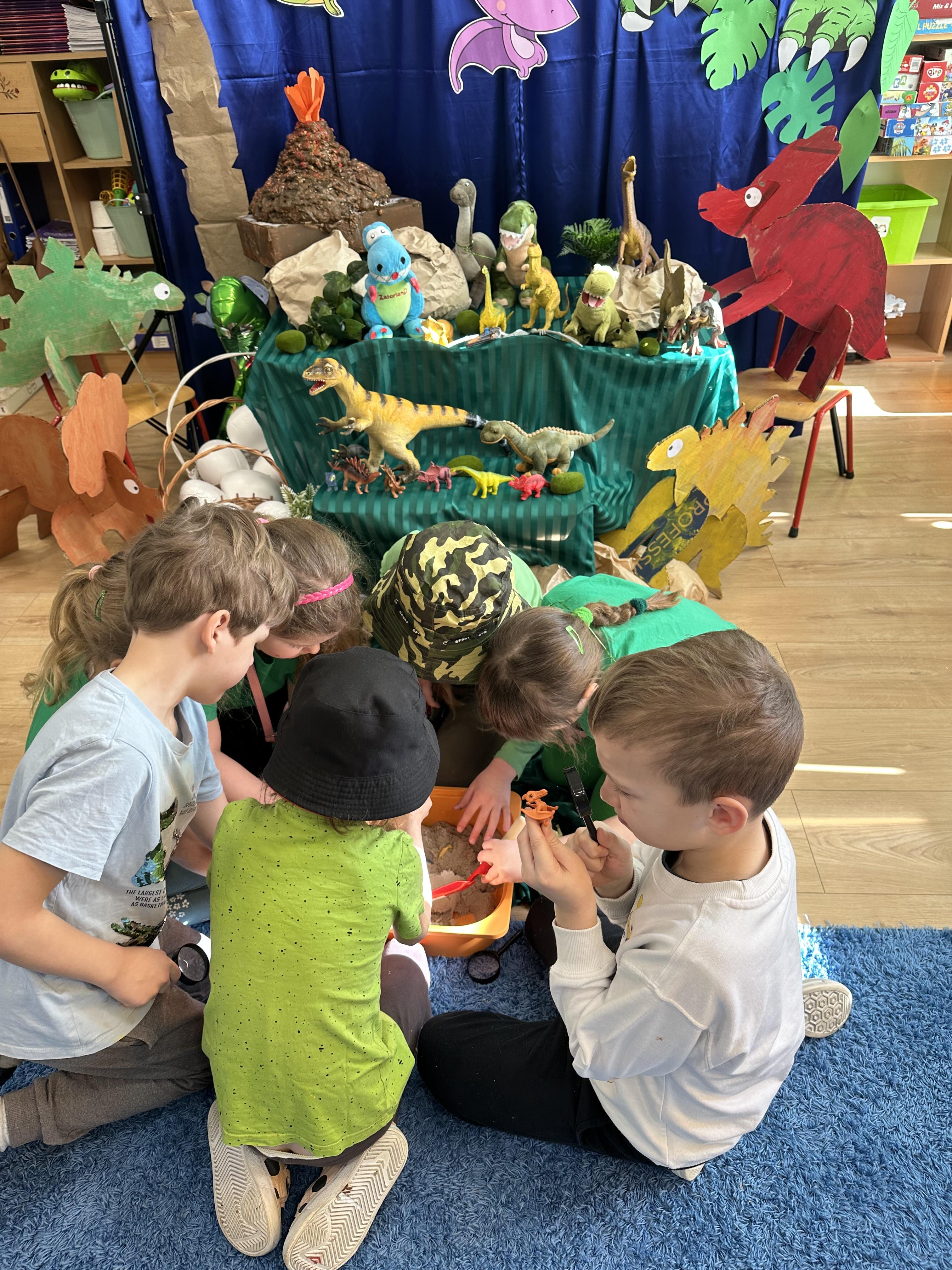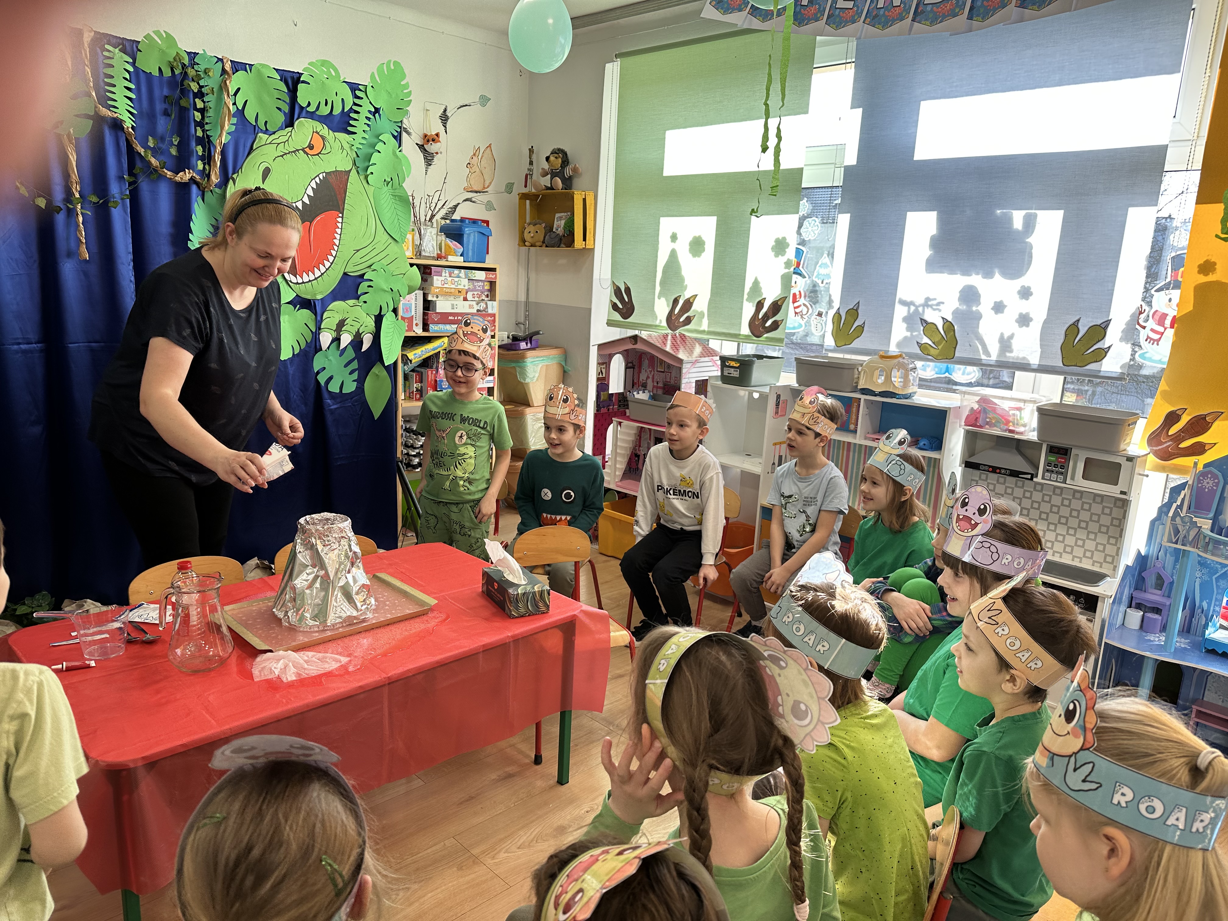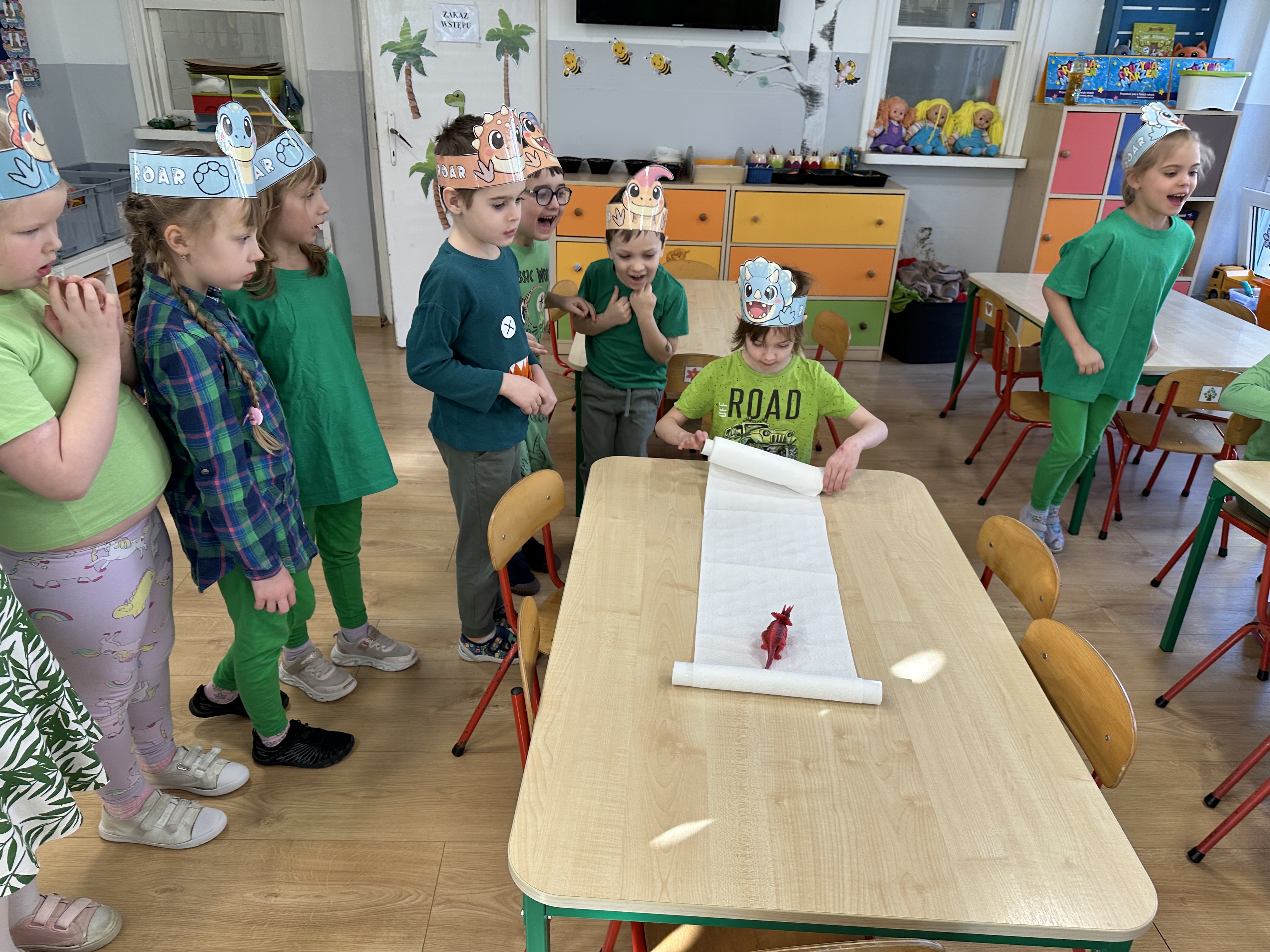 W naszej grupie odbył się Dzień Dinozaura, który dostarczył dzieciom wielu radosnych chwil oraz wzbogacił ich wiedzę o prehistorycznym świecie. Już od samego rana w sali został przygotowany kącik dinozaurów, w którym znalazły się figurki, książki oraz ilustracje przedstawiające różne gatunki tych niezwykłych stworzeń. Jedną z pierwszych aktywności była zabawa w paleontologów. Dzieci z ogromnym zaangażowaniem poszukiwały ukrytych „skamieniałości” i figurek dinozaurów, ucząc się przy tym, na czym polega praca naukowca badającego przeszłość Ziemi. Następnie wspólnie segregowały dinozaury na roślinożerne i mięsożerne, poznając ich charakterystyczne cechy oraz sposób odżywiania. Kolejnym punktem programu były „Dino-malowanki” – przestrzenna praca plastyczna, podczas której dzieci rozwijały swoją wyobraźnię i zdolności manualne. Duże zainteresowanie wzbudził również eksperyment „Wulkan”. Wykorzystując sodę i ocet, dzieci mogły zaobserwować efektowną „erupcję”, co było nie tylko świetną zabawą, ale także ciekawą lekcją przyrody. Nie zabrakło również aktywności ruchowych i gier. W „Wyścigach dinozaurów” dzieci sprawdzały, który dinozaur najszybciej dotrze do mety. Dużo emocji dostarczyła także gra „Dino droga”, w której zadaniem było bezpieczne przeprowadzenie dinozaurów przez prehistoryczny krajobraz pełen przygód i niespodzianek. Na zakończenie odbył się quiz sprawdzający wiadomości o dinozaurach. Dzieci wykazały się dużą wiedzą i zaangażowaniem. Dzień zakończył się wykonaniem pamiątkowej fotografii, która będzie miłym wspomnieniem wspólnie spędzonego czasu. Obchody Dnia Dinozaura były nie tylko okazją do świetnej zabawy, ale również do zdobywania nowych informacji i rozwijania zainteresowań przyrodniczych.