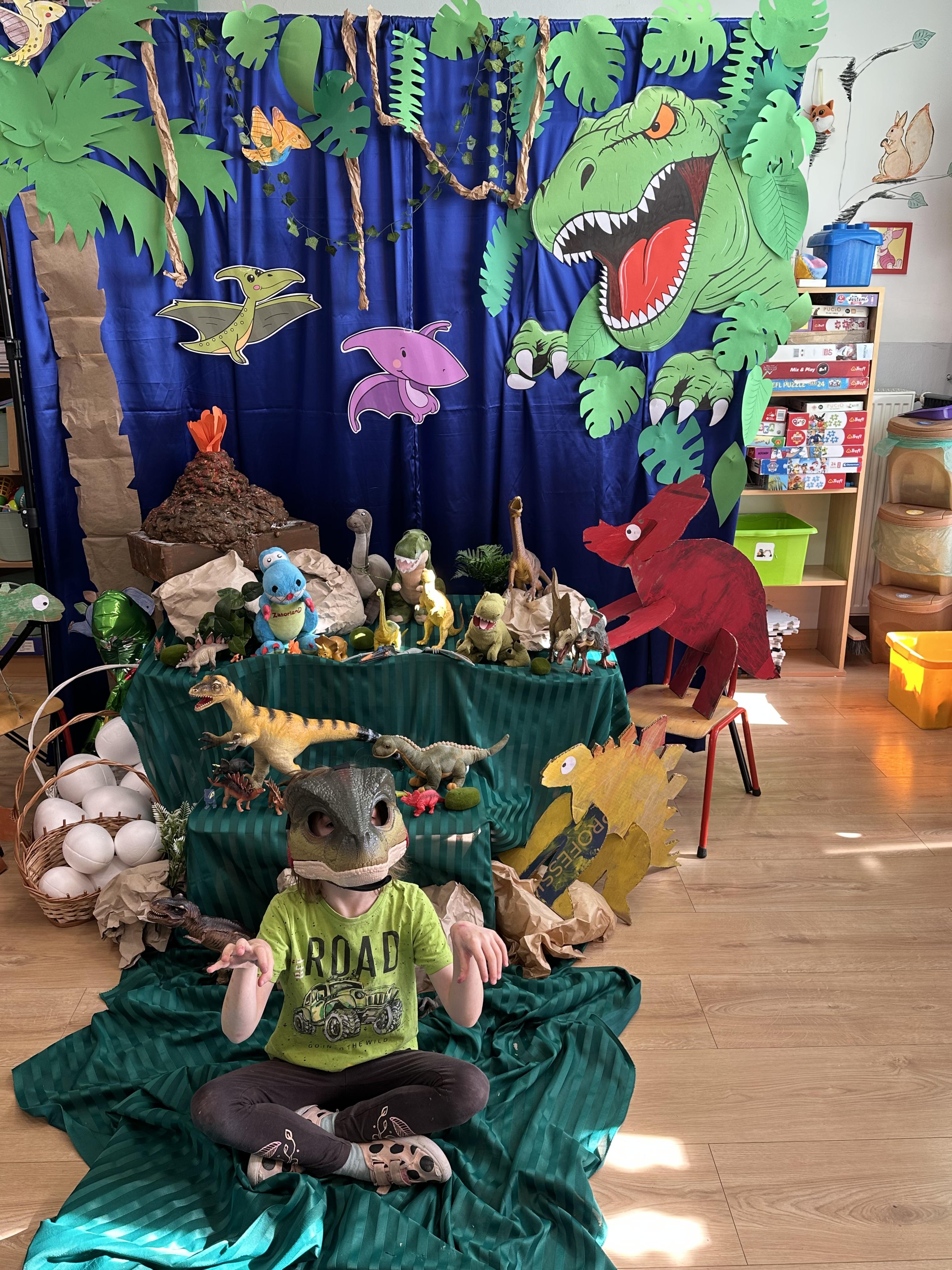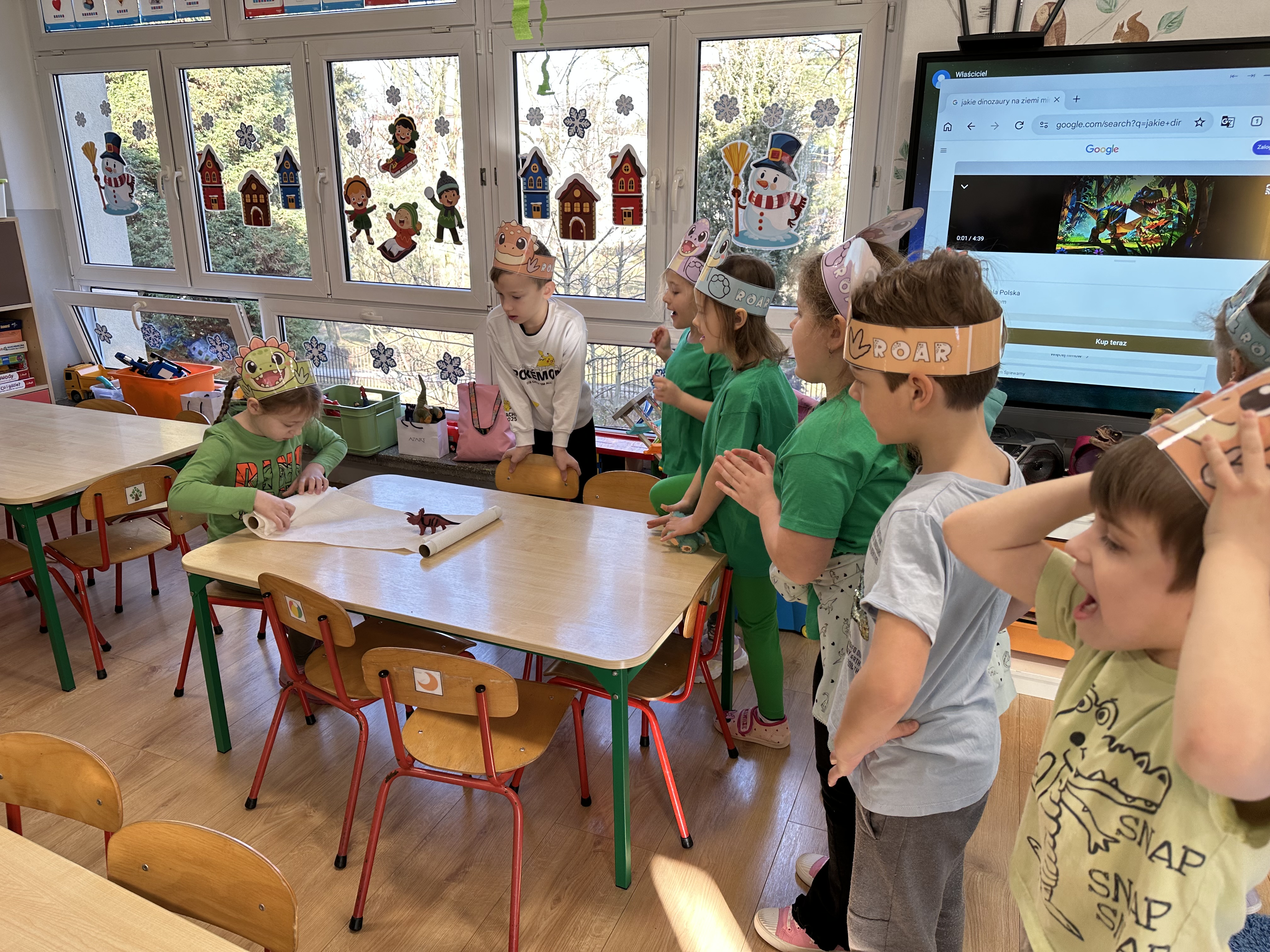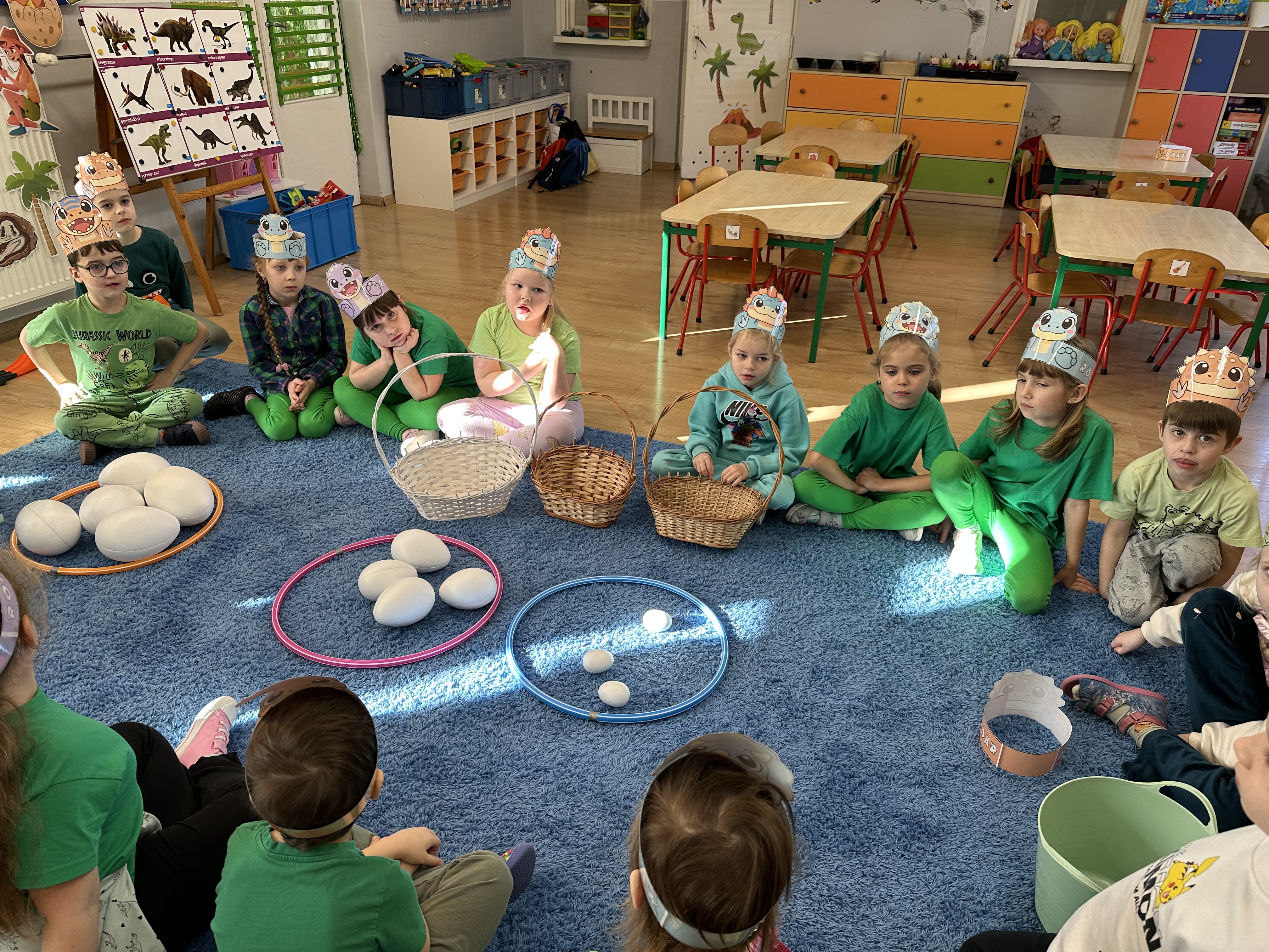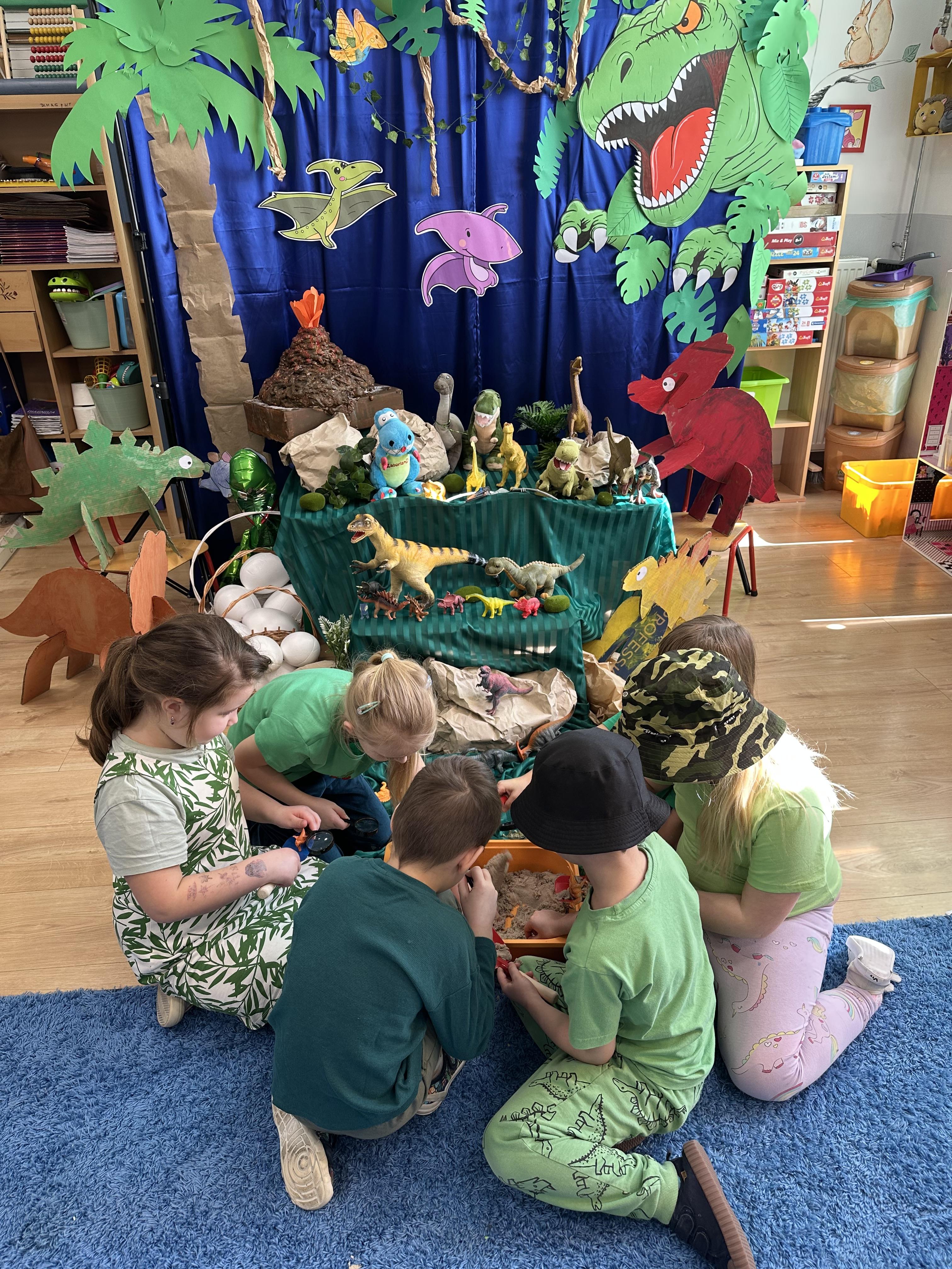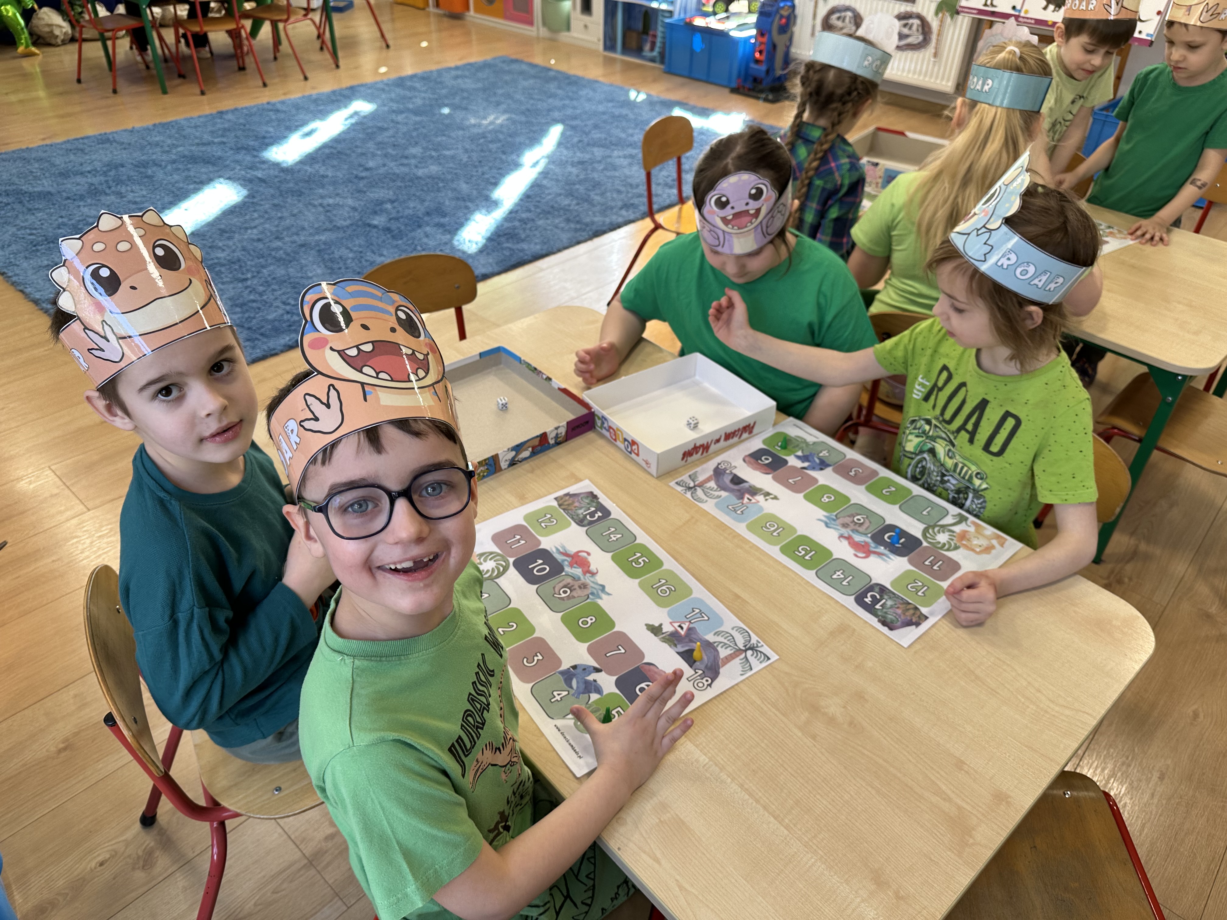 W naszej grupie odbył się Dzień Dinozaura, który dostarczył dzieciom wielu radosnych chwil oraz wzbogacił ich wiedzę o prehistorycznym świecie. Już od samego rana w sali został przygotowany kącik dinozaurów, w którym znalazły się figurki, książki oraz ilustracje przedstawiające różne gatunki tych niezwykłych stworzeń. Jedną z pierwszych aktywności była zabawa w paleontologów. Dzieci z ogromnym zaangażowaniem poszukiwały ukrytych „skamieniałości” i figurek dinozaurów, ucząc się przy tym, na czym polega praca naukowca badającego przeszłość Ziemi. Następnie wspólnie segregowały dinozaury na roślinożerne i mięsożerne, poznając ich charakterystyczne cechy oraz sposób odżywiania. Kolejnym punktem programu były „Dino-malowanki” – przestrzenna praca plastyczna, podczas której dzieci rozwijały swoją wyobraźnię i zdolności manualne. Duże zainteresowanie wzbudził również eksperyment „Wulkan”. Wykorzystując sodę i ocet, dzieci mogły zaobserwować efektowną „erupcję”, co było nie tylko świetną zabawą, ale także ciekawą lekcją przyrody. Nie zabrakło również aktywności ruchowych i gier. W „Wyścigach dinozaurów” dzieci sprawdzały, który dinozaur najszybciej dotrze do mety. Dużo emocji dostarczyła także gra „Dino droga”, w której zadaniem było bezpieczne przeprowadzenie dinozaurów przez prehistoryczny krajobraz pełen przygód i niespodzianek. Na zakończenie odbył się quiz sprawdzający wiadomości o dinozaurach. Dzieci wykazały się dużą wiedzą i zaangażowaniem. Dzień zakończył się wykonaniem pamiątkowej fotografii, która będzie miłym wspomnieniem wspólnie spędzonego czasu. Obchody Dnia Dinozaura były nie tylko okazją do świetnej zabawy, ale również do zdobywania nowych informacji i rozwijania zainteresowań przyrodniczych.