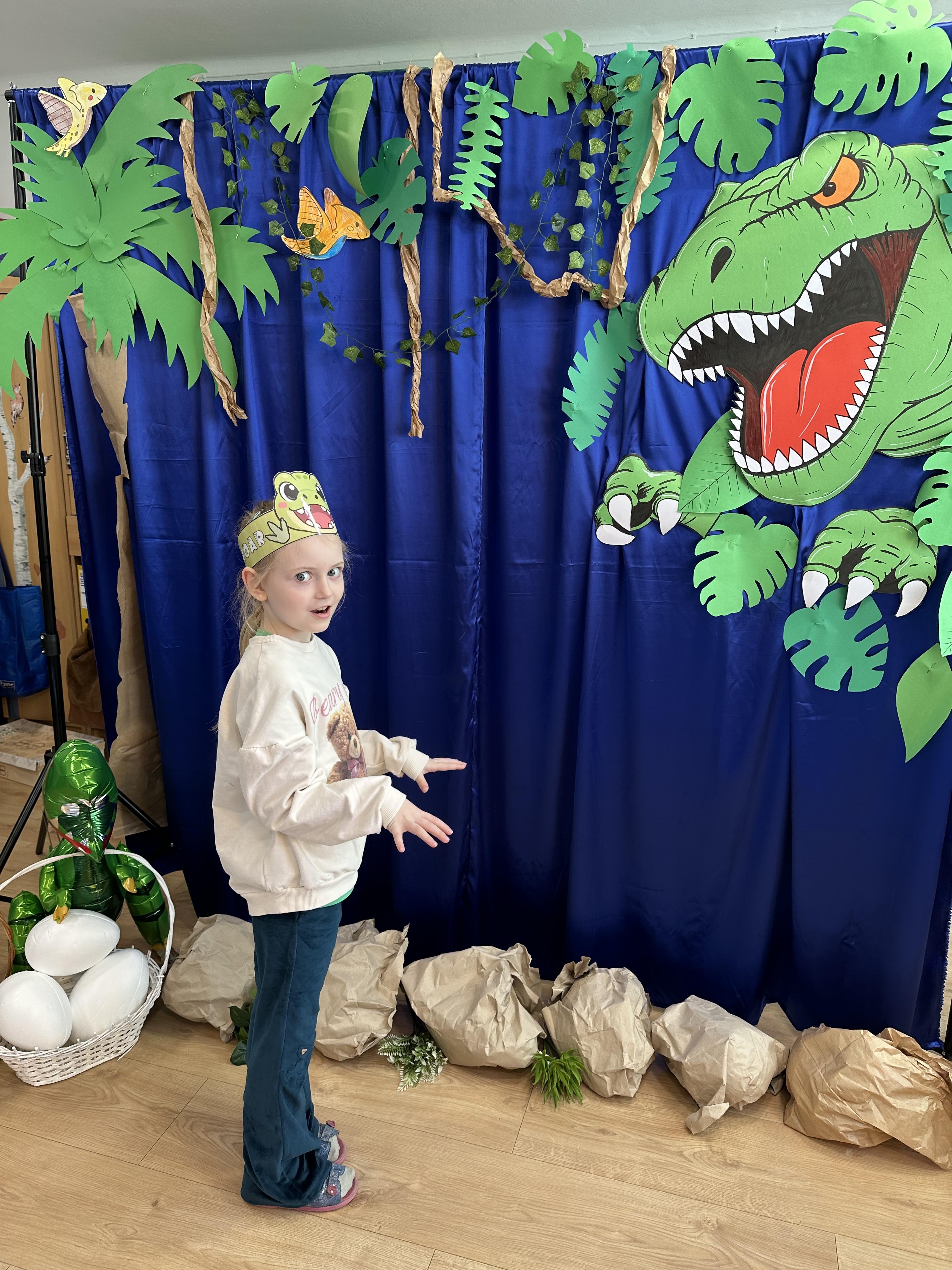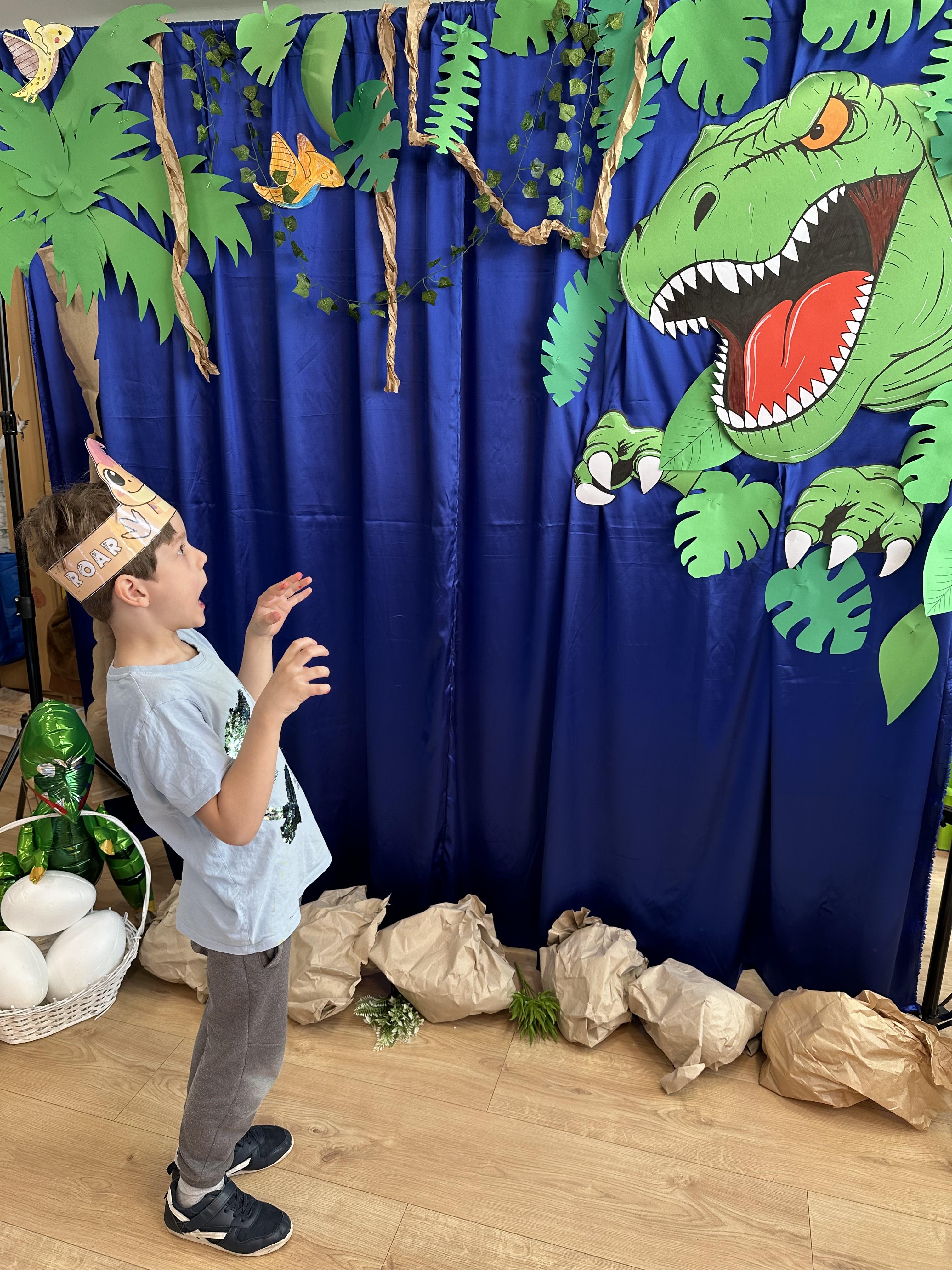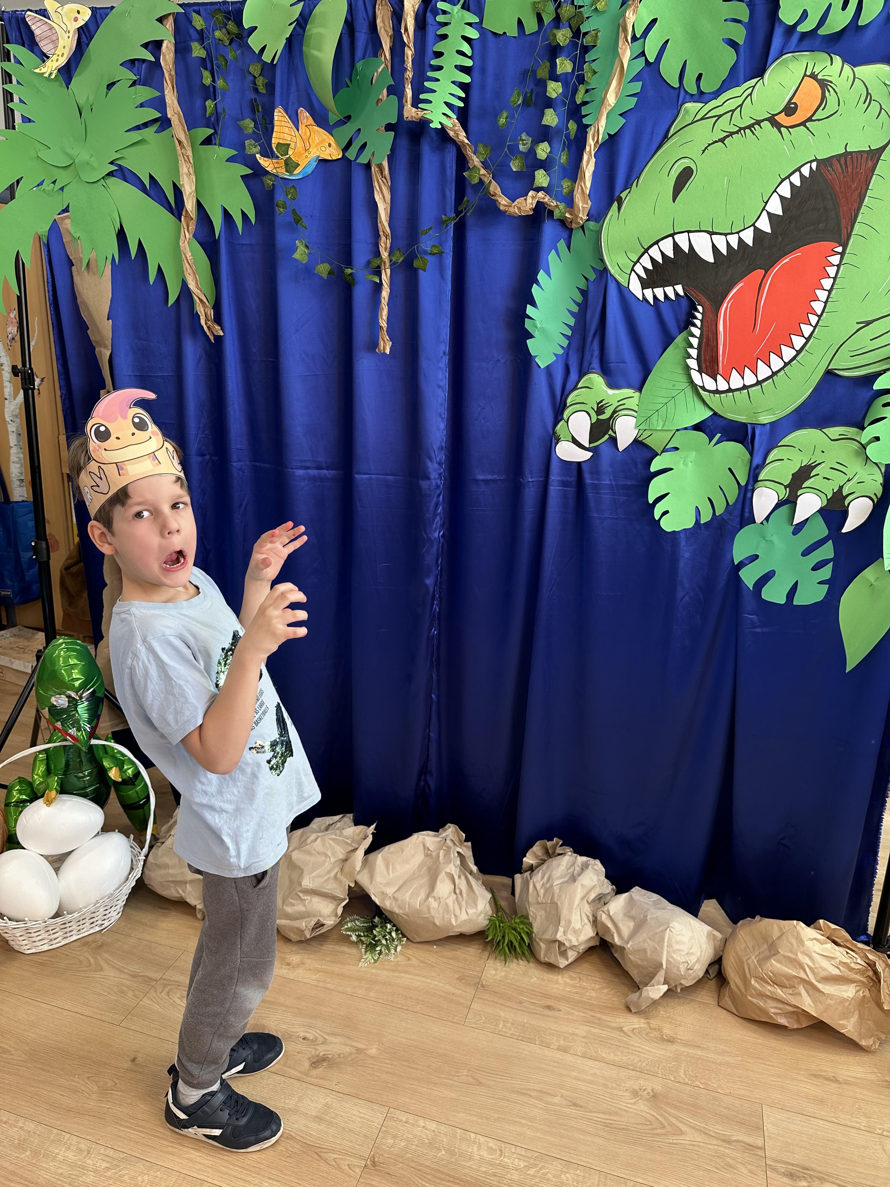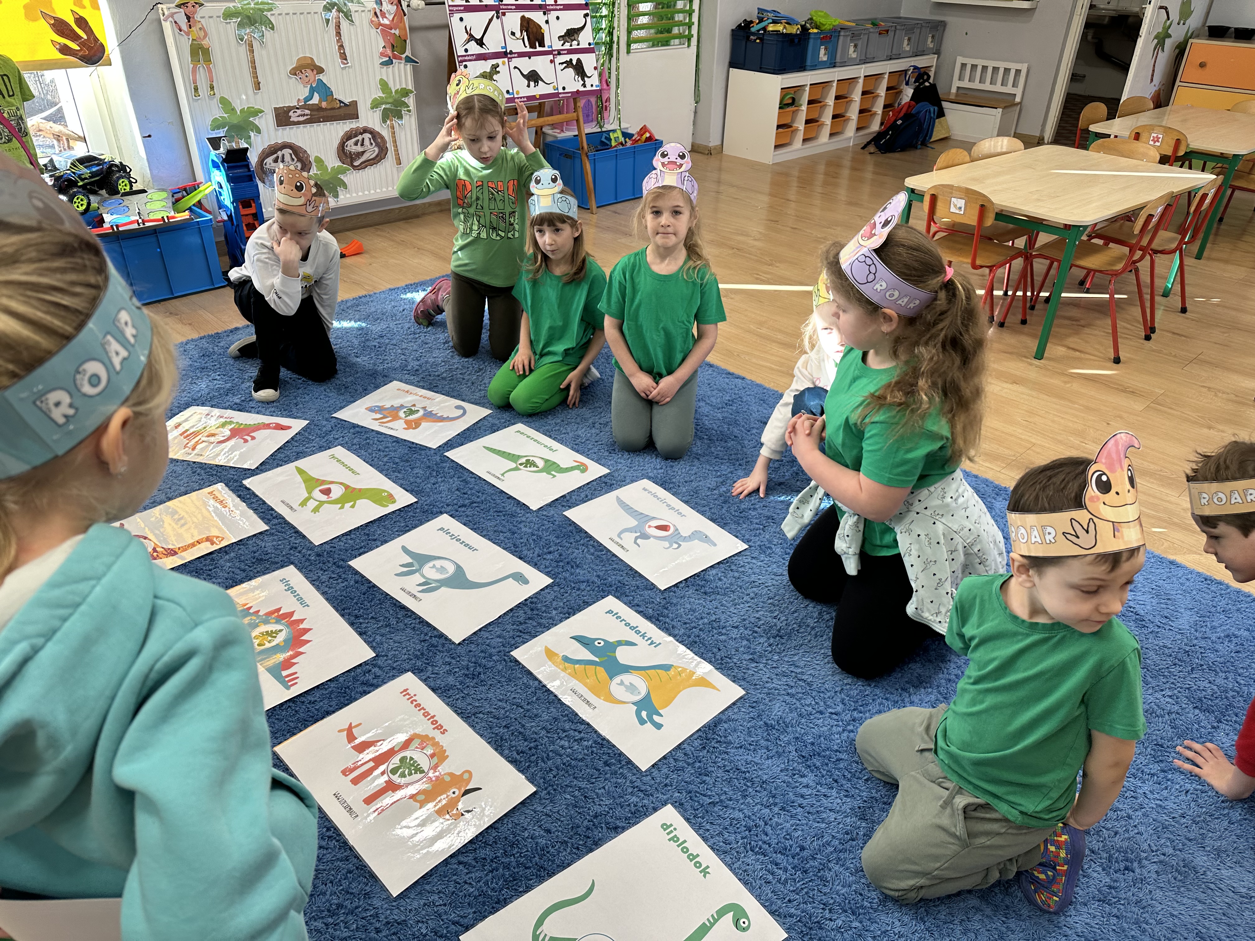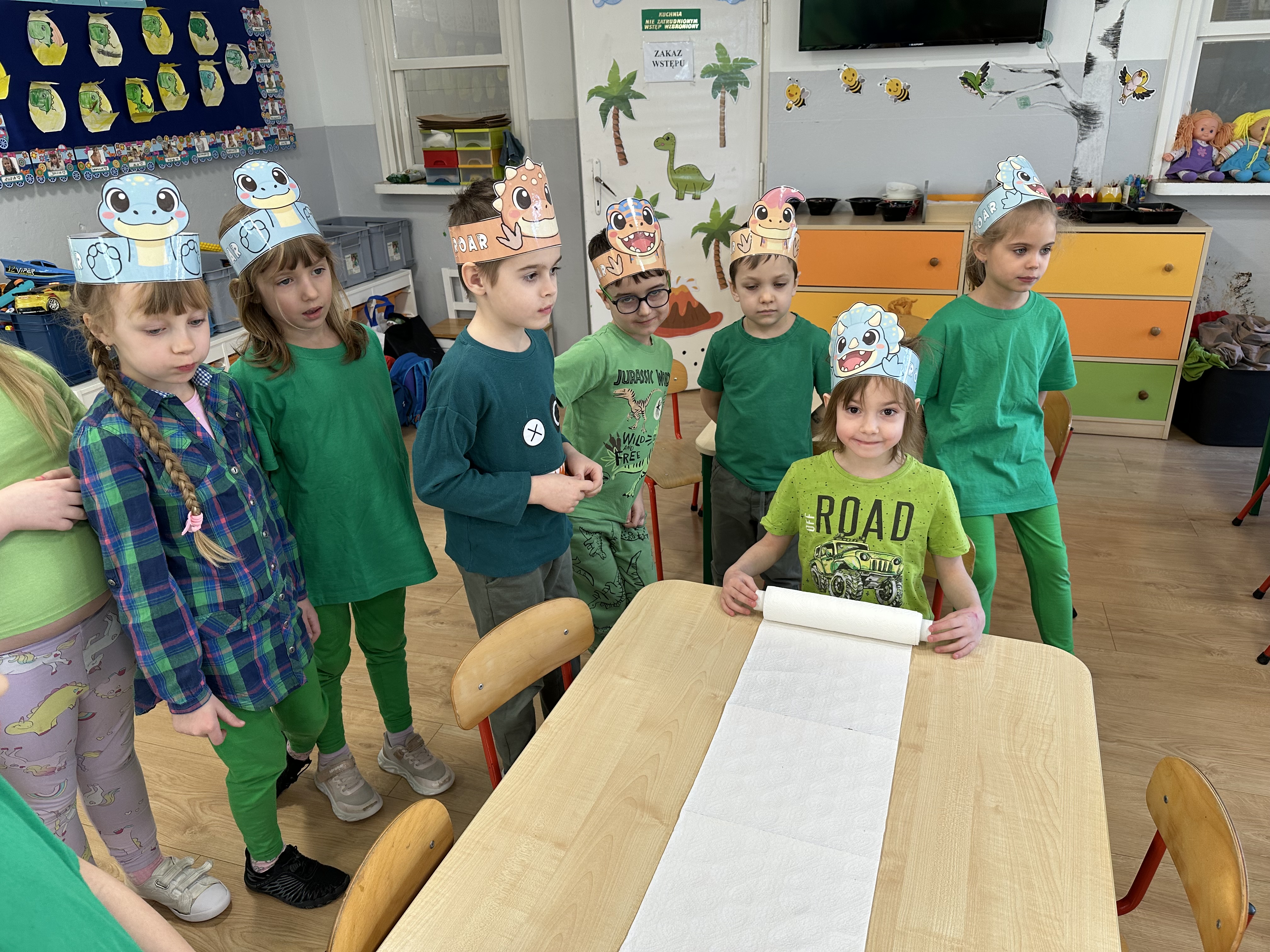 W naszej grupie odbył się Dzień Dinozaura, który dostarczył dzieciom wielu radosnych chwil oraz wzbogacił ich wiedzę o prehistorycznym świecie. Już od samego rana w sali został przygotowany kącik dinozaurów, w którym znalazły się figurki, książki oraz ilustracje przedstawiające różne gatunki tych niezwykłych stworzeń. Jedną z pierwszych aktywności była zabawa w paleontologów. Dzieci z ogromnym zaangażowaniem poszukiwały ukrytych „skamieniałości” i figurek dinozaurów, ucząc się przy tym, na czym polega praca naukowca badającego przeszłość Ziemi. Następnie wspólnie segregowały dinozaury na roślinożerne i mięsożerne, poznając ich charakterystyczne cechy oraz sposób odżywiania. Kolejnym punktem programu były „Dino-malowanki” – przestrzenna praca plastyczna, podczas której dzieci rozwijały swoją wyobraźnię i zdolności manualne. Duże zainteresowanie wzbudził również eksperyment „Wulkan”. Wykorzystując sodę i ocet, dzieci mogły zaobserwować efektowną „erupcję”, co było nie tylko świetną zabawą, ale także ciekawą lekcją przyrody. Nie zabrakło również aktywności ruchowych i gier. W „Wyścigach dinozaurów” dzieci sprawdzały, który dinozaur najszybciej dotrze do mety. Dużo emocji dostarczyła także gra „Dino droga”, w której zadaniem było bezpieczne przeprowadzenie dinozaurów przez prehistoryczny krajobraz pełen przygód i niespodzianek. Na zakończenie odbył się quiz sprawdzający wiadomości o dinozaurach. Dzieci wykazały się dużą wiedzą i zaangażowaniem. Dzień zakończył się wykonaniem pamiątkowej fotografii, która będzie miłym wspomnieniem wspólnie spędzonego czasu. Obchody Dnia Dinozaura były nie tylko okazją do świetnej zabawy, ale również do zdobywania nowych informacji i rozwijania zainteresowań przyrodniczych.