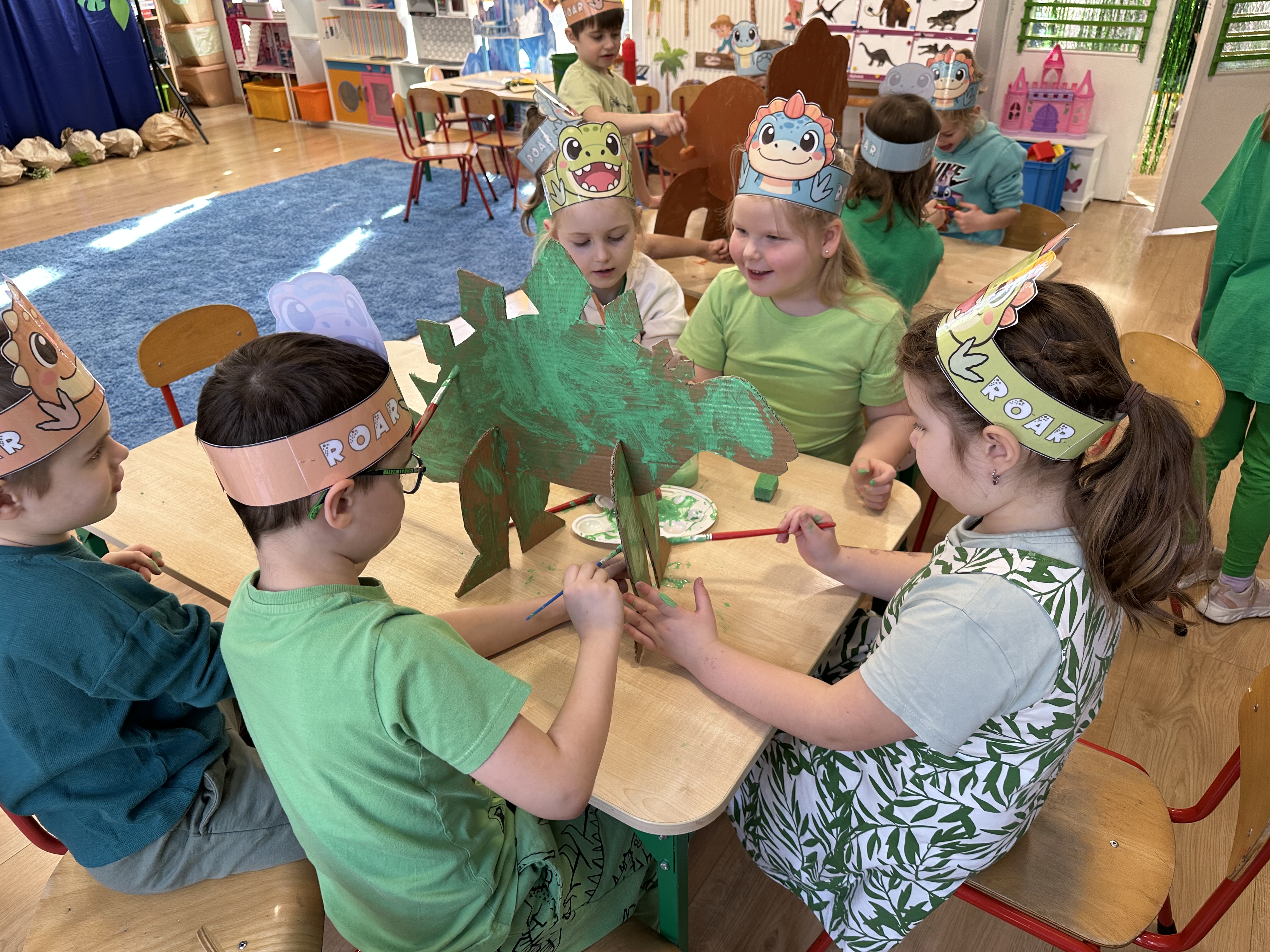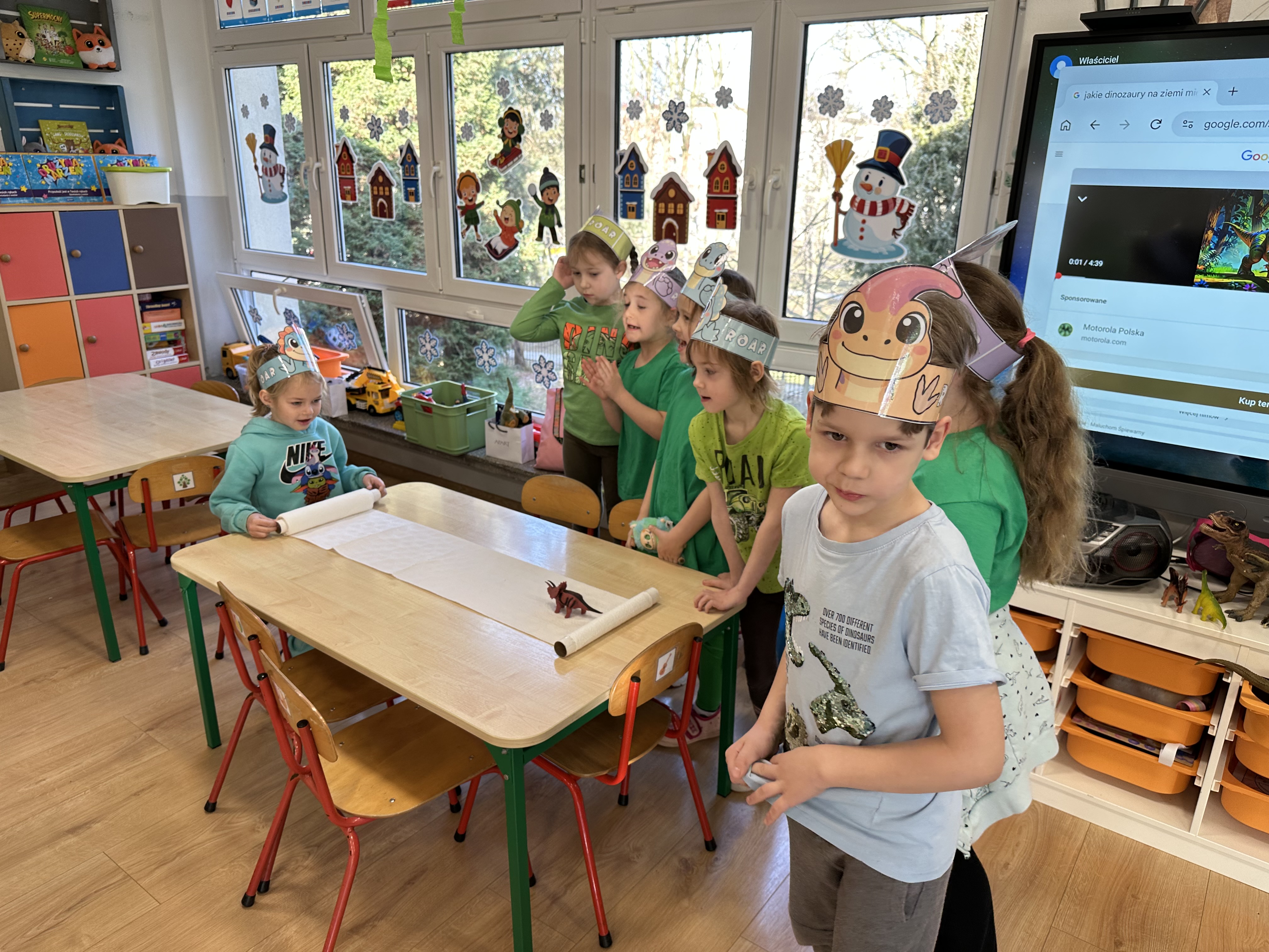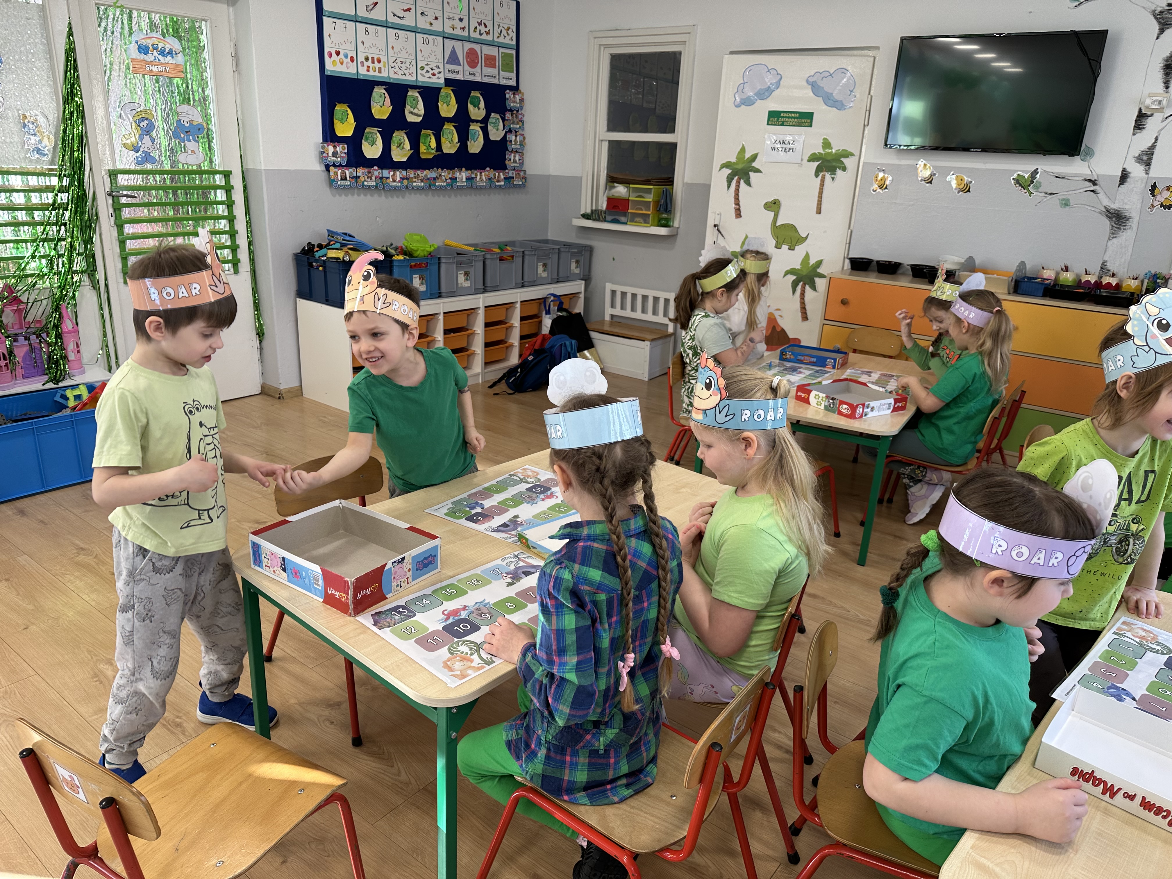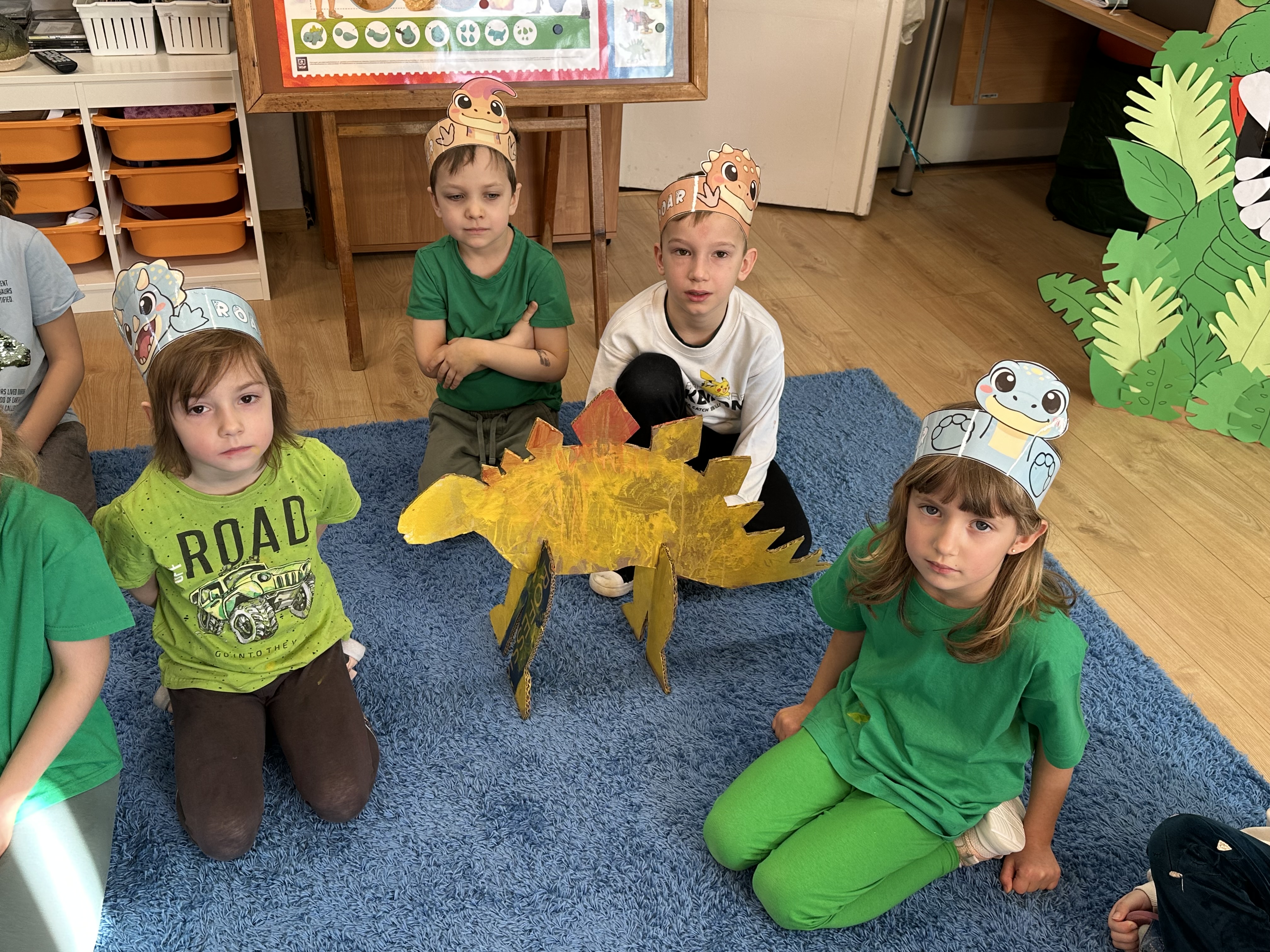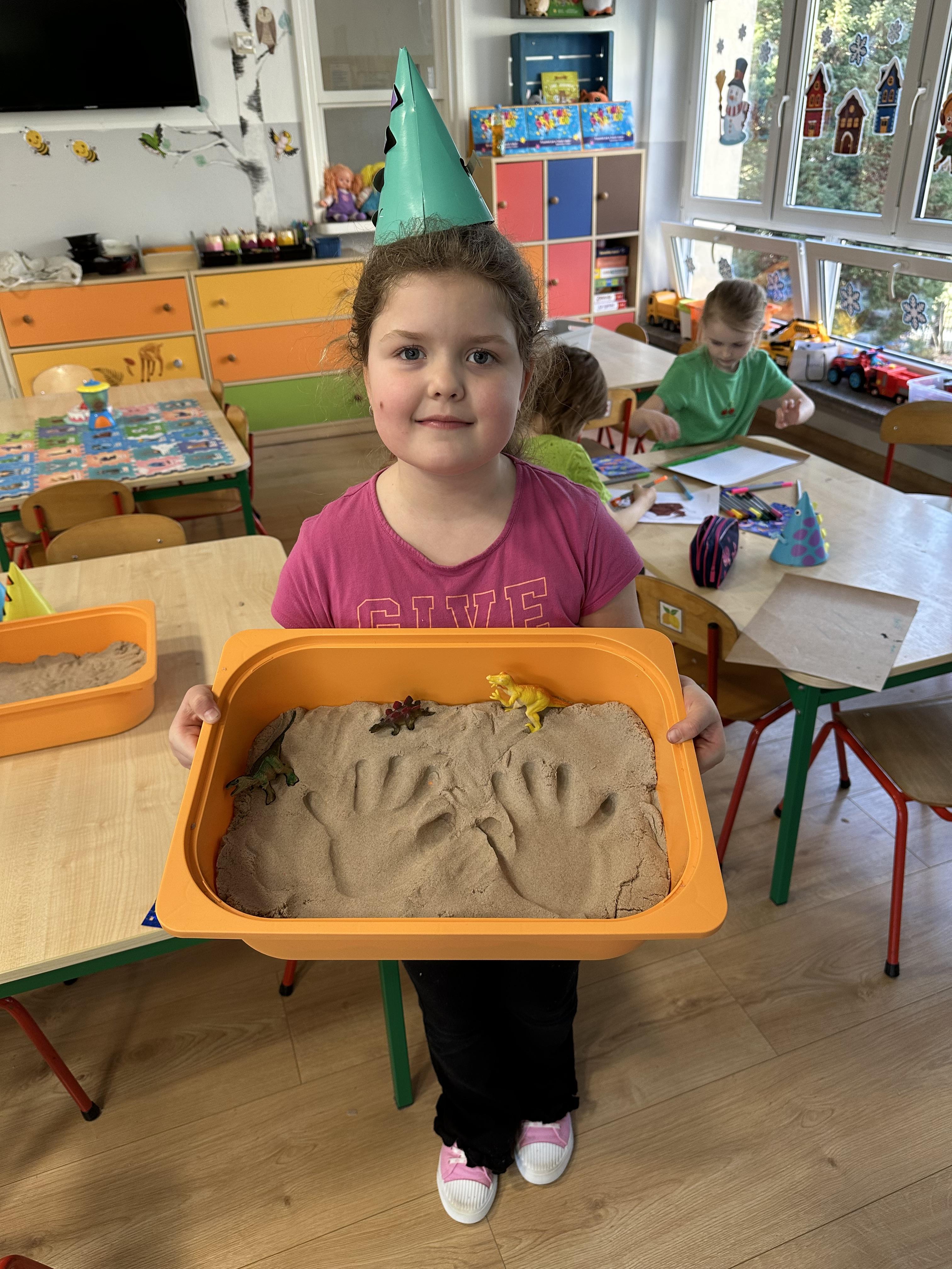 W naszej grupie odbył się Dzień Dinozaura, który dostarczył dzieciom wielu radosnych chwil oraz wzbogacił ich wiedzę o prehistorycznym świecie. Już od samego rana w sali został przygotowany kącik dinozaurów, w którym znalazły się figurki, książki oraz ilustracje przedstawiające różne gatunki tych niezwykłych stworzeń. Jedną z pierwszych aktywności była zabawa w paleontologów. Dzieci z ogromnym zaangażowaniem poszukiwały ukrytych „skamieniałości” i figurek dinozaurów, ucząc się przy tym, na czym polega praca naukowca badającego przeszłość Ziemi. Następnie wspólnie segregowały dinozaury na roślinożerne i mięsożerne, poznając ich charakterystyczne cechy oraz sposób odżywiania. Kolejnym punktem programu były „Dino-malowanki” – przestrzenna praca plastyczna, podczas której dzieci rozwijały swoją wyobraźnię i zdolności manualne. Duże zainteresowanie wzbudził również eksperyment „Wulkan”. Wykorzystując sodę i ocet, dzieci mogły zaobserwować efektowną „erupcję”, co było nie tylko świetną zabawą, ale także ciekawą lekcją przyrody. Nie zabrakło również aktywności ruchowych i gier. W „Wyścigach dinozaurów” dzieci sprawdzały, który dinozaur najszybciej dotrze do mety. Dużo emocji dostarczyła także gra „Dino droga”, w której zadaniem było bezpieczne przeprowadzenie dinozaurów przez prehistoryczny krajobraz pełen przygód i niespodzianek. Na zakończenie odbył się quiz sprawdzający wiadomości o dinozaurach. Dzieci wykazały się dużą wiedzą i zaangażowaniem. Dzień zakończył się wykonaniem pamiątkowej fotografii, która będzie miłym wspomnieniem wspólnie spędzonego czasu. Obchody Dnia Dinozaura były nie tylko okazją do świetnej zabawy, ale również do zdobywania nowych informacji i rozwijania zainteresowań przyrodniczych.