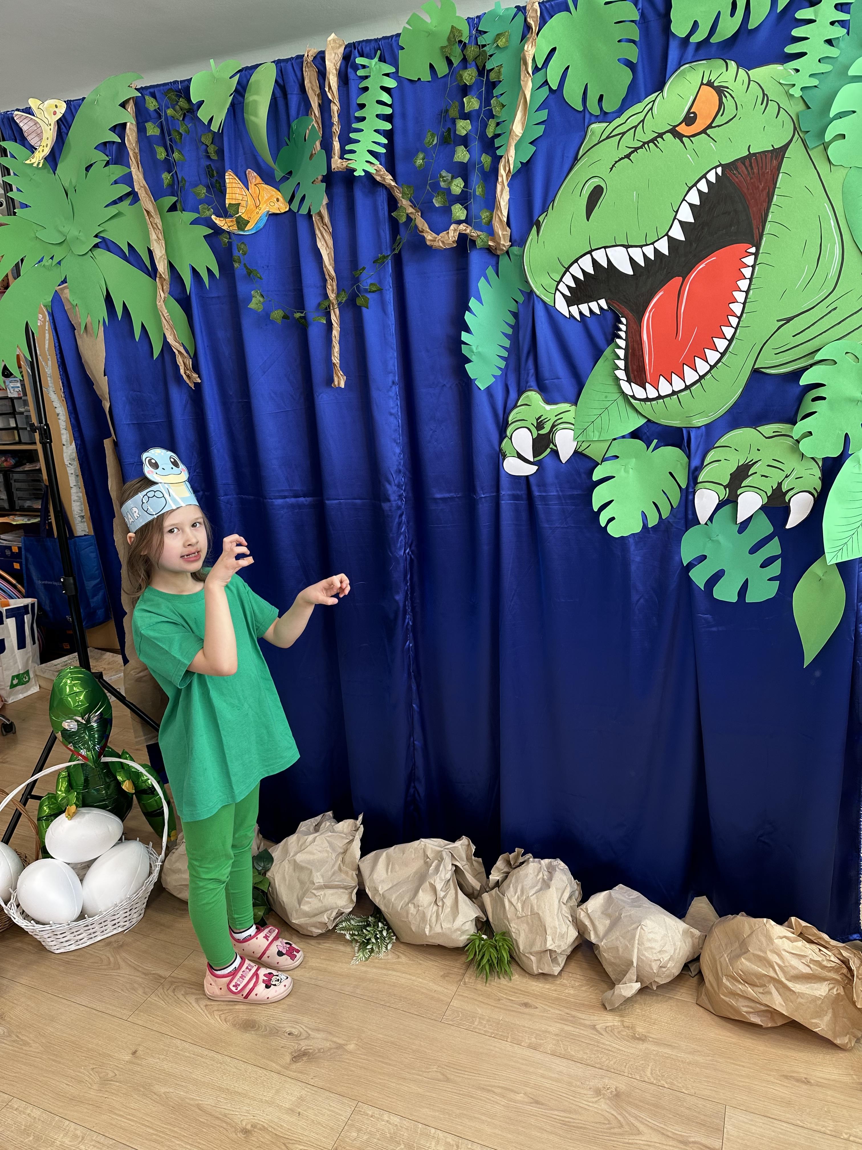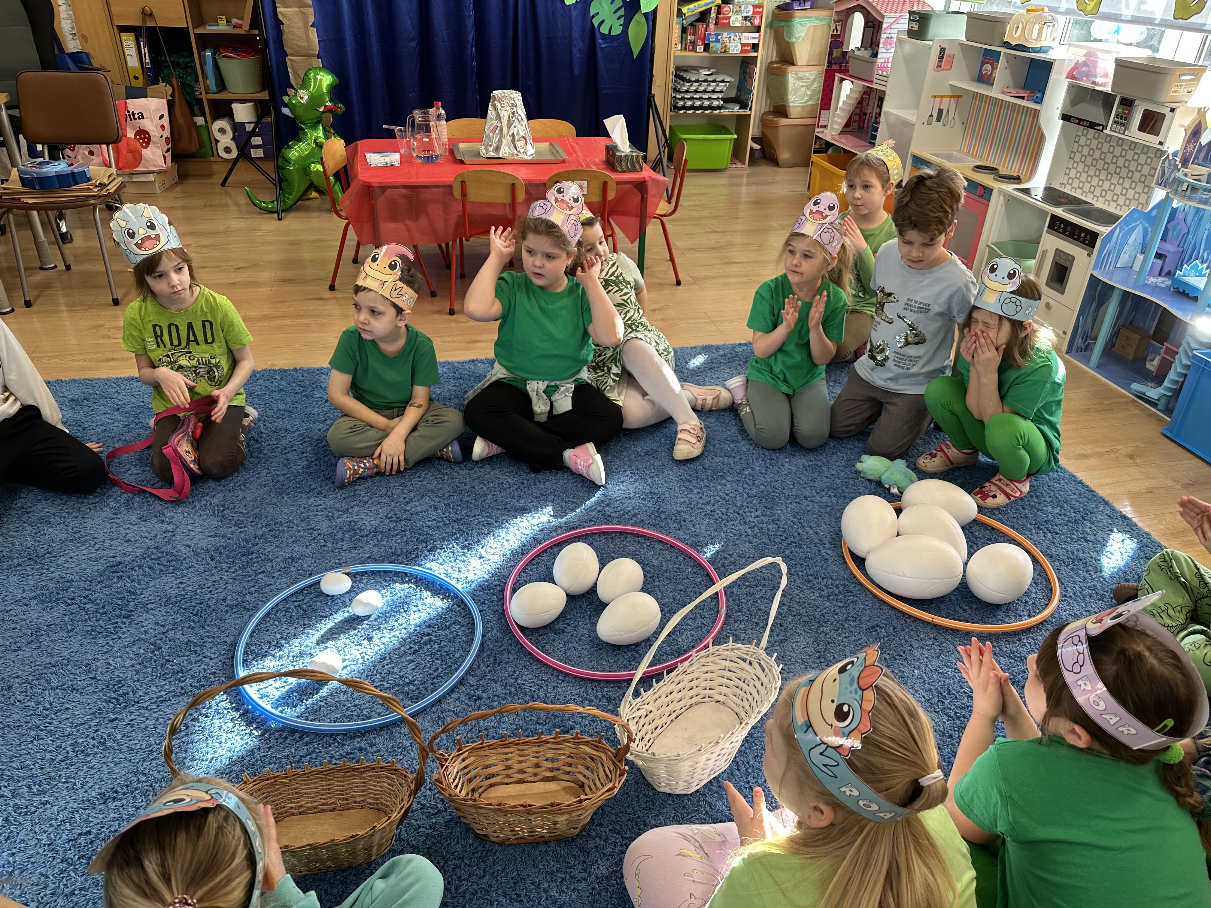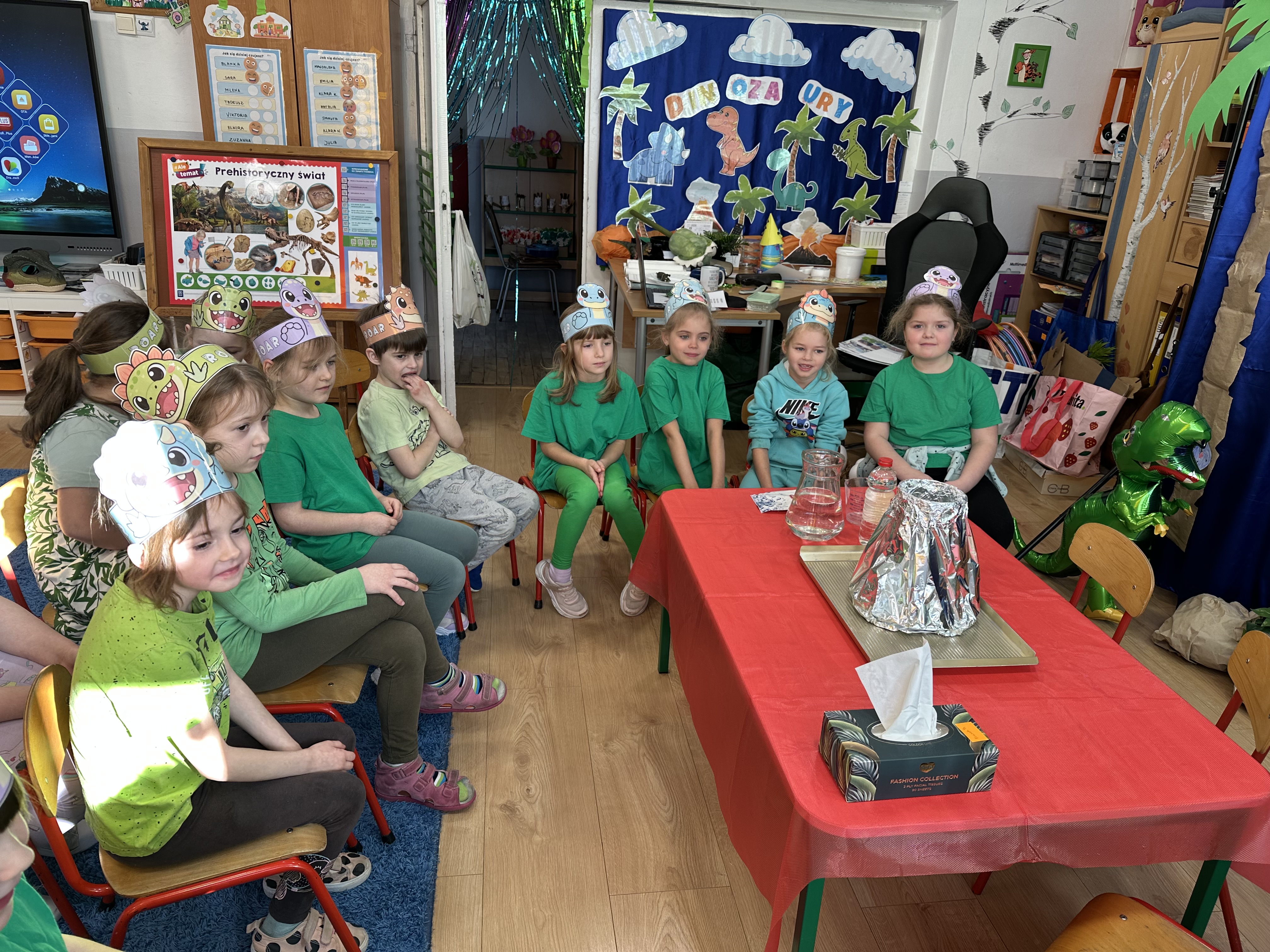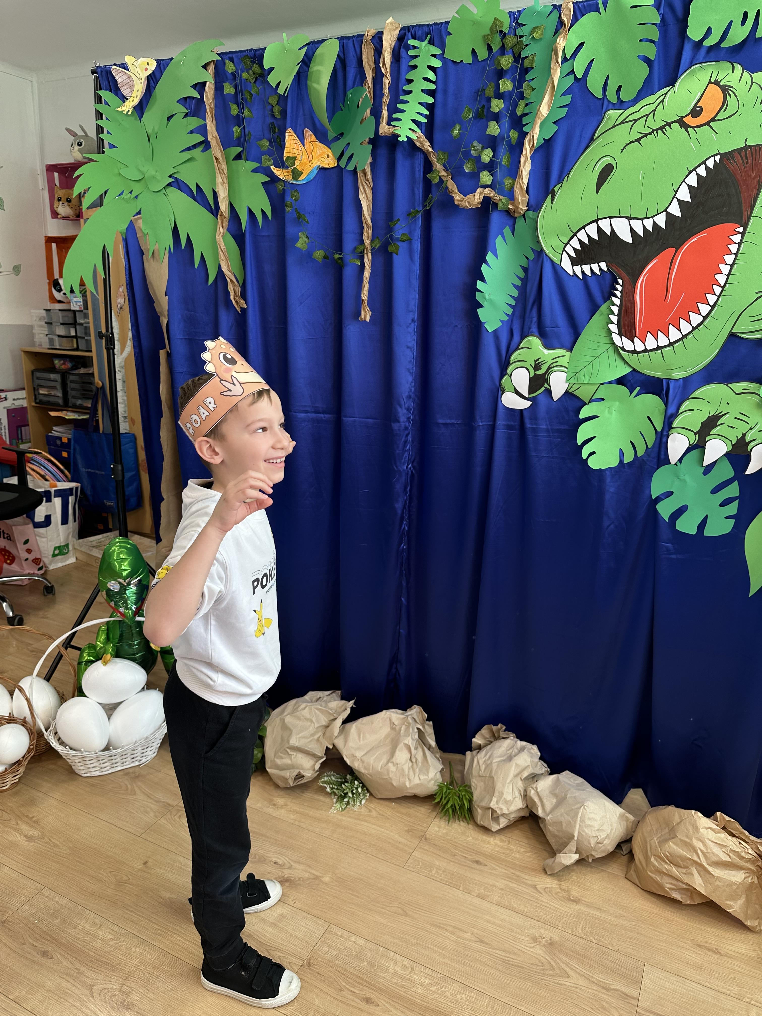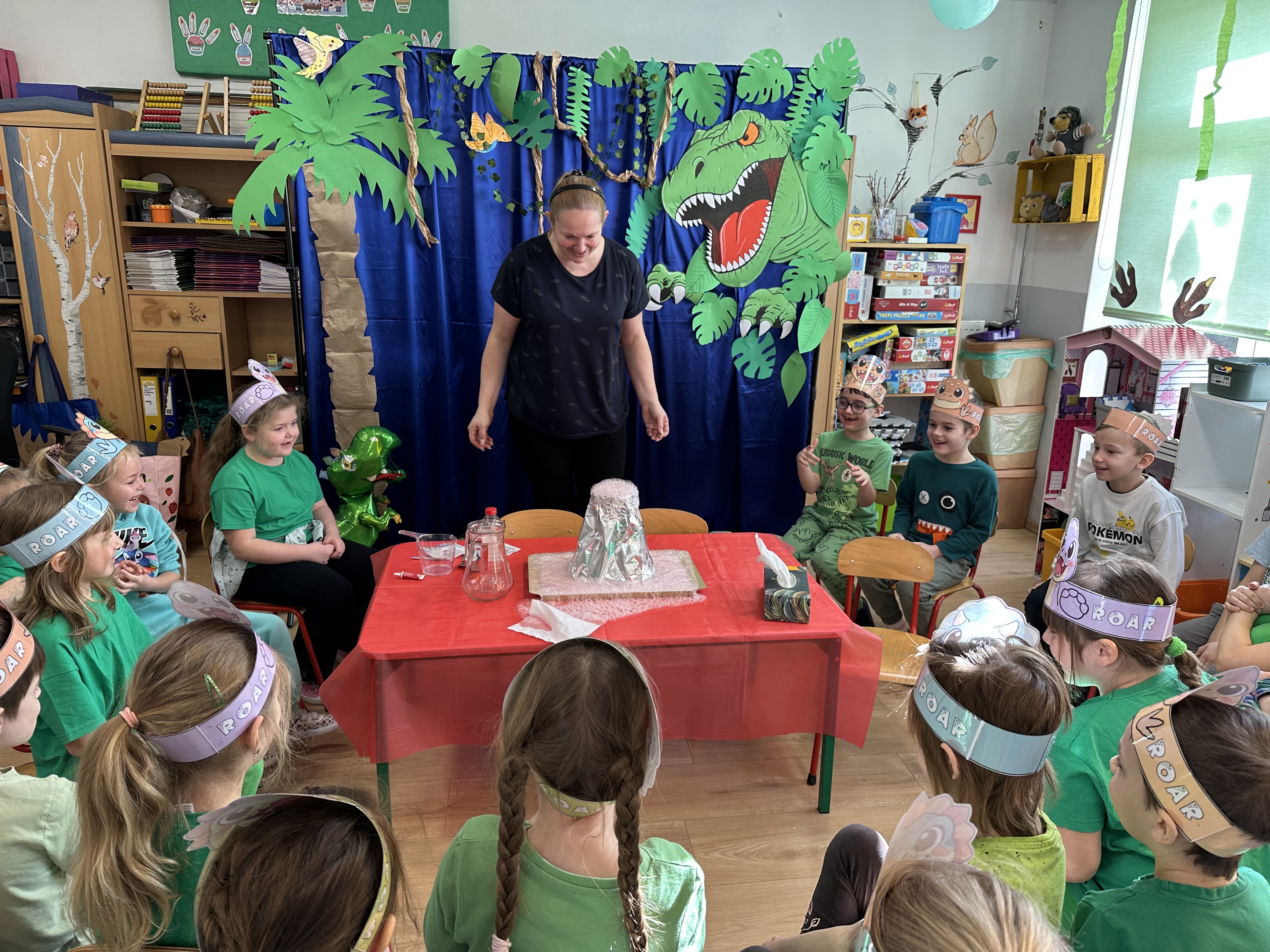 W naszej grupie odbył się Dzień Dinozaura, który dostarczył dzieciom wielu radosnych chwil oraz wzbogacił ich wiedzę o prehistorycznym świecie. Już od samego rana w sali został przygotowany kącik dinozaurów, w którym znalazły się figurki, książki oraz ilustracje przedstawiające różne gatunki tych niezwykłych stworzeń. Jedną z pierwszych aktywności była zabawa w paleontologów. Dzieci z ogromnym zaangażowaniem poszukiwały ukrytych „skamieniałości” i figurek dinozaurów, ucząc się przy tym, na czym polega praca naukowca badającego przeszłość Ziemi. Następnie wspólnie segregowały dinozaury na roślinożerne i mięsożerne, poznając ich charakterystyczne cechy oraz sposób odżywiania. Kolejnym punktem programu były „Dino-malowanki” – przestrzenna praca plastyczna, podczas której dzieci rozwijały swoją wyobraźnię i zdolności manualne. Duże zainteresowanie wzbudził również eksperyment „Wulkan”. Wykorzystując sodę i ocet, dzieci mogły zaobserwować efektowną „erupcję”, co było nie tylko świetną zabawą, ale także ciekawą lekcją przyrody. Nie zabrakło również aktywności ruchowych i gier. W „Wyścigach dinozaurów” dzieci sprawdzały, który dinozaur najszybciej dotrze do mety. Dużo emocji dostarczyła także gra „Dino droga”, w której zadaniem było bezpieczne przeprowadzenie dinozaurów przez prehistoryczny krajobraz pełen przygód i niespodzianek. Na zakończenie odbył się quiz sprawdzający wiadomości o dinozaurach. Dzieci wykazały się dużą wiedzą i zaangażowaniem. Dzień zakończył się wykonaniem pamiątkowej fotografii, która będzie miłym wspomnieniem wspólnie spędzonego czasu. Obchody Dnia Dinozaura były nie tylko okazją do świetnej zabawy, ale również do zdobywania nowych informacji i rozwijania zainteresowań przyrodniczych.
