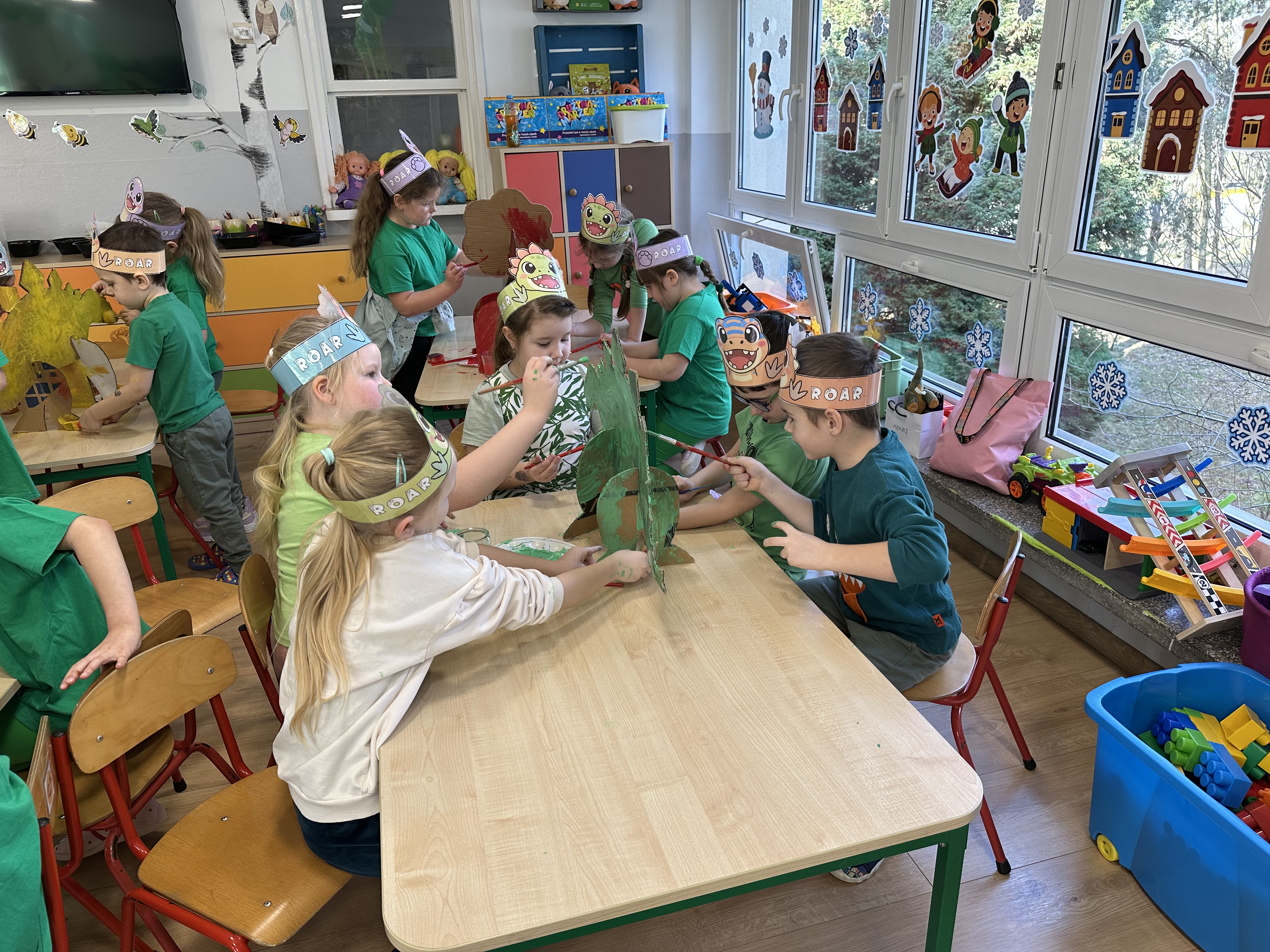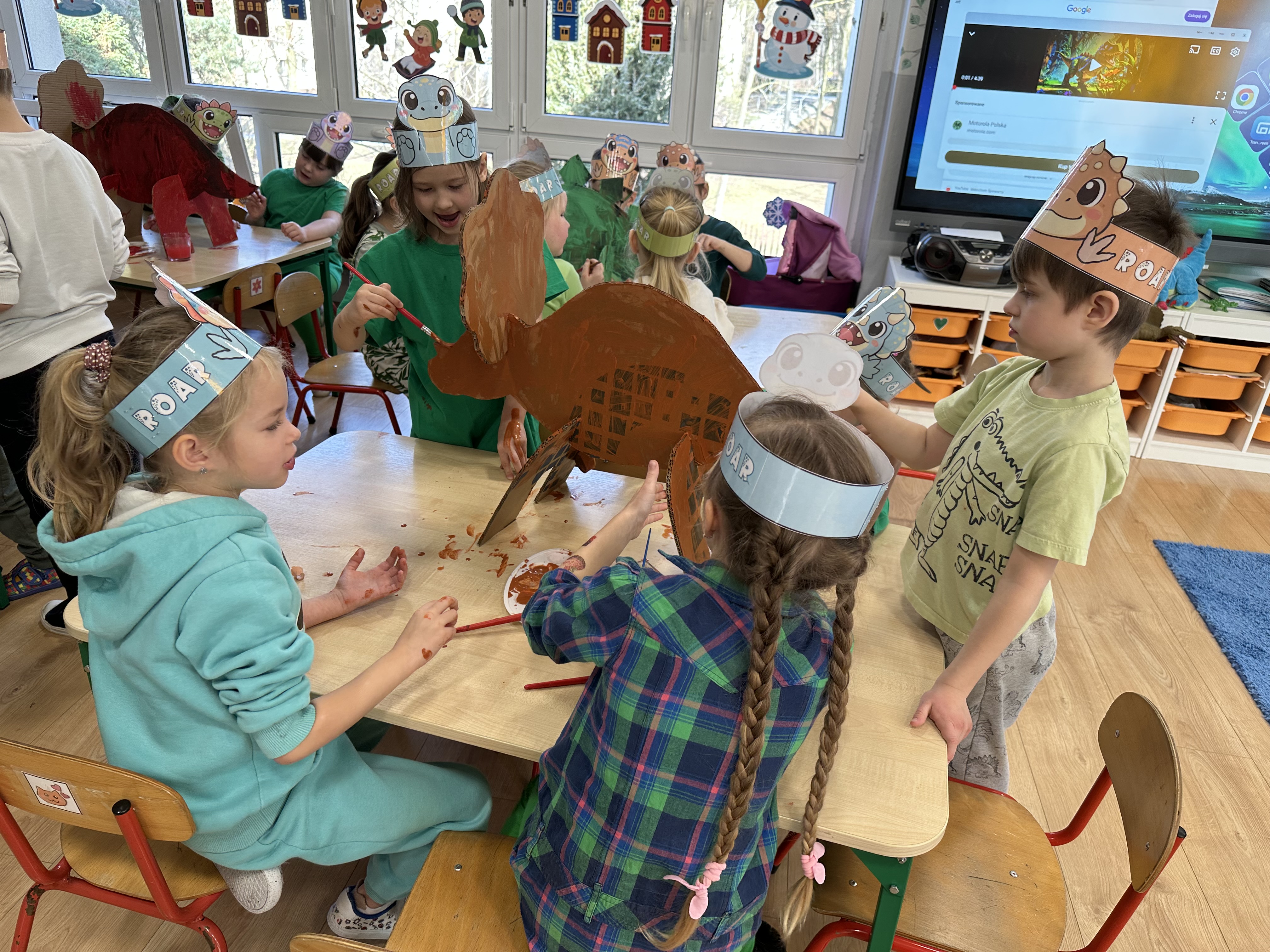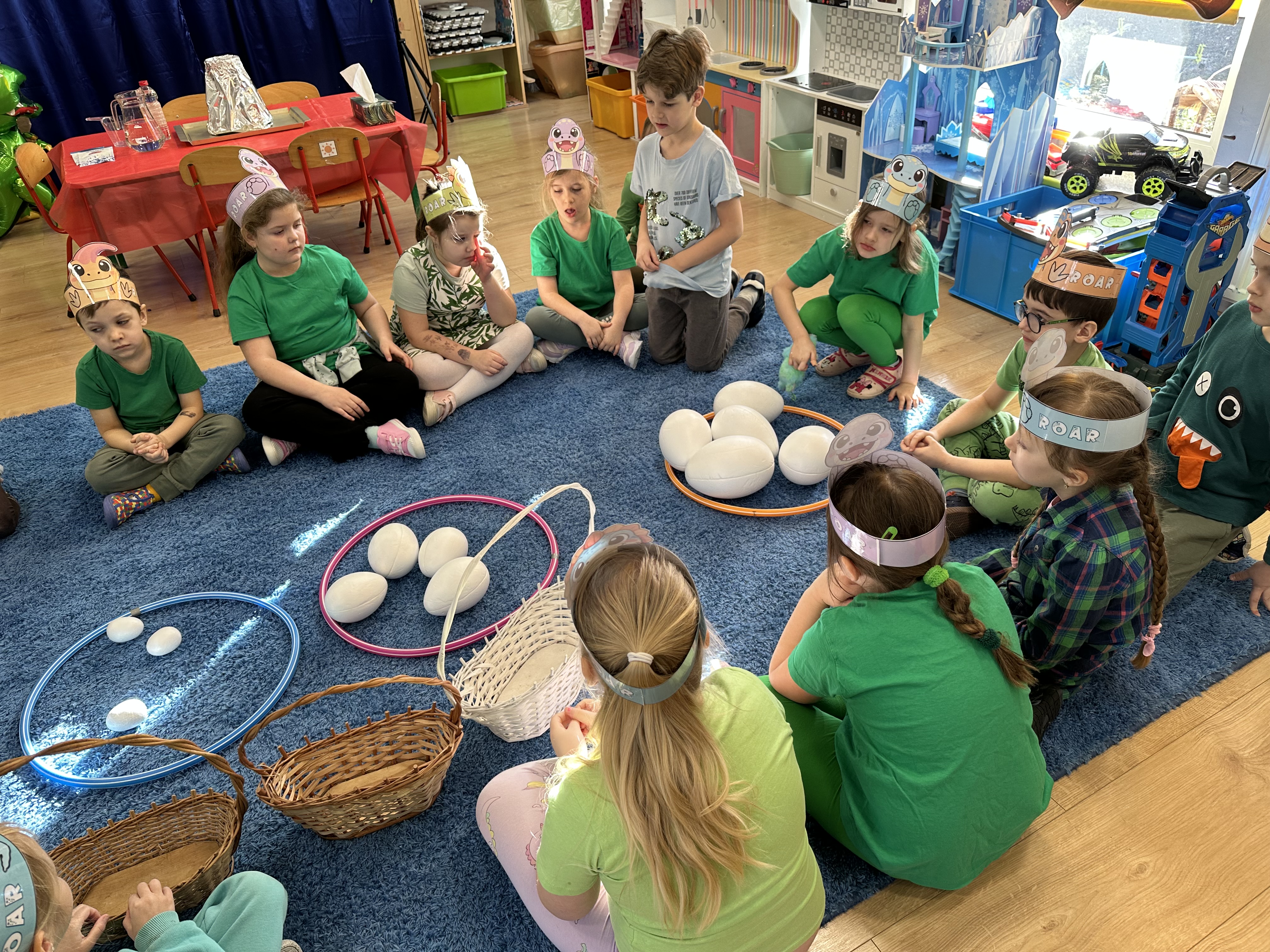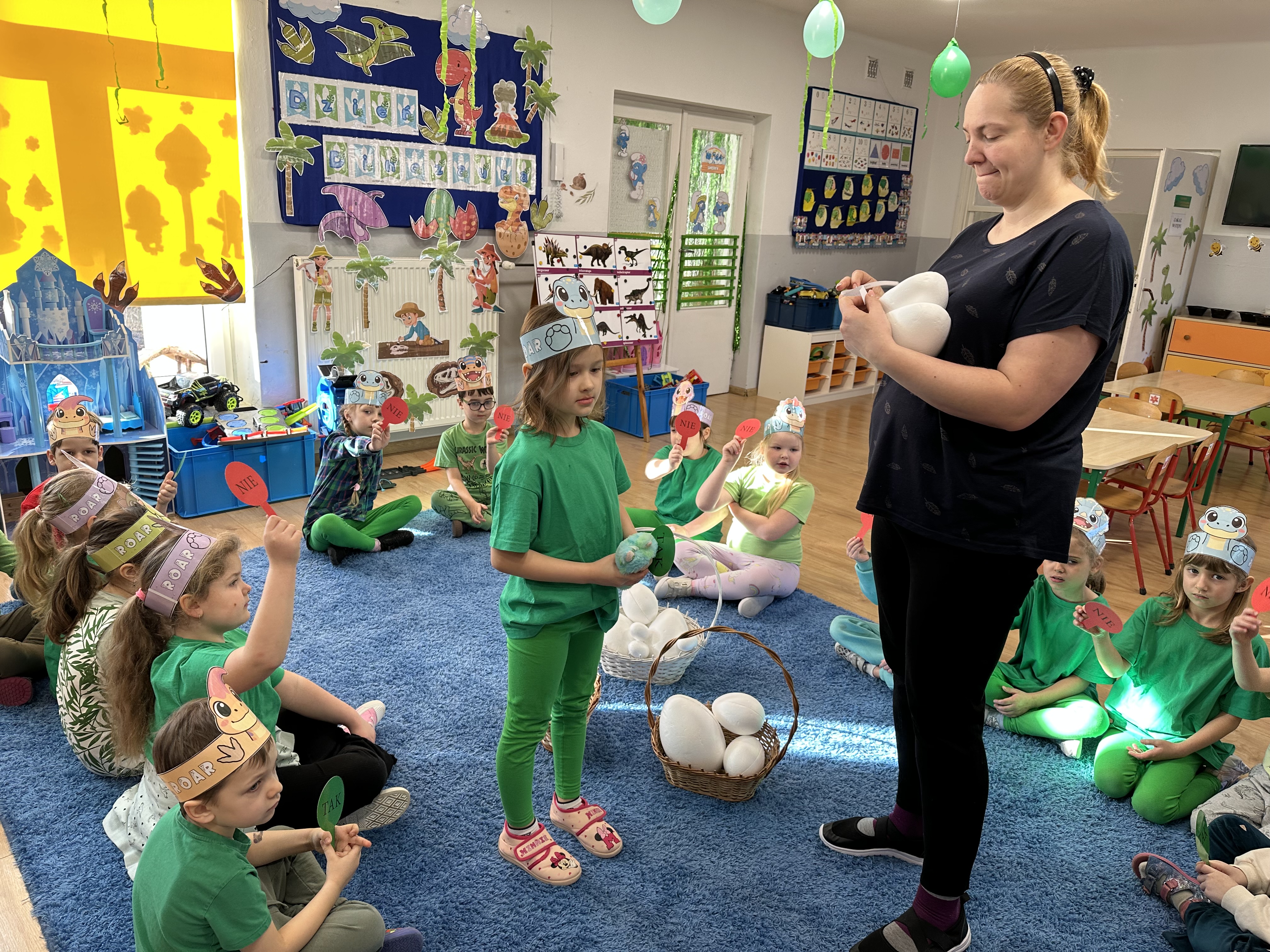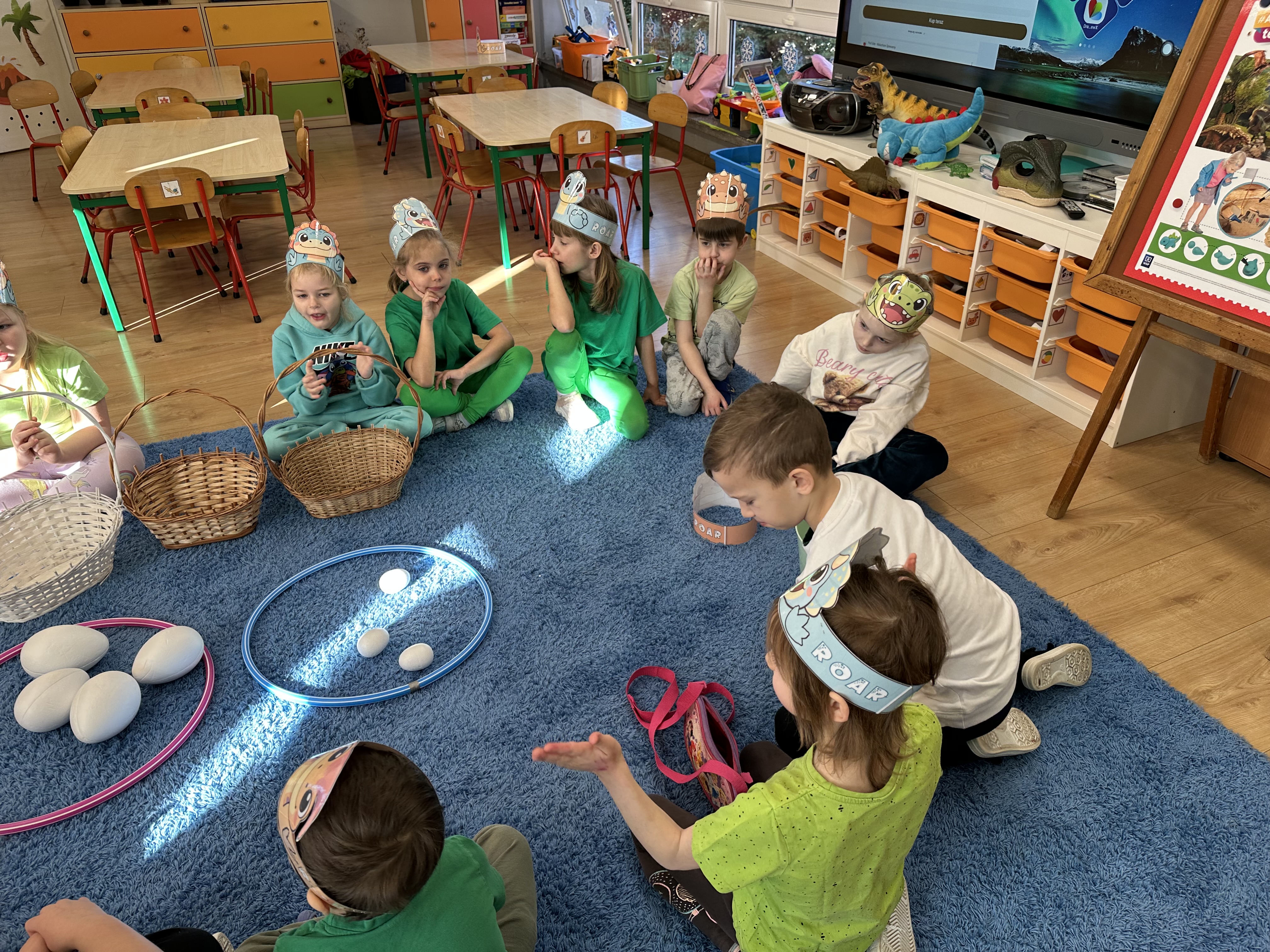 W naszej grupie odbył się Dzień Dinozaura, który dostarczył dzieciom wielu radosnych chwil oraz wzbogacił ich wiedzę o prehistorycznym świecie. Już od samego rana w sali został przygotowany kącik dinozaurów, w którym znalazły się figurki, książki oraz ilustracje przedstawiające różne gatunki tych niezwykłych stworzeń. Jedną z pierwszych aktywności była zabawa w paleontologów. Dzieci z ogromnym zaangażowaniem poszukiwały ukrytych „skamieniałości” i figurek dinozaurów, ucząc się przy tym, na czym polega praca naukowca badającego przeszłość Ziemi. Następnie wspólnie segregowały dinozaury na roślinożerne i mięsożerne, poznając ich charakterystyczne cechy oraz sposób odżywiania. Kolejnym punktem programu były „Dino-malowanki” – przestrzenna praca plastyczna, podczas której dzieci rozwijały swoją wyobraźnię i zdolności manualne. Duże zainteresowanie wzbudził również eksperyment „Wulkan”. Wykorzystując sodę i ocet, dzieci mogły zaobserwować efektowną „erupcję”, co było nie tylko świetną zabawą, ale także ciekawą lekcją przyrody. Nie zabrakło również aktywności ruchowych i gier. W „Wyścigach dinozaurów” dzieci sprawdzały, który dinozaur najszybciej dotrze do mety. Dużo emocji dostarczyła także gra „Dino droga”, w której zadaniem było bezpieczne przeprowadzenie dinozaurów przez prehistoryczny krajobraz pełen przygód i niespodzianek. Na zakończenie odbył się quiz sprawdzający wiadomości o dinozaurach. Dzieci wykazały się dużą wiedzą i zaangażowaniem. Dzień zakończył się wykonaniem pamiątkowej fotografii, która będzie miłym wspomnieniem wspólnie spędzonego czasu. Obchody Dnia Dinozaura były nie tylko okazją do świetnej zabawy, ale również do zdobywania nowych informacji i rozwijania zainteresowań przyrodniczych.