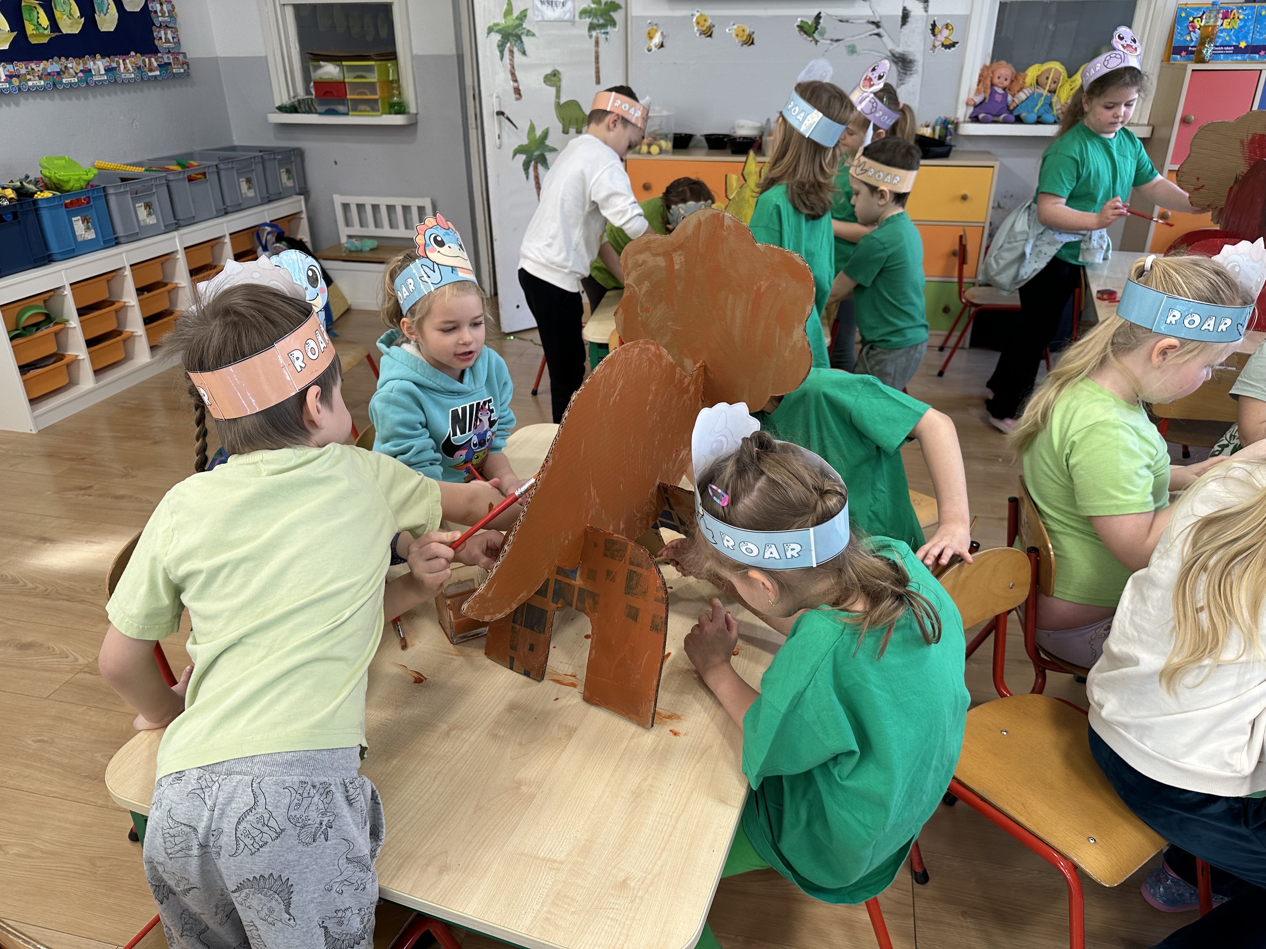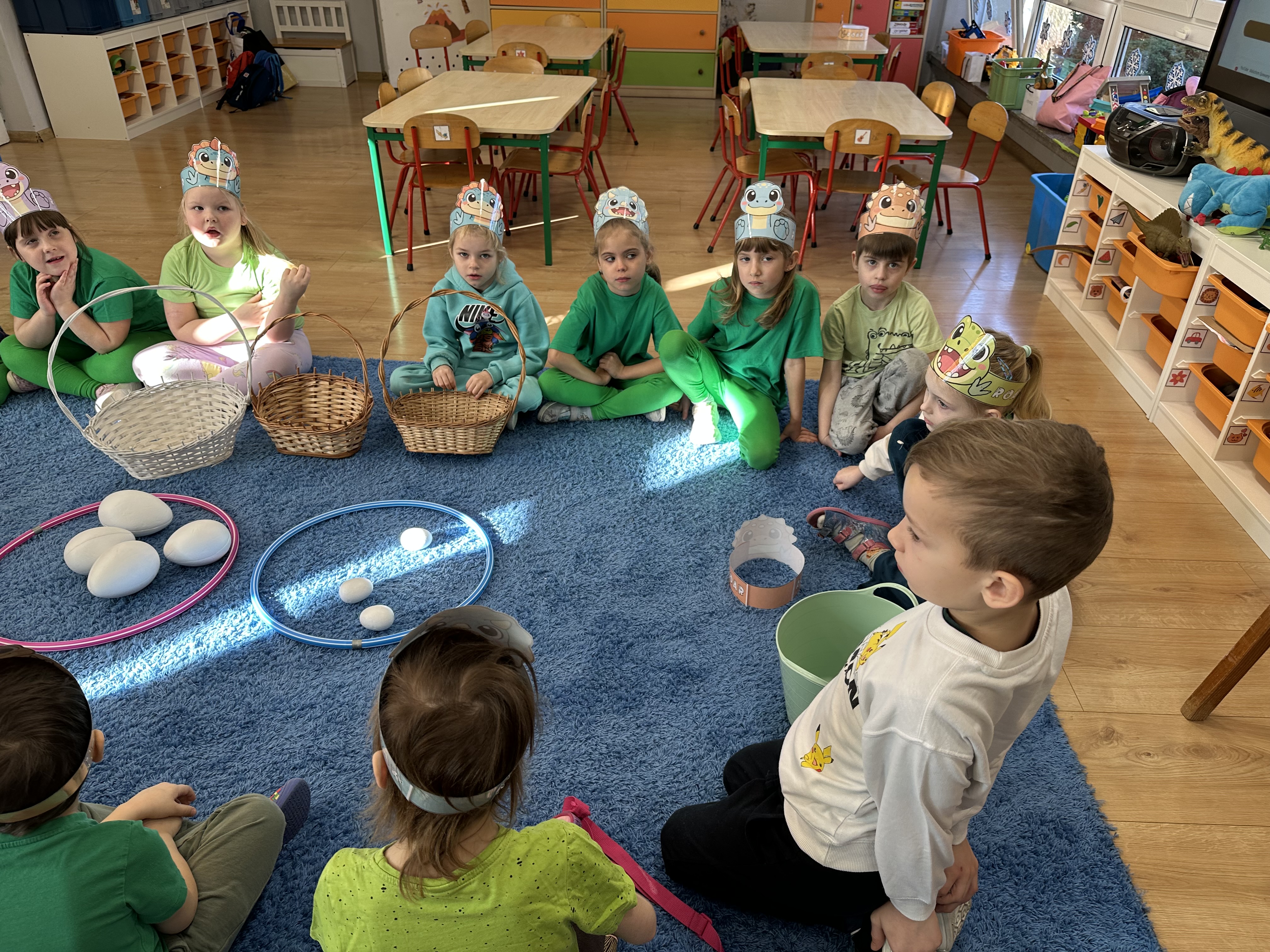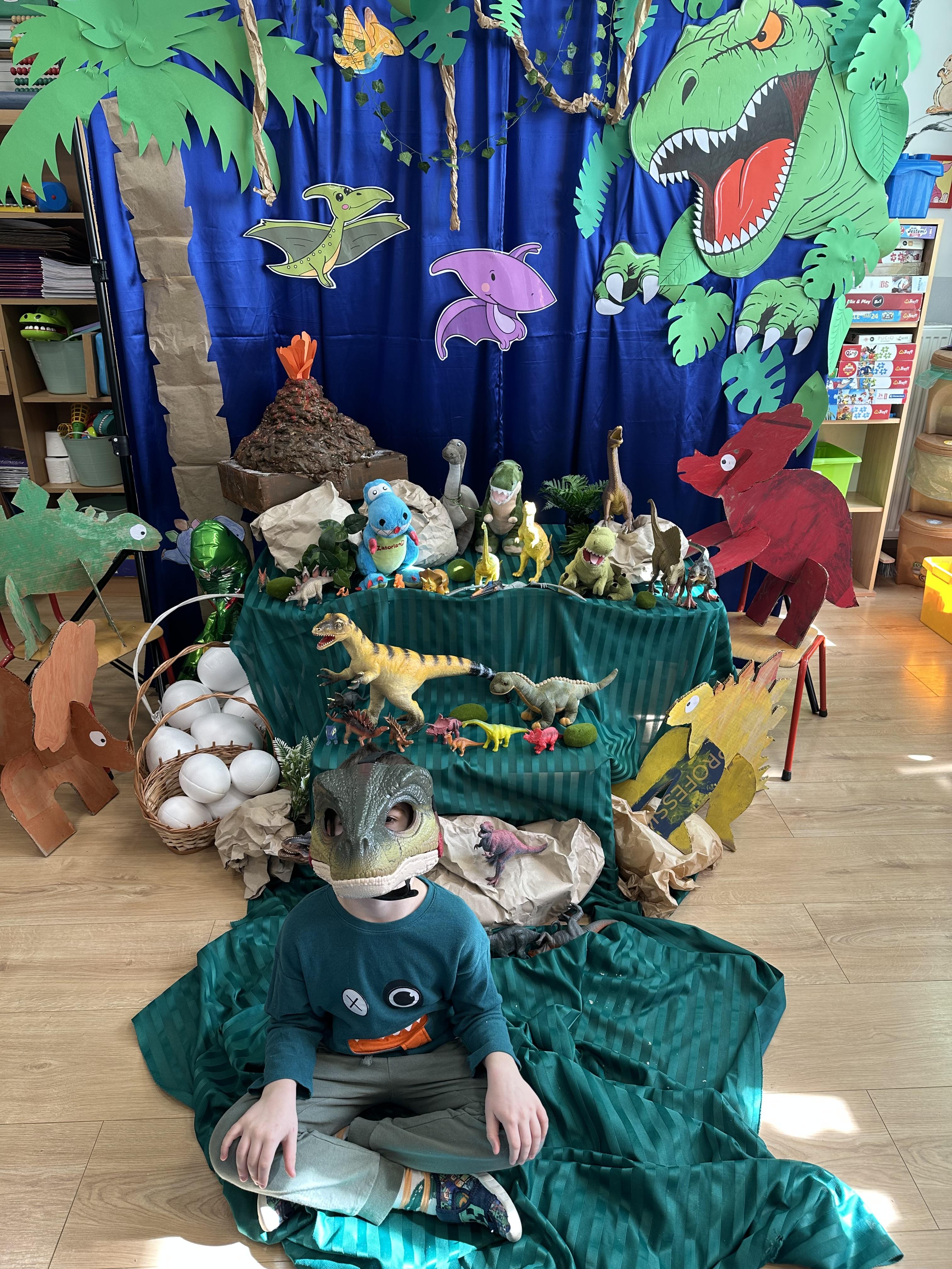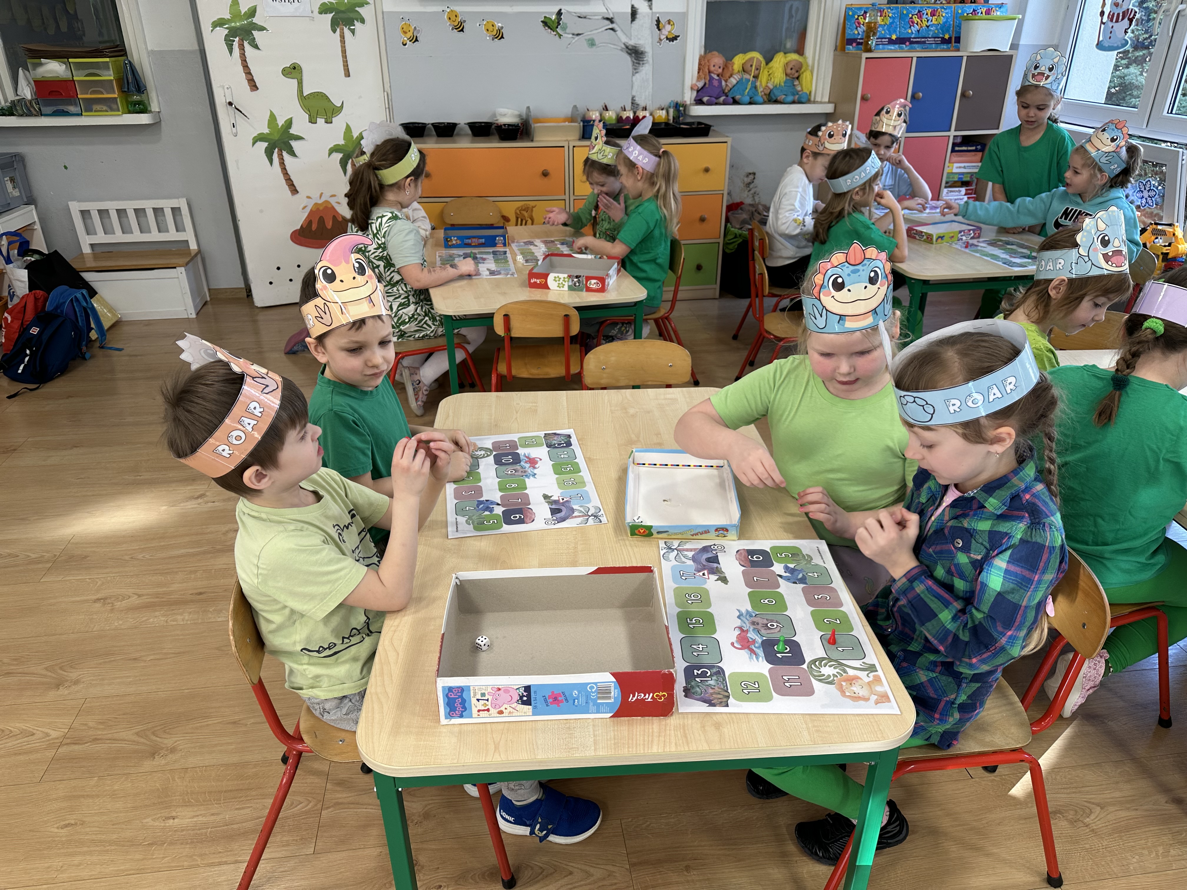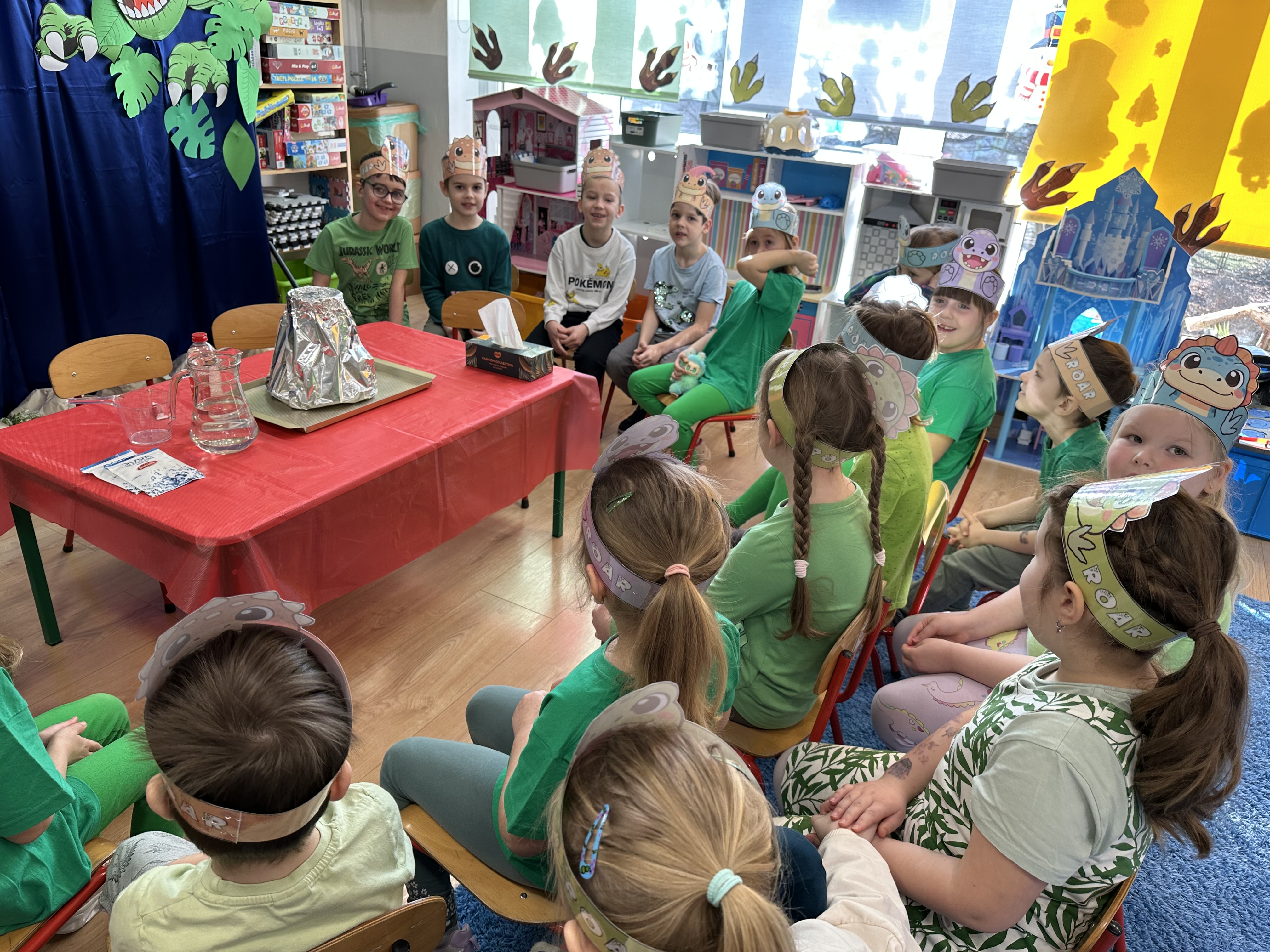 W naszej grupie odbył się Dzień Dinozaura, który dostarczył dzieciom wielu radosnych chwil oraz wzbogacił ich wiedzę o prehistorycznym świecie. Już od samego rana w sali został przygotowany kącik dinozaurów, w którym znalazły się figurki, książki oraz ilustracje przedstawiające różne gatunki tych niezwykłych stworzeń. Jedną z pierwszych aktywności była zabawa w paleontologów. Dzieci z ogromnym zaangażowaniem poszukiwały ukrytych „skamieniałości” i figurek dinozaurów, ucząc się przy tym, na czym polega praca naukowca badającego przeszłość Ziemi. Następnie wspólnie segregowały dinozaury na roślinożerne i mięsożerne, poznając ich charakterystyczne cechy oraz sposób odżywiania. Kolejnym punktem programu były „Dino-malowanki” – przestrzenna praca plastyczna, podczas której dzieci rozwijały swoją wyobraźnię i zdolności manualne. Duże zainteresowanie wzbudził również eksperyment „Wulkan”. Wykorzystując sodę i ocet, dzieci mogły zaobserwować efektowną „erupcję”, co było nie tylko świetną zabawą, ale także ciekawą lekcją przyrody. Nie zabrakło również aktywności ruchowych i gier. W „Wyścigach dinozaurów” dzieci sprawdzały, który dinozaur najszybciej dotrze do mety. Dużo emocji dostarczyła także gra „Dino droga”, w której zadaniem było bezpieczne przeprowadzenie dinozaurów przez prehistoryczny krajobraz pełen przygód i niespodzianek. Na zakończenie odbył się quiz sprawdzający wiadomości o dinozaurach. Dzieci wykazały się dużą wiedzą i zaangażowaniem. Dzień zakończył się wykonaniem pamiątkowej fotografii, która będzie miłym wspomnieniem wspólnie spędzonego czasu. Obchody Dnia Dinozaura były nie tylko okazją do świetnej zabawy, ale również do zdobywania nowych informacji i rozwijania zainteresowań przyrodniczych.