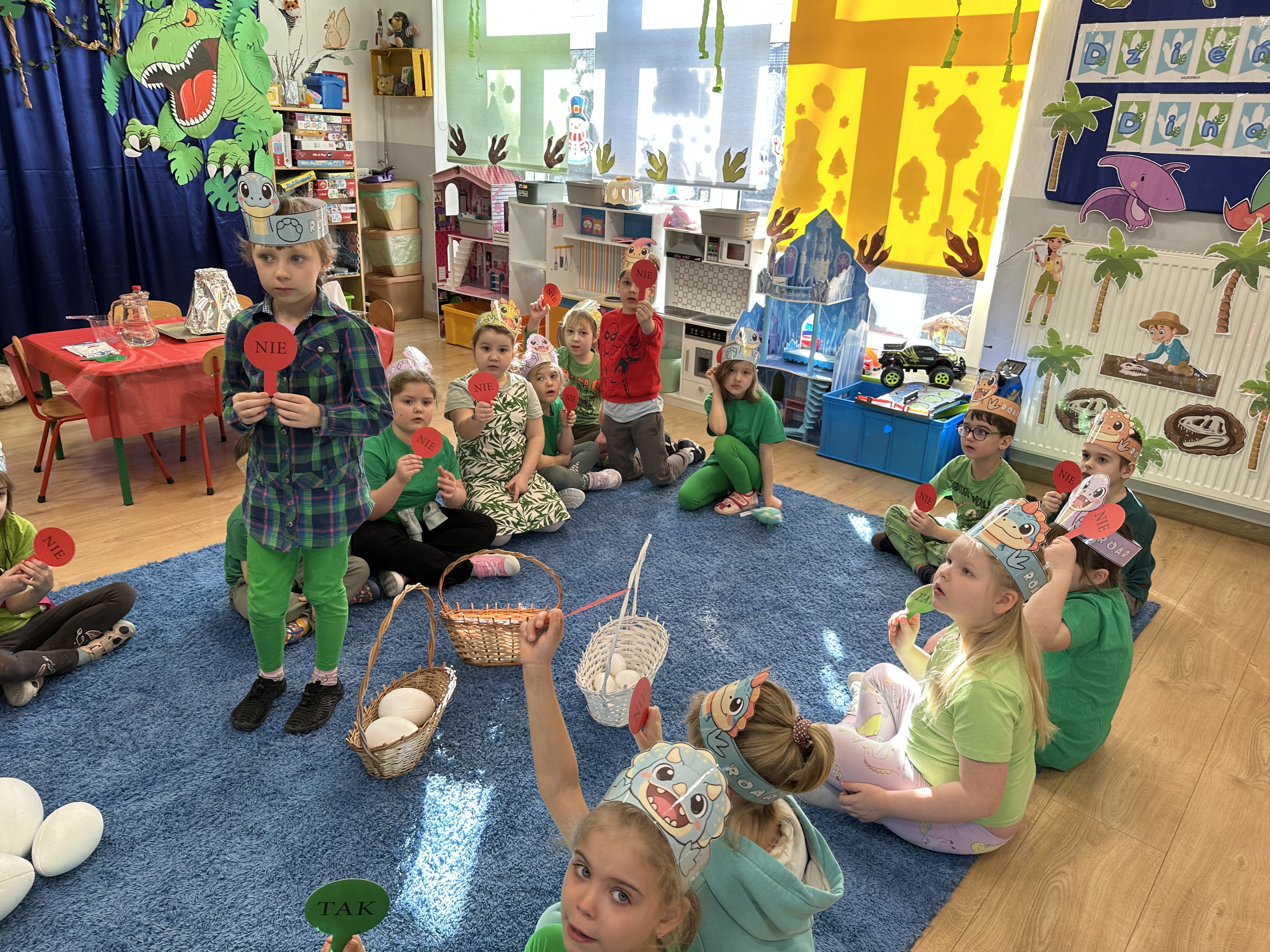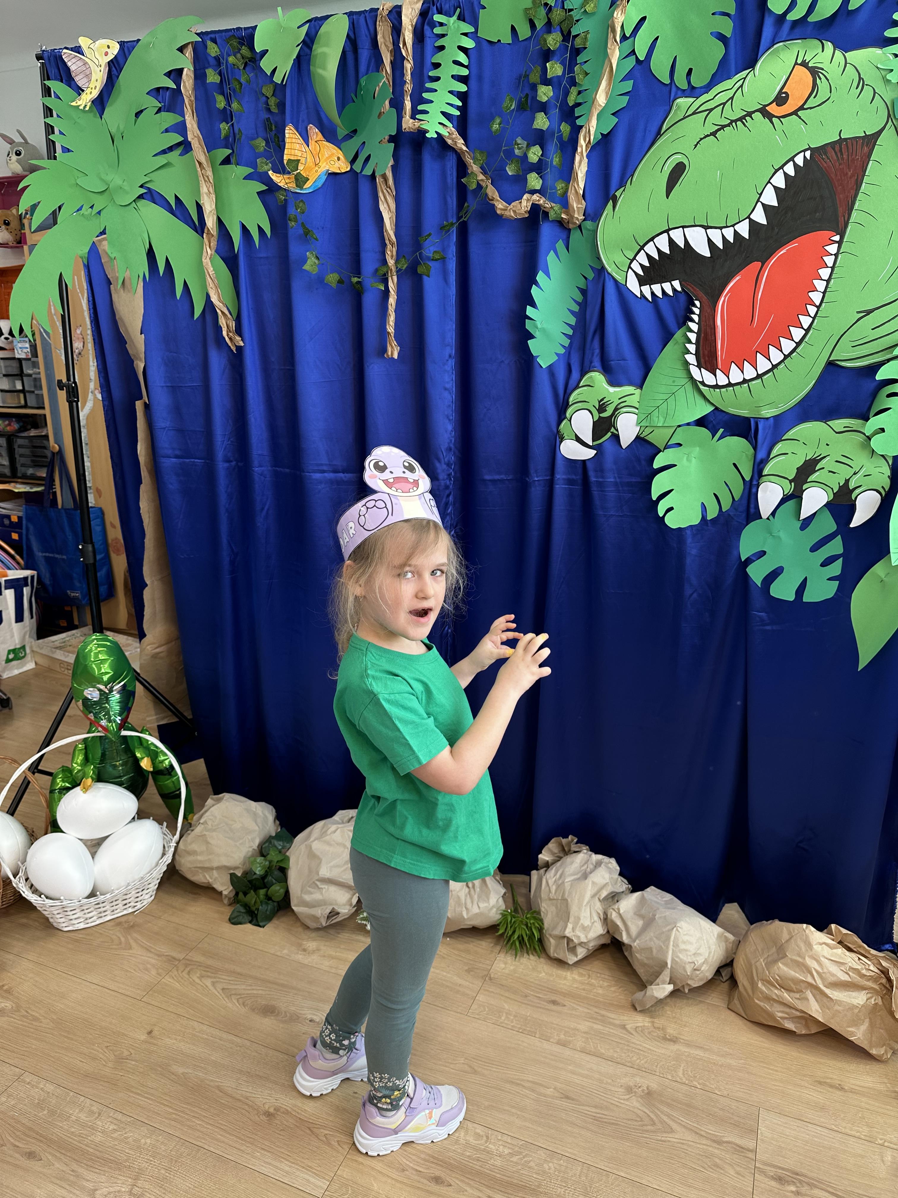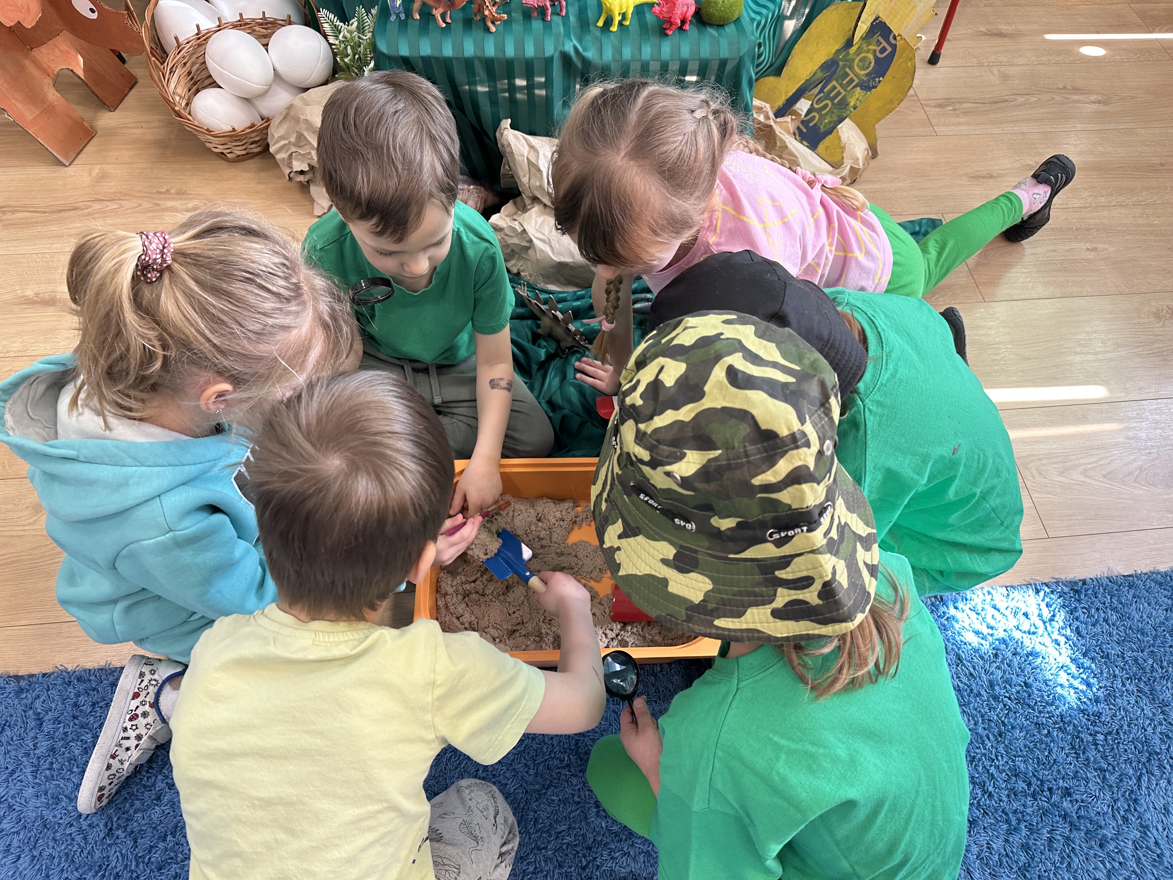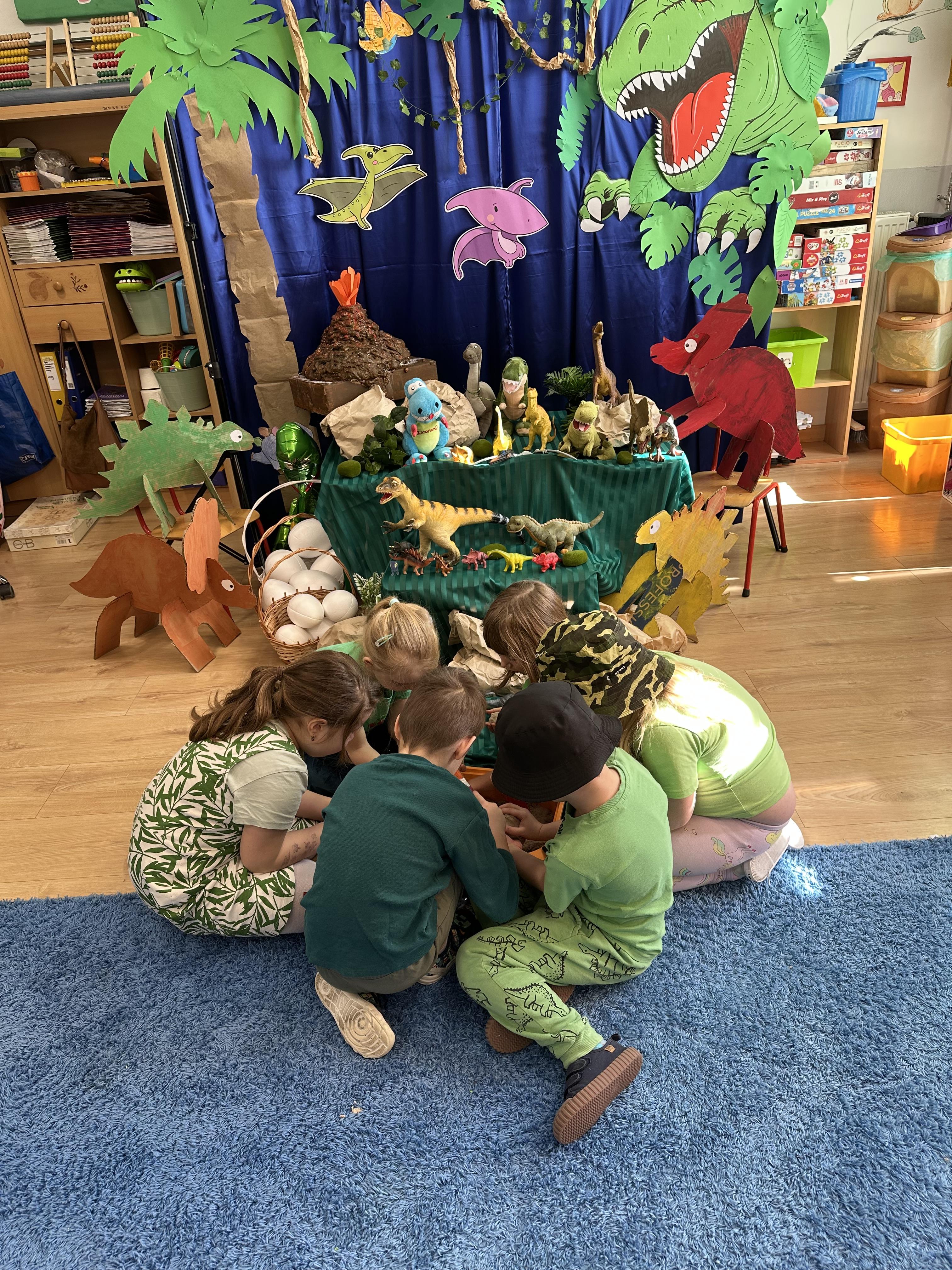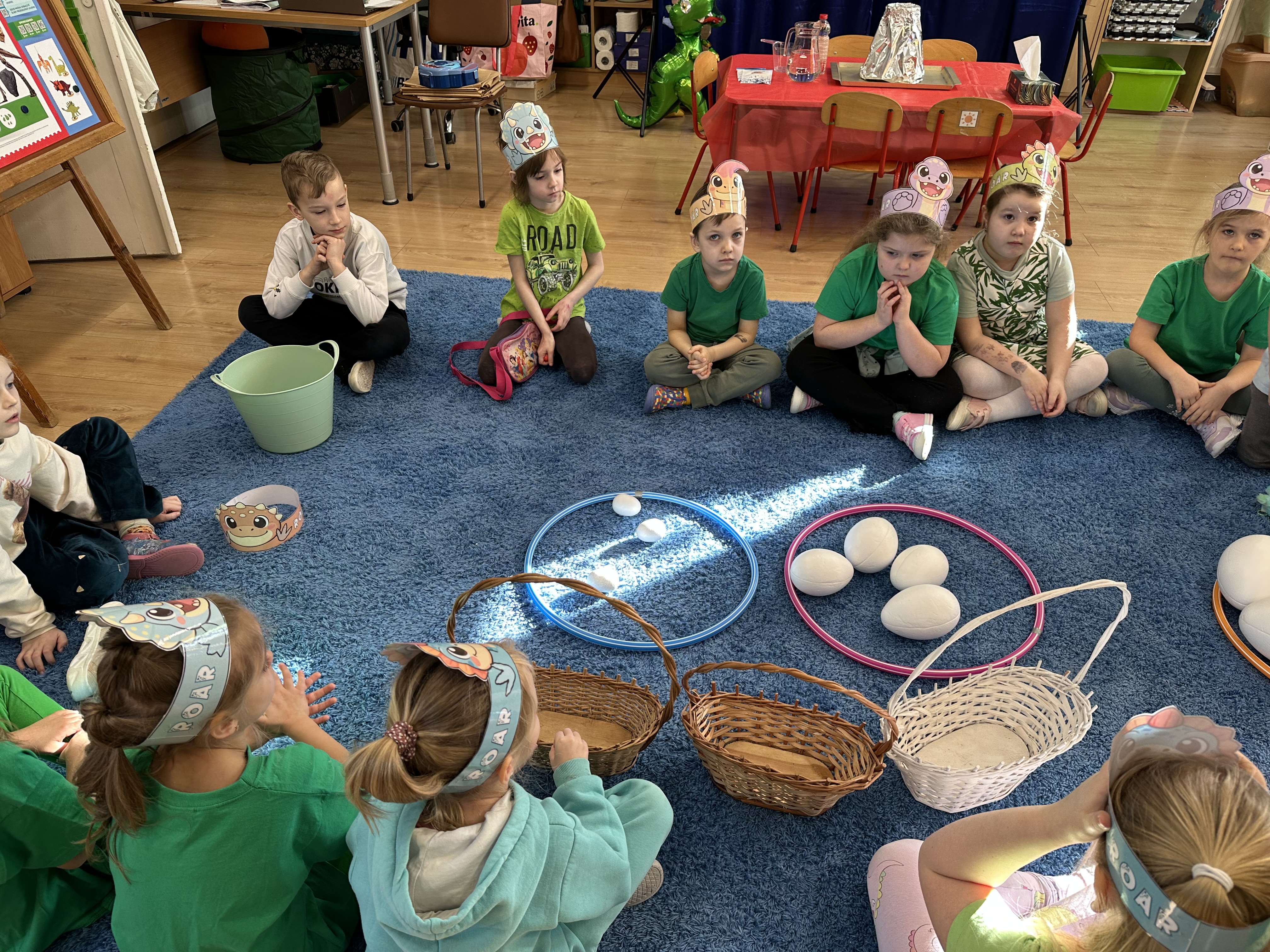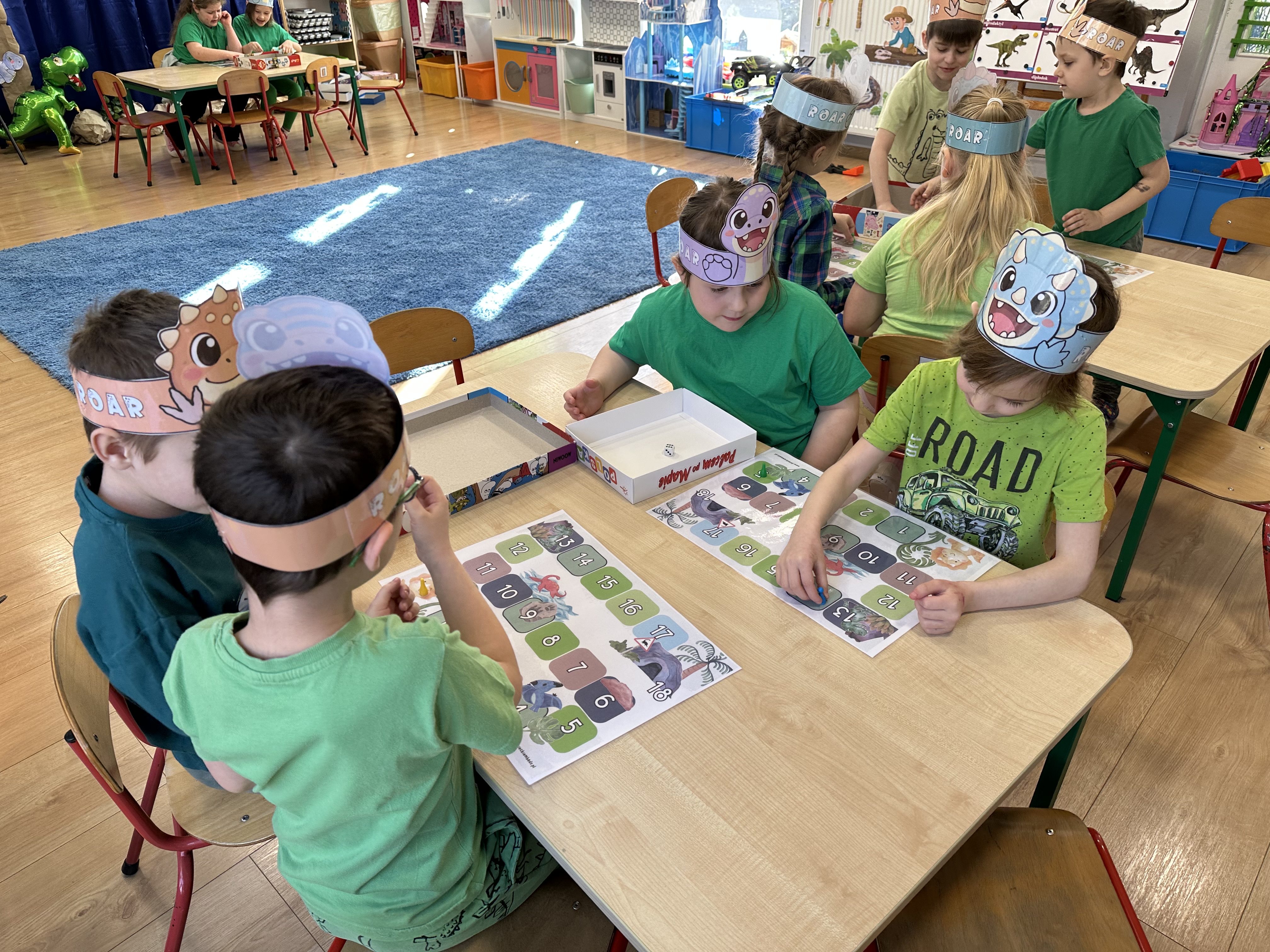 W naszej grupie odbył się Dzień Dinozaura, który dostarczył dzieciom wielu radosnych chwil oraz wzbogacił ich wiedzę o prehistorycznym świecie. Już od samego rana w sali został przygotowany kącik dinozaurów, w którym znalazły się figurki, książki oraz ilustracje przedstawiające różne gatunki tych niezwykłych stworzeń. Jedną z pierwszych aktywności była zabawa w paleontologów. Dzieci z ogromnym zaangażowaniem poszukiwały ukrytych „skamieniałości” i figurek dinozaurów, ucząc się przy tym, na czym polega praca naukowca badającego przeszłość Ziemi. Następnie wspólnie segregowały dinozaury na roślinożerne i mięsożerne, poznając ich charakterystyczne cechy oraz sposób odżywiania. Kolejnym punktem programu były „Dino-malowanki” – przestrzenna praca plastyczna, podczas której dzieci rozwijały swoją wyobraźnię i zdolności manualne. Duże zainteresowanie wzbudził również eksperyment „Wulkan”. Wykorzystując sodę i ocet, dzieci mogły zaobserwować efektowną „erupcję”, co było nie tylko świetną zabawą, ale także ciekawą lekcją przyrody. Nie zabrakło również aktywności ruchowych i gier. W „Wyścigach dinozaurów” dzieci sprawdzały, który dinozaur najszybciej dotrze do mety. Dużo emocji dostarczyła także gra „Dino droga”, w której zadaniem było bezpieczne przeprowadzenie dinozaurów przez prehistoryczny krajobraz pełen przygód i niespodzianek. Na zakończenie odbył się quiz sprawdzający wiadomości o dinozaurach. Dzieci wykazały się dużą wiedzą i zaangażowaniem. Dzień zakończył się wykonaniem pamiątkowej fotografii, która będzie miłym wspomnieniem wspólnie spędzonego czasu. Obchody Dnia Dinozaura były nie tylko okazją do świetnej zabawy, ale również do zdobywania nowych informacji i rozwijania zainteresowań przyrodniczych.