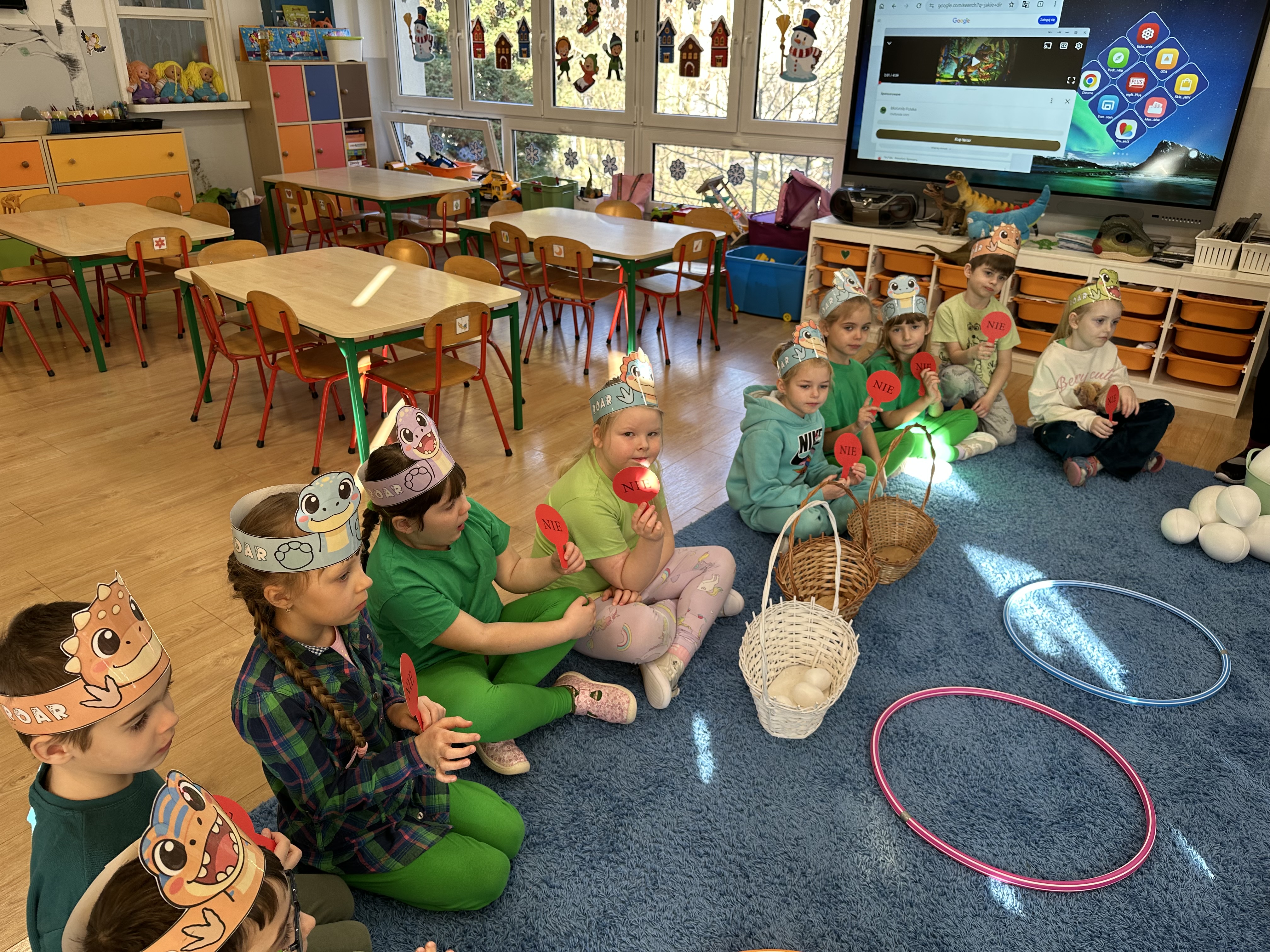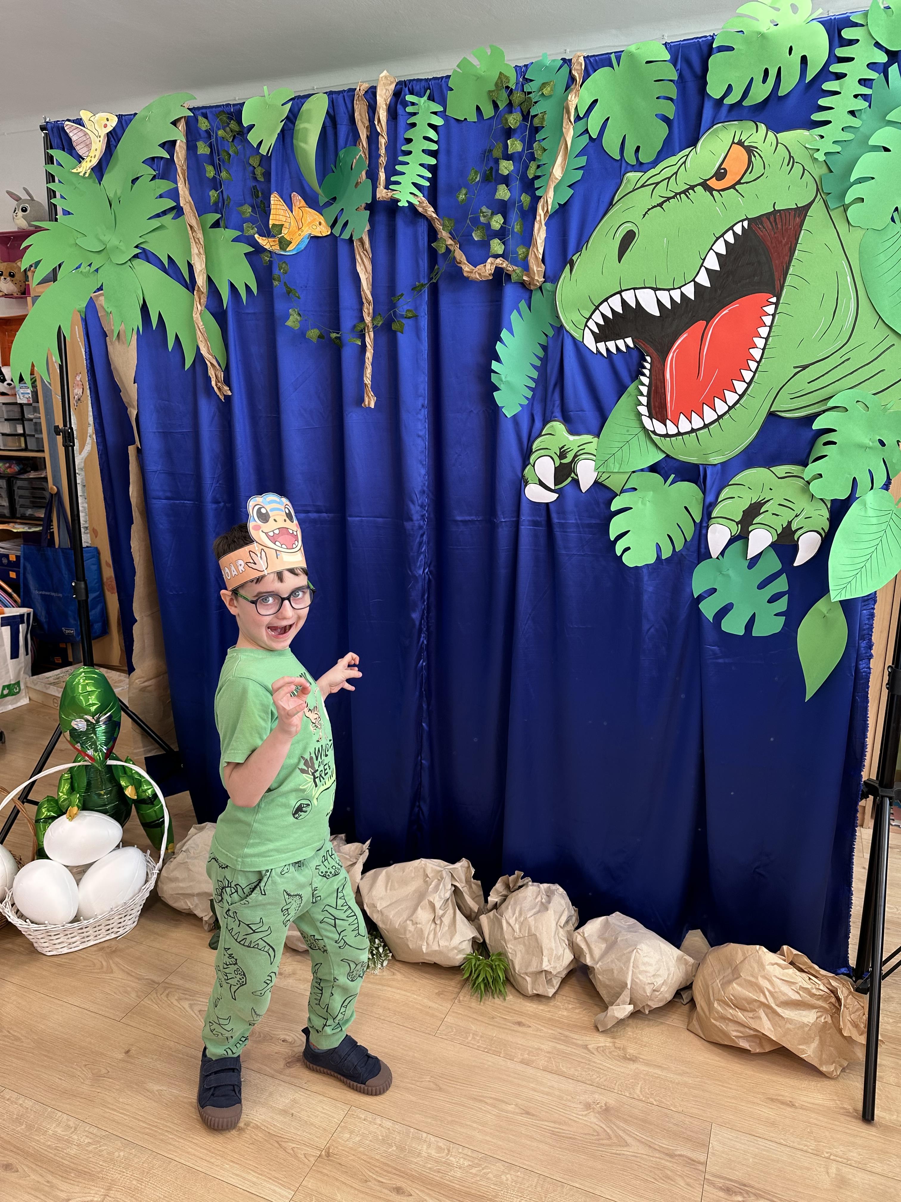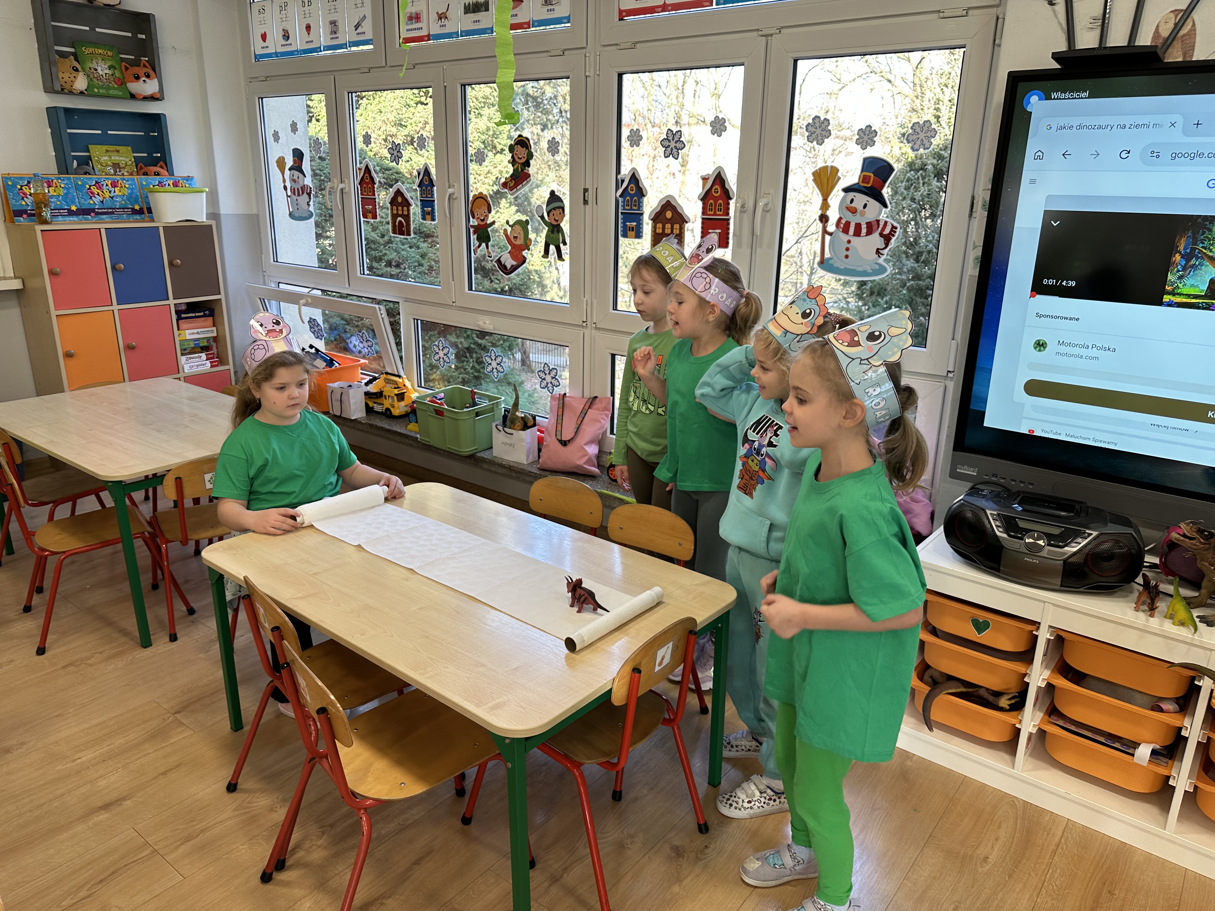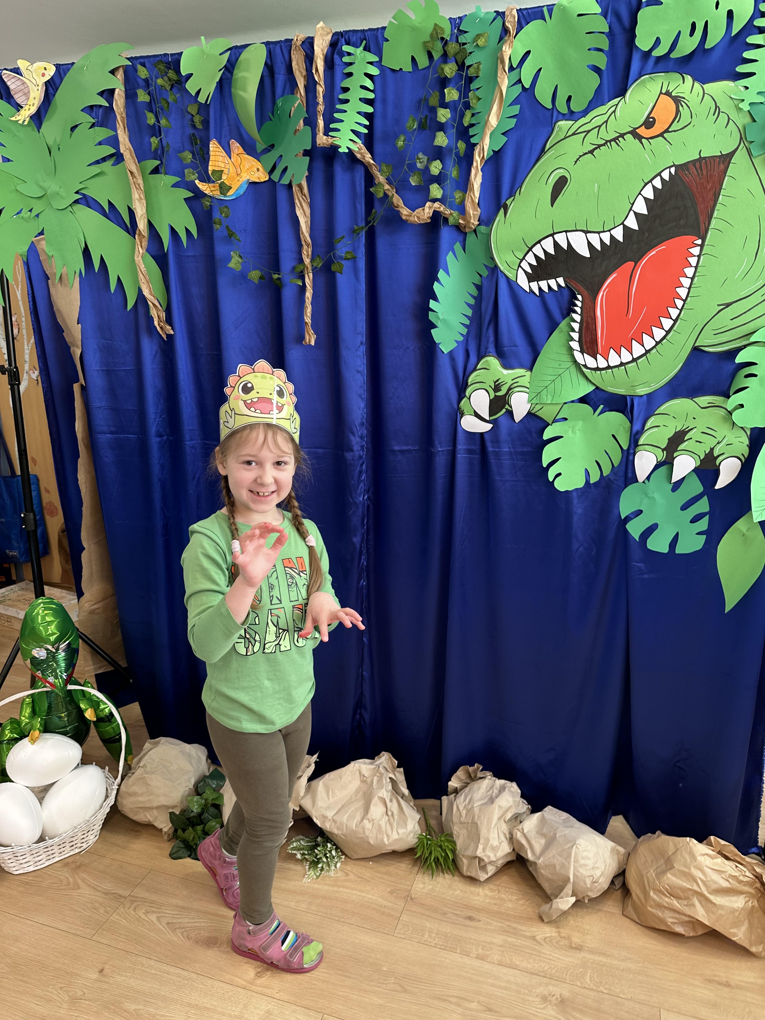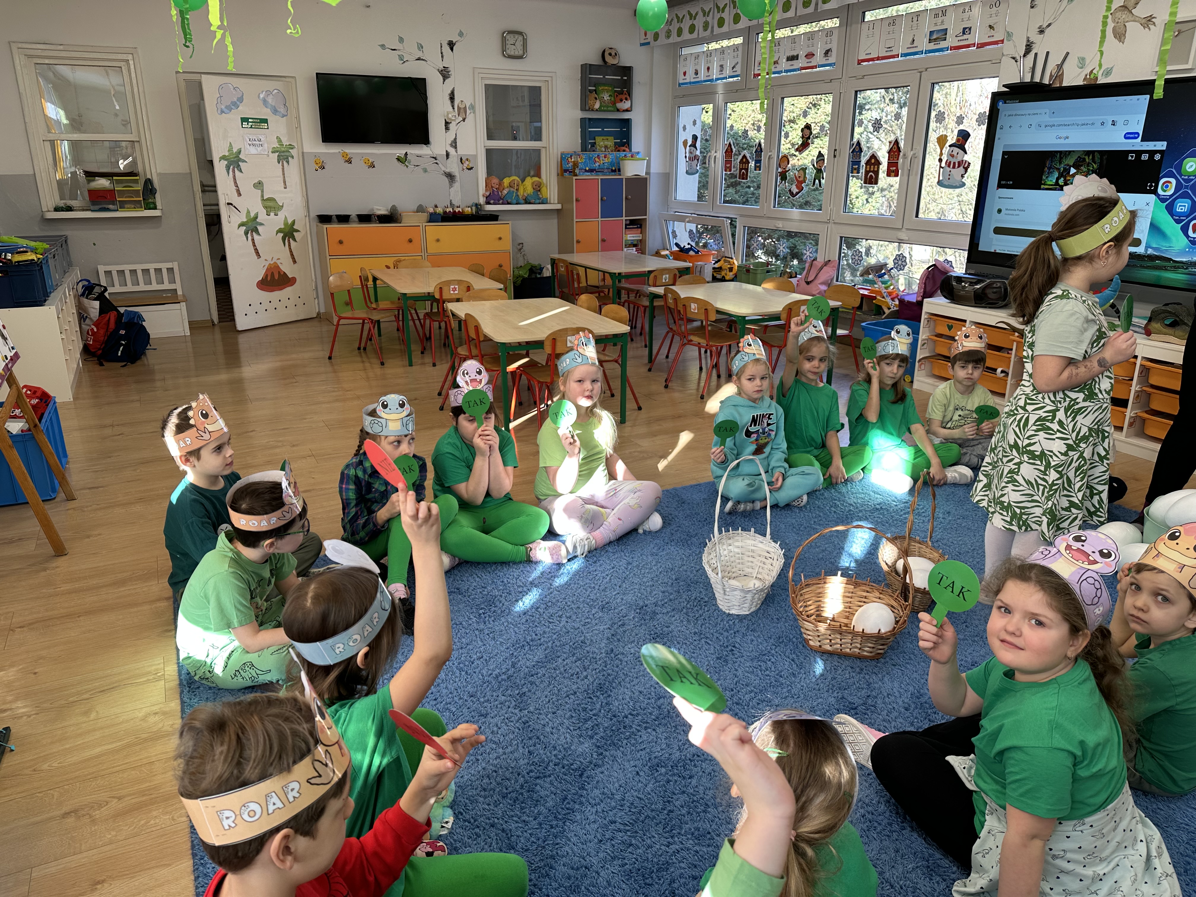 W naszej grupie odbył się Dzień Dinozaura, który dostarczył dzieciom wielu radosnych chwil oraz wzbogacił ich wiedzę o prehistorycznym świecie. Już od samego rana w sali został przygotowany kącik dinozaurów, w którym znalazły się figurki, książki oraz ilustracje przedstawiające różne gatunki tych niezwykłych stworzeń. Jedną z pierwszych aktywności była zabawa w paleontologów. Dzieci z ogromnym zaangażowaniem poszukiwały ukrytych „skamieniałości” i figurek dinozaurów, ucząc się przy tym, na czym polega praca naukowca badającego przeszłość Ziemi. Następnie wspólnie segregowały dinozaury na roślinożerne i mięsożerne, poznając ich charakterystyczne cechy oraz sposób odżywiania. Kolejnym punktem programu były „Dino-malowanki” – przestrzenna praca plastyczna, podczas której dzieci rozwijały swoją wyobraźnię i zdolności manualne. Duże zainteresowanie wzbudził również eksperyment „Wulkan”. Wykorzystując sodę i ocet, dzieci mogły zaobserwować efektowną „erupcję”, co było nie tylko świetną zabawą, ale także ciekawą lekcją przyrody. Nie zabrakło również aktywności ruchowych i gier. W „Wyścigach dinozaurów” dzieci sprawdzały, który dinozaur najszybciej dotrze do mety. Dużo emocji dostarczyła także gra „Dino droga”, w której zadaniem było bezpieczne przeprowadzenie dinozaurów przez prehistoryczny krajobraz pełen przygód i niespodzianek. Na zakończenie odbył się quiz sprawdzający wiadomości o dinozaurach. Dzieci wykazały się dużą wiedzą i zaangażowaniem. Dzień zakończył się wykonaniem pamiątkowej fotografii, która będzie miłym wspomnieniem wspólnie spędzonego czasu. Obchody Dnia Dinozaura były nie tylko okazją do świetnej zabawy, ale również do zdobywania nowych informacji i rozwijania zainteresowań przyrodniczych.
