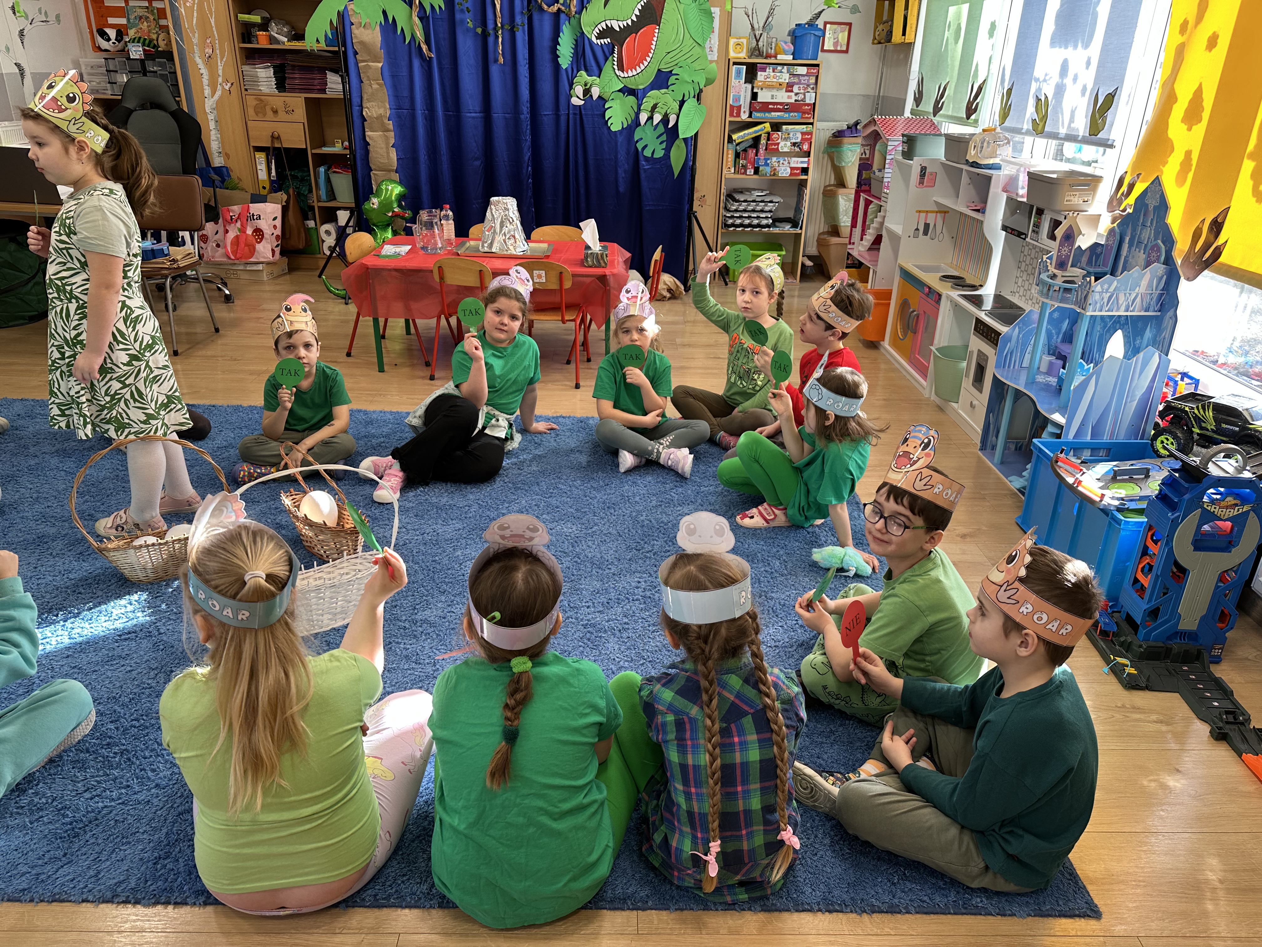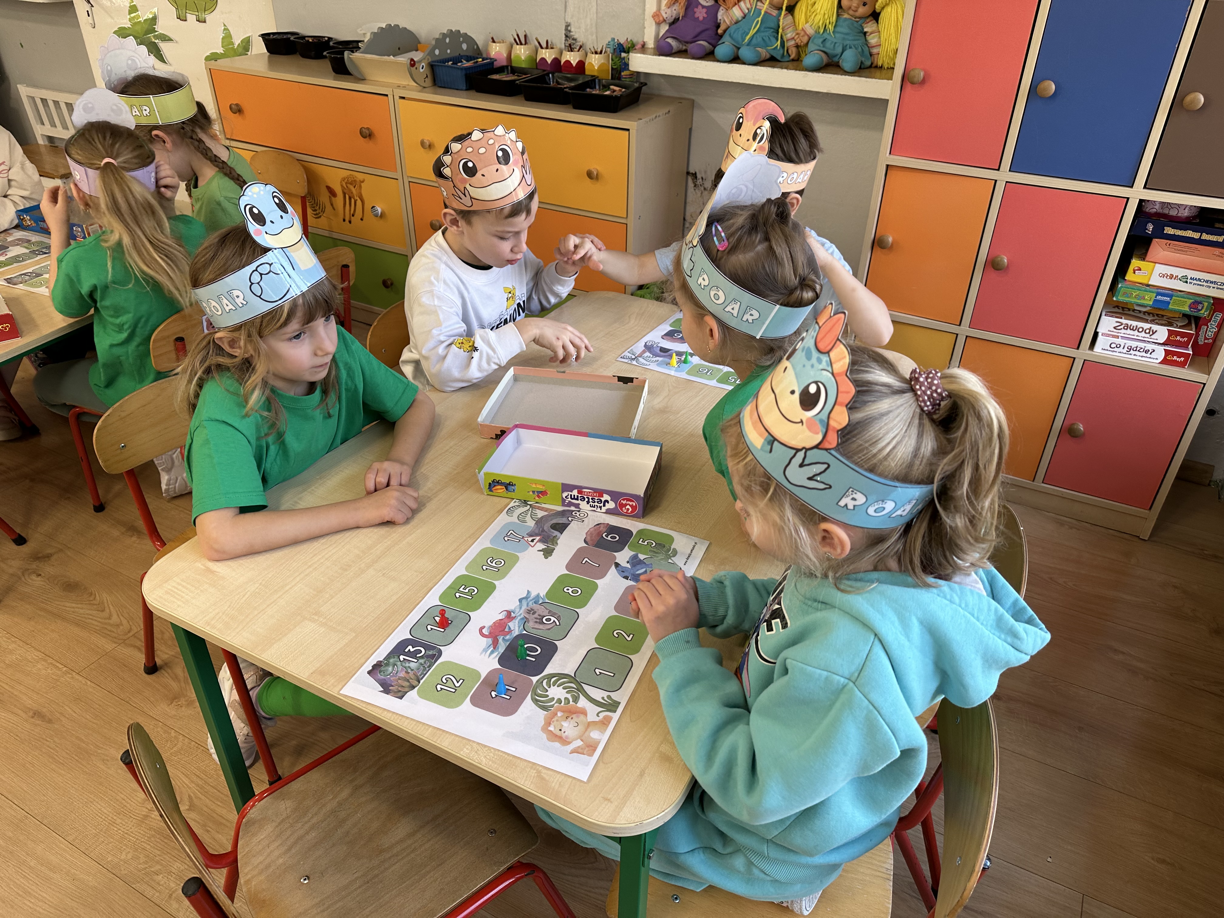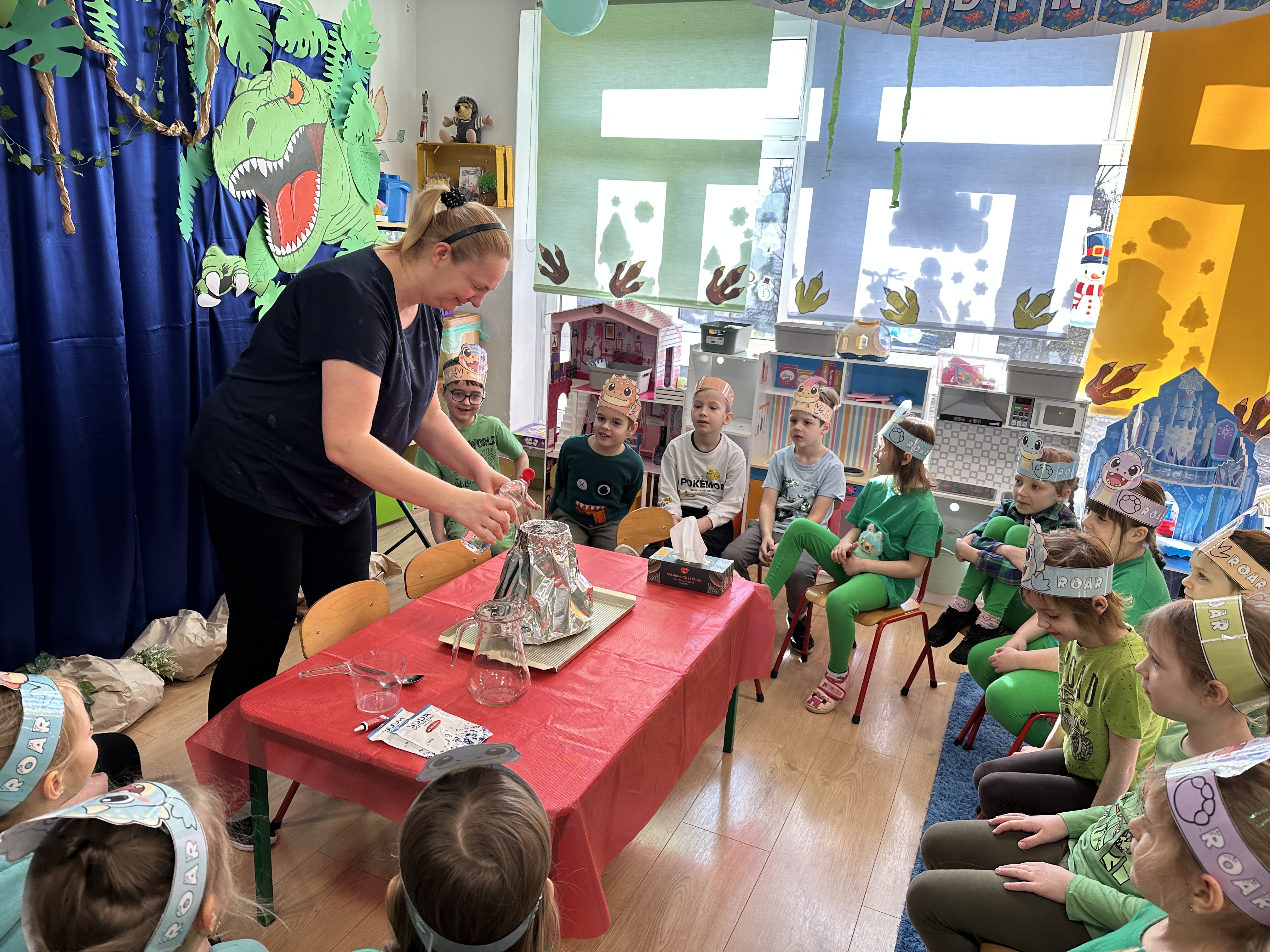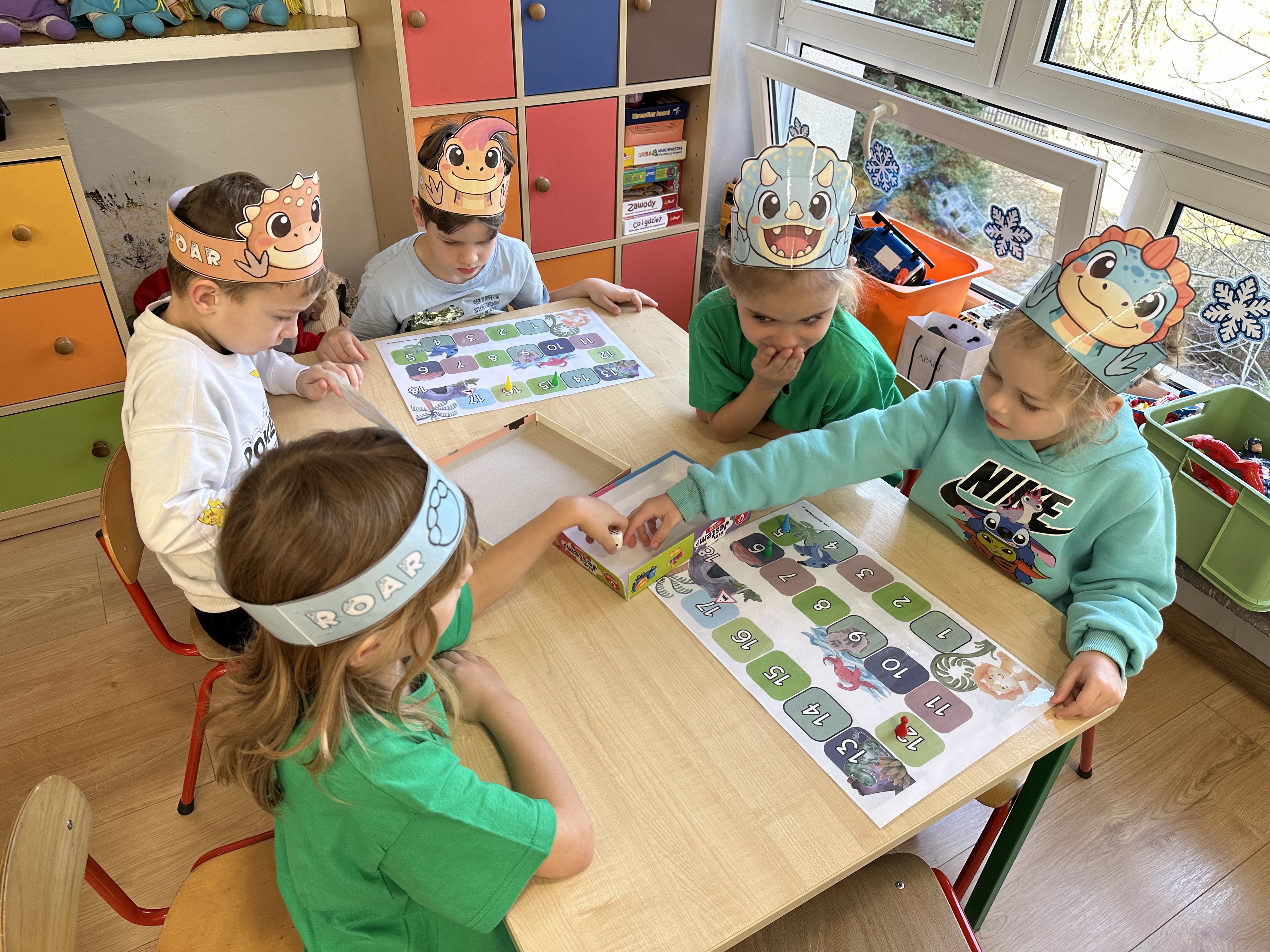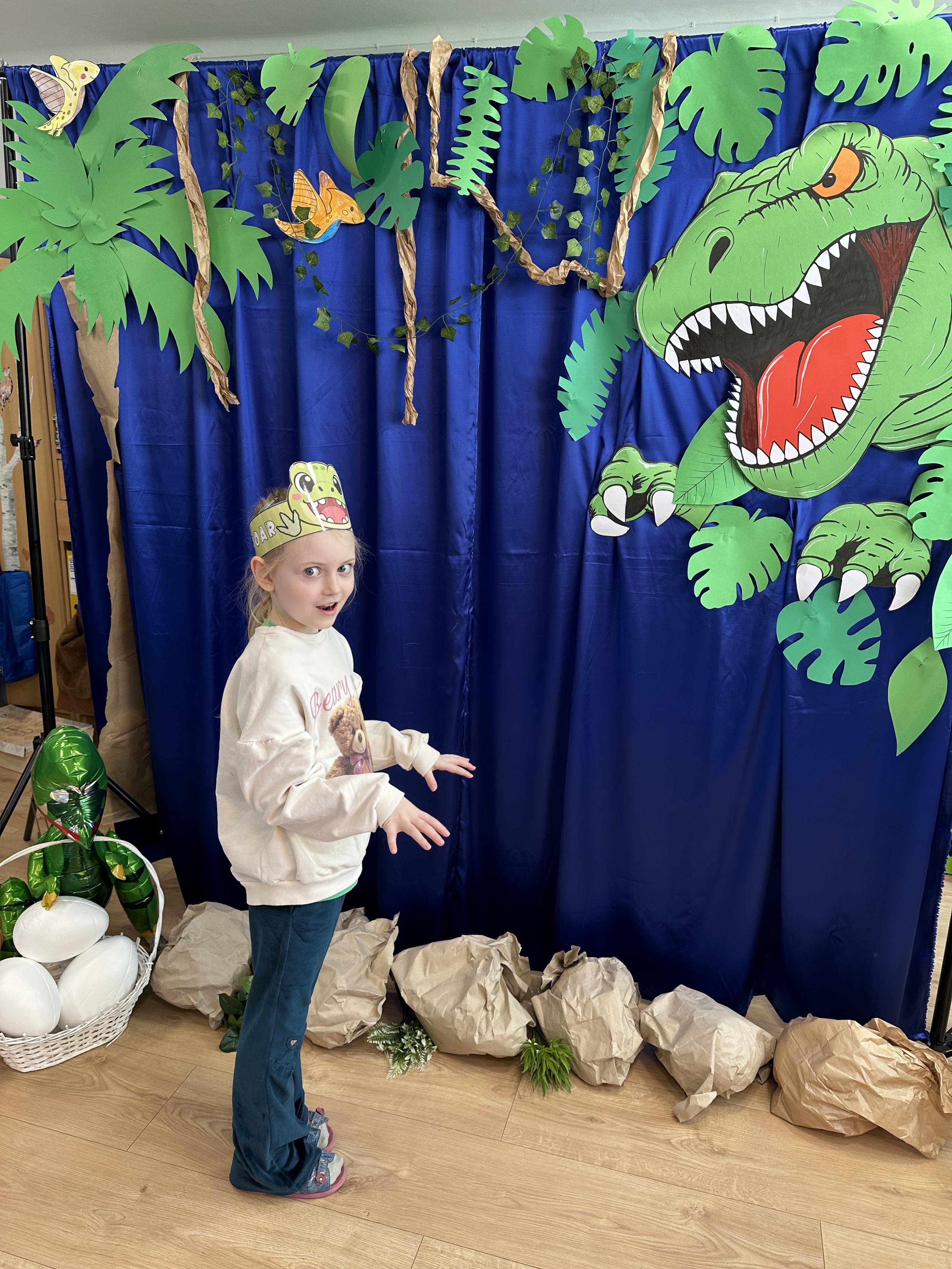 W naszej grupie odbył się Dzień Dinozaura, który dostarczył dzieciom wielu radosnych chwil oraz wzbogacił ich wiedzę o prehistorycznym świecie. Już od samego rana w sali został przygotowany kącik dinozaurów, w którym znalazły się figurki, książki oraz ilustracje przedstawiające różne gatunki tych niezwykłych stworzeń. Jedną z pierwszych aktywności była zabawa w paleontologów. Dzieci z ogromnym zaangażowaniem poszukiwały ukrytych „skamieniałości” i figurek dinozaurów, ucząc się przy tym, na czym polega praca naukowca badającego przeszłość Ziemi. Następnie wspólnie segregowały dinozaury na roślinożerne i mięsożerne, poznając ich charakterystyczne cechy oraz sposób odżywiania. Kolejnym punktem programu były „Dino-malowanki” – przestrzenna praca plastyczna, podczas której dzieci rozwijały swoją wyobraźnię i zdolności manualne. Duże zainteresowanie wzbudził również eksperyment „Wulkan”. Wykorzystując sodę i ocet, dzieci mogły zaobserwować efektowną „erupcję”, co było nie tylko świetną zabawą, ale także ciekawą lekcją przyrody. Nie zabrakło również aktywności ruchowych i gier. W „Wyścigach dinozaurów” dzieci sprawdzały, który dinozaur najszybciej dotrze do mety. Dużo emocji dostarczyła także gra „Dino droga”, w której zadaniem było bezpieczne przeprowadzenie dinozaurów przez prehistoryczny krajobraz pełen przygód i niespodzianek. Na zakończenie odbył się quiz sprawdzający wiadomości o dinozaurach. Dzieci wykazały się dużą wiedzą i zaangażowaniem. Dzień zakończył się wykonaniem pamiątkowej fotografii, która będzie miłym wspomnieniem wspólnie spędzonego czasu. Obchody Dnia Dinozaura były nie tylko okazją do świetnej zabawy, ale również do zdobywania nowych informacji i rozwijania zainteresowań przyrodniczych.