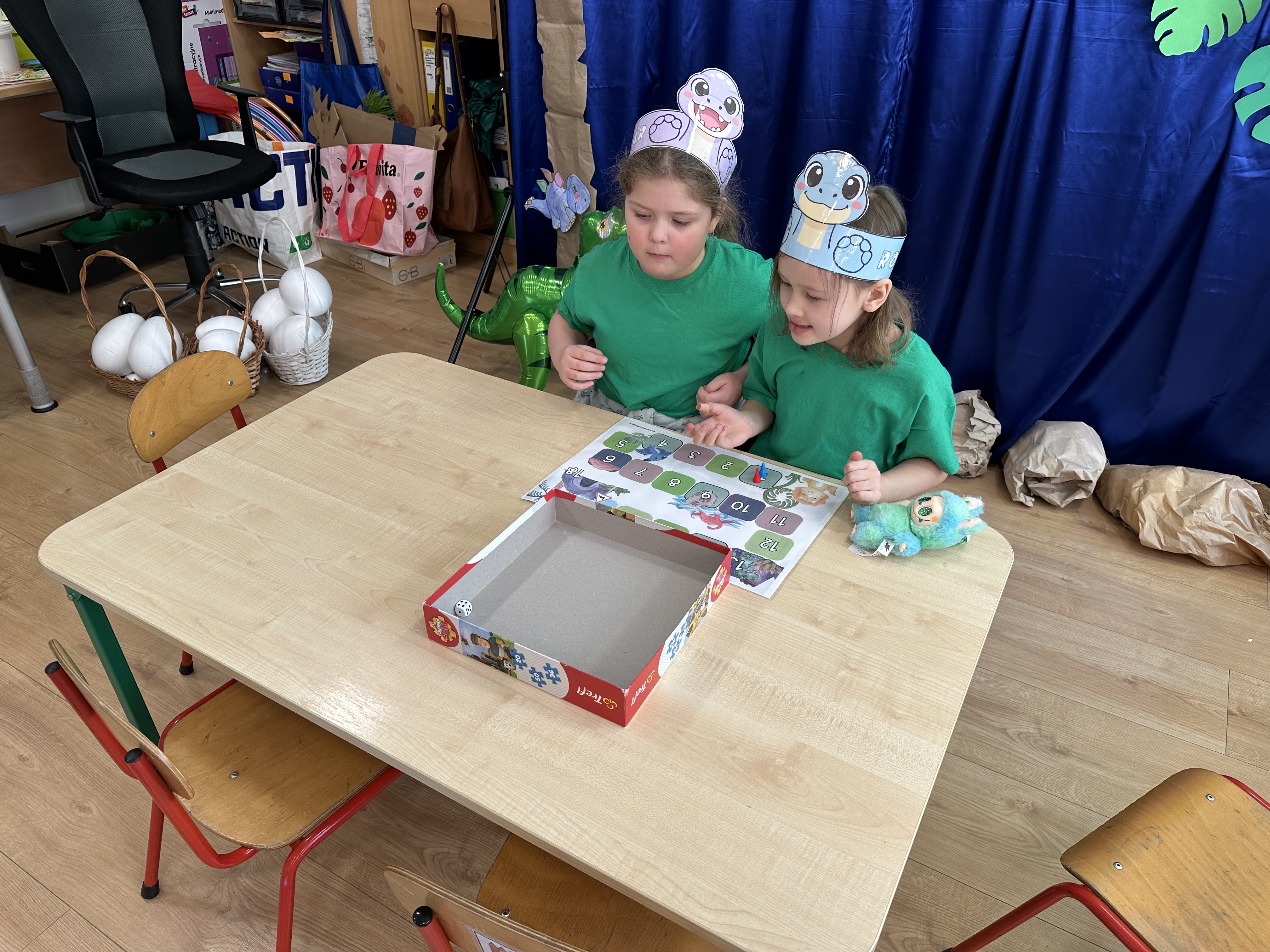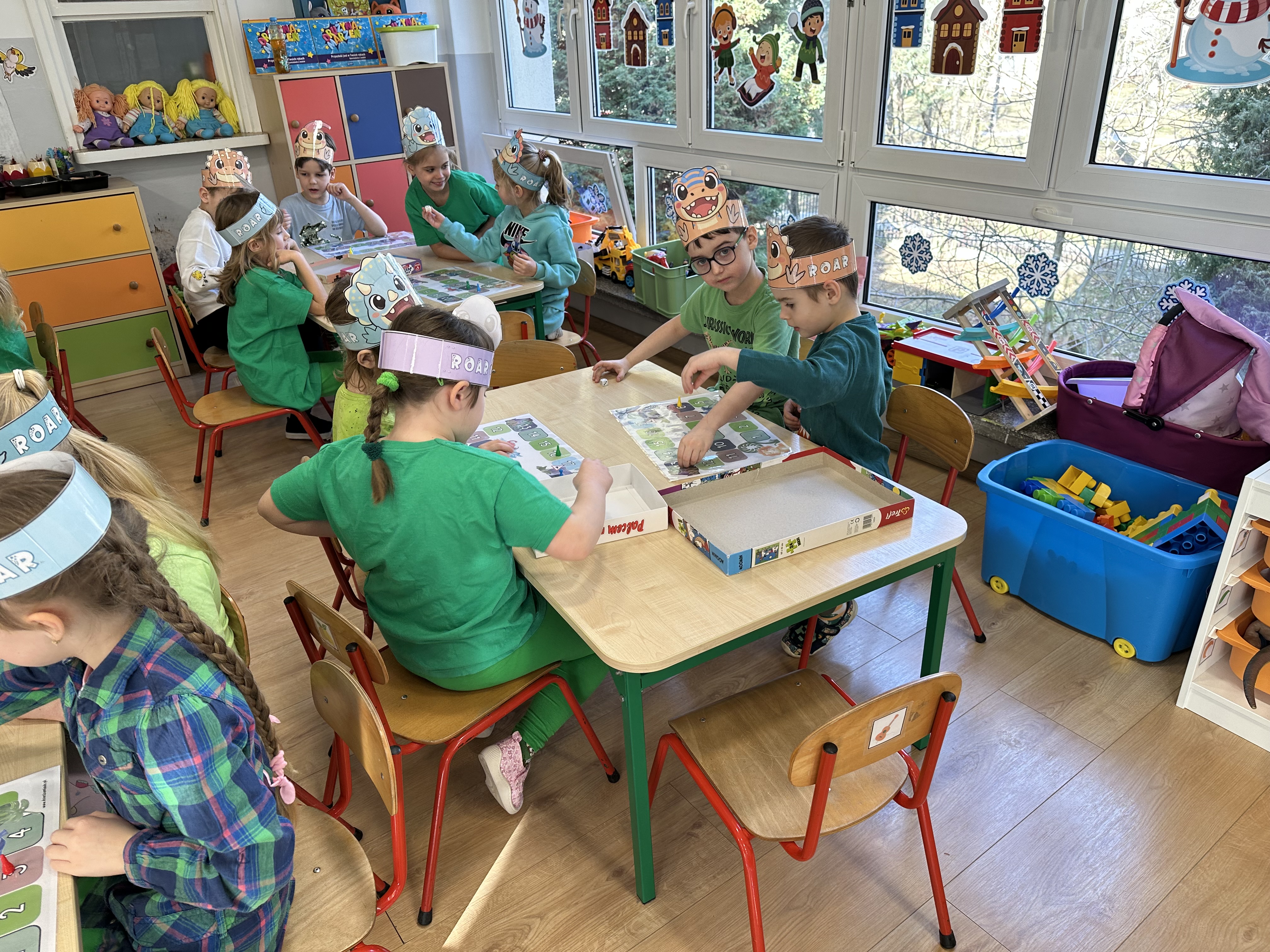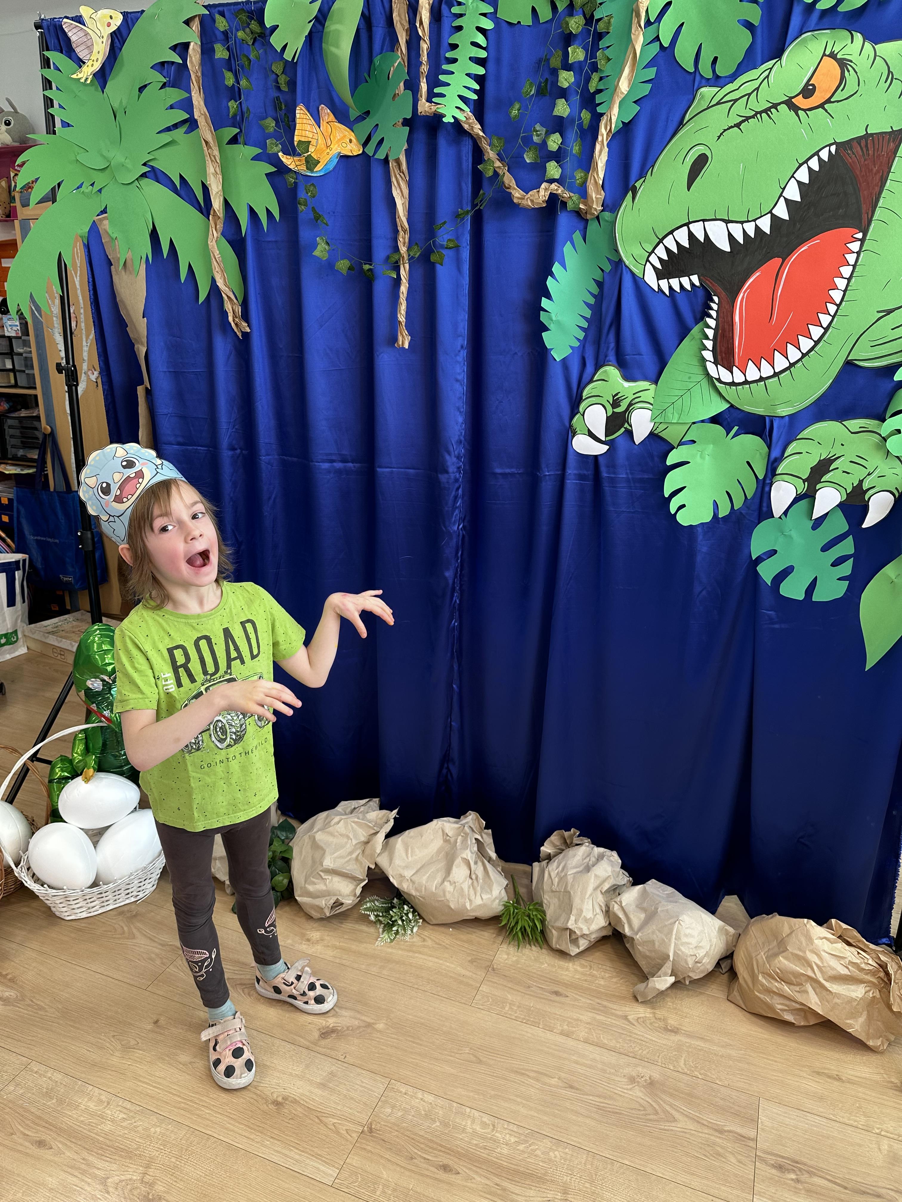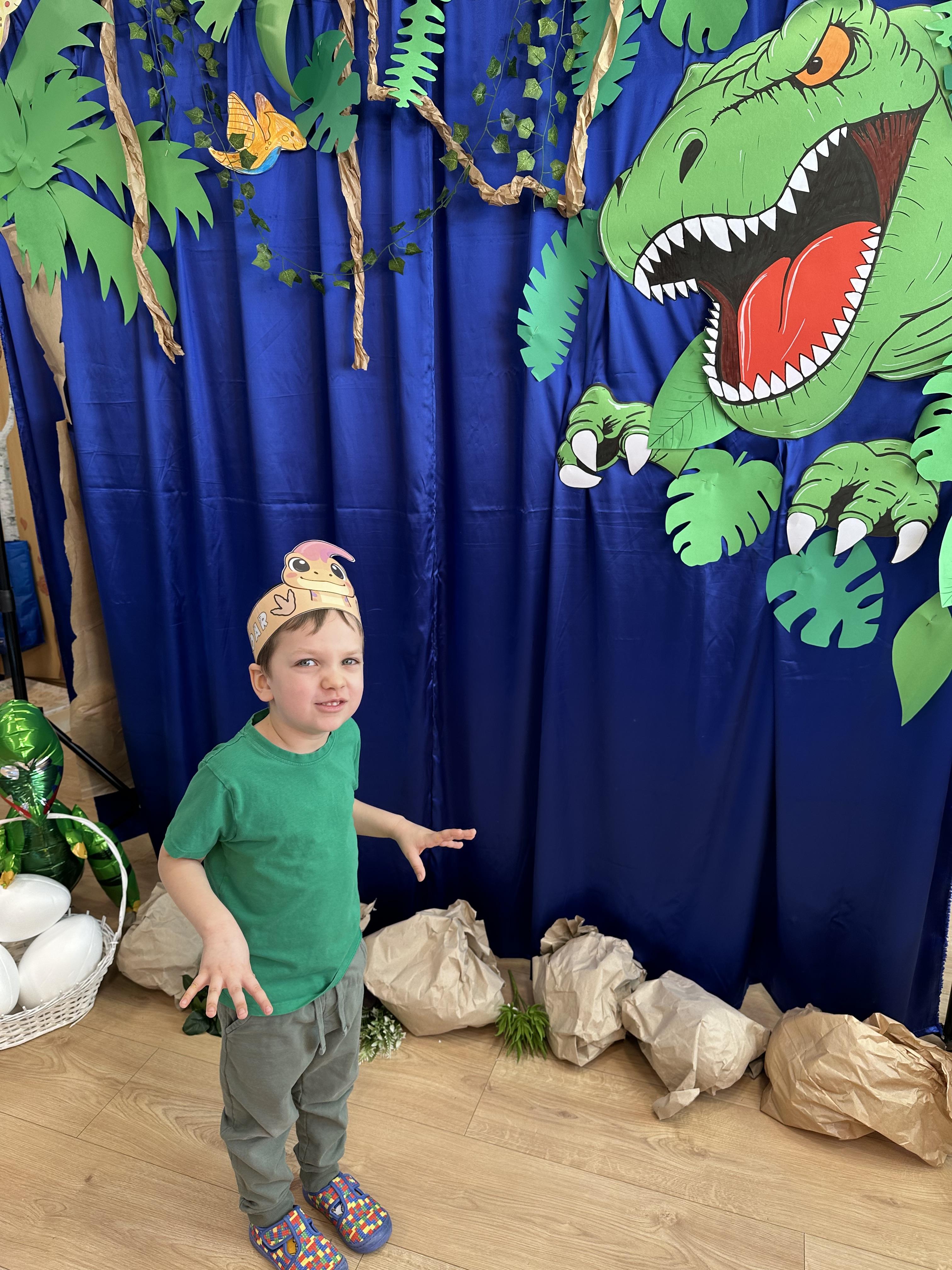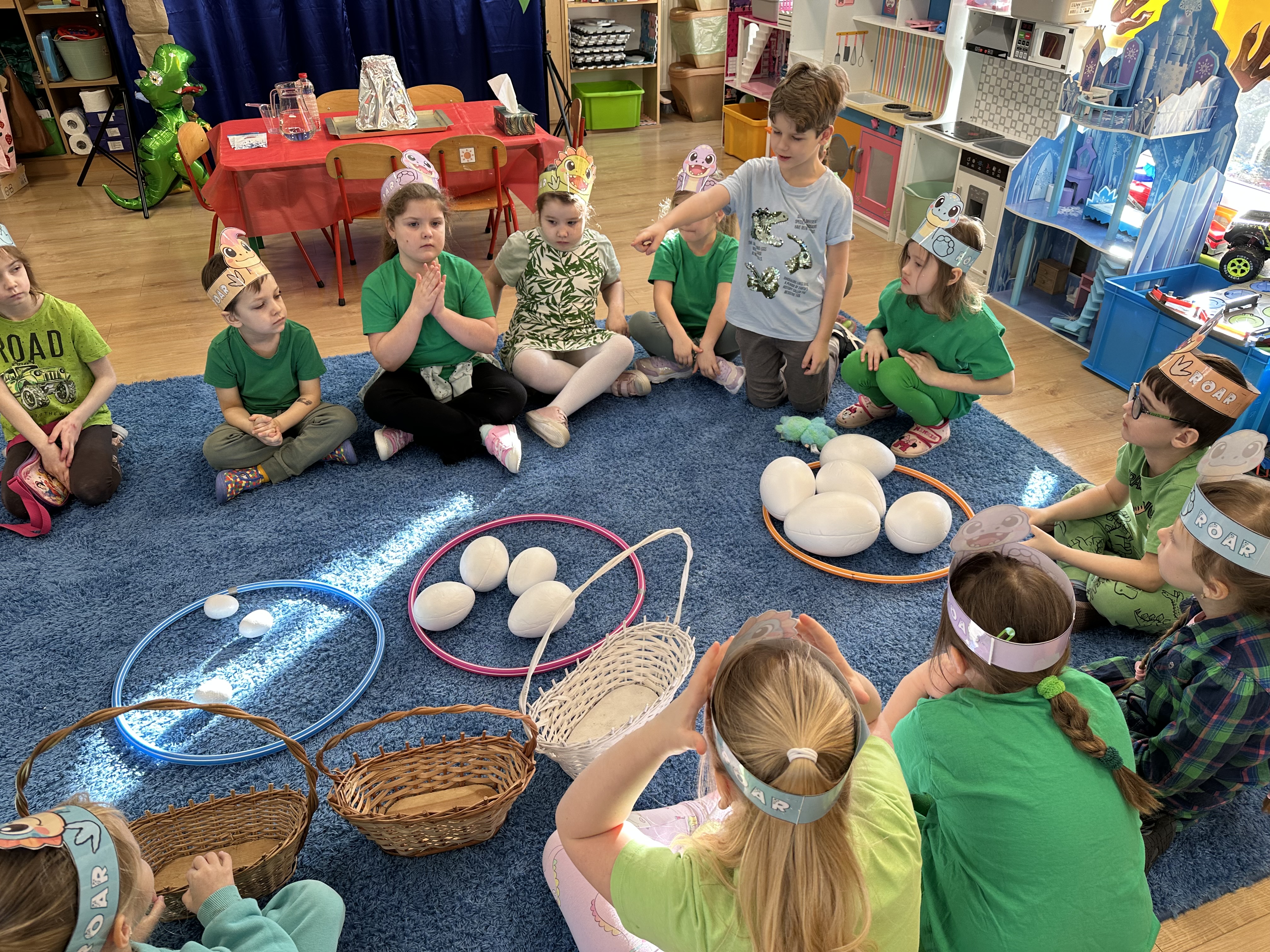W naszej grupie odbył się Dzień Dinozaura, który dostarczył dzieciom wielu radosnych chwil oraz wzbogacił ich wiedzę o prehistorycznym świecie. Już od samego rana w sali został przygotowany kącik dinozaurów, w którym znalazły się figurki, książki oraz ilustracje przedstawiające różne gatunki tych niezwykłych stworzeń. Jedną z pierwszych aktywności była zabawa w paleontologów. Dzieci z ogromnym zaangażowaniem poszukiwały ukrytych „skamieniałości” i figurek dinozaurów, ucząc się przy tym, na czym polega praca naukowca badającego przeszłość Ziemi. Następnie wspólnie segregowały dinozaury na roślinożerne i mięsożerne, poznając ich charakterystyczne cechy oraz sposób odżywiania. Kolejnym punktem programu były „Dino-malowanki” – przestrzenna praca plastyczna, podczas której dzieci rozwijały swoją wyobraźnię i zdolności manualne. Duże zainteresowanie wzbudził również eksperyment „Wulkan”. Wykorzystując sodę i ocet, dzieci mogły zaobserwować efektowną „erupcję”, co było nie tylko świetną zabawą, ale także ciekawą lekcją przyrody. Nie zabrakło również aktywności ruchowych i gier. W „Wyścigach dinozaurów” dzieci sprawdzały, który dinozaur najszybciej dotrze do mety. Dużo emocji dostarczyła także gra „Dino droga”, w której zadaniem było bezpieczne przeprowadzenie dinozaurów przez prehistoryczny krajobraz pełen przygód i niespodzianek. Na zakończenie odbył się quiz sprawdzający wiadomości o dinozaurach. Dzieci wykazały się dużą wiedzą i zaangażowaniem. Dzień zakończył się wykonaniem pamiątkowej fotografii, która będzie miłym wspomnieniem wspólnie spędzonego czasu. Obchody Dnia Dinozaura były nie tylko okazją do świetnej zabawy, ale również do zdobywania nowych informacji i rozwijania zainteresowań przyrodniczych.