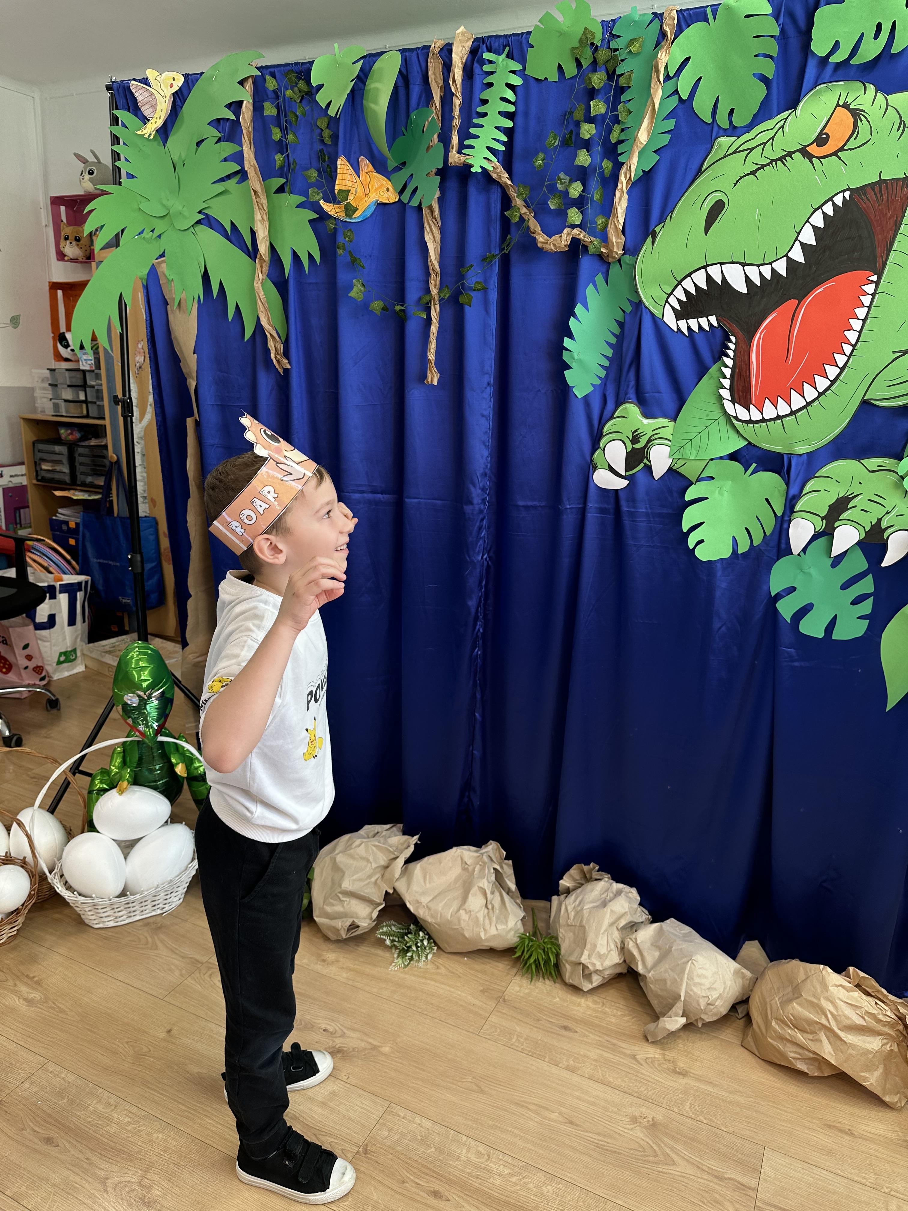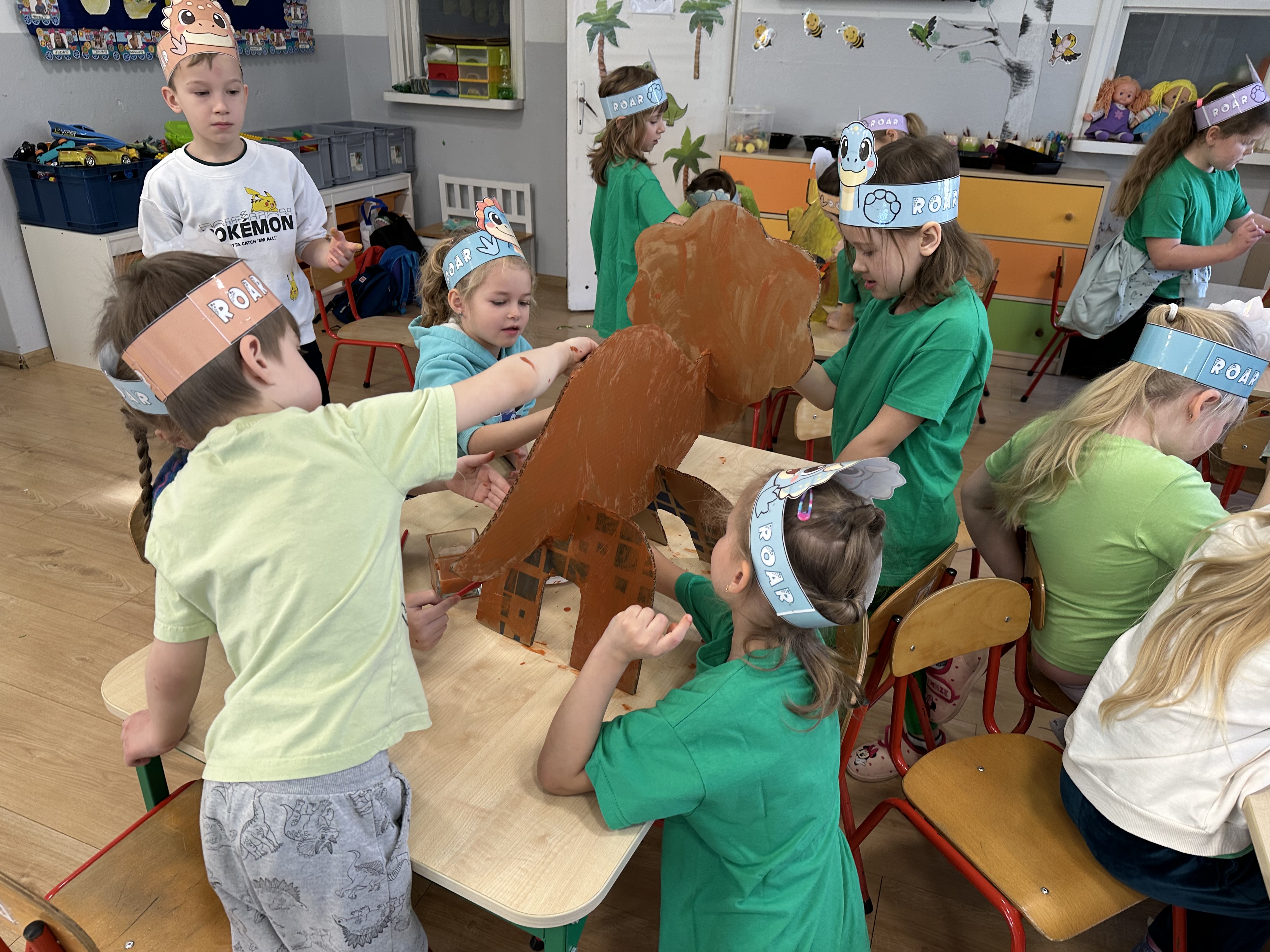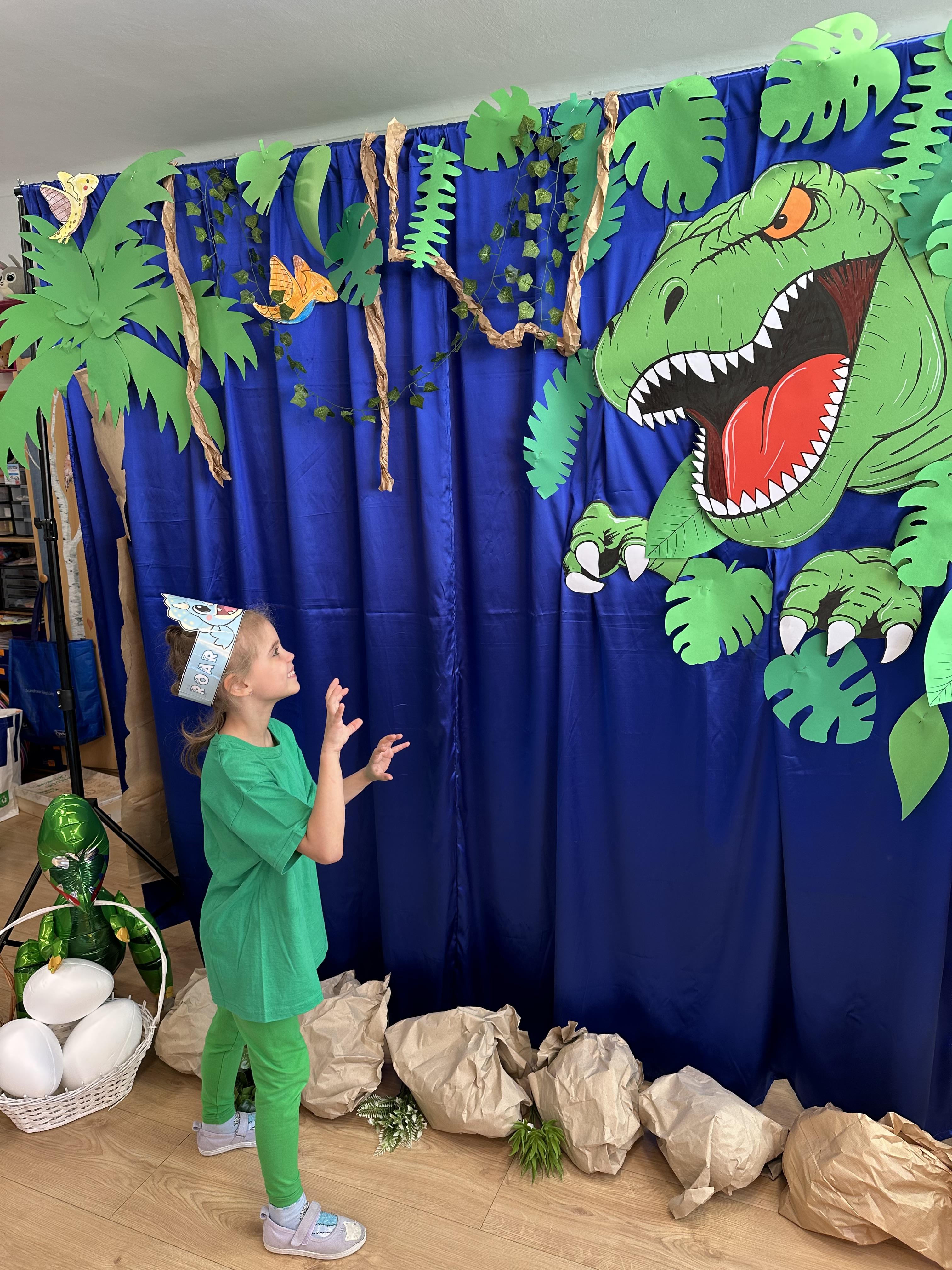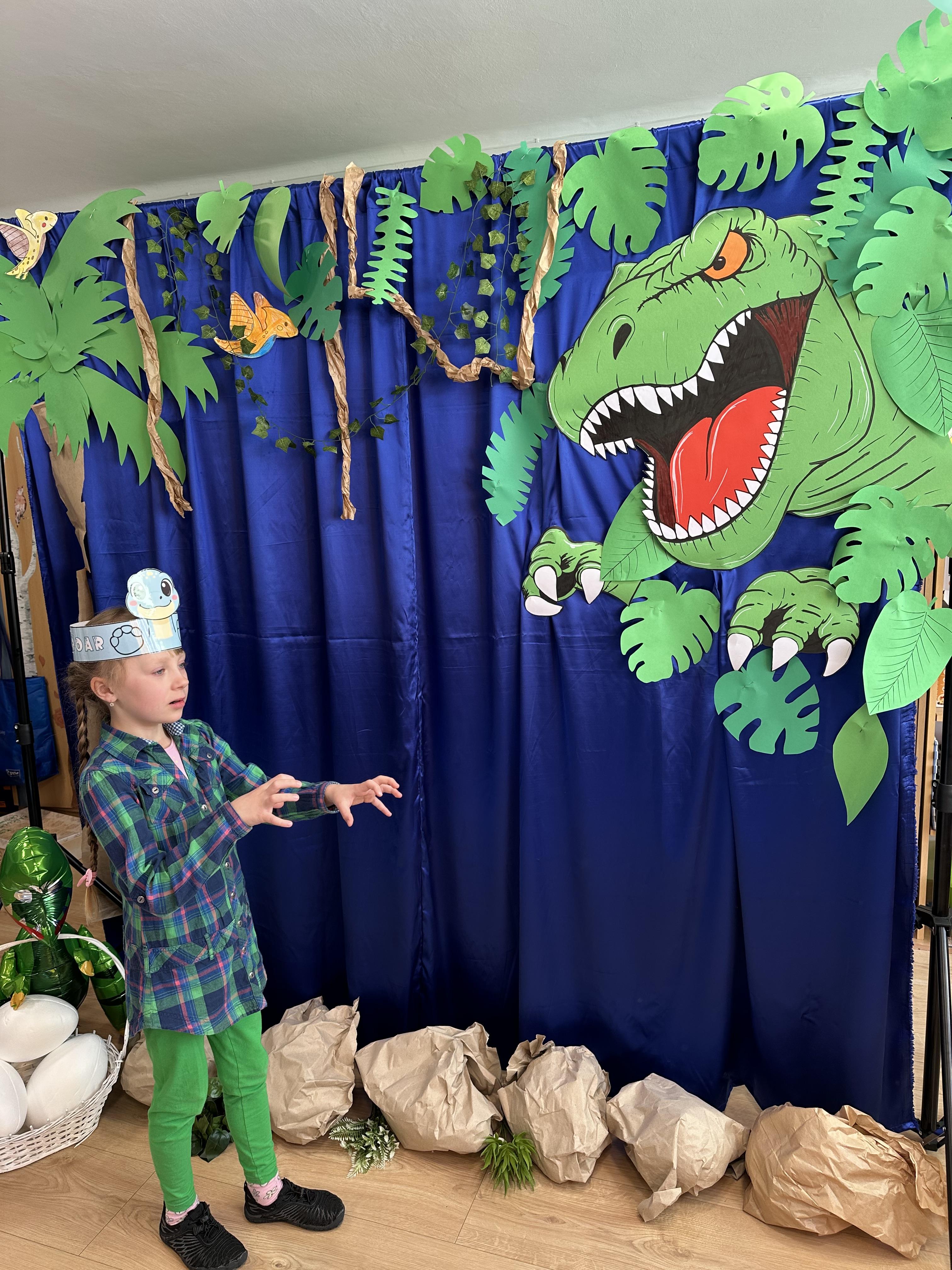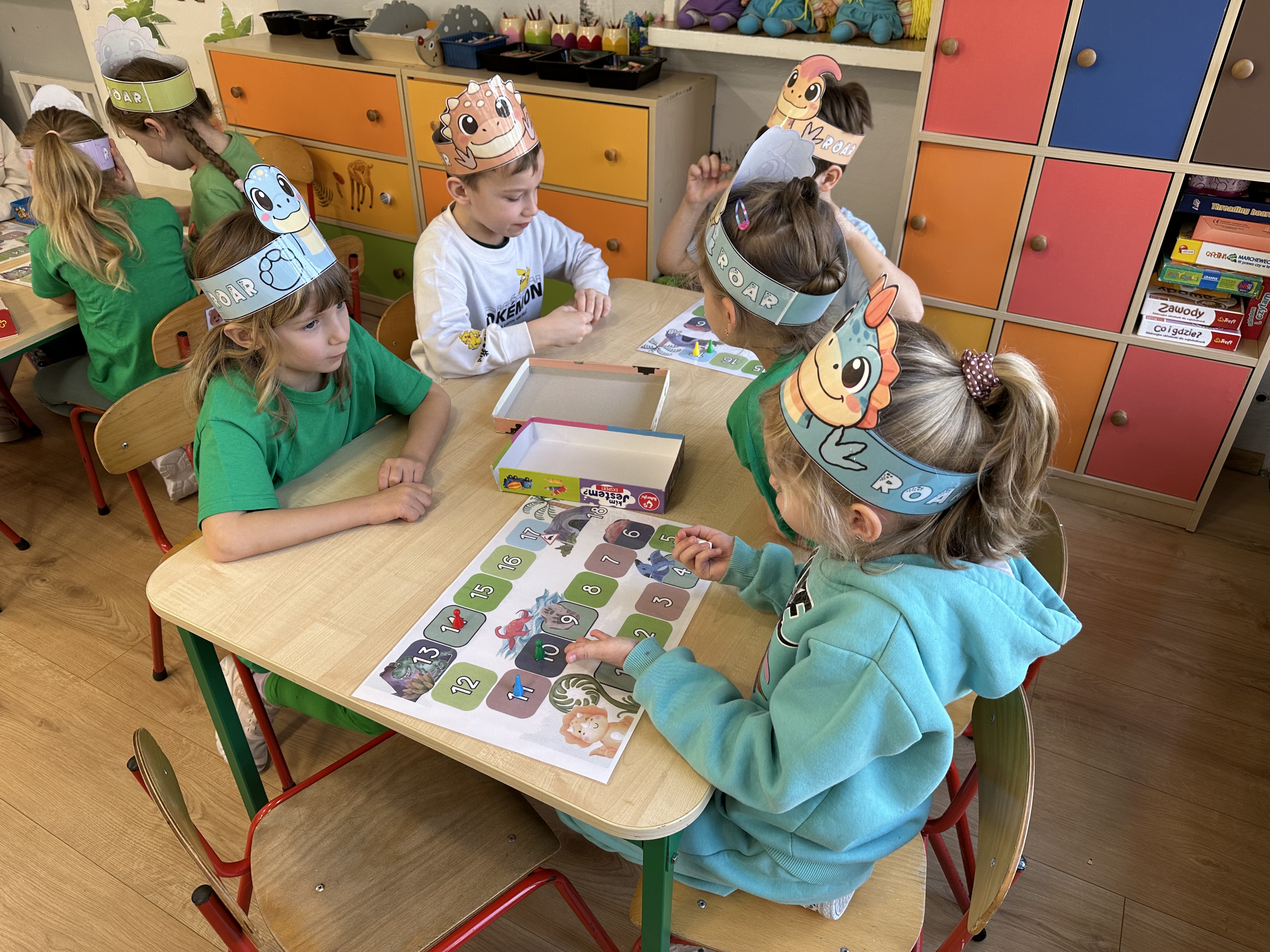 W naszej grupie odbył się Dzień Dinozaura, który dostarczył dzieciom wielu radosnych chwil oraz wzbogacił ich wiedzę o prehistorycznym świecie. Już od samego rana w sali został przygotowany kącik dinozaurów, w którym znalazły się figurki, książki oraz ilustracje przedstawiające różne gatunki tych niezwykłych stworzeń. Jedną z pierwszych aktywności była zabawa w paleontologów. Dzieci z ogromnym zaangażowaniem poszukiwały ukrytych „skamieniałości” i figurek dinozaurów, ucząc się przy tym, na czym polega praca naukowca badającego przeszłość Ziemi. Następnie wspólnie segregowały dinozaury na roślinożerne i mięsożerne, poznając ich charakterystyczne cechy oraz sposób odżywiania. Kolejnym punktem programu były „Dino-malowanki” – przestrzenna praca plastyczna, podczas której dzieci rozwijały swoją wyobraźnię i zdolności manualne. Duże zainteresowanie wzbudził również eksperyment „Wulkan”. Wykorzystując sodę i ocet, dzieci mogły zaobserwować efektowną „erupcję”, co było nie tylko świetną zabawą, ale także ciekawą lekcją przyrody. Nie zabrakło również aktywności ruchowych i gier. W „Wyścigach dinozaurów” dzieci sprawdzały, który dinozaur najszybciej dotrze do mety. Dużo emocji dostarczyła także gra „Dino droga”, w której zadaniem było bezpieczne przeprowadzenie dinozaurów przez prehistoryczny krajobraz pełen przygód i niespodzianek. Na zakończenie odbył się quiz sprawdzający wiadomości o dinozaurach. Dzieci wykazały się dużą wiedzą i zaangażowaniem. Dzień zakończył się wykonaniem pamiątkowej fotografii, która będzie miłym wspomnieniem wspólnie spędzonego czasu. Obchody Dnia Dinozaura były nie tylko okazją do świetnej zabawy, ale również do zdobywania nowych informacji i rozwijania zainteresowań przyrodniczych.