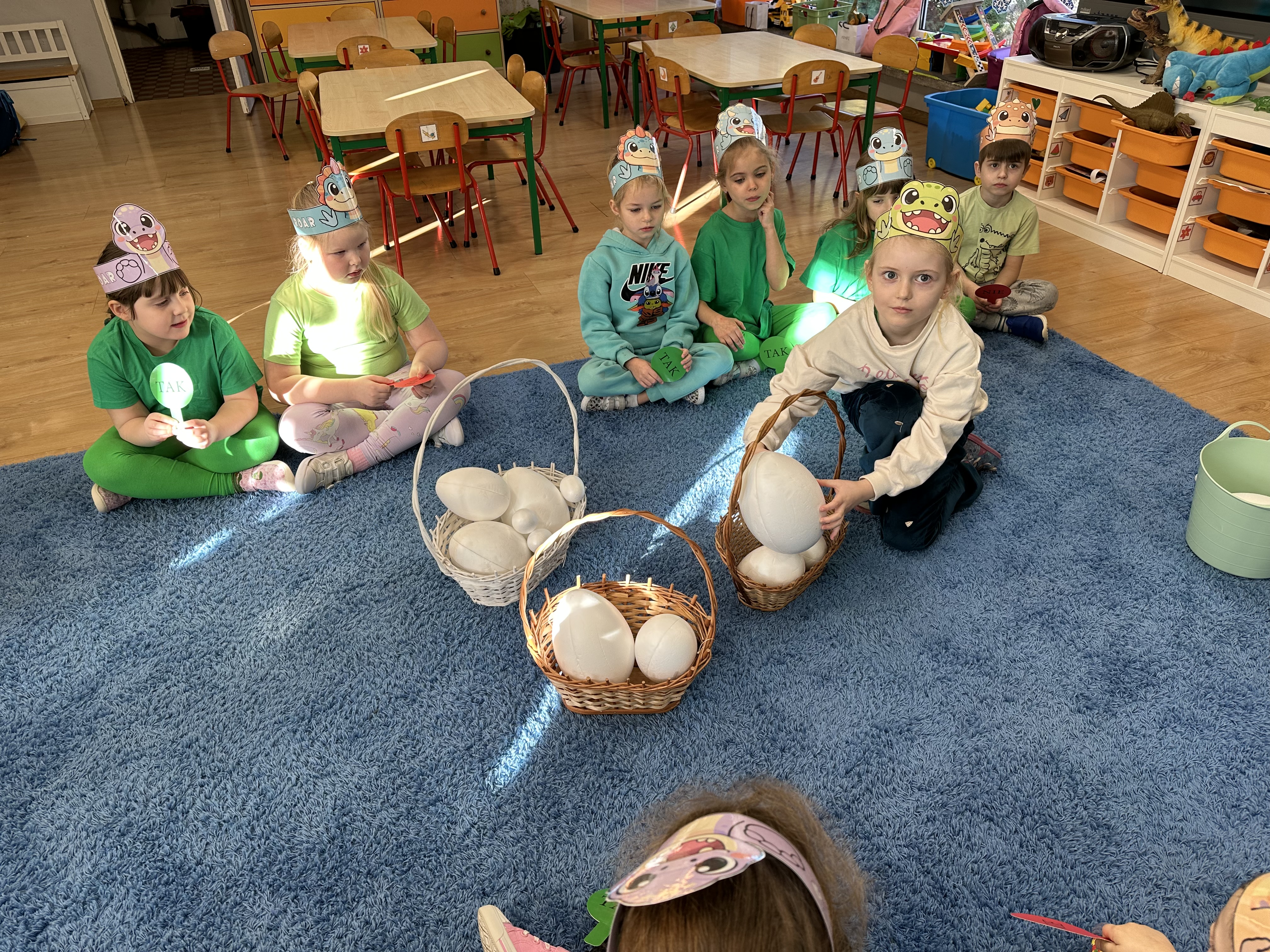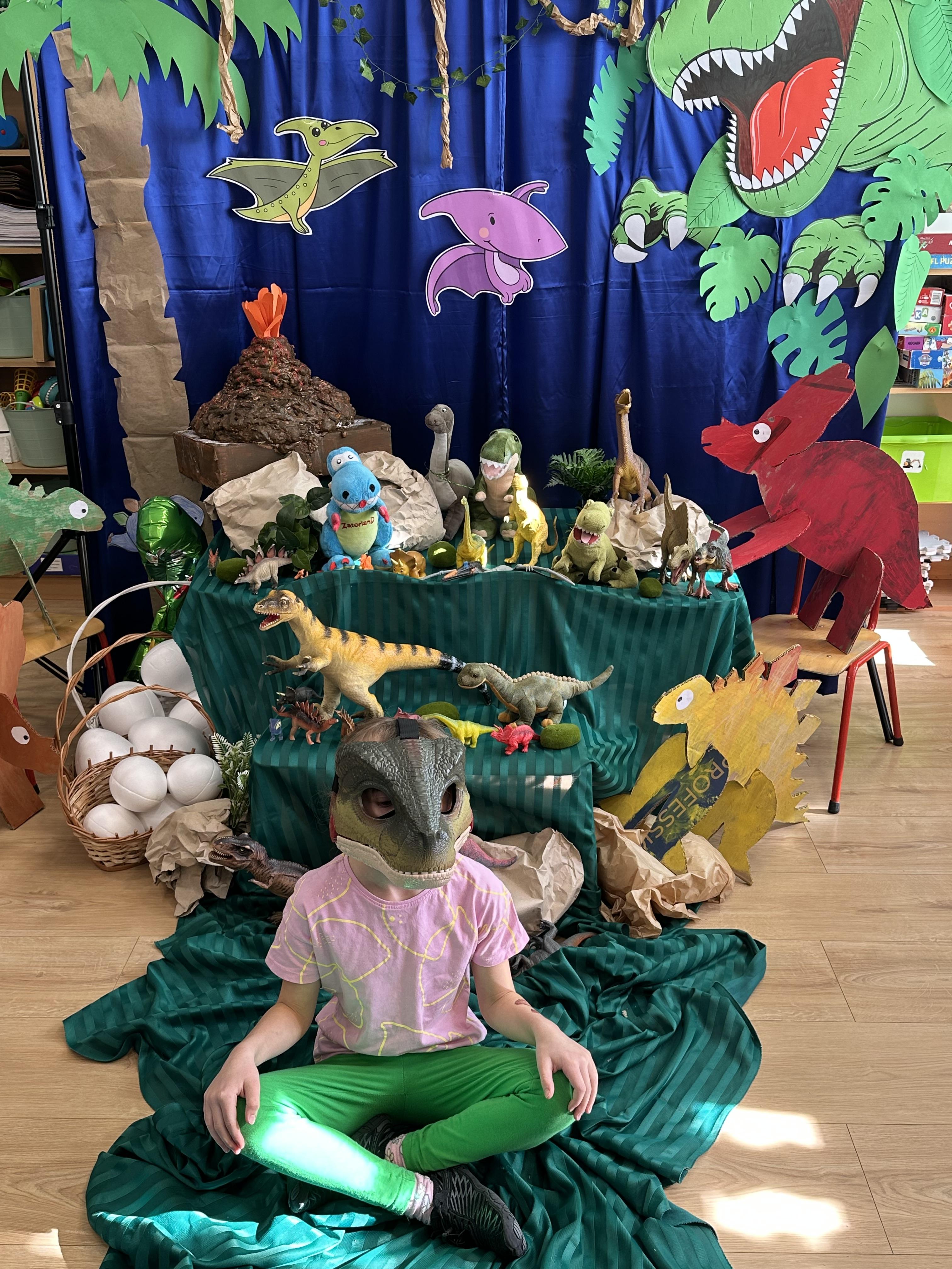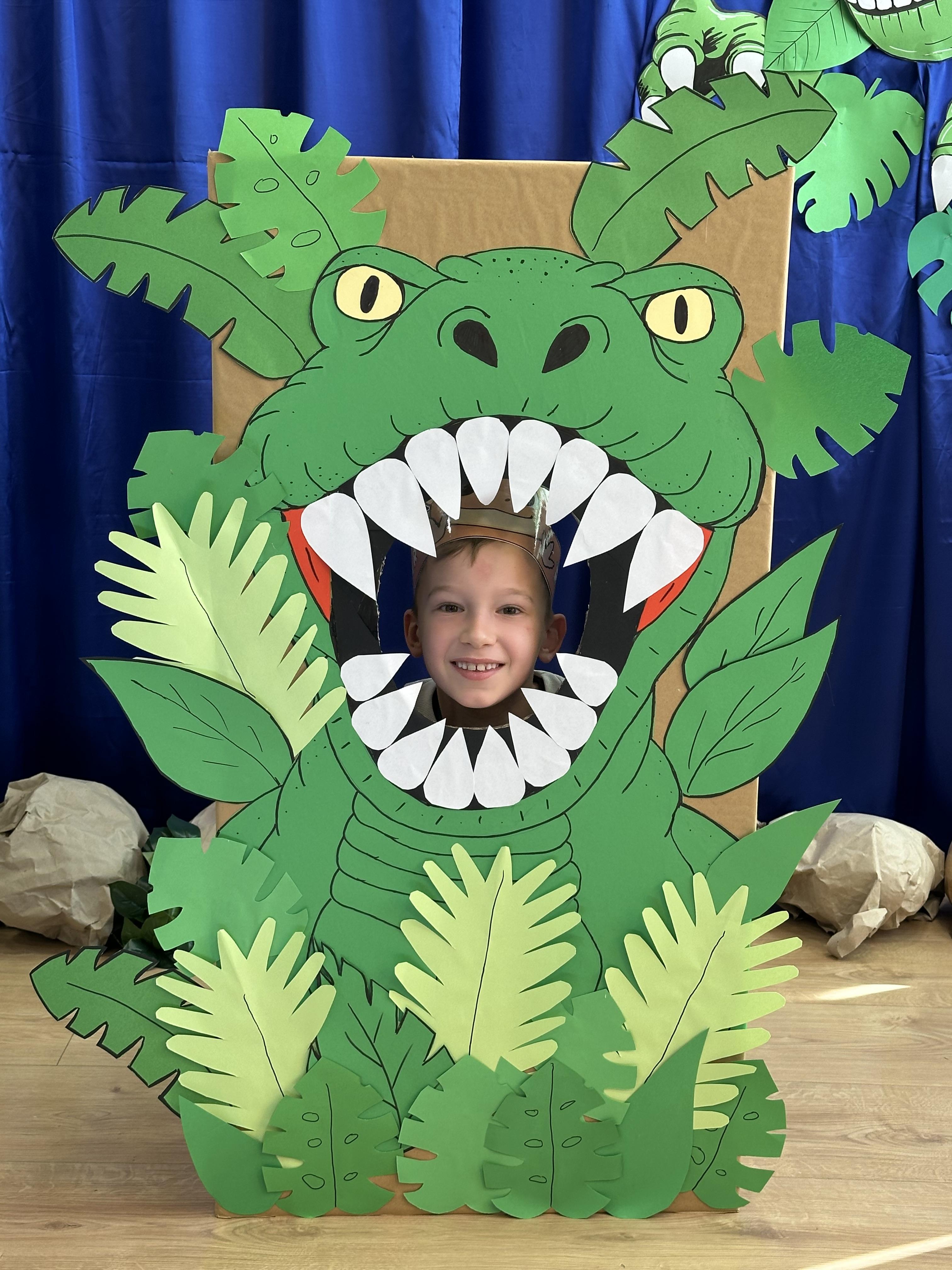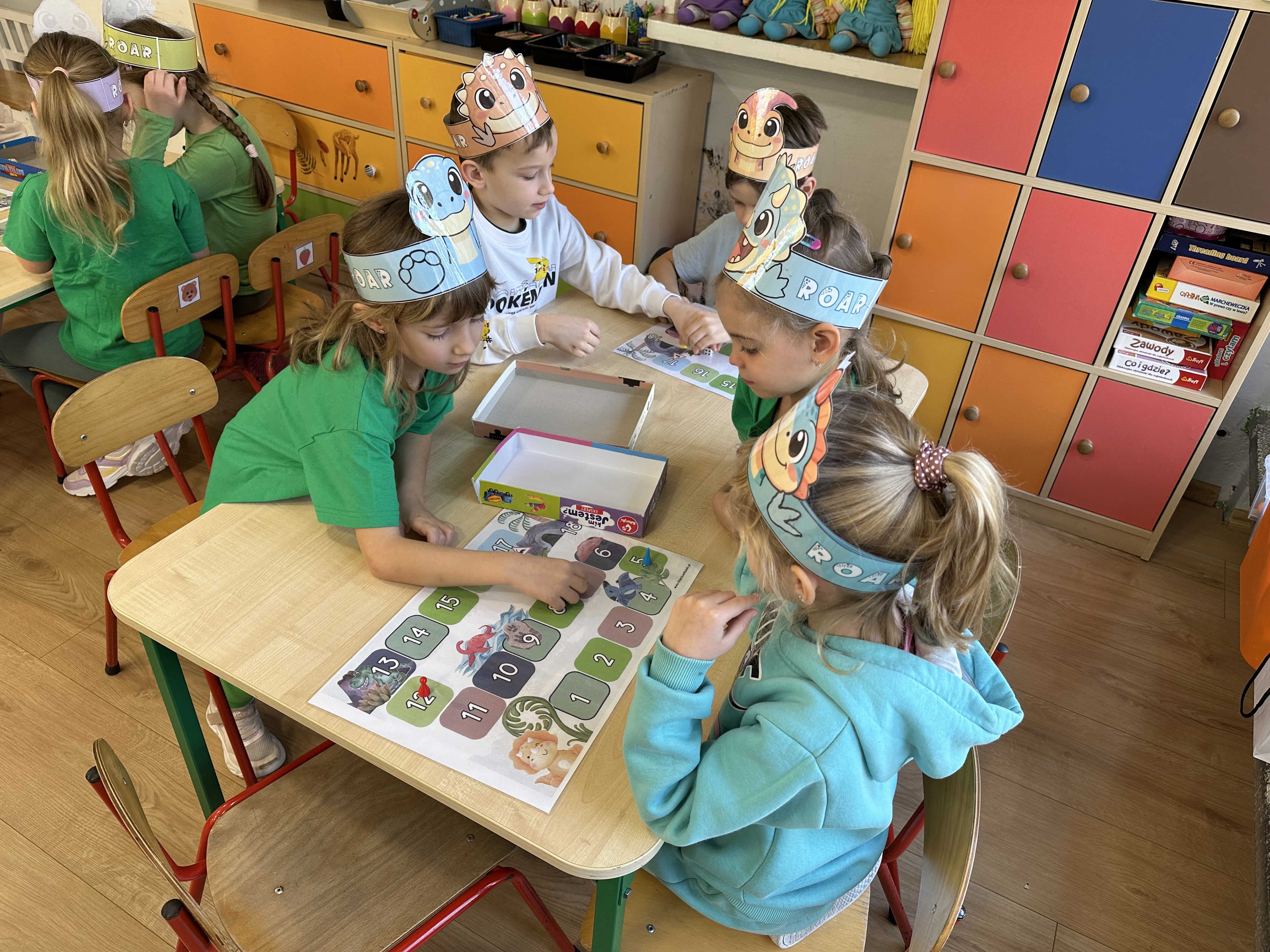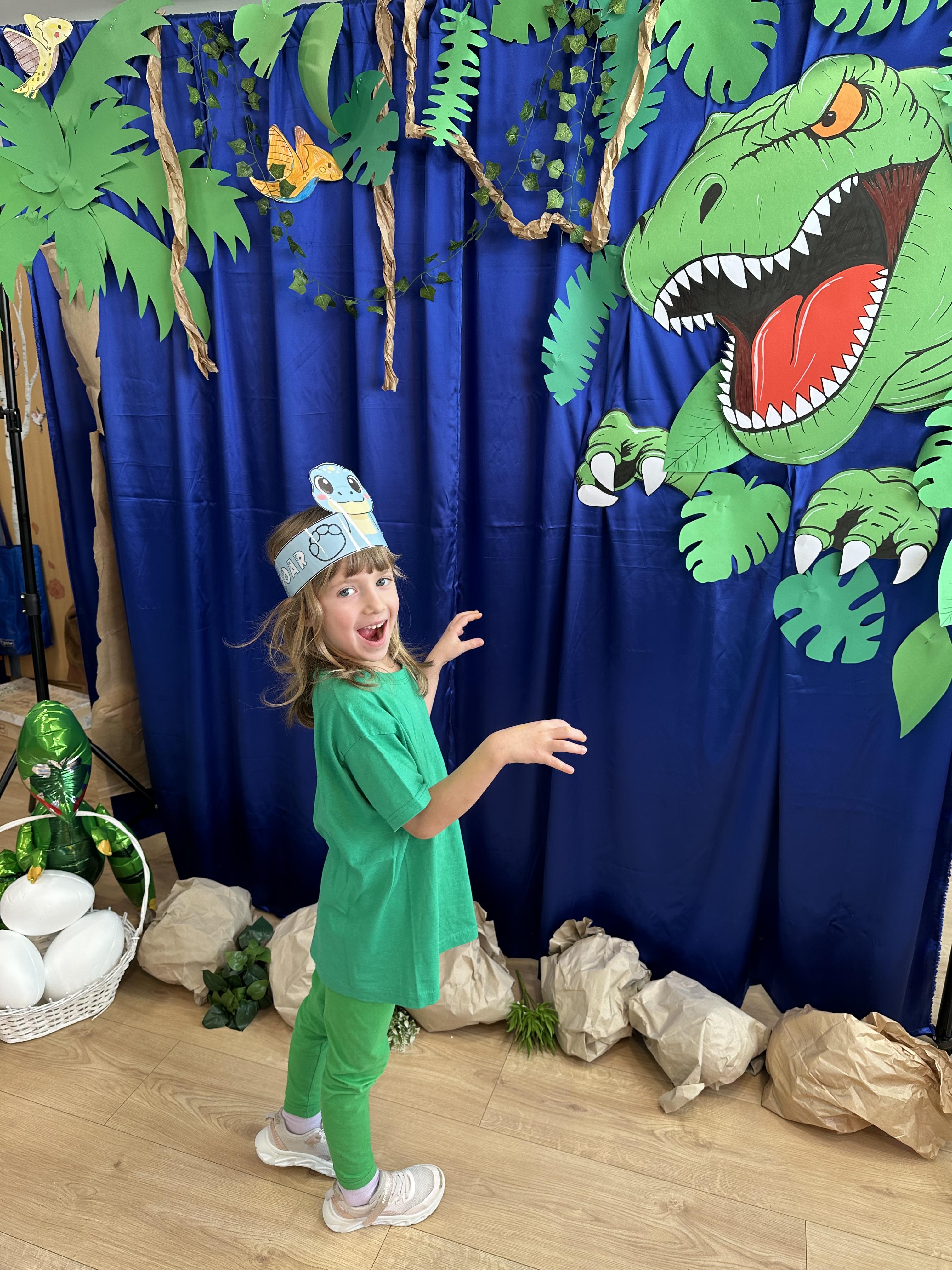 W naszej grupie odbył się Dzień Dinozaura, który dostarczył dzieciom wielu radosnych chwil oraz wzbogacił ich wiedzę o prehistorycznym świecie. Już od samego rana w sali został przygotowany kącik dinozaurów, w którym znalazły się figurki, książki oraz ilustracje przedstawiające różne gatunki tych niezwykłych stworzeń. Jedną z pierwszych aktywności była zabawa w paleontologów. Dzieci z ogromnym zaangażowaniem poszukiwały ukrytych „skamieniałości” i figurek dinozaurów, ucząc się przy tym, na czym polega praca naukowca badającego przeszłość Ziemi. Następnie wspólnie segregowały dinozaury na roślinożerne i mięsożerne, poznając ich charakterystyczne cechy oraz sposób odżywiania. Kolejnym punktem programu były „Dino-malowanki” – przestrzenna praca plastyczna, podczas której dzieci rozwijały swoją wyobraźnię i zdolności manualne. Duże zainteresowanie wzbudził również eksperyment „Wulkan”. Wykorzystując sodę i ocet, dzieci mogły zaobserwować efektowną „erupcję”, co było nie tylko świetną zabawą, ale także ciekawą lekcją przyrody. Nie zabrakło również aktywności ruchowych i gier. W „Wyścigach dinozaurów” dzieci sprawdzały, który dinozaur najszybciej dotrze do mety. Dużo emocji dostarczyła także gra „Dino droga”, w której zadaniem było bezpieczne przeprowadzenie dinozaurów przez prehistoryczny krajobraz pełen przygód i niespodzianek. Na zakończenie odbył się quiz sprawdzający wiadomości o dinozaurach. Dzieci wykazały się dużą wiedzą i zaangażowaniem. Dzień zakończył się wykonaniem pamiątkowej fotografii, która będzie miłym wspomnieniem wspólnie spędzonego czasu. Obchody Dnia Dinozaura były nie tylko okazją do świetnej zabawy, ale również do zdobywania nowych informacji i rozwijania zainteresowań przyrodniczych.