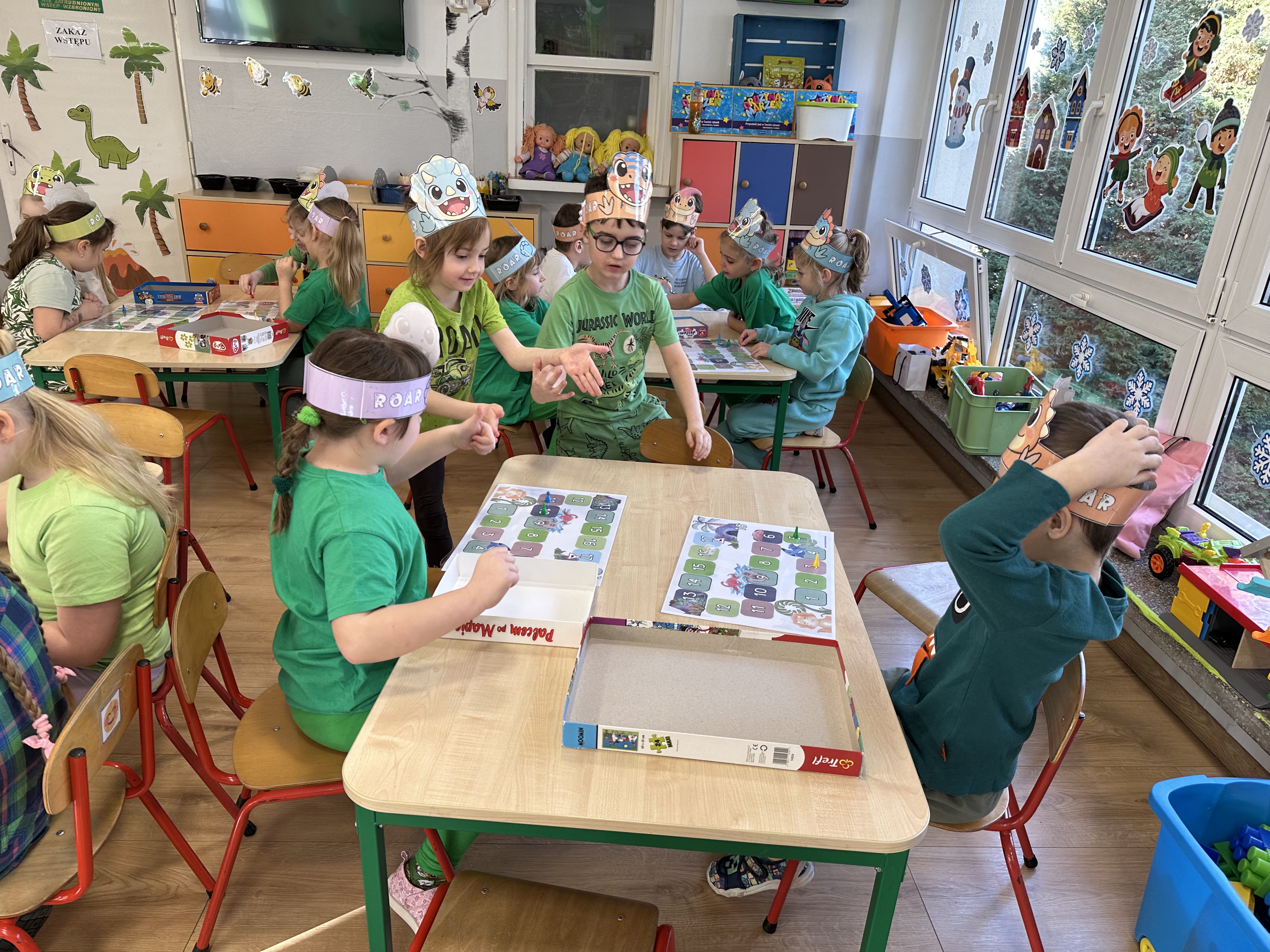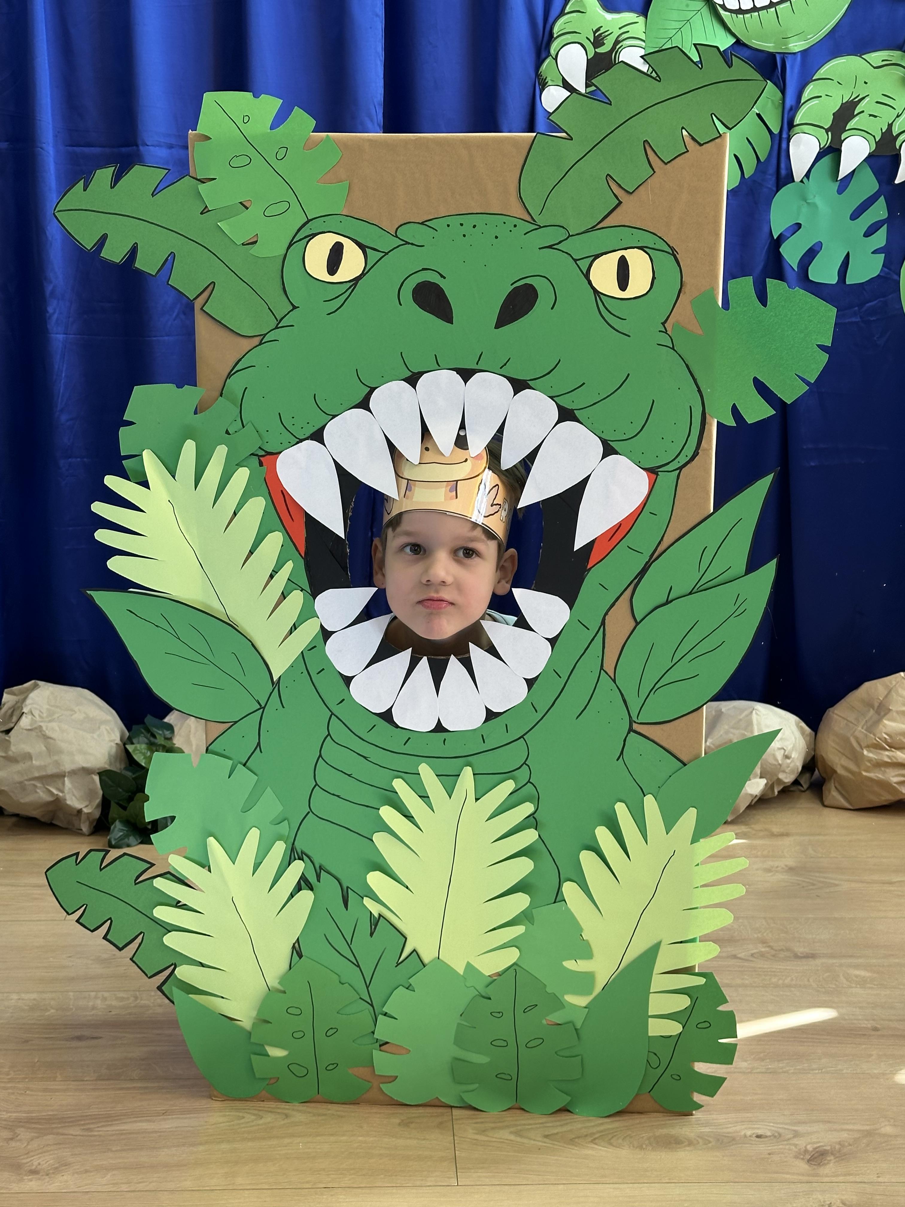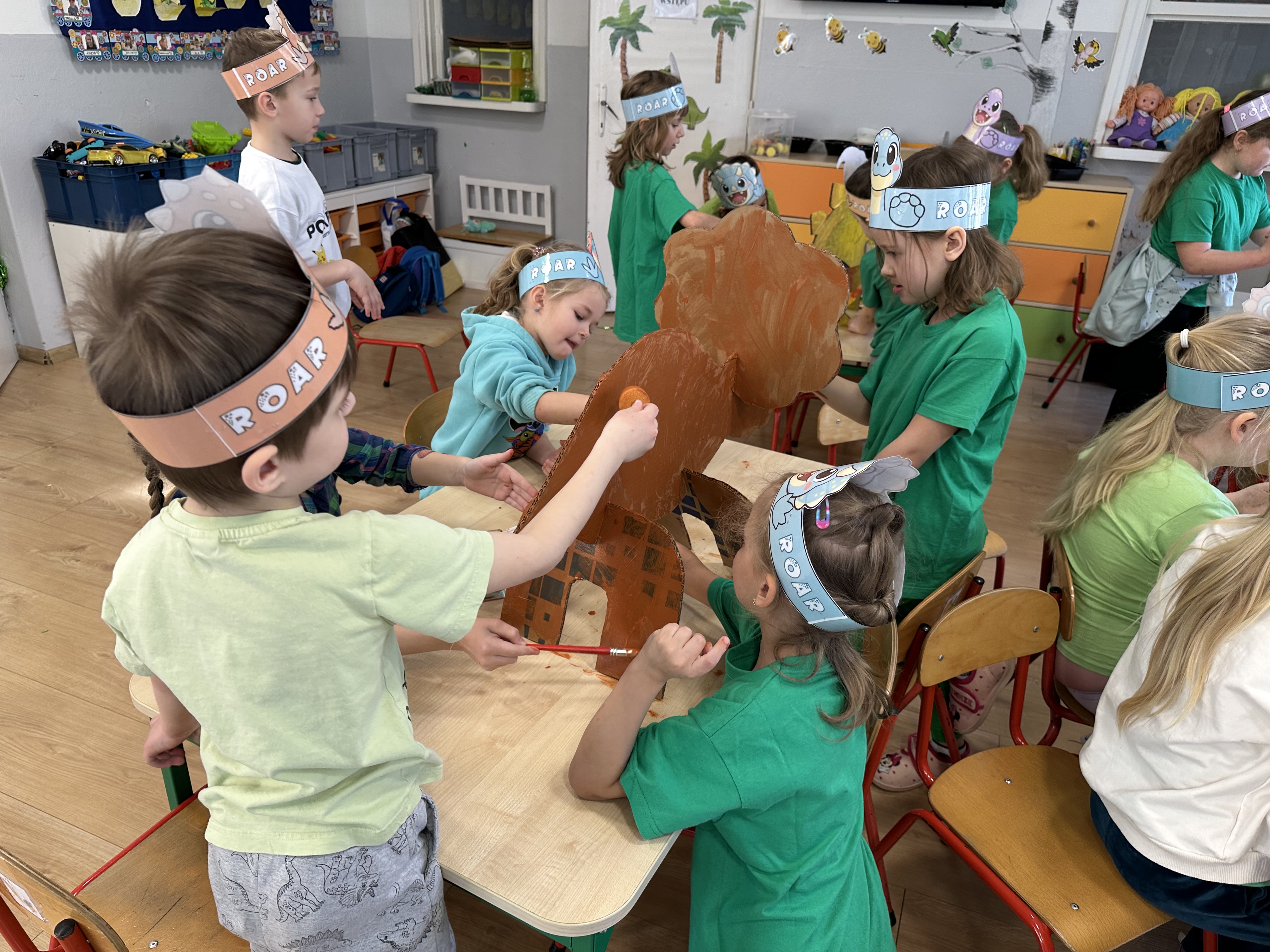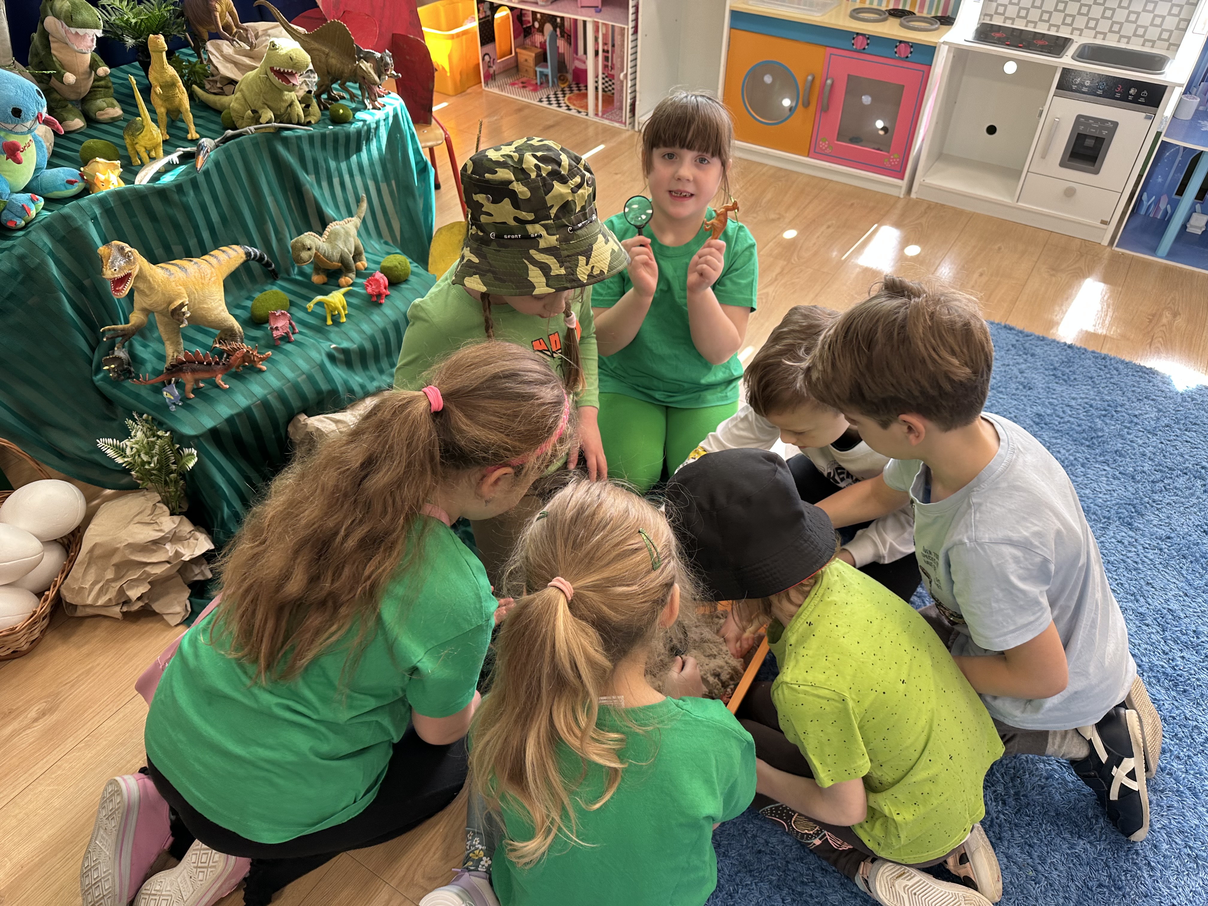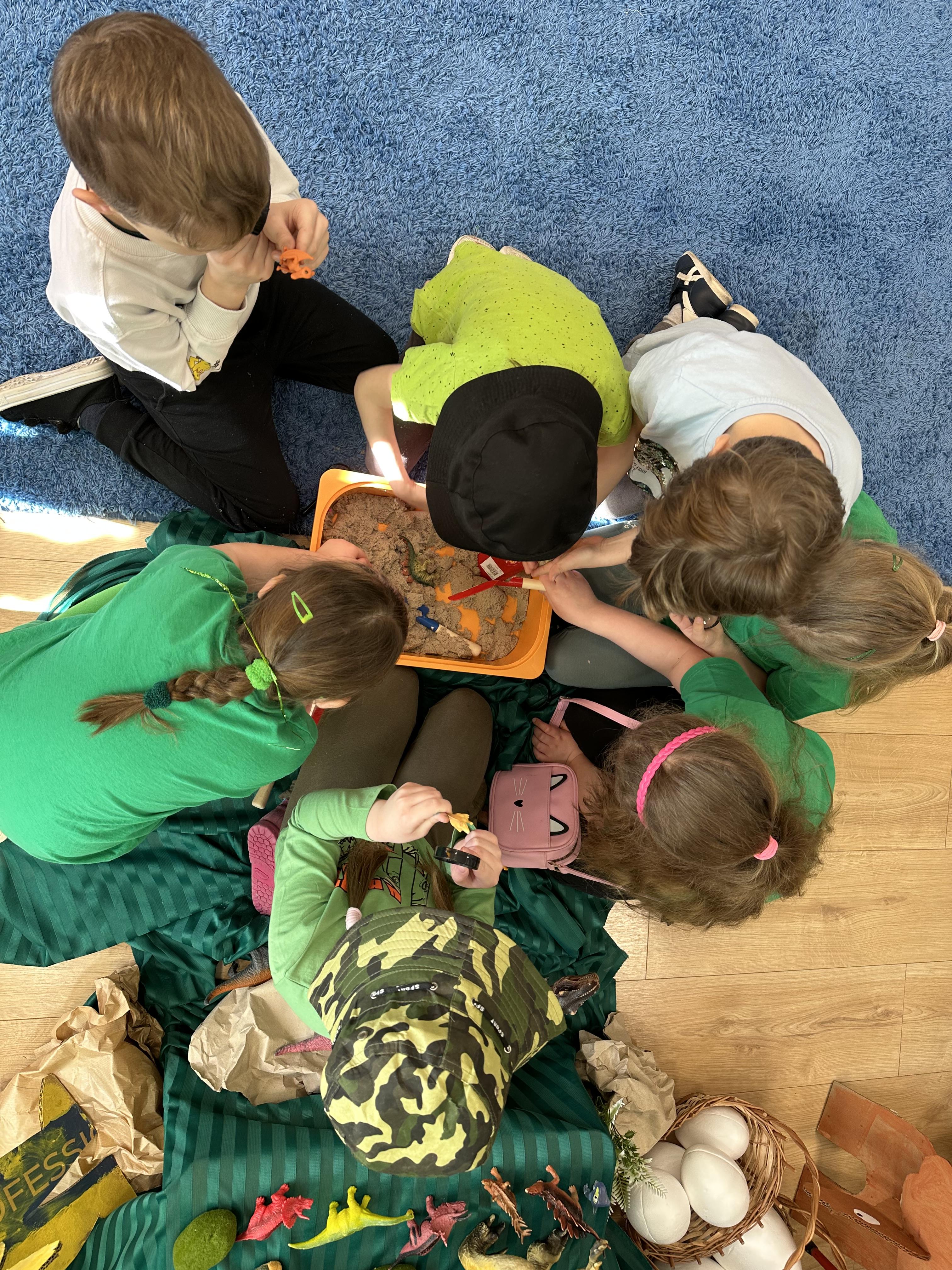 W naszej grupie odbył się Dzień Dinozaura, który dostarczył dzieciom wielu radosnych chwil oraz wzbogacił ich wiedzę o prehistorycznym świecie. Już od samego rana w sali został przygotowany kącik dinozaurów, w którym znalazły się figurki, książki oraz ilustracje przedstawiające różne gatunki tych niezwykłych stworzeń. Jedną z pierwszych aktywności była zabawa w paleontologów. Dzieci z ogromnym zaangażowaniem poszukiwały ukrytych „skamieniałości” i figurek dinozaurów, ucząc się przy tym, na czym polega praca naukowca badającego przeszłość Ziemi. Następnie wspólnie segregowały dinozaury na roślinożerne i mięsożerne, poznając ich charakterystyczne cechy oraz sposób odżywiania. Kolejnym punktem programu były „Dino-malowanki” – przestrzenna praca plastyczna, podczas której dzieci rozwijały swoją wyobraźnię i zdolności manualne. Duże zainteresowanie wzbudził również eksperyment „Wulkan”. Wykorzystując sodę i ocet, dzieci mogły zaobserwować efektowną „erupcję”, co było nie tylko świetną zabawą, ale także ciekawą lekcją przyrody. Nie zabrakło również aktywności ruchowych i gier. W „Wyścigach dinozaurów” dzieci sprawdzały, który dinozaur najszybciej dotrze do mety. Dużo emocji dostarczyła także gra „Dino droga”, w której zadaniem było bezpieczne przeprowadzenie dinozaurów przez prehistoryczny krajobraz pełen przygód i niespodzianek. Na zakończenie odbył się quiz sprawdzający wiadomości o dinozaurach. Dzieci wykazały się dużą wiedzą i zaangażowaniem. Dzień zakończył się wykonaniem pamiątkowej fotografii, która będzie miłym wspomnieniem wspólnie spędzonego czasu. Obchody Dnia Dinozaura były nie tylko okazją do świetnej zabawy, ale również do zdobywania nowych informacji i rozwijania zainteresowań przyrodniczych.