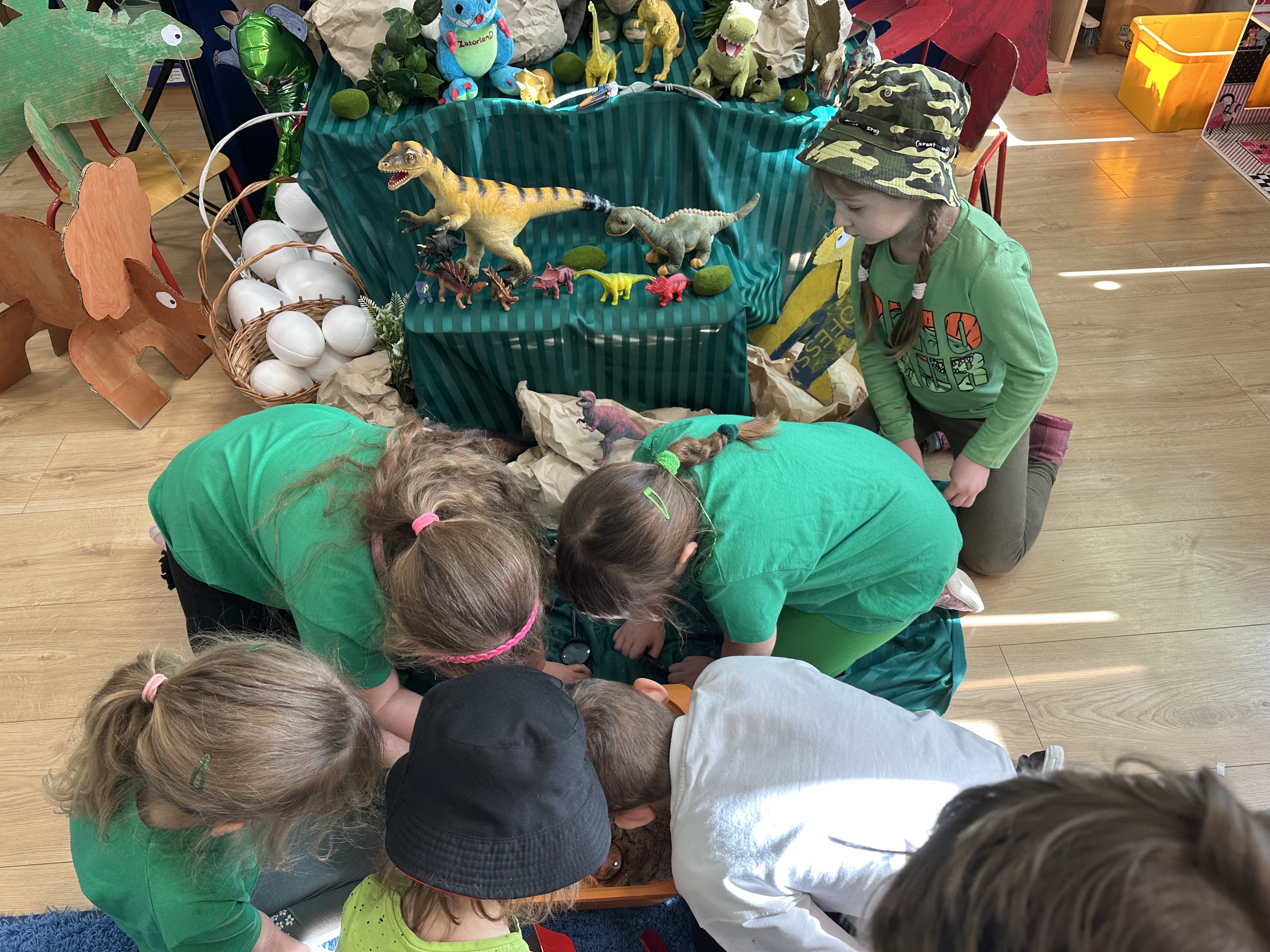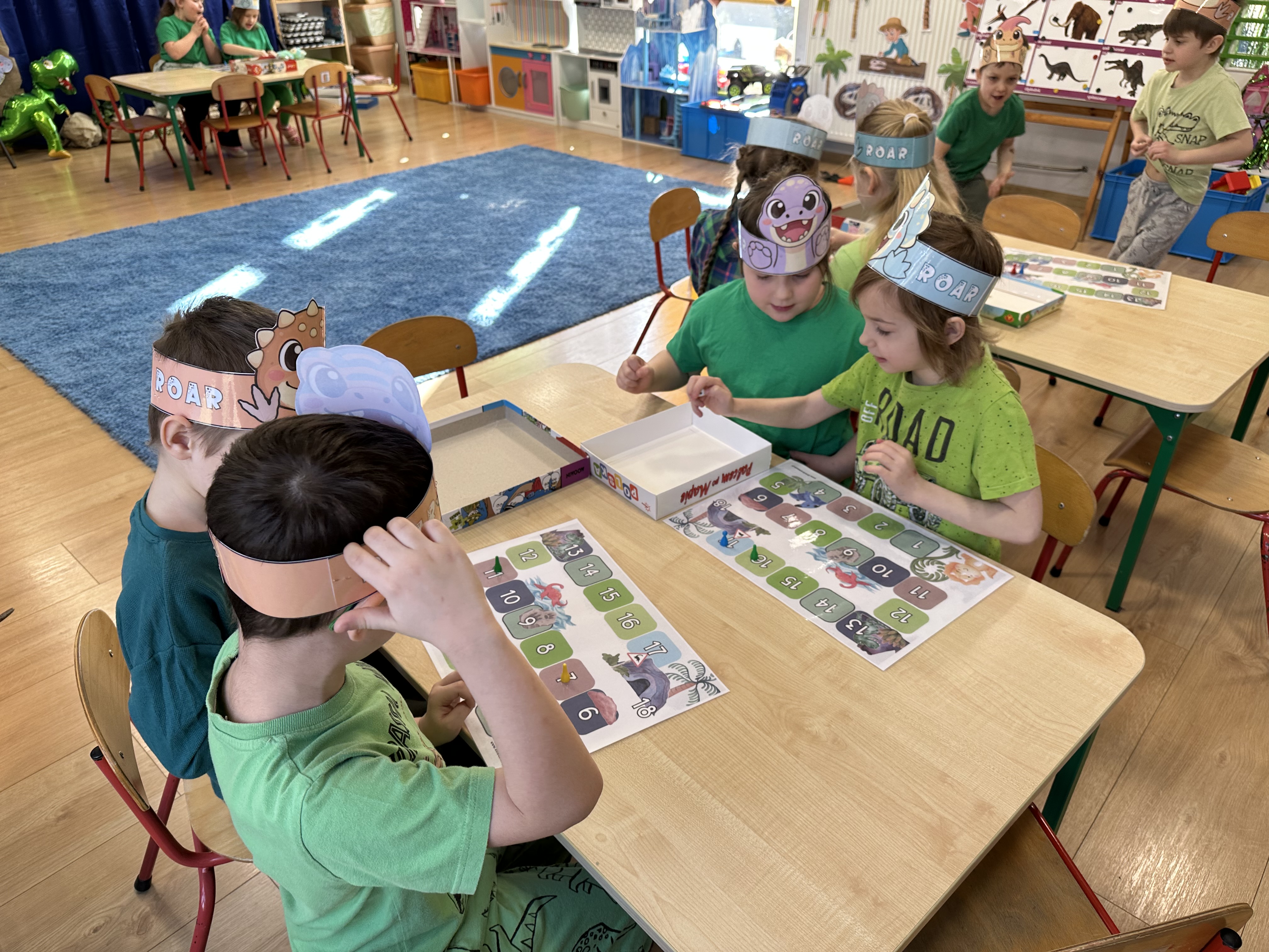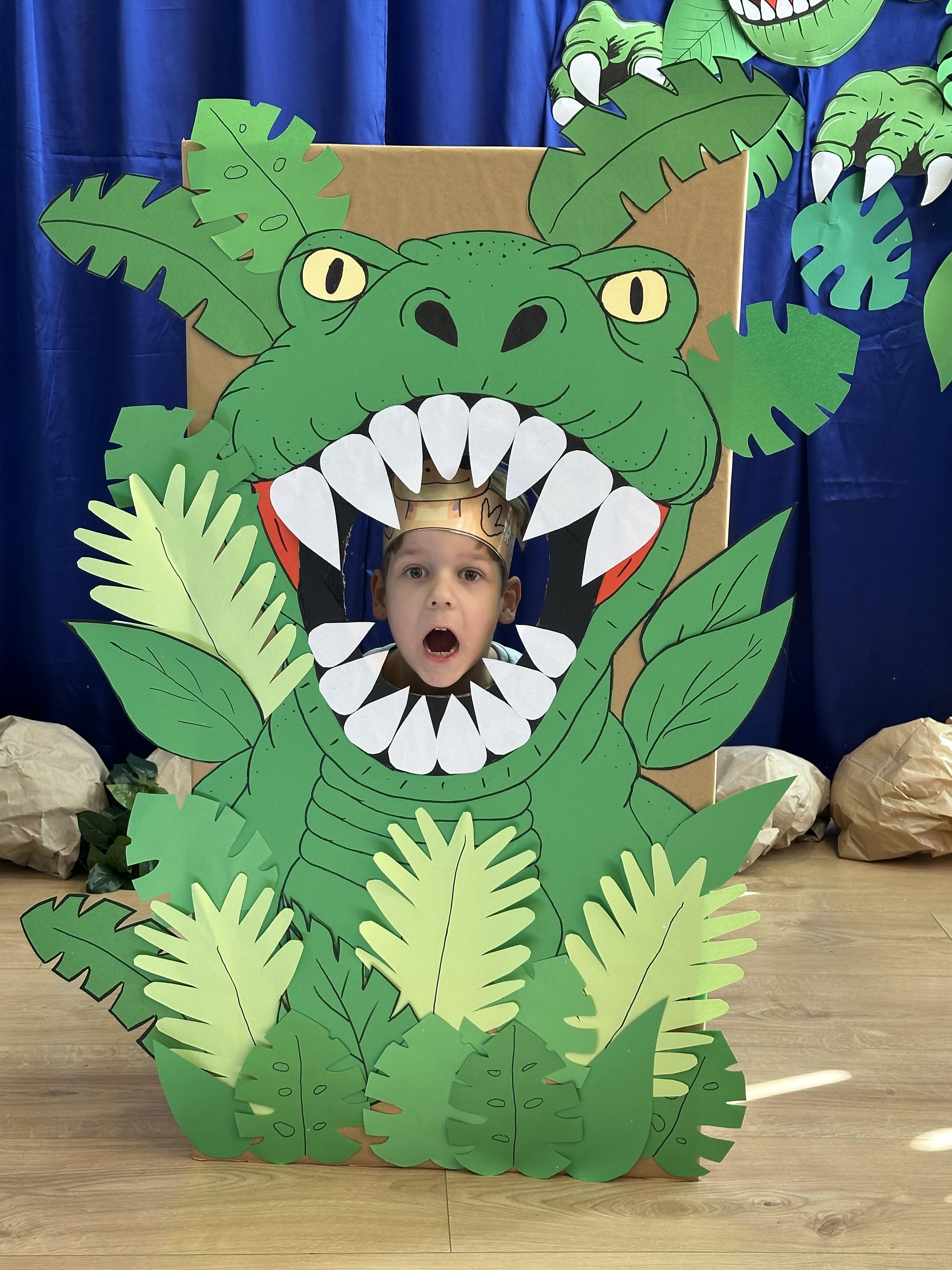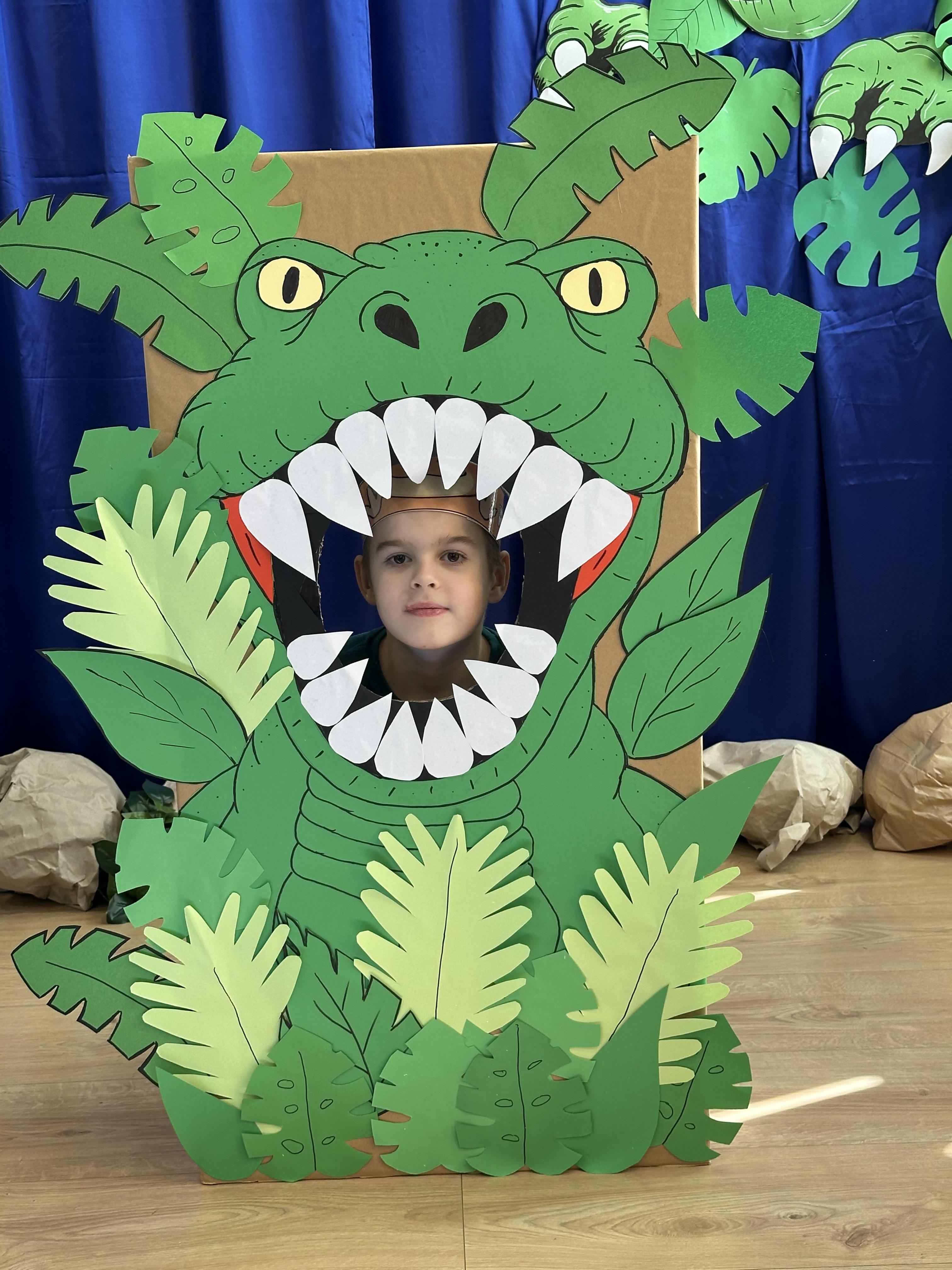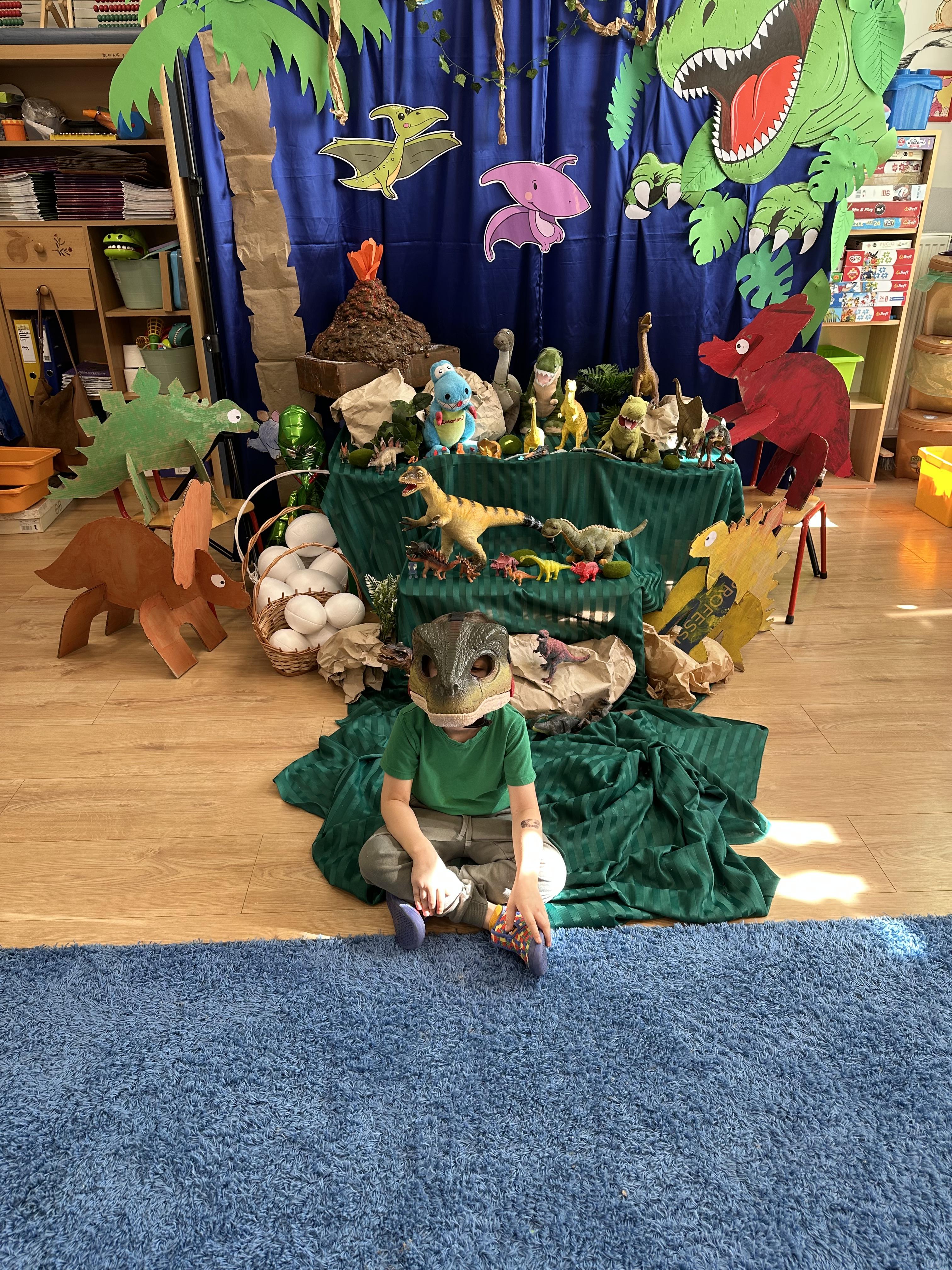 W naszej grupie odbył się Dzień Dinozaura, który dostarczył dzieciom wielu radosnych chwil oraz wzbogacił ich wiedzę o prehistorycznym świecie. Już od samego rana w sali został przygotowany kącik dinozaurów, w którym znalazły się figurki, książki oraz ilustracje przedstawiające różne gatunki tych niezwykłych stworzeń. Jedną z pierwszych aktywności była zabawa w paleontologów. Dzieci z ogromnym zaangażowaniem poszukiwały ukrytych „skamieniałości” i figurek dinozaurów, ucząc się przy tym, na czym polega praca naukowca badającego przeszłość Ziemi. Następnie wspólnie segregowały dinozaury na roślinożerne i mięsożerne, poznając ich charakterystyczne cechy oraz sposób odżywiania. Kolejnym punktem programu były „Dino-malowanki” – przestrzenna praca plastyczna, podczas której dzieci rozwijały swoją wyobraźnię i zdolności manualne. Duże zainteresowanie wzbudził również eksperyment „Wulkan”. Wykorzystując sodę i ocet, dzieci mogły zaobserwować efektowną „erupcję”, co było nie tylko świetną zabawą, ale także ciekawą lekcją przyrody. Nie zabrakło również aktywności ruchowych i gier. W „Wyścigach dinozaurów” dzieci sprawdzały, który dinozaur najszybciej dotrze do mety. Dużo emocji dostarczyła także gra „Dino droga”, w której zadaniem było bezpieczne przeprowadzenie dinozaurów przez prehistoryczny krajobraz pełen przygód i niespodzianek. Na zakończenie odbył się quiz sprawdzający wiadomości o dinozaurach. Dzieci wykazały się dużą wiedzą i zaangażowaniem. Dzień zakończył się wykonaniem pamiątkowej fotografii, która będzie miłym wspomnieniem wspólnie spędzonego czasu. Obchody Dnia Dinozaura były nie tylko okazją do świetnej zabawy, ale również do zdobywania nowych informacji i rozwijania zainteresowań przyrodniczych.