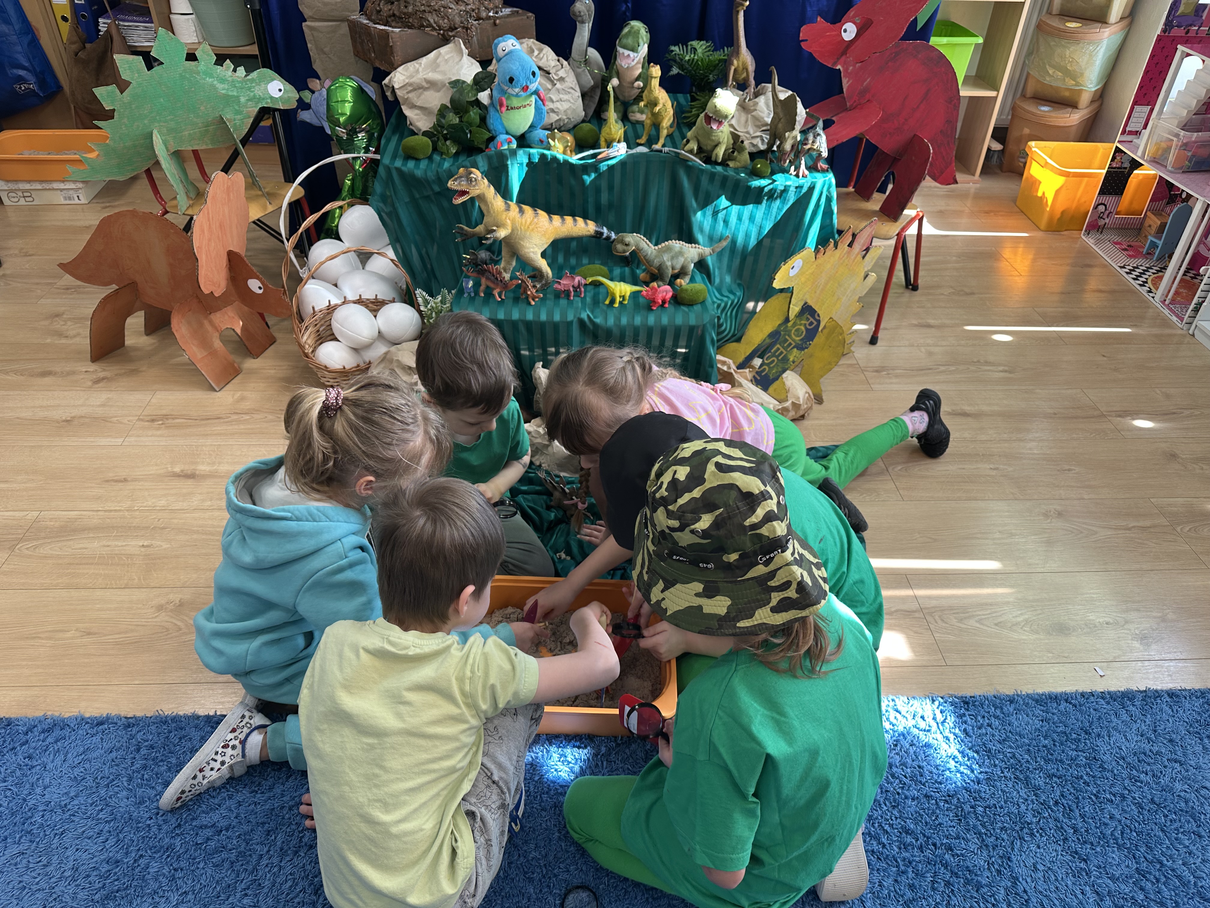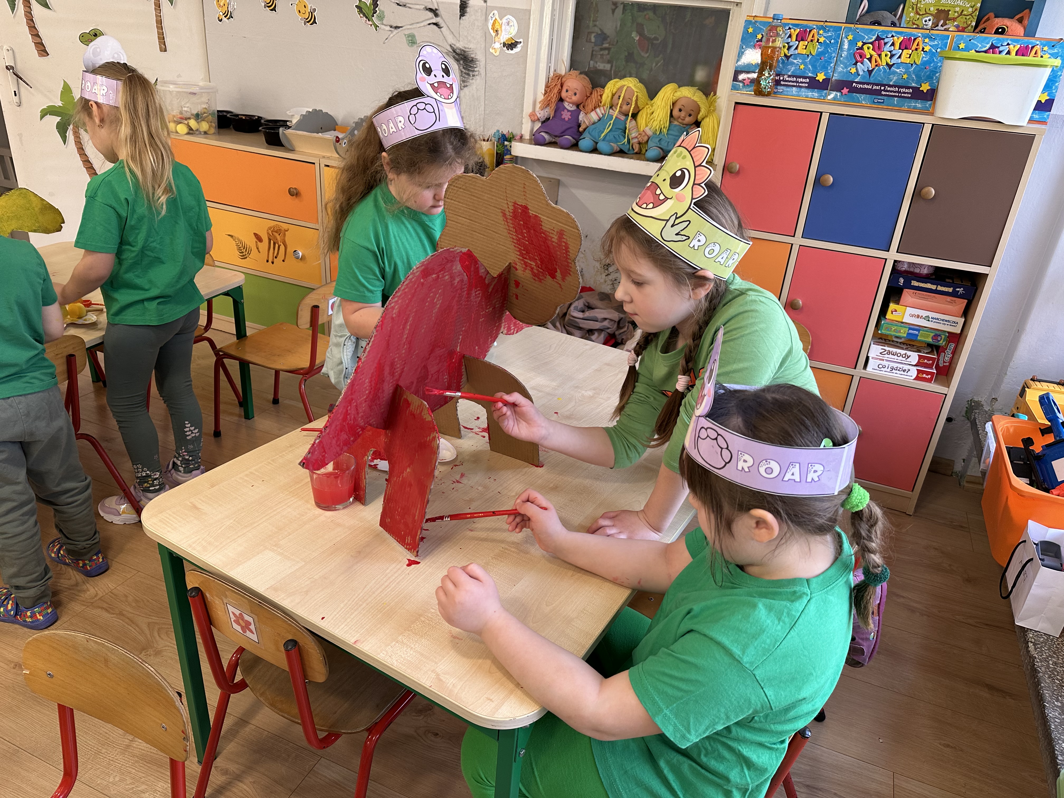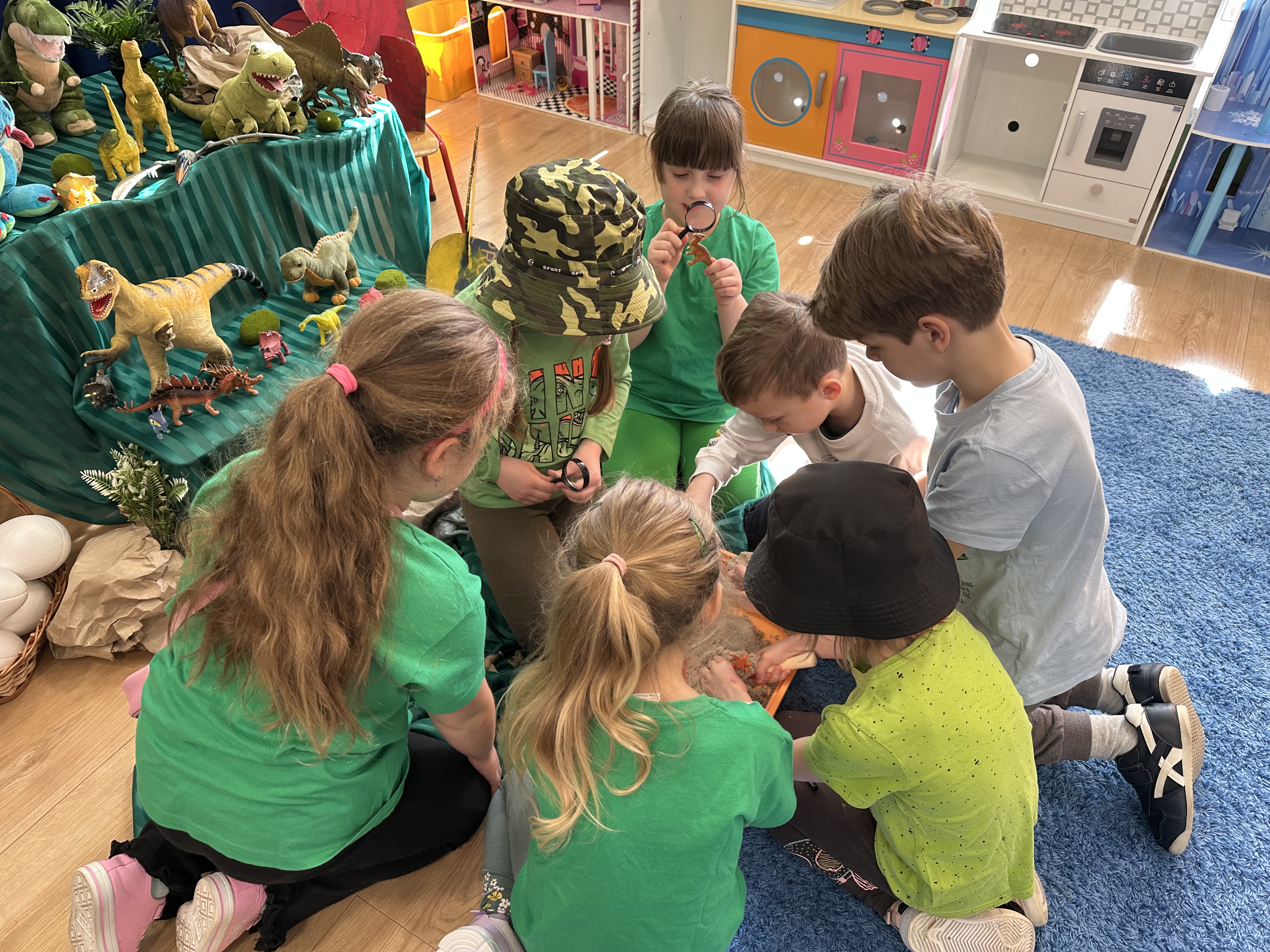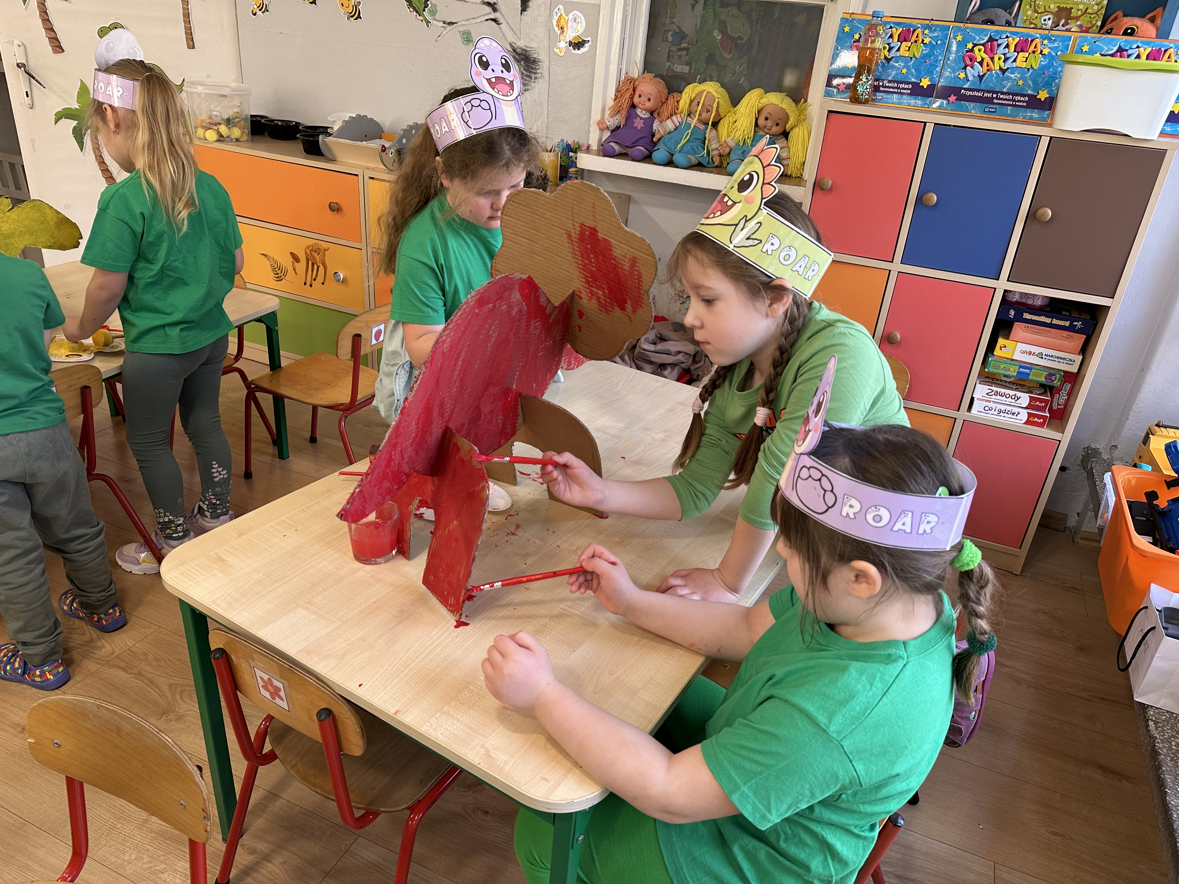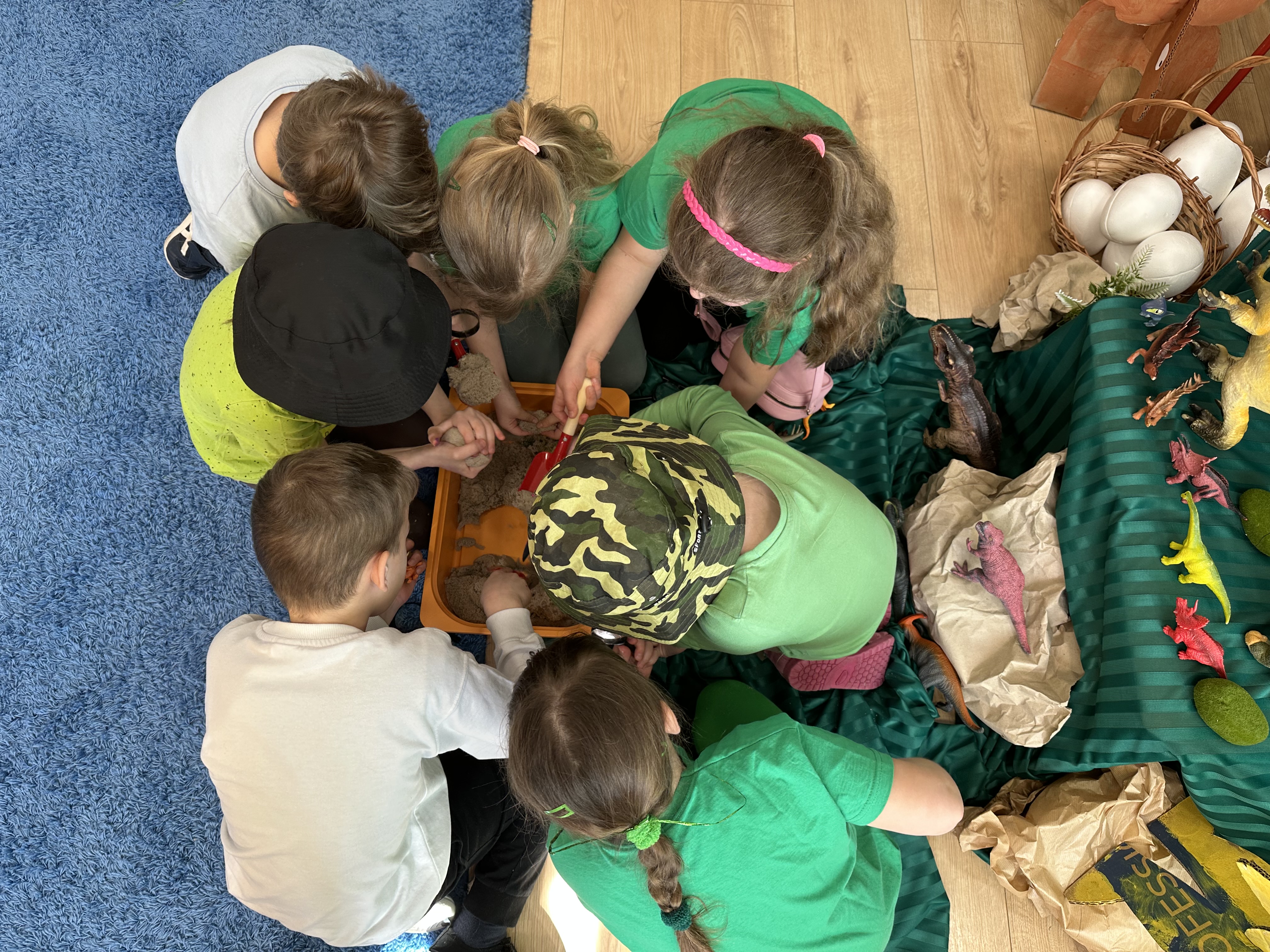 W naszej grupie odbył się Dzień Dinozaura, który dostarczył dzieciom wielu radosnych chwil oraz wzbogacił ich wiedzę o prehistorycznym świecie. Już od samego rana w sali został przygotowany kącik dinozaurów, w którym znalazły się figurki, książki oraz ilustracje przedstawiające różne gatunki tych niezwykłych stworzeń. Jedną z pierwszych aktywności była zabawa w paleontologów. Dzieci z ogromnym zaangażowaniem poszukiwały ukrytych „skamieniałości” i figurek dinozaurów, ucząc się przy tym, na czym polega praca naukowca badającego przeszłość Ziemi. Następnie wspólnie segregowały dinozaury na roślinożerne i mięsożerne, poznając ich charakterystyczne cechy oraz sposób odżywiania. Kolejnym punktem programu były „Dino-malowanki” – przestrzenna praca plastyczna, podczas której dzieci rozwijały swoją wyobraźnię i zdolności manualne. Duże zainteresowanie wzbudził również eksperyment „Wulkan”. Wykorzystując sodę i ocet, dzieci mogły zaobserwować efektowną „erupcję”, co było nie tylko świetną zabawą, ale także ciekawą lekcją przyrody. Nie zabrakło również aktywności ruchowych i gier. W „Wyścigach dinozaurów” dzieci sprawdzały, który dinozaur najszybciej dotrze do mety. Dużo emocji dostarczyła także gra „Dino droga”, w której zadaniem było bezpieczne przeprowadzenie dinozaurów przez prehistoryczny krajobraz pełen przygód i niespodzianek. Na zakończenie odbył się quiz sprawdzający wiadomości o dinozaurach. Dzieci wykazały się dużą wiedzą i zaangażowaniem. Dzień zakończył się wykonaniem pamiątkowej fotografii, która będzie miłym wspomnieniem wspólnie spędzonego czasu. Obchody Dnia Dinozaura były nie tylko okazją do świetnej zabawy, ale również do zdobywania nowych informacji i rozwijania zainteresowań przyrodniczych.