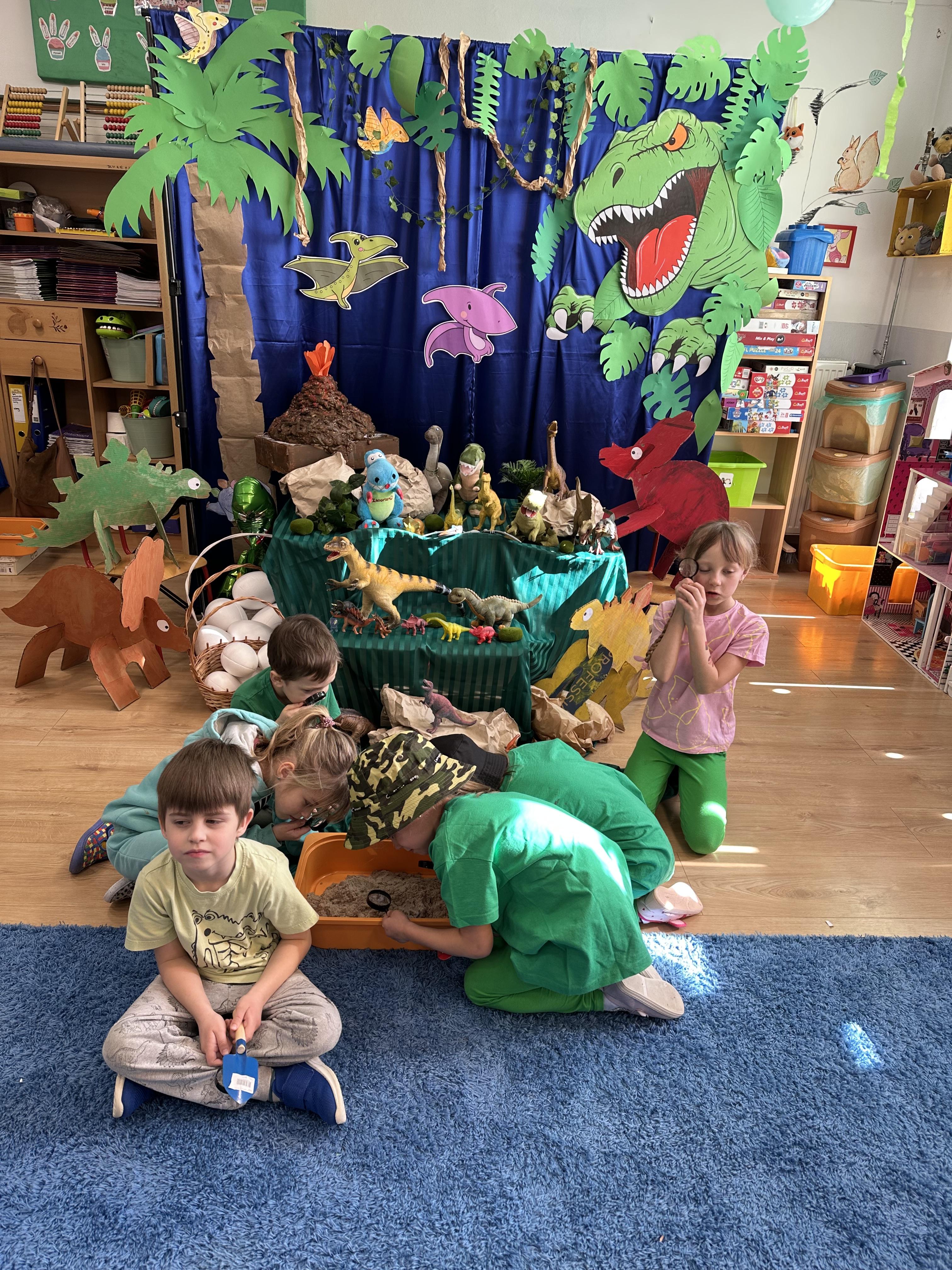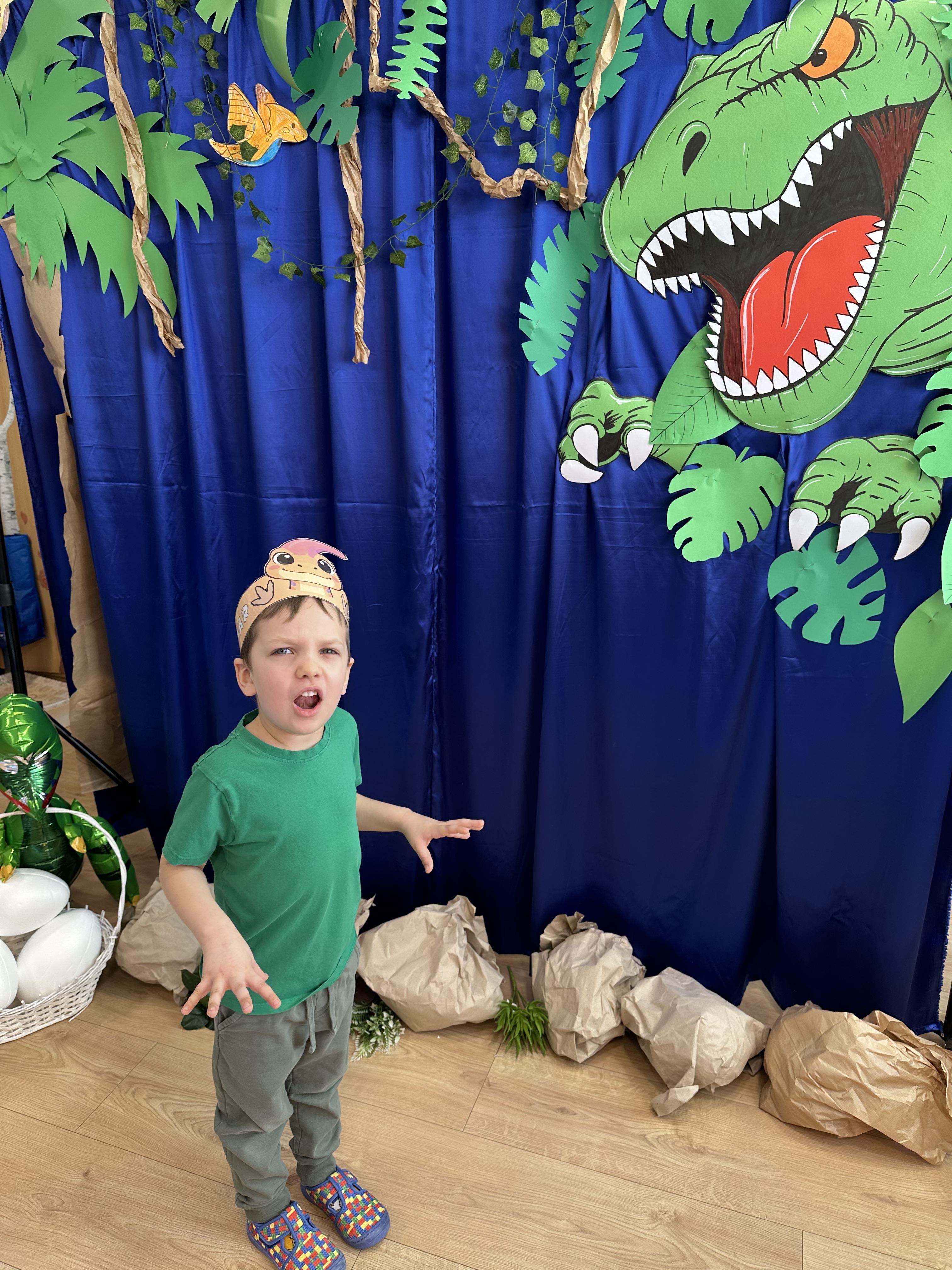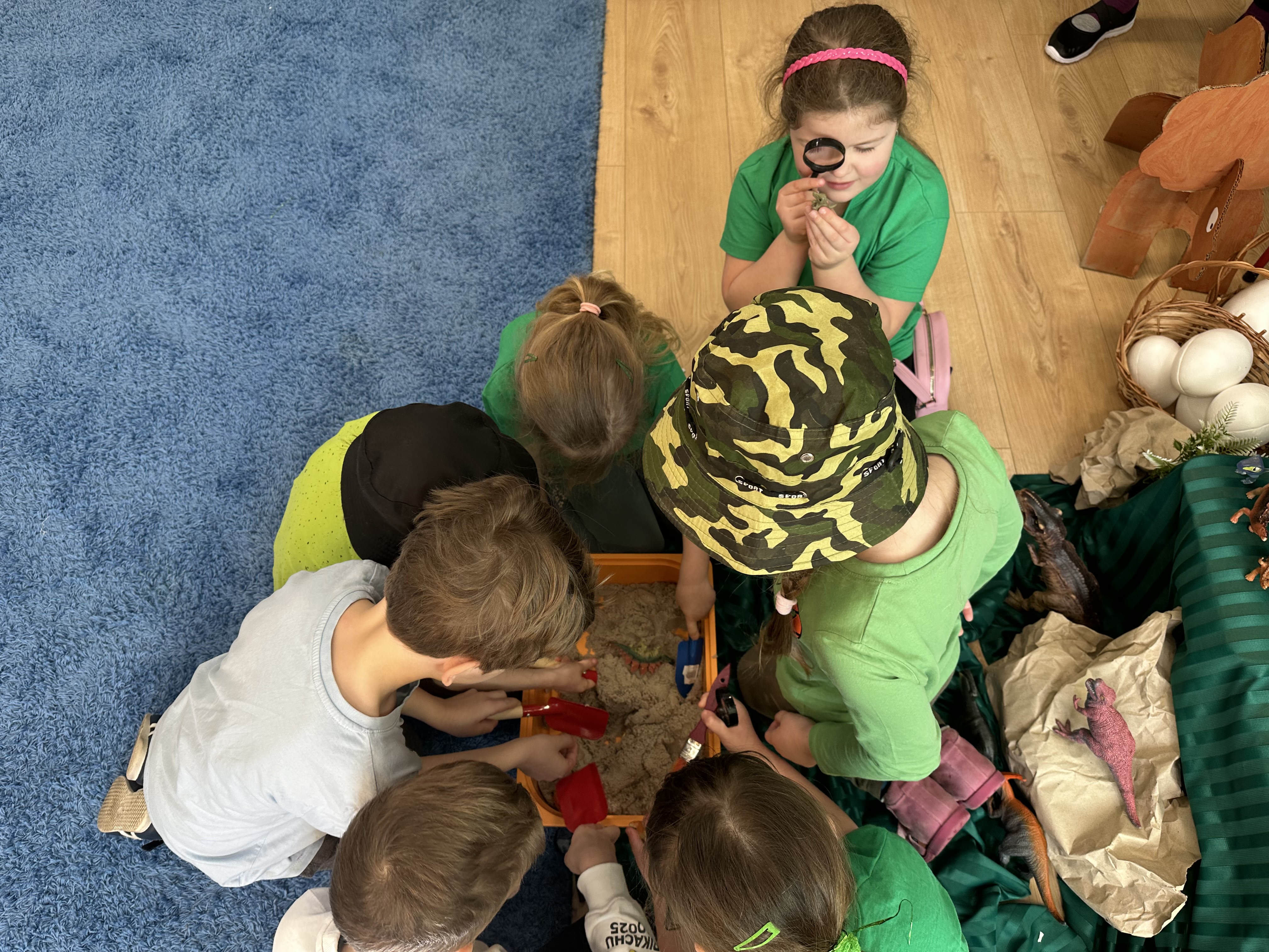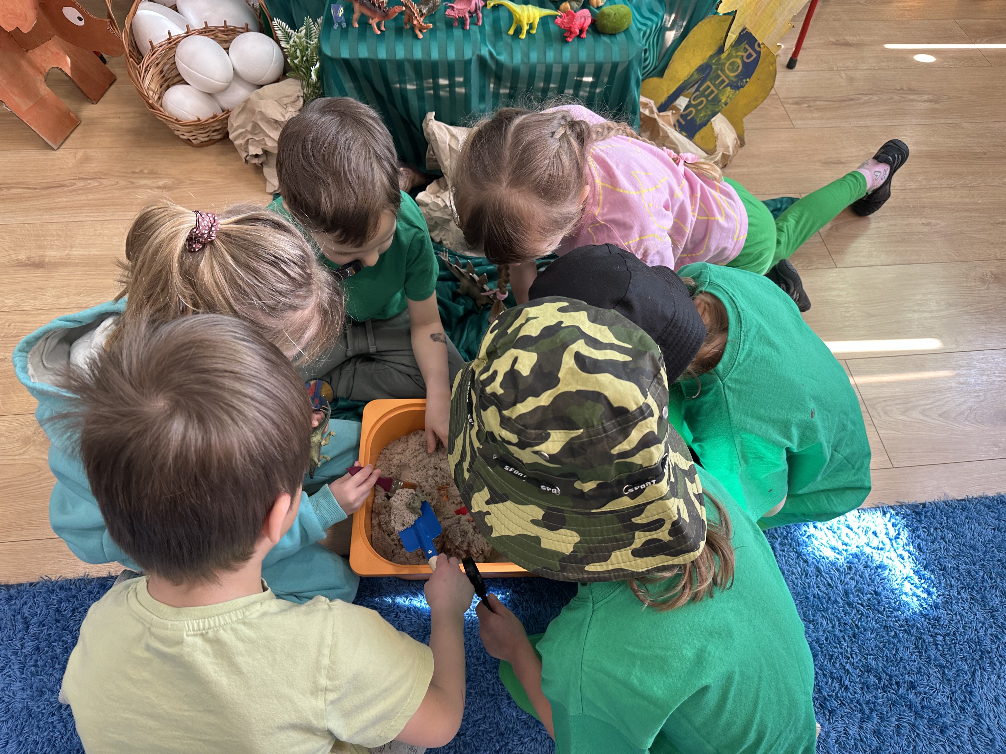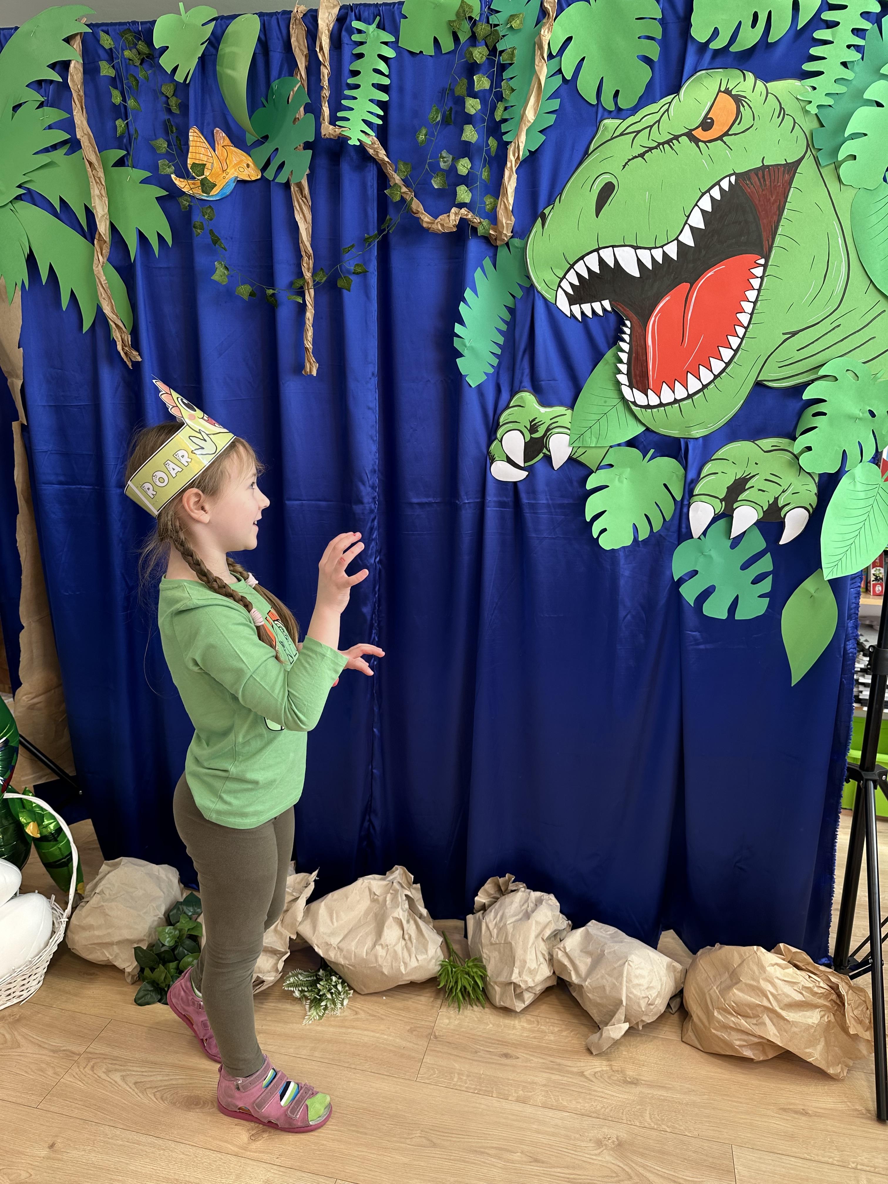 W naszej grupie odbył się Dzień Dinozaura, który dostarczył dzieciom wielu radosnych chwil oraz wzbogacił ich wiedzę o prehistorycznym świecie. Już od samego rana w sali został przygotowany kącik dinozaurów, w którym znalazły się figurki, książki oraz ilustracje przedstawiające różne gatunki tych niezwykłych stworzeń. Jedną z pierwszych aktywności była zabawa w paleontologów. Dzieci z ogromnym zaangażowaniem poszukiwały ukrytych „skamieniałości” i figurek dinozaurów, ucząc się przy tym, na czym polega praca naukowca badającego przeszłość Ziemi. Następnie wspólnie segregowały dinozaury na roślinożerne i mięsożerne, poznając ich charakterystyczne cechy oraz sposób odżywiania. Kolejnym punktem programu były „Dino-malowanki” – przestrzenna praca plastyczna, podczas której dzieci rozwijały swoją wyobraźnię i zdolności manualne. Duże zainteresowanie wzbudził również eksperyment „Wulkan”. Wykorzystując sodę i ocet, dzieci mogły zaobserwować efektowną „erupcję”, co było nie tylko świetną zabawą, ale także ciekawą lekcją przyrody. Nie zabrakło również aktywności ruchowych i gier. W „Wyścigach dinozaurów” dzieci sprawdzały, który dinozaur najszybciej dotrze do mety. Dużo emocji dostarczyła także gra „Dino droga”, w której zadaniem było bezpieczne przeprowadzenie dinozaurów przez prehistoryczny krajobraz pełen przygód i niespodzianek. Na zakończenie odbył się quiz sprawdzający wiadomości o dinozaurach. Dzieci wykazały się dużą wiedzą i zaangażowaniem. Dzień zakończył się wykonaniem pamiątkowej fotografii, która będzie miłym wspomnieniem wspólnie spędzonego czasu. Obchody Dnia Dinozaura były nie tylko okazją do świetnej zabawy, ale również do zdobywania nowych informacji i rozwijania zainteresowań przyrodniczych.