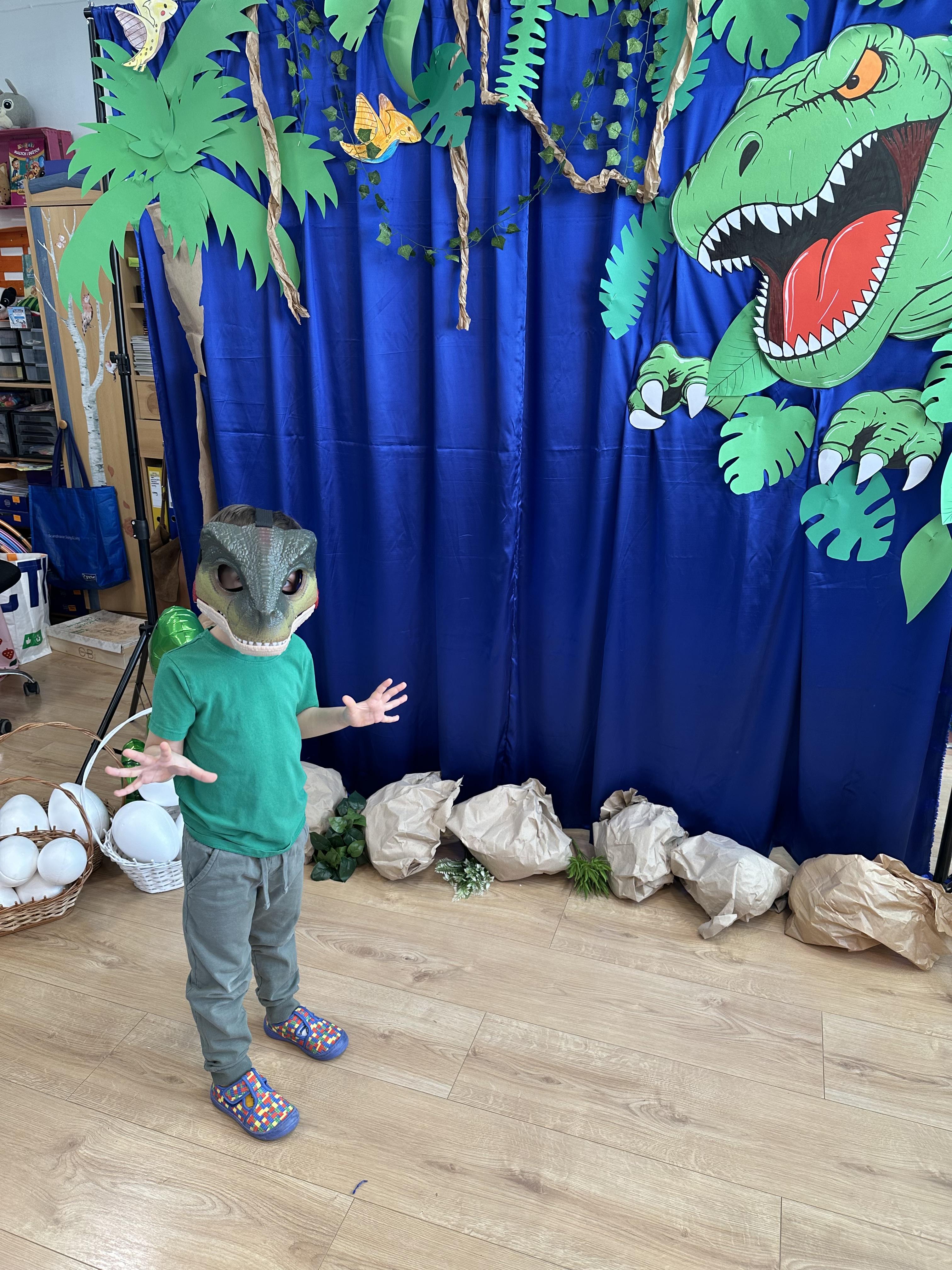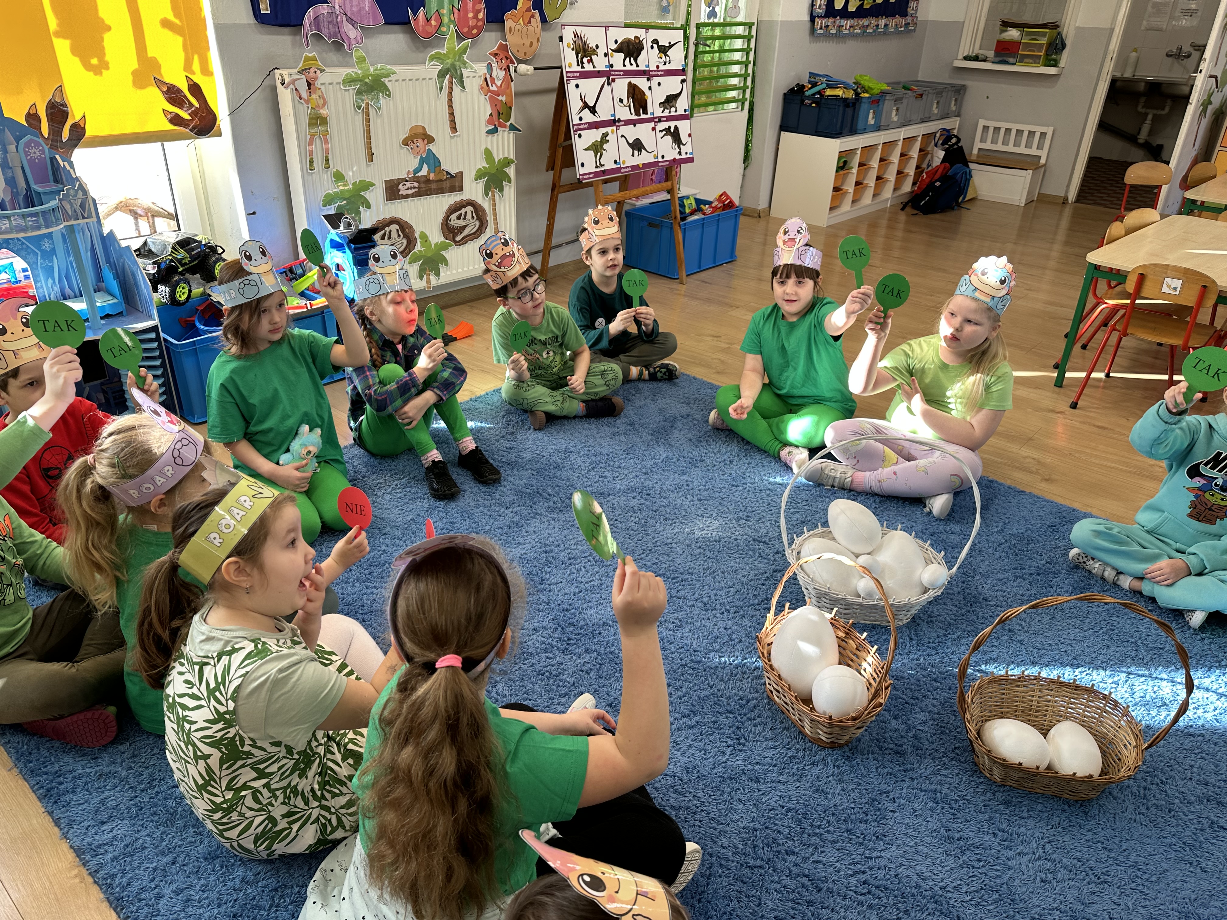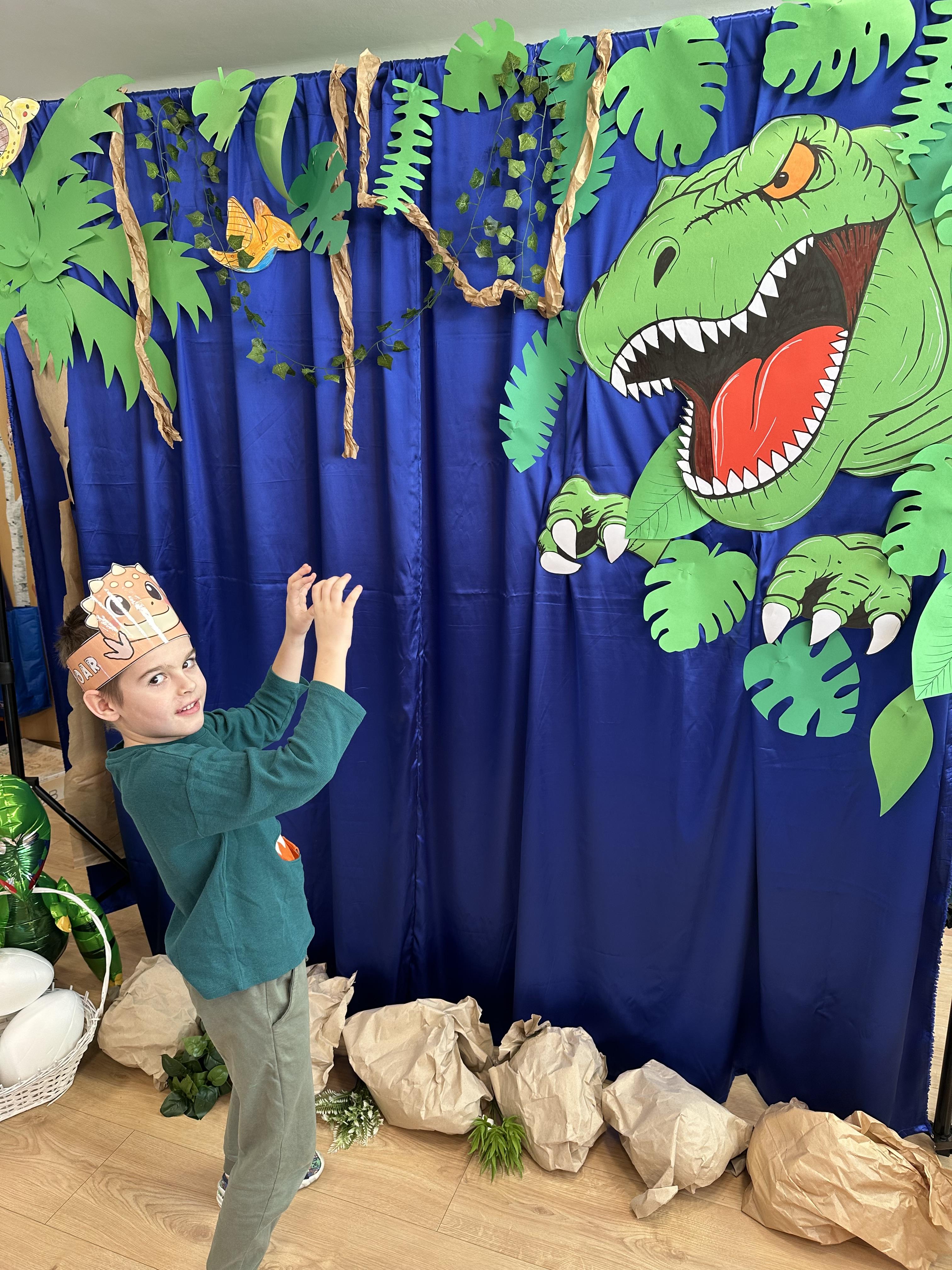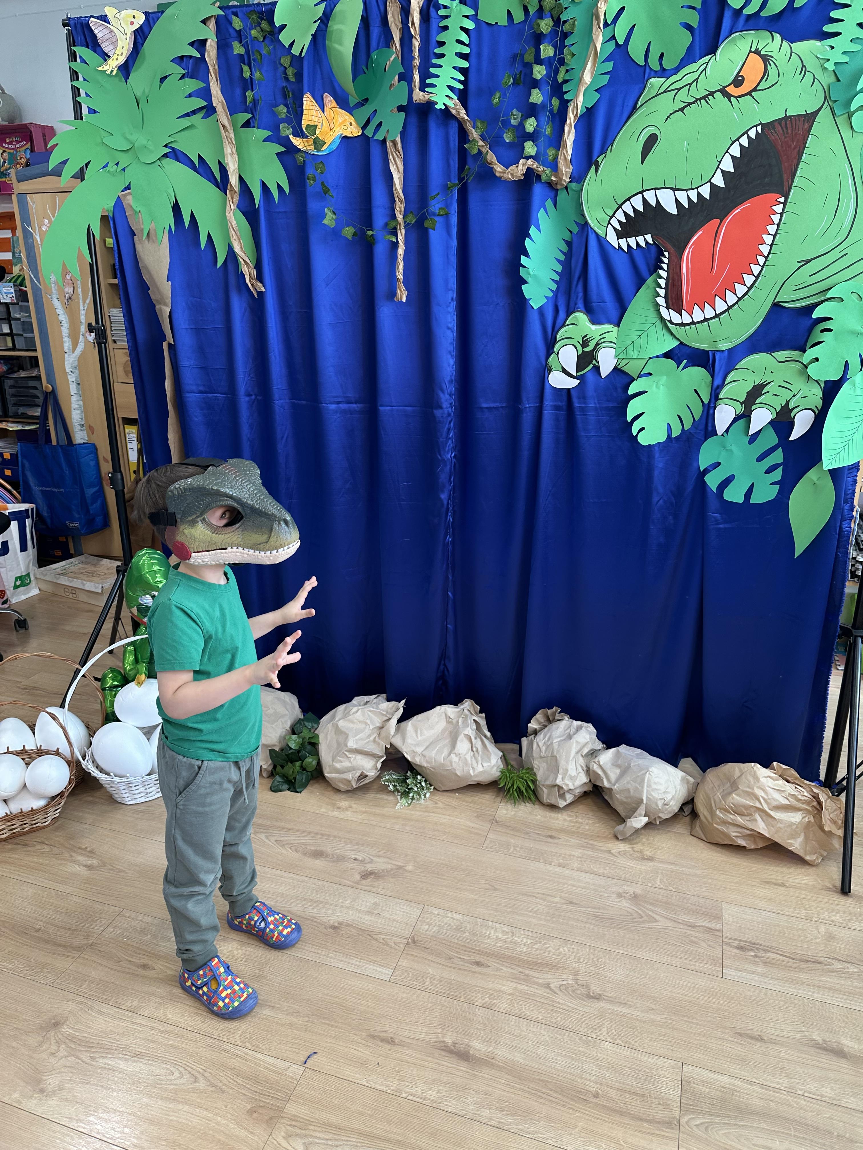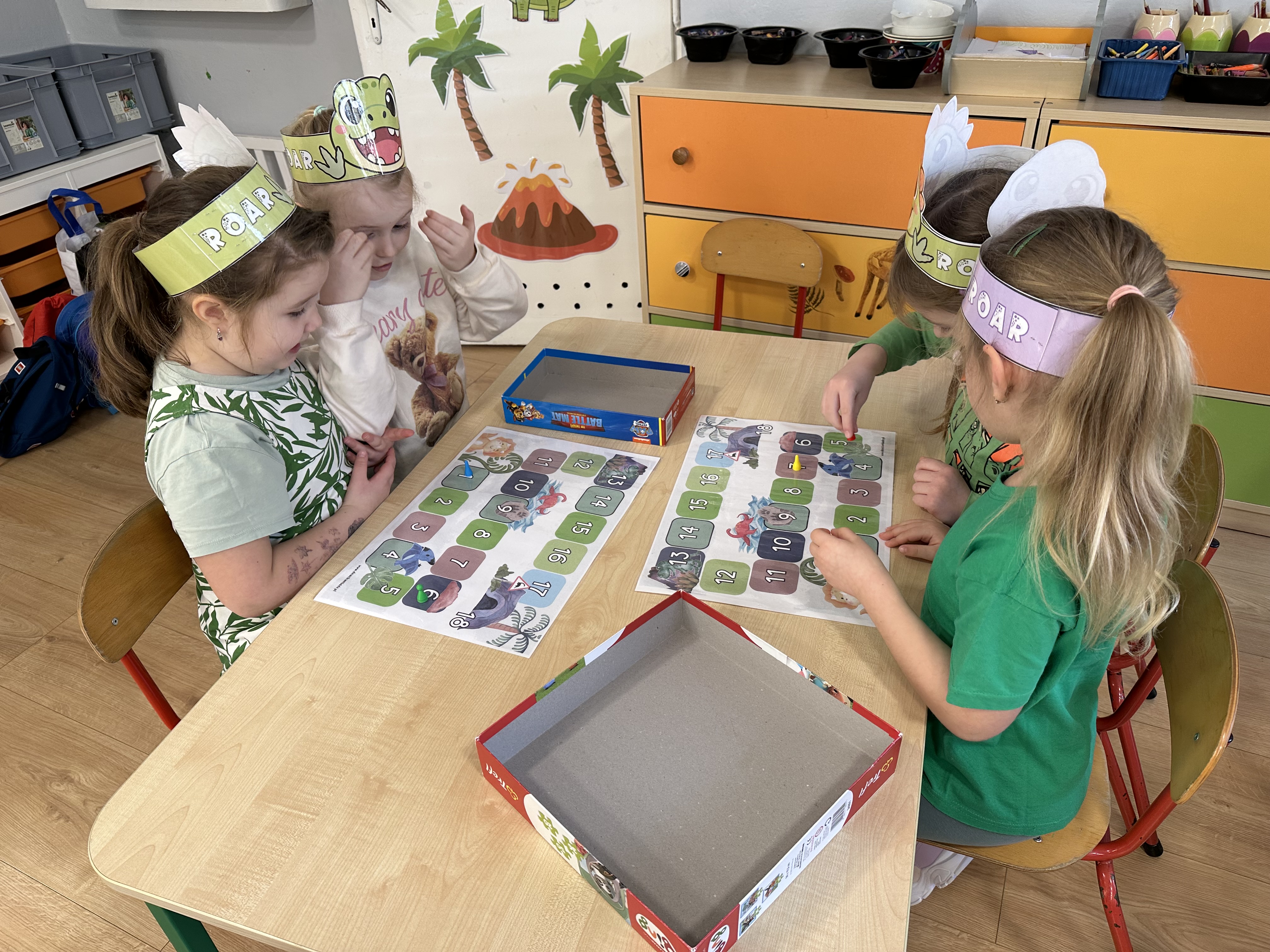 W naszej grupie odbył się Dzień Dinozaura, który dostarczył dzieciom wielu radosnych chwil oraz wzbogacił ich wiedzę o prehistorycznym świecie. Już od samego rana w sali został przygotowany kącik dinozaurów, w którym znalazły się figurki, książki oraz ilustracje przedstawiające różne gatunki tych niezwykłych stworzeń. Jedną z pierwszych aktywności była zabawa w paleontologów. Dzieci z ogromnym zaangażowaniem poszukiwały ukrytych „skamieniałości” i figurek dinozaurów, ucząc się przy tym, na czym polega praca naukowca badającego przeszłość Ziemi. Następnie wspólnie segregowały dinozaury na roślinożerne i mięsożerne, poznając ich charakterystyczne cechy oraz sposób odżywiania. Kolejnym punktem programu były „Dino-malowanki” – przestrzenna praca plastyczna, podczas której dzieci rozwijały swoją wyobraźnię i zdolności manualne. Duże zainteresowanie wzbudził również eksperyment „Wulkan”. Wykorzystując sodę i ocet, dzieci mogły zaobserwować efektowną „erupcję”, co było nie tylko świetną zabawą, ale także ciekawą lekcją przyrody. Nie zabrakło również aktywności ruchowych i gier. W „Wyścigach dinozaurów” dzieci sprawdzały, który dinozaur najszybciej dotrze do mety. Dużo emocji dostarczyła także gra „Dino droga”, w której zadaniem było bezpieczne przeprowadzenie dinozaurów przez prehistoryczny krajobraz pełen przygód i niespodzianek. Na zakończenie odbył się quiz sprawdzający wiadomości o dinozaurach. Dzieci wykazały się dużą wiedzą i zaangażowaniem. Dzień zakończył się wykonaniem pamiątkowej fotografii, która będzie miłym wspomnieniem wspólnie spędzonego czasu. Obchody Dnia Dinozaura były nie tylko okazją do świetnej zabawy, ale również do zdobywania nowych informacji i rozwijania zainteresowań przyrodniczych.